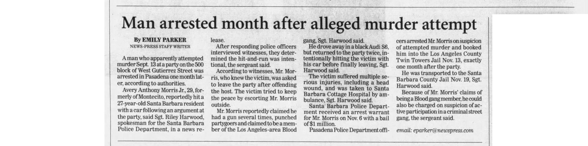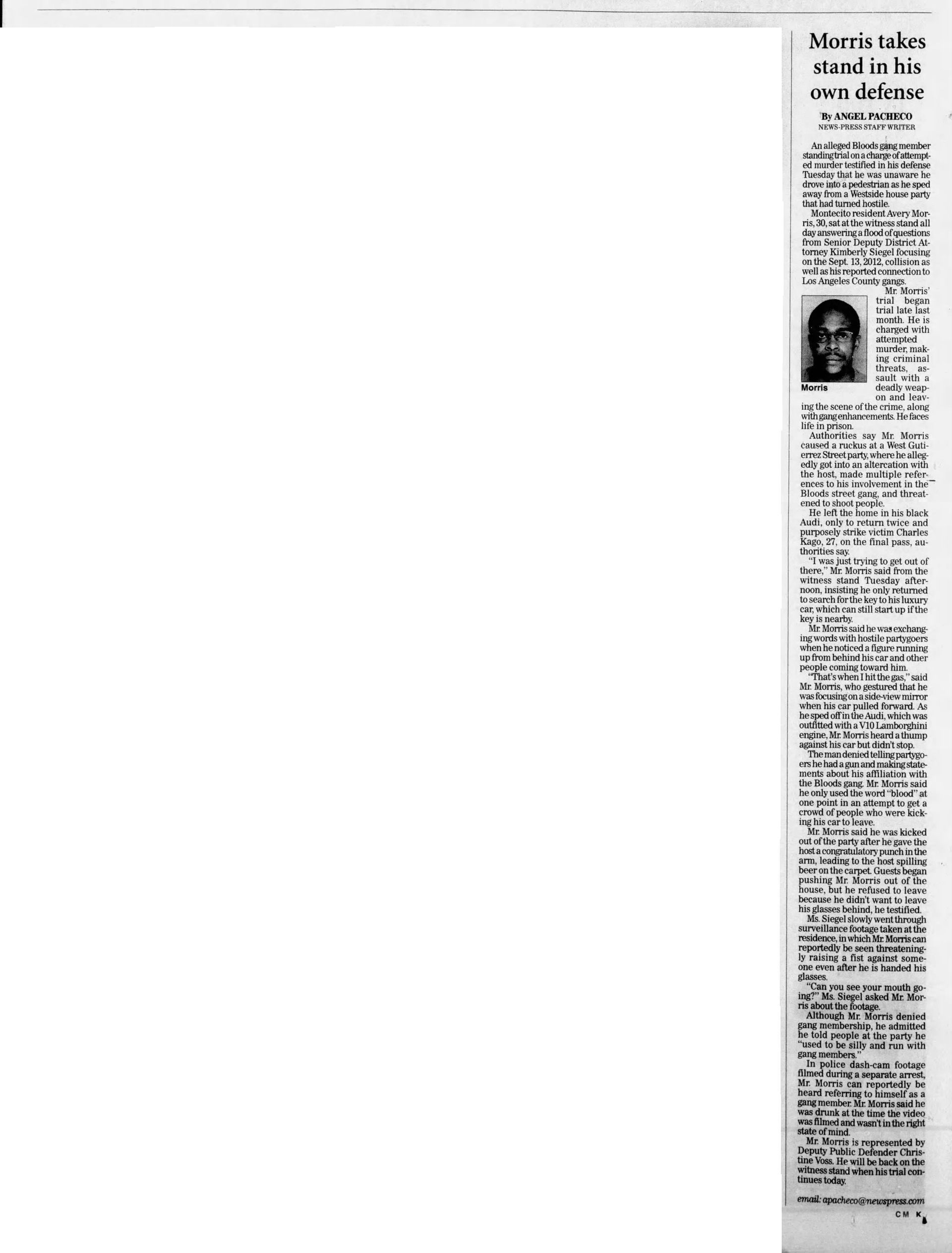Defendants In Marilyn Pharis's Death Make Brief Court Appearance | November 19, 2015 | Noozhawk | Janene Scully Goleta-Area Man Accused of Killing His Family Enters Not Guilty by Reason of Insanity | October 21, 2015 | Noozhawk | Lara Cooper Arraignment Delayed for Former Hancock College Basketball Players Charged With Murder | October 19, 2015 | Noozhawk | Janene Scully At a Glance: Santa Maria: Arraignment continued again in Lompoc murder case | September 30, 2015 | Lompoc Record Men accused in Marilyn Pharis attack in court, case continued: New attorney on board as Public Defender's Office prepares for potential death penalty defense | September 17, 2015 | Santa Ynes Valley News | Kyle Harding Men accused in Marilyn Pharis attack in court, case continued: New attorney on board as Public Defender's Office prepares for potential death penalty defense | September 17, 2015 | Santa Maria Times | Kyle Harding Psychiatric Search Narrows in Holzer Case: Five Forensic Experts Considered to Perform Evaluation | September 16, 2015 | Santa Barbara Independent | Kelsey Knorp Prosecution in Lompoc murder case focuses on social media activity | September 1, 2015 | Santa Maria Times | Kenny Lindberg Inept Inmate Care by Corizon? Supervisors Must Decide Path for County Inmates' Health | August 20, 2015 | Santa Barbara Independent | Kelsey Brugger Defense continues cross-examination of boy, 14 | August 20, 2015 | Santa Barbara Times | Kenny Lindberg Man Accused of Murdering Family May Enter Insanity Plea in Santa Barbara Court | August 11, 2015 | Noozhawk | Lara Cooper Last U-Haul defendant sentenced | August 3, 2015 | Santa Ynez Valley News | Ryah Cooley Last U-Haul defendant sentenced | August 3, 2015 | Santa Maria Times | Ryah Cooley Man accused of ordering murder from behind bars appears in court: Three others enter not-guilty pleas, will proceed to trial | July 21, 2015 | Santa Maria Times | Kyle Harding Judge Rules Former Allan Hancock College Basketball Players to Be Tried on Murder, Other Charges | June 24, 2015 | Noozhawk | Janene Scully Preliminary Hearing Begins for Former Hancock College Basketball Players Charged with Murder: Ali Mohammed and Lavell White are accused of the fatal shooting of a 23-year-0ld man in Santa Maria during an alleged drug deal | June 23, 2015 | Noozhawk | Janene Scully Preliminary hearing set in robbery and carjacking case | May 27, 2015 | Santa Maria Times | Kyle Harding Five Men Sentenced to Life in Prison Without Parole for Torture-Murder of Anthony Ibarra: Judge rules on numerous motions during the hearing, during which family members of Ibarra speak out about 'the nightmare that will never end | May 22, 2015 | Noozhawk | Janene Scully Trio Held to Answer on Charges Related to Guadalupe Homicide | May 16, 2015 | Lompoc Record | Kyle Harding State Prison Inmate Accused of Orchestrating Murder of Santa Maria Man: Judge rules three other defendants should stand trial in the shooting of Javier Limon | May 15, 2015 | Noozhawk | Janene Scully 5 of 6 Defendants Found Guilty of First Degree Murder in U-Haul Trial: Sixth defendant pleads to kidnapping after mistrial declared | April 7, 2015 | Santa Maria Times | Kyle Harding 5 of 6 Defendants Found Guilty of First Degree Murder in U-Haul Trial: Sixth defendant pleads to kidnapping after mistrial declared | April 7, 2015 | Santa Ynez Valley News | Kyle Harding 5 Men Found Guilty in Santa Maria Torture-Murder Case: Jury in Ibarra case returns guilty verdicts against five of the six defendants | April 7, 2015 | Noozhawk | Janene Scully U-Haul juror dismissed, deliberations start over | March 31, 2015 | Santa Maria Times | Kyle Harding Jury Begins Deliberating in Santa Maria Torture-Murder Trial | March 24, 2015 | Noozhawk | Janene Scully U-Haul closing arguments continue | March 20, 2015 | Santa Maria Times | Kyle Harding U-Haul defense casts doubt on witness credibility | March 19, 2015 | Santa Maria Times | Kyle Harding County Lines: Santa Maria: U-Haul defense casts doubt on witness credibility | March 19, 2015 | Santa Maria Times No hearing yet for Hancock College basketball players | March 16, 2015 | Santa Maria Times | Staff Report Sentencing Hearing an Explosive Ending to Santa Barbara County's First Human Trafficking Trial: Brannon Lawrence Pitcher, found guilty by a jury of prostituting a teen girl, is kicked out of the courtroom for shouting at the judge | March 13, 2015 | Noozhawk | Lara Cooper Second Defendant Testifies in Ibarra Murder Trial | March 13, 2015 | Noozhawk | Janene Scully Second U-Haul Defendant Testifies, Counters Allegations | March 12, 2015 | Lompoc Record | Kyle Harding Sentencing Delayed in Human Trafficking Case | March 8, 2015 | Santa Barbara Independent | Colleen Flaherty Cameron Oliver Arraigned on Murder Charges is Drunk Driving Crash | March 8, 201 5 | News Channel 12-3-11 | News Channel 3-12 Week 8: Santa Maria Ibarra Murder Trial | March 7, 2015 | New Channel 12-3-11 | News Channel 3-12 Defendant testifies he was not present when Anthony Ibarra died | March 6, 2015 | Santa Maria Times | Kyle Harding U-Haul Defendant Takes the Stand | March 5, 2015 | Santa Maria Times | Kyle Harding Defendant Takes Witness Stand in Own Defense in Ibarra Murder Trial: Anthony "AJ" Solis denies gang membership during testimony | March 5, 2015 | Noozhawk | Janene Scully Defense Expert Testifies About Phrase 'Gang Associate' During Ibarra Murder Trial | March 3, 2015 | Noozhawk | Janene Scully Prosecution Rests in Santa Maria Trial of Six Defendants Charged in Ibarra Murder: Defense attorneys ask the judge to acquit their clients, accused of the gang-related torture-slaying of Anthony Ibarra in March 2013 | February 27, 2015 | Noozhawk | Janene Scully U-Haul defense continues cross-examination of SMPD gang detective | February 26, 2015 | Santa Maria Times | Kyle Harding U-Haul defense attorneys question SMPD detective: Prosecutor, detective paint picture of local gang violence | February 24, 2015 | Santa M