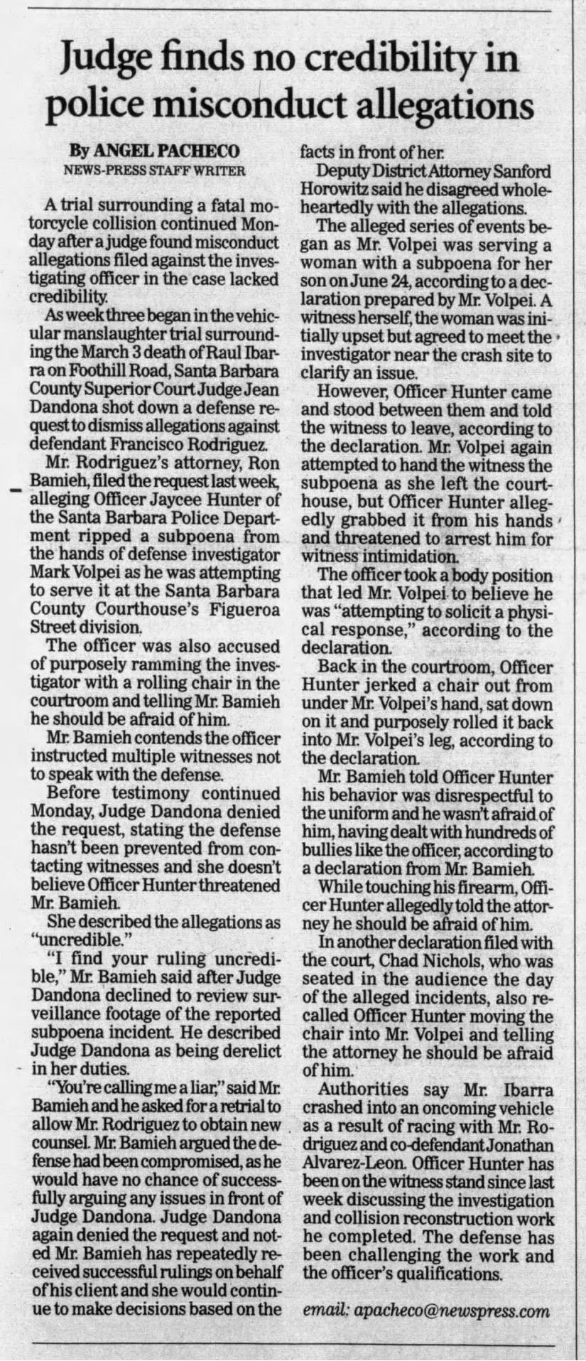 A Grisly Crime: Recap of the Pierre Haobsh Trial: How the Triple-Murder Case Played Out Leading to the Guilty Verdict | December 1, 2021 | Santa Barbara Independent | Ryan P. Cruz Triple-Murder Suspect Pierre Haobsh Gives His Account of Days Leading to Han Family Murders; Defendant describes his involvement with multiple companies and his belief that the U.S. Department of Energy was targeting him | November 23, 2021 | Noozhawk | Serena Guentz Haobsh Spins a Story on the Stand: Accused of Triple Murder, Alleged Killer Gives His Version of the Evidence | November 23, 2021 | Santa Barbara Independent | Jean Yamamura & Nick Welsh Triple-Murder Suspect Pierre Haobsh Starts Testifying in Own Defense During Santa Barbara Trial: He faces murder charges in the 2016 killings of Goleta-area Dr. Weidong 'Henry' Han, Huijie 'Jennie' Yu and their daughter, Emily | November 22, 2021 | Noozhawk | Serena Guentz Defense Team Raises Doubts in Case Against Accused Han Family Killer: Pierre Haobsh's Attorneys Question Reliability of Cell Phone Data Records | November 19, 2021 | Santa Barbara Independent | Ryan P. Cruz & Jun Starkey Triple-Murder Trial for Pierre Haobsh Continues with Defense Witnesses | November 18, 2021 | Noozhawk | Serena Guentz Review of Suspect's Computer Search History May Implicate Him in Triple Homicide | November 17, 2021 | Vanguard | Mairead Perez Computer Analyst Provides Forensic Evidence in Triple Murder Case | November 16, 2021 | Vanguard | Joshua Cenzano Trial for Triple-Murder Suspect Pierre Haobsh Hears Testimony From Expert Witness: Lead investigator says the web history on Haobsh's laptop included a search for 'can 22lr hollow point penetrate the skull' | November 12, 2021 | Noozhawk | Serena Guentz Grim Friday Hearing in Haobsh Trial; Photos Displayed of Triple Murder Victims as Evidence Unfolds | November 5, 2021 | Santa Barbara Independent | Jean Yamamura Triple-Murder Trial for Pierre Haobsh Continues with Testimony From Sheriff's Personnel: Segments of Detective Jeff McDaniel's four-hour interrogation with the suspect, accused of killing the Han family in 2016, also a shown in court | November 5, 2021 | Noozhawk | Serena Guentz Inside the Interrogation Room with Accused Killer Pierre Haobsh; Witness Testimony Continued Thursday in Han Family Triple Murder Case | November 4, 2021 | Santa Barbara Independent | Ryan P. Cruz Witness Testimony Begins in Han Family Triple Murder Case: Prosecutors Lay the Foundation for Arguments Against Alleged Murderer Pierre Haobsh | October 29, 2021 | Santa Barbara Independent | Serena Guentz Triple-Murder Trial Starts for Pierre Haobsh, Accused of 2016 Slayings of Han Family | October 28, 2021 | Noozhawk | Giana Magnoli P ublic Defender Objects to Late Trial Video Evidence, Suggesting It Was Racist and Offensive | September 1, 2021 | Vanguard | Carson Eschen Santa Barbara DA Drops Bid for Death Penalty in Han Family Murder Case: In Exchange, Triple Homicide Defendant Agrees to Trial by Judge Instead of Jury | August 13, 2021 | Santa Barbara Independent | Nick Welsh Triple-Murder Suspect Pierre Haobsh Waives Right to Jury Trial, Will Have Case Heard in a Bench Trial: Santa Barbara County District Attorney's Office drops intention to seek death penalty in the case, attorneys said Thursday | August 12, 2021 | Noozhawk | Brooke Holland Public Defender Argues Defendant Should Be Allowed to Possess Discovery During Trial; District Attorney Disagrees, Citing Safety Concern | August 12, 2021 | Vanguard | Michelle Lagos Defendant Waive Rights, Accepts Plea Deal, Pleads No Contest to Charges | August 8, 2021 | Vanguard | Lauren Smith Triple-Murder Suspect Pierre Haobsh Expected to Waive Right to Jury Trial, Defense Says: Attorneys make a brief appearance as they work toward a final agreement for a bench trial in the deaths of Dr. Henry Han, his wife and child | July 22, 2021 | Noozhawk | Brooke Holland Santa Barbara County judge approves motion to continue MS-13 trial May 3 | January 8, 2021 | Santa Maria Times | Dave Minsky
