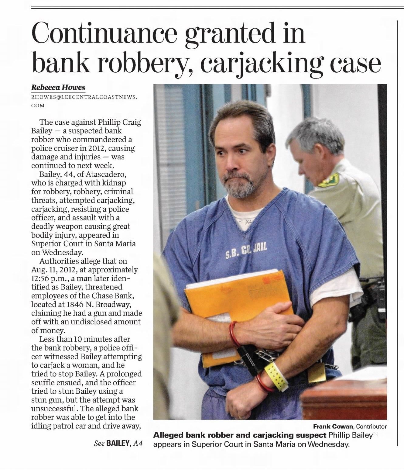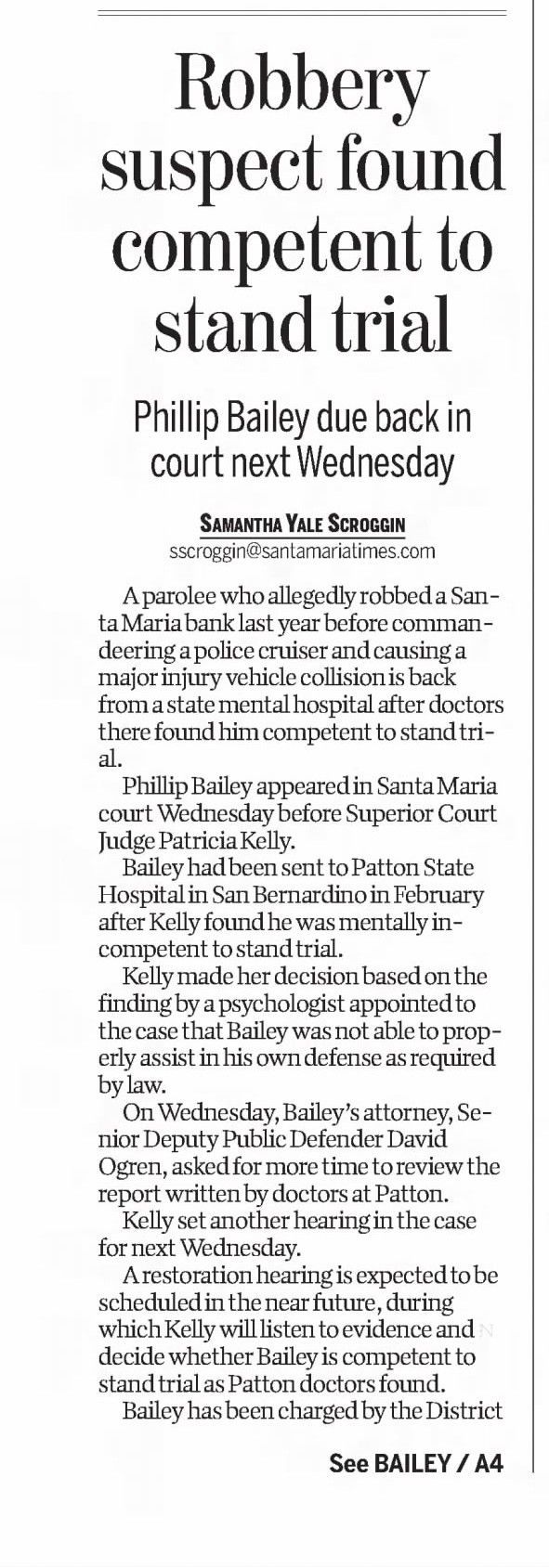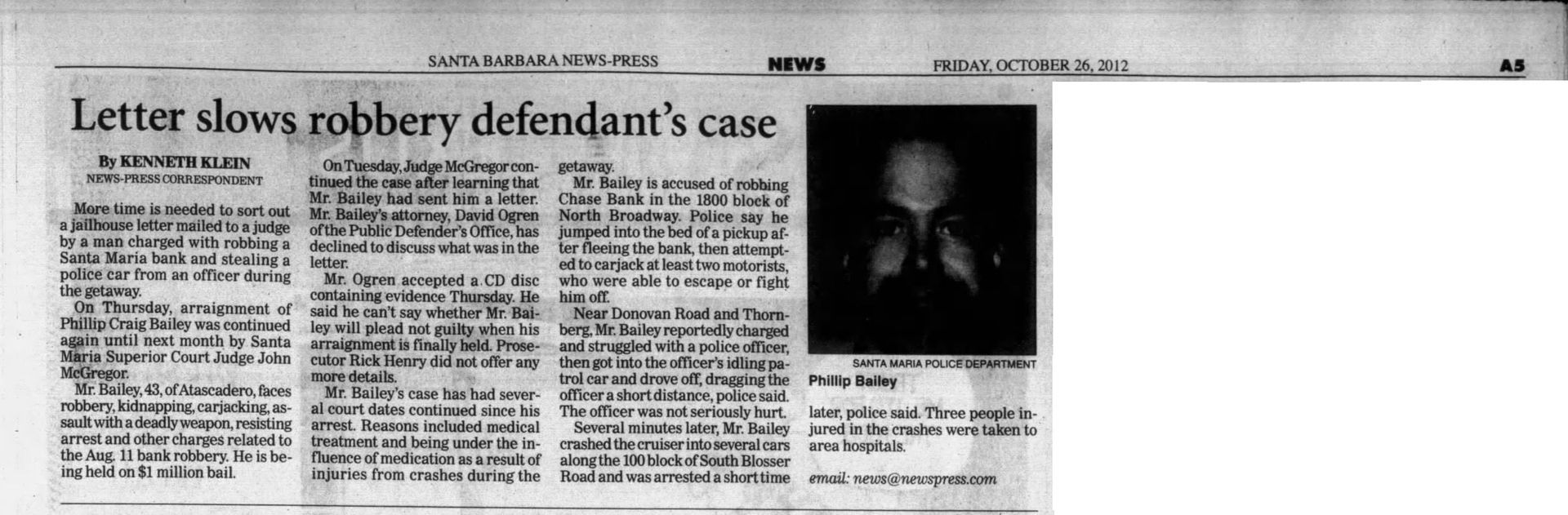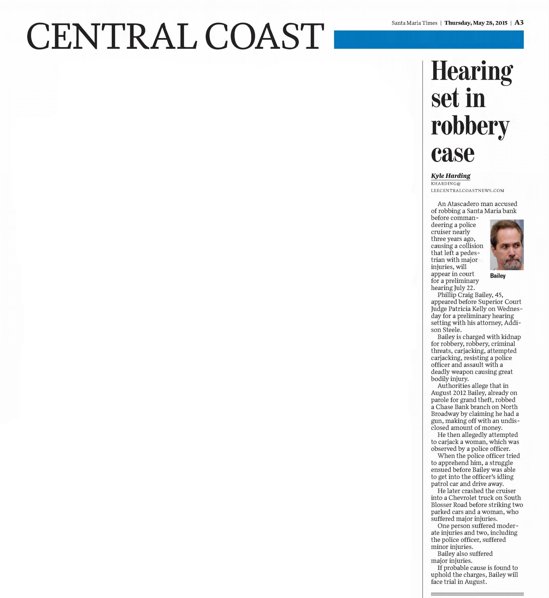 Defendants In Marilyn Pharis's Death Make Brief Court Appearance | November 19, 2015 | Noozhawk | Janene Scully Goleta-Area Man Accused of Killing His Family Enters Not Guilty by Reason of Insanity | October 21, 2015 | Noozhawk | Lara Cooper Arraignment Delayed for Former Hancock College Basketball Players Charged With Murder | October 19, 2015 | Noozhawk | Janene Scully At a Glance: Santa Maria: Arraignment continued again in Lompoc murder case | September 30, 2015 | Lompoc Record Men accused in Marilyn Pharis attack in court, case continued: New attorney on board as Public Defender's Office prepares for potential death penalty defense | September 17, 2015 | Santa Ynes Valley News | Kyle Harding Men accused in Marilyn Pharis attack in court, case continued: New attorney on board as Public Defender's Office prepares for potential death penalty defense | September 17, 2015 | Santa Maria Times | Kyle Harding Psychiatric Search Narrows in Holzer Case: Five Forensic Experts Considered to Perform Evaluation | September 16, 2015 | Santa Barbara Independent | Kelsey Knorp Prosecution in Lompoc murder case focuses on social media activity | September 1, 2015 | Santa Maria Times | Kenny Lindberg Inept Inmate Care by Corizon? Supervisors Must Decide Path for County Inmates' Health | August 20, 2015 | Santa Barbara Independent | Kelsey Brugger Defense continues cross-examination of boy, 14 | August 20, 2015 | Santa Barbara Times | Kenny Lindberg Man Accused of Murdering Family May Enter Insanity Plea in Santa Barbara Court | August 11, 2015 | Noozhawk | Lara Cooper Last U-Haul defendant sentenced | August 3, 2015 | Santa Ynez Valley News | Ryah Cooley Last U-Haul defendant sentenced | August 3, 2015 | Santa Maria Times | Ryah Cooley Man accused of ordering murder from behind bars appears in court: Three others enter not-guilty pleas, will proceed to trial | July 21, 2015 | Santa Maria Times | Kyle Harding Judge Rules Former Allan Hancock College Basketball Players to Be Tried on Murder, Other Charges | June 24, 2015 | Noozhawk | Janene Scully Preliminary Hearing Begins for Former Hancock College Basketball Players Charged with Murder: Ali Mohammed and Lavell White are accused of the fatal shooting of a 23-year-0ld man in Santa Maria during an alleged drug deal | June 23, 2015 | Noozhawk | Janene Scully Preliminary hearing set in robbery and carjacking case | May 27, 2015 | Santa Maria Times | Kyle Harding Five Men Sentenced to Life in Prison Without Parole for Torture-Murder of Anthony Ibarra: Judge rules on numerous motions during the hearing, during which family members of Ibarra speak out about 'the nightmare that will never end | May 22, 2015 | Noozhawk | Janene Scully Trio Held to Answer on Charges Related to Guadalupe Homicide | May 16, 2015 | Lompoc Record | Kyle Harding State Prison Inmate Accused of Orchestrating Murder of Santa Maria Man: Judge rules three other defendants should stand trial in the shooting of Javier Limon | May 15, 2015 | Noozhawk | Janene Scully 5 of 6 Defendants Found Guilty of First Degree Murder in U-Haul Trial: Sixth defendant pleads to kidnapping after mistrial declared | April 7, 2015 | Santa Maria Times | Kyle Harding 5 of 6 Defendants Found Guilty of First Degree Murder in U-Haul Trial: Sixth defendant pleads to kidnapping after mistrial declared | April 7, 2015 | Santa Ynez Valley News | Kyle Harding 5 Men Found Guilty in Santa Maria Torture-Murder Case: Jury in Ibarra case returns guilty verdicts against five of the six defendants | April 7, 2015 | Noozhawk | Janene Scully U-Haul juror dismissed, deliberations start over | March 31, 2015 | Santa Maria Times | Kyle Harding Jury Begins Deliberating in Santa Maria Torture-Murder Trial | March 24, 2015 | Noozhawk | Janene Scully U-Haul closing arguments continue | March 20, 2015 | Santa Maria Times | Kyle Harding U-Haul defense casts doubt on witness credibility | March 19, 2015 | Santa Maria Times | Kyle Harding County Lines: Santa Maria: U-Haul defense casts doubt on witness credibility | March 19, 2015 | Santa Maria Times No hearing yet for Hancock College basketball players | March 16, 2015 | Santa Maria Times | Staff Report Sentencing Hearing an Explosive Ending to Santa Barbara County's First Human Trafficking Trial: Brannon Lawrence Pitcher, found guilty by a jury of prostituting a teen girl, is kicked out of the courtroom for shouting at the judge | March 13, 2015 | Noozhawk | Lara Cooper Second Defendant Testifies in Ibarra Murder Trial | March 13, 2015 | Noozhawk | Janene Scully Second U-Haul Defendant Testifies, Counters Allegations | March 12, 2015 | Lompoc Record | Kyle Harding Sentencing Delayed in Human Trafficking Case | March 8, 2015 | Santa Barbara Independent | Colleen Flaherty Cameron Oliver Arraigned on Murder Charges is Drunk Driving Crash | March 8, 201 5 | News Channel 12-3-11 | News Channel 3-12 Week 8: Santa Maria Ibarra Murder Trial | March 7, 2015 | New Channel 12-3-11 | News Channel 3-12 Defendant testifies he was not present when Anthony Ibarra died | March 6, 2015 | Santa Maria Times | Kyle Harding U-Haul Defendant Takes the Stand | March 5, 2015 | Santa Maria Times | Kyle Harding Defendant Takes Witness Stand in Own Defense in Ibarra Murder Trial: Anthony "AJ" Solis denies gang membership during testimony | March 5, 2015 | Noozhawk | Janene Scully Defense Expert Testifies About Phrase 'Gang Associate' During Ibarra Murder Trial | March 3, 2015 | Noozhawk | Janene Scully Prosecution Rests in Santa Maria Trial of Six Defendants Charged in Ibarra Murder: Defense attorneys ask the judge to acquit their clients, accused of the gang-related torture-slaying of Anthony Ibarra in March 2013 | February 27, 2015 | Noozhawk | Janene Scully U-Haul defense continues cross-examination of SMPD gang detective | February 26, 2015 | Santa Maria Times | Kyle Harding U-Haul defense attorneys question SMPD detective: Prosecutor, detective paint picture of local gang violence | February 24, 2015 | Santa M