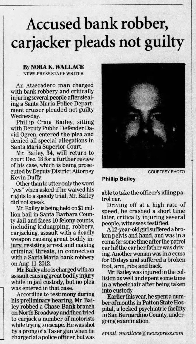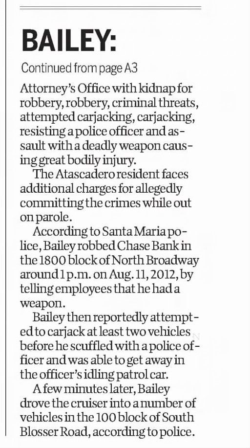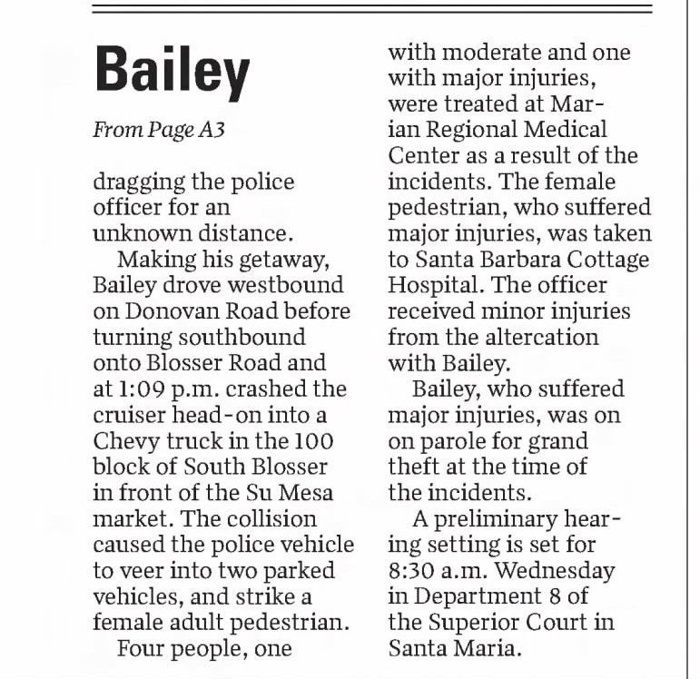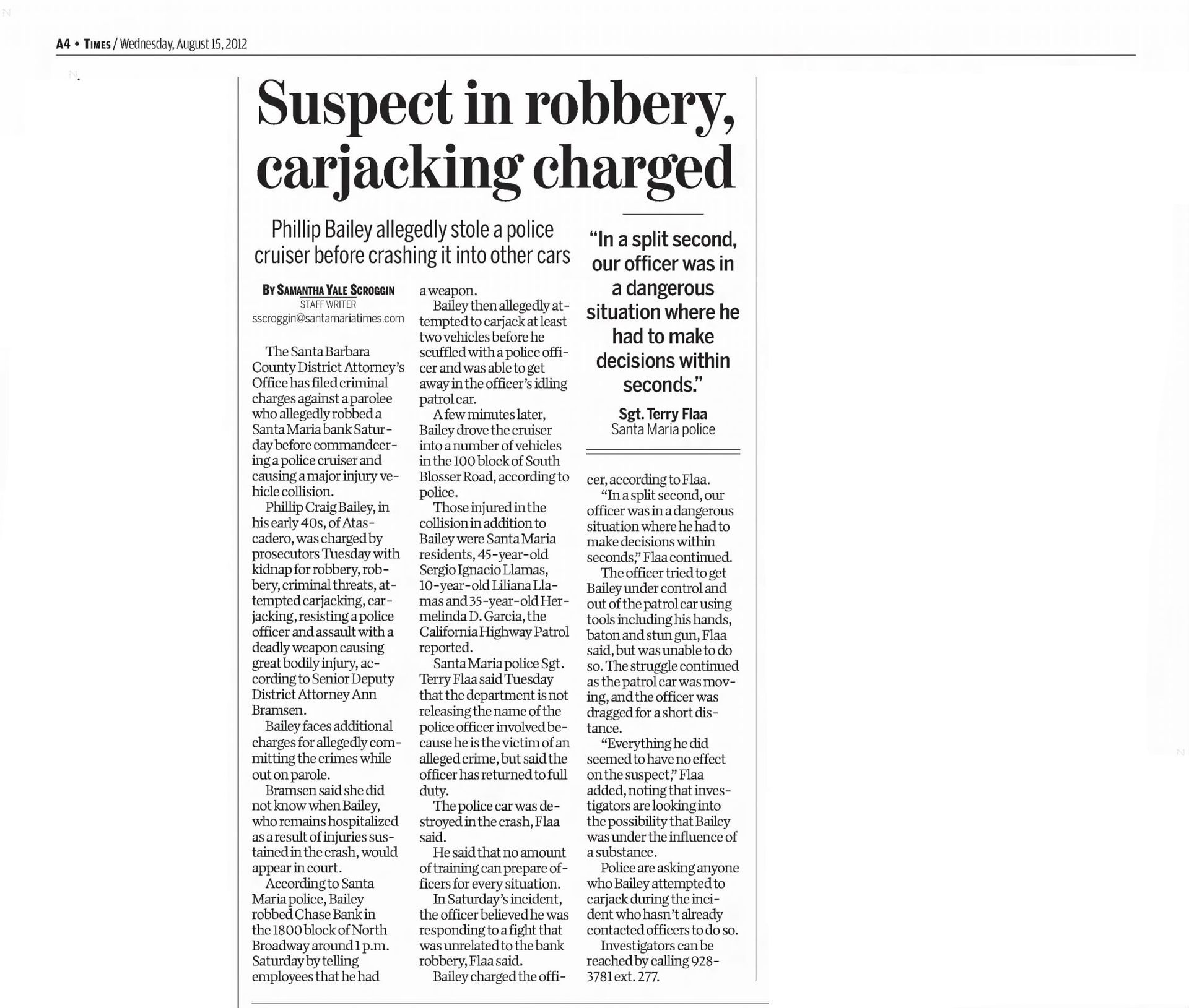 Defendants In Marilyn Pharis's Death Make Brief Court Appearance | November 19, 2015 | Noozhawk | Janene Scully Goleta-Area Man Accused of Killing His Family Enters Not Guilty by Reason of Insanity | October 21, 2015 | Noozhawk | Lara Cooper Arraignment Delayed for Former Hancock College Basketball Players Charged With Murder | October 19, 2015 | Noozhawk | Janene Scully At a Glance: Santa Maria: Arraignment continued again in Lompoc murder case | September 30, 2015 | Lompoc Record Men accused in Marilyn Pharis attack in court, case continued: New attorney on board as Public Defender's Office prepares for potential death penalty defense | September 17, 2015 | Santa Ynes Valley News | Kyle Harding Men accused in Marilyn Pharis attack in court, case continued: New attorney on board as Public Defender's Office prepares for potential death penalty defense | September 17, 2015 | Santa Maria Times | Kyle Harding Psychiatric Search Narrows in Holzer Case: Five Forensic Experts Considered to Perform Evaluation | September 16, 2015 | Santa Barbara Independent | Kelsey Knorp Prosecution in Lompoc murder case focuses on social media activity | September 1, 2015 | Santa Maria Times | Kenny Lindberg Inept Inmate Care by Corizon? Supervisors Must Decide Path for County Inmates' Health | August 20, 2015 | Santa Barbara Independent | Kelsey Brugger Defense continues cross-examination of boy, 14 | August 20, 2015 | Santa Barbara Times | Kenny Lindberg Man Accused of Murdering Family May Enter Insanity Plea in Santa Barbara Court | August 11, 2015 | Noozhawk | Lara Cooper Last U-Haul defendant sentenced | August 3, 2015 | Santa Ynez Valley News | Ryah Cooley Last U-Haul defendant sentenced | August 3, 2015 | Santa Maria Times | Ryah Cooley Man accused of ordering murder from behind bars appears in court: Three others enter not-guilty pleas, will proceed to trial | July 21, 2015 | Santa Maria Times | Kyle Harding Judge Rules Former Allan Hancock College Basketball Players to Be Tried on Murder, Other Charges | June 24, 2015 | Noozhawk | Janene Scully Preliminary Hearing Begins for Former Hancock College Basketball Players Charged with Murder: Ali Mohammed and Lavell White are accused of the fatal shooting of a 23-year-0ld man in Santa Maria during an alleged drug deal | June 23, 2015 | Noozhawk | Janene Scully Preliminary hearing set in robbery and carjacking case | May 27, 2015 | Santa Maria Times | Kyle Harding Five Men Sentenced to Life in Prison Without Parole for Torture-Murder of Anthony Ibarra: Judge rules on numerous motions during the hearing, during which family members of Ibarra speak out about 'the nightmare that will never end | May 22, 2015 | Noozhawk | Janene Scully Trio Held to Answer on Charges Related to Guadalupe Homicide | May 16, 2015 | Lompoc Record | Kyle Harding State Prison Inmate Accused of Orchestrating Murder of Santa Maria Man: Judge rules three other defendants should stand trial in the shooting of Javier Limon | May 15, 2015 | Noozhawk | Janene Scully 5 of 6 Defendants Found Guilty of First Degree Murder in U-Haul Trial: Sixth defendant pleads to kidnapping after mistrial declared | April 7, 2015 | Santa Maria Times | Kyle Harding 5 of 6 Defendants Found Guilty of First Degree Murder in U-Haul Trial: Sixth defendant pleads to kidnapping after mistrial declared | April 7, 2015 | Santa Ynez Valley News | Kyle Harding 5 Men Found Guilty in Santa Maria Torture-Murder Case: Jury in Ibarra case returns guilty verdicts against five of the six defendants | April 7, 2015 | Noozhawk | Janene Scully U-Haul juror dismissed, deliberations start over | March 31, 2015 | Santa Maria Times | Kyle Harding Jury Begins Deliberating in Santa Maria Torture-Murder Trial | March 24, 2015 | Noozhawk | Janene Scully U-Haul closing arguments continue | March 20, 2015 | Santa Maria Times | Kyle Harding U-Haul defense casts doubt on witness credibility | March 19, 2015 | Santa Maria Times | Kyle Harding County Lines: Santa Maria: U-Haul defense casts doubt on witness credibility | March 19, 2015 | Santa Maria Times No hearing yet for Hancock College basketball players | March 16, 2015 | Santa Maria Times | Staff Report Sentencing Hearing an Explosive Ending to Santa Barbara County's First Human Trafficking Trial: Brannon Lawrence Pitcher, found guilty by a jury of prostituting a teen girl, is kicked out of the courtroom for shouting at the judge | March 13, 2015 | Noozhawk | Lara Cooper Second Defendant Testifies in Ibarra Murder Trial | March 13, 2015 | Noozhawk | Janene Scully Second U-Haul Defendant Testifies, Counters Allegations | March 12, 2015 | Lompoc Record | Kyle Harding Sentencing Delayed in Human Trafficking Case | March 8, 2015 | Santa Barbara Independent | Colleen Flaherty Cameron Oliver Arraigned on Murder Charges is Drunk Driving Crash | March 8, 201 5 | News Channel 12-3-11 | News Channel 3-12 Week 8: Santa Maria Ibarra Murder Trial | March 7, 2015 | New Channel 12-3-11 | News Channel 3-12 Defendant testifies he was not present when Anthony Ibarra died | March 6, 2015 | Santa Maria Times | Kyle Harding U-Haul Defendant Takes the Stand | March 5, 2015 | Santa Maria Times | Kyle Harding Defendant Takes Witness Stand in Own Defense in Ibarra Murder Trial: Anthony "AJ" Solis denies gang membership during testimony | March 5, 2015 | Noozhawk | Janene Scully Defense Expert Testifies About Phrase 'Gang Associate' During Ibarra Murder Trial | March 3, 2015 | Noozhawk | Janene Scully Prosecution Rests in Santa Maria Trial of Six Defendants Charged in Ibarra Murder: Defense attorneys ask the judge to acquit their clients, accused of the gang-related torture-slaying of Anthony Ibarra in March 2013 | February 27, 2015 | Noozhawk | Janene Scully U-Haul defense continues cross-examination of SMPD gang detective | February 26, 2015 | Santa Maria Times | Kyle Harding U-Haul defense attorneys question SMPD detective: Prosecutor, detective paint picture of local gang violence | February 24, 2015 | Santa M