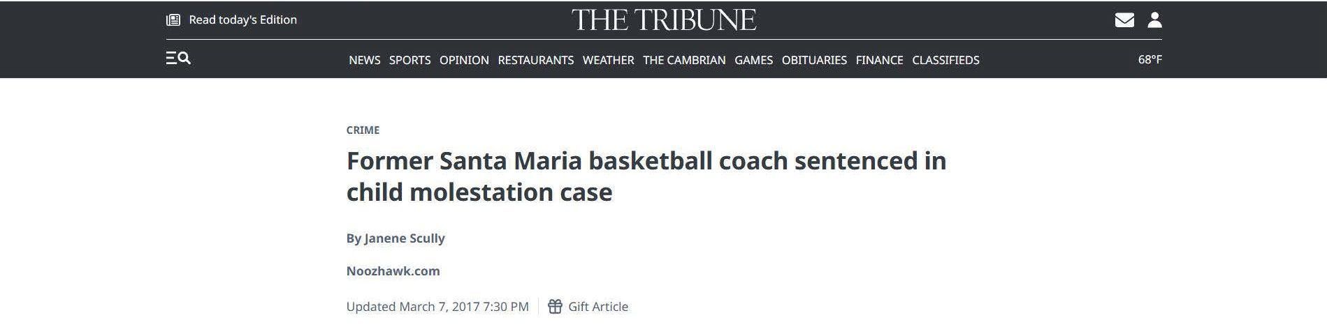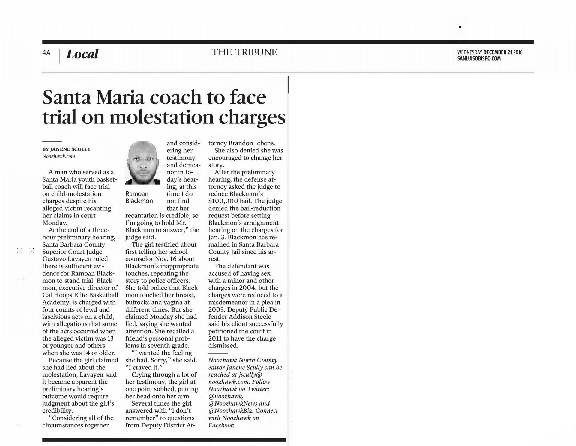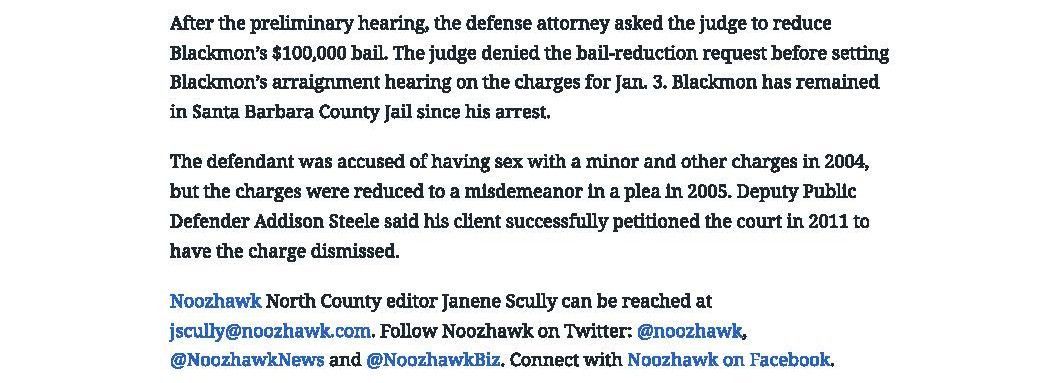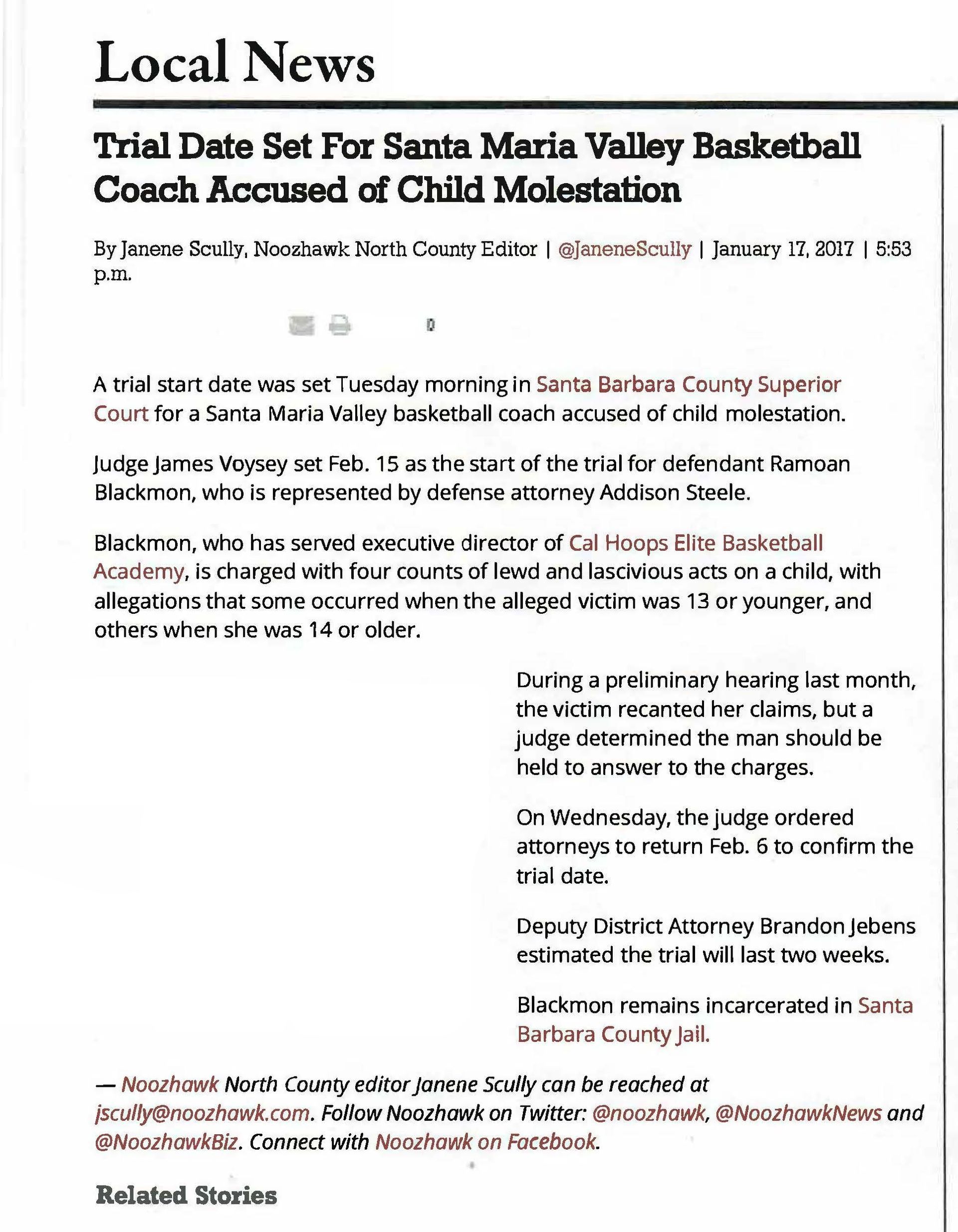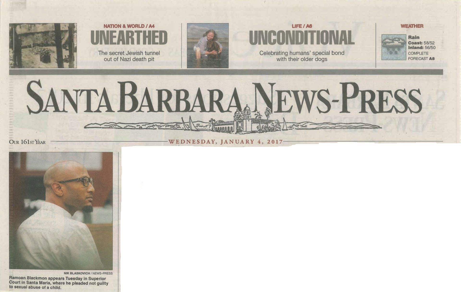 What Were Noozhawk's 16 Most-Read Stories of 2016?: Carnage, killings, wildfires and court cases captivated readers during a tumultuous year | December 30, 2016 | Noozhawk | Tom Bolton and Giana Magnoli Man Gets Seven Years in Domestic Violence Case | December 21, 2016 | Santa Barbara Independent | Kelsey Brugger Santa Maria youth basketball coach to face trial on molestation charges | December 20, 2016 | San Luis Obispo Tribune | Janene Scully Santa Maria Youth Basketball Coach Will Face Trial on Molestation Charges | December 19, 2016 | Noozhawk | Janene Scully Tentative April Trial Date Set for Goleta-Area Quadruple Murder Case: Nicolas Holzer has entered an insanity plea to charges he murdered his parents and two sons in August of 2014 | December 15, 2016 | Noozhawk | Giana Magnoli Han family murder suspect sent letter to DA after alleged crimes | December 6, 2016 | News Channel 12-3-11 | News Channel 3-12 Basketball coach charged with lewd acts pleads not guilty | December 5, 2016 | Santa Maria Times | Gina Kim Preliminary Hearing Date Delayed for Santa Barbara-Area Triple-Murder Suspect | November 15, 2016 | Noozhawk | Giana Magnoli Han Family Murder Suspect Appears Appears in Santa Barbara Court Tuesday | August 9, 2016 | News Channel 12-3-11 | News Channel 3-12 Hearing Delayed for Suspect in Han Family Triple Murder Case | August 9, 2016 | Noozhawk | Brooke Holland Former youth pastor charged with sex abuse sentenced to 8 years | July 6, 2016 | Santa Maria Times | Gina Kim Haobsh Claims Innocence in Han Family Murders: Not Guilty Plea Pushes Case Forward | May 5, 2016 | Santa Barbara Independent | Lena Garcia Triple-Murder Suspect Pleads Not Guilty in Santa Barbara Superior Court | May 5, 2016 | Noozhawk | Giana Magnoli Operation Matador defendants will wait to set preliminary hearing: Suspects linked to MS-13 will return to court in July | April 29, 2016 | Santa Maria Times | Gina Kim Attorneys Subpoena Mental-Health Records in Goleta-Area Quadruple Murder Case: Nicolas Holzer has entered an insanity plea for killing of his parents and 2 children in 2014 | April 26, 2016 | Noozhawk | Giana Magnoli Arraignment for SM man accused of sex abuse continued | April 25, 2016 | Santa Maria Times | April Charlton Haobsh Denied Access to Public Defender; Attorney Not Allowed in County Jail, Calls Block "Unprecedented" | April 14, 2016 | Santa Barbara Independent | Lena Garcia Pierre Haobsh Makes Second Court Appearance | April 13, 2016 | YouTube | News Channel 3-12 Arraignment Delayed Again For Triple-A Suspect Pierre Haobsh: Man accused of killing Dr. Weidong "Henry" Han, his wife and daughter ordered to return to Santa Barbara Superior Court on May 5 | April 12, 2016 | Noozhawk | Giana Magnoli Inside the Han Family Murders: The Investigation, and Legacy of Dr. Henry Han | March 30, 2016 | Santa Barbara Independent | Lena Garcia Triple-Homicide Suspect Appears in Court to Face First-Degree Murder Charges: Pierre Haobsh is also accused of special allegations that could lead to death penalty in slayings of 3 Han family members | March 28, 2016 | Noozhawk | Sam Goldman MS-13 Gang Arraignment | March 18, 2016 | YouTube | Santa Maria Times