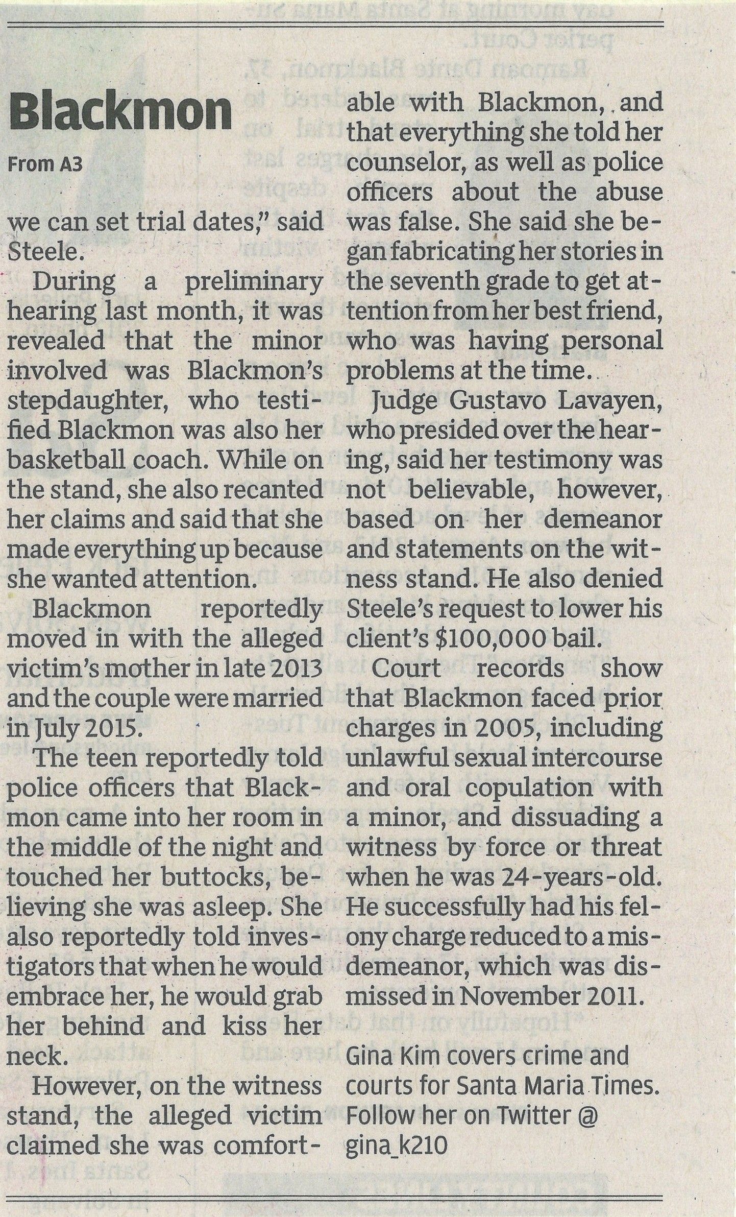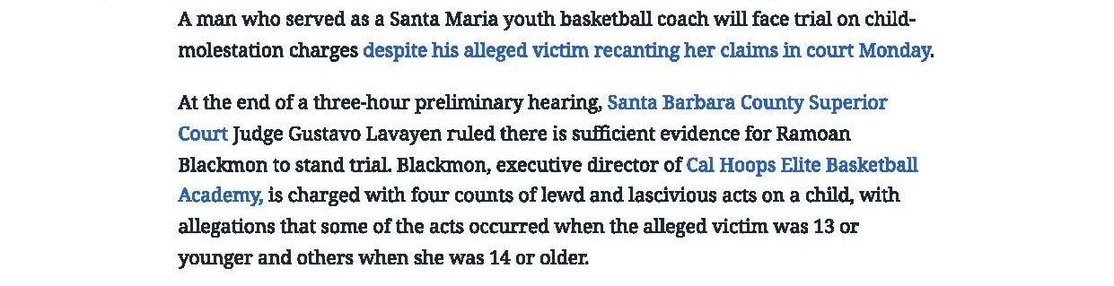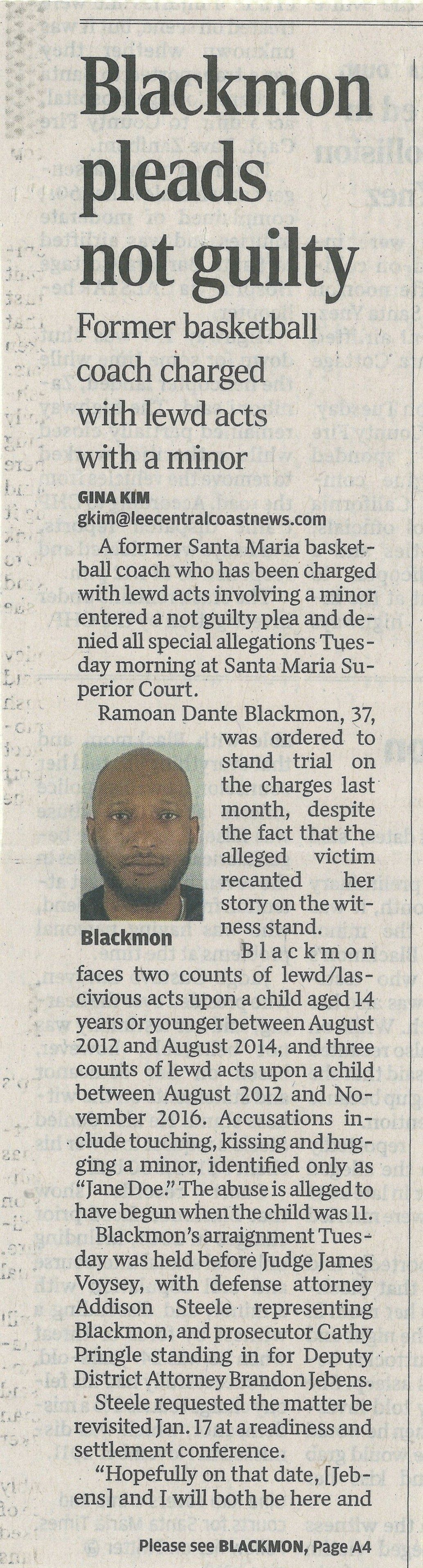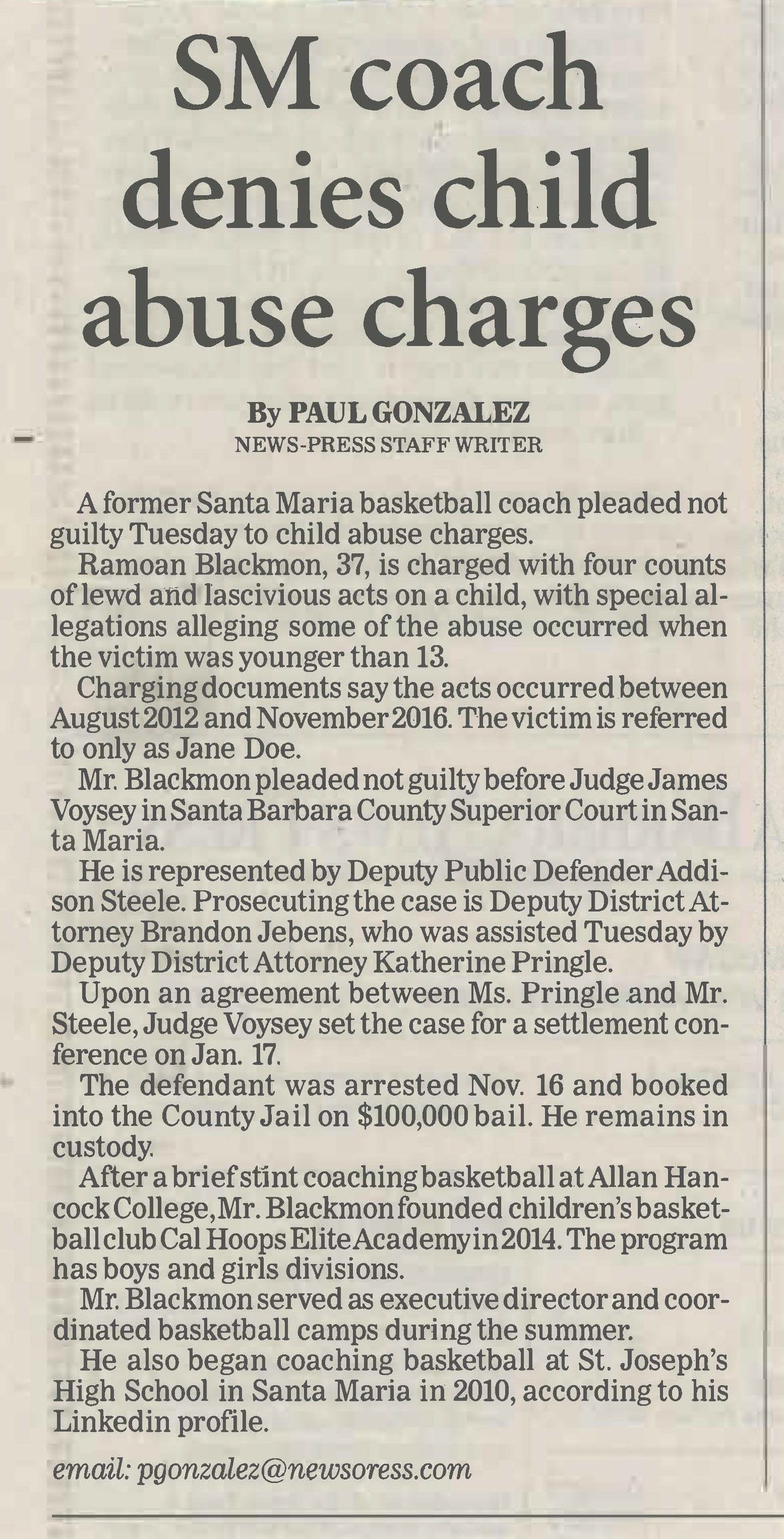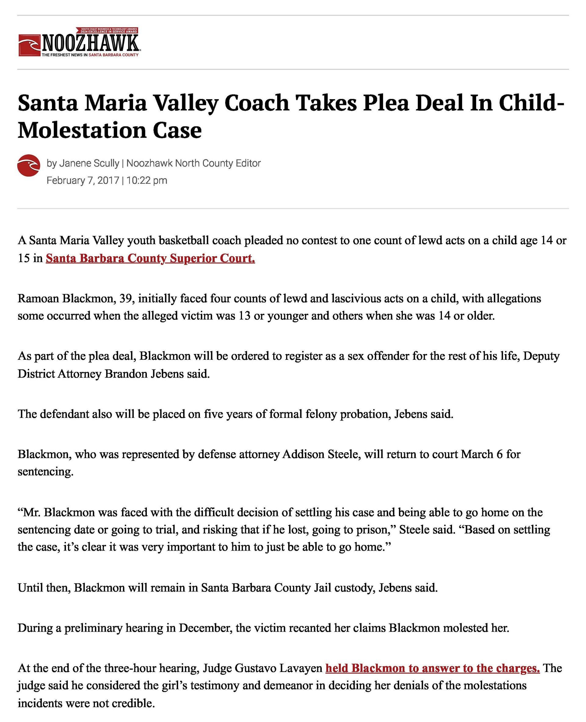 What Were Noozhawk's 16 Most-Read Stories of 2016?: Carnage, killings, wildfires and court cases captivated readers during a tumultuous year | December 30, 2016 | Noozhawk | Tom Bolton and Giana Magnoli Man Gets Seven Years in Domestic Violence Case | December 21, 2016 | Santa Barbara Independent | Kelsey Brugger Santa Maria youth basketball coach to face trial on molestation charges | December 20, 2016 | San Luis Obispo Tribune | Janene Scully Santa Maria Youth Basketball Coach Will Face Trial on Molestation Charges | December 19, 2016 | Noozhawk | Janene Scully Tentative April Trial Date Set for Goleta-Area Quadruple Murder Case: Nicolas Holzer has entered an insanity plea to charges he murdered his parents and two sons in August of 2014 | December 15, 2016 | Noozhawk | Giana Magnoli Han family murder suspect sent letter to DA after alleged crimes | December 6, 2016 | News Channel 12-3-11 | News Channel 3-12 Basketball coach charged with lewd acts pleads not guilty | December 5, 2016 | Santa Maria Times | Gina Kim Preliminary Hearing Date Delayed for Santa Barbara-Area Triple-Murder Suspect | November 15, 2016 | Noozhawk | Giana Magnoli Han Family Murder Suspect Appears Appears in Santa Barbara Court Tuesday | August 9, 2016 | News Channel 12-3-11 | News Channel 3-12 Hearing Delayed for Suspect in Han Family Triple Murder Case | August 9, 2016 | Noozhawk | Brooke Holland Former youth pastor charged with sex abuse sentenced to 8 years | July 6, 2016 | Santa Maria Times | Gina Kim Haobsh Claims Innocence in Han Family Murders: Not Guilty Plea Pushes Case Forward | May 5, 2016 | Santa Barbara Independent | Lena Garcia Triple-Murder Suspect Pleads Not Guilty in Santa Barbara Superior Court | May 5, 2016 | Noozhawk | Giana Magnoli Operation Matador defendants will wait to set preliminary hearing: Suspects linked to MS-13 will return to court in July | April 29, 2016 | Santa Maria Times | Gina Kim Attorneys Subpoena Mental-Health Records in Goleta-Area Quadruple Murder Case: Nicolas Holzer has entered an insanity plea for killing of his parents and 2 children in 2014 | April 26, 2016 | Noozhawk | Giana Magnoli Arraignment for SM man accused of sex abuse continued | April 25, 2016 | Santa Maria Times | April Charlton Haobsh Denied Access to Public Defender; Attorney Not Allowed in County Jail, Calls Block "Unprecedented" | April 14, 2016 | Santa Barbara Independent | Lena Garcia Pierre Haobsh Makes Second Court Appearance | April 13, 2016 | YouTube | News Channel 3-12 Arraignment Delayed Again For Triple-A Suspect Pierre Haobsh: Man accused of killing Dr. Weidong "Henry" Han, his wife and daughter ordered to return to Santa Barbara Superior Court on May 5 | April 12, 2016 | Noozhawk | Giana Magnoli Inside the Han Family Murders: The Investigation, and Legacy of Dr. Henry Han | March 30, 2016 | Santa Barbara Independent | Lena Garcia Triple-Homicide Suspect Appears in Court to Face First-Degree Murder Charges: Pierre Haobsh is also accused of special allegations that could lead to death penalty in slayings of 3 Han family members | March 28, 2016 | Noozhawk | Sam Goldman MS-13 Gang Arraignment | March 18, 2016 | YouTube | Santa Maria Times