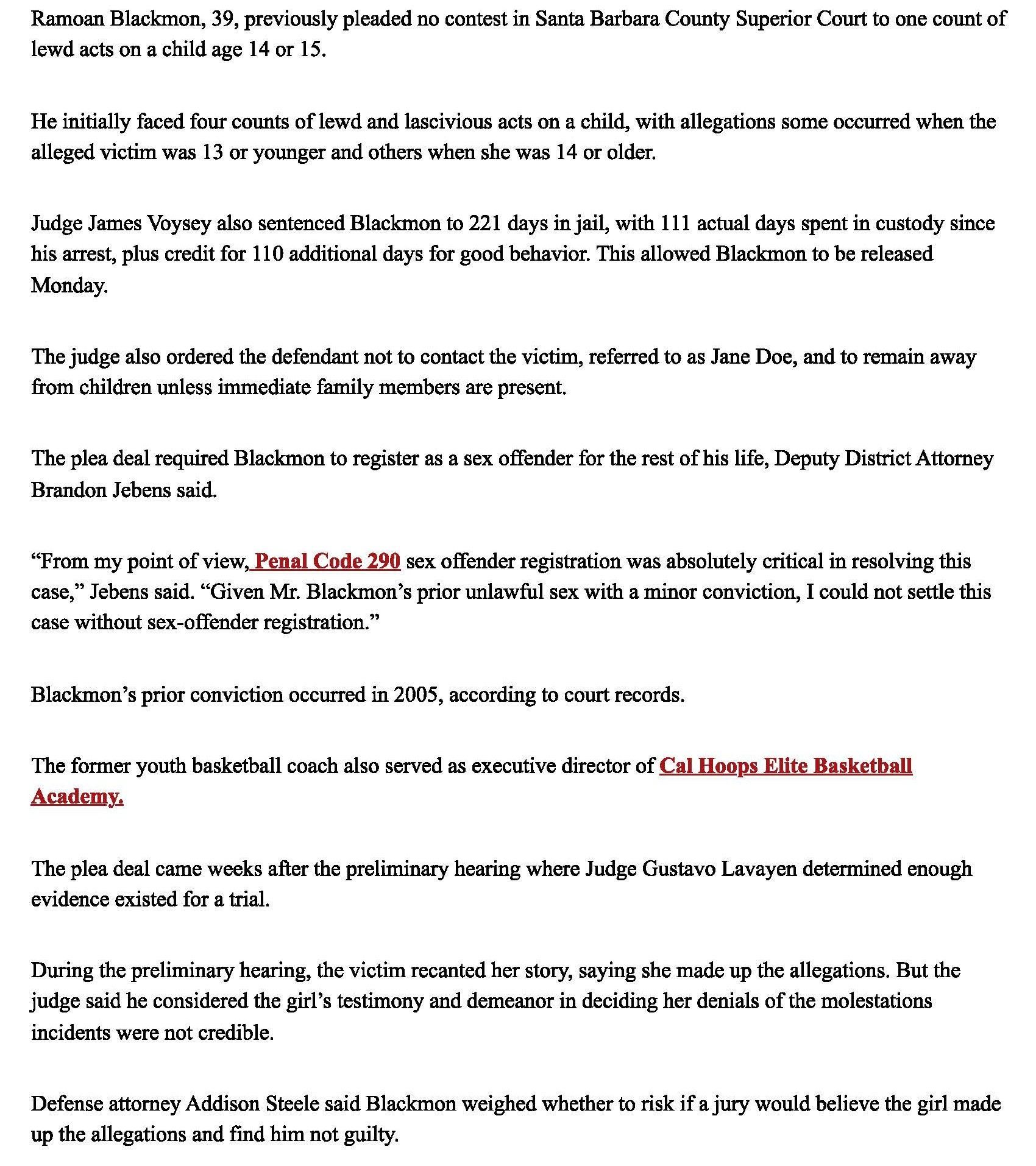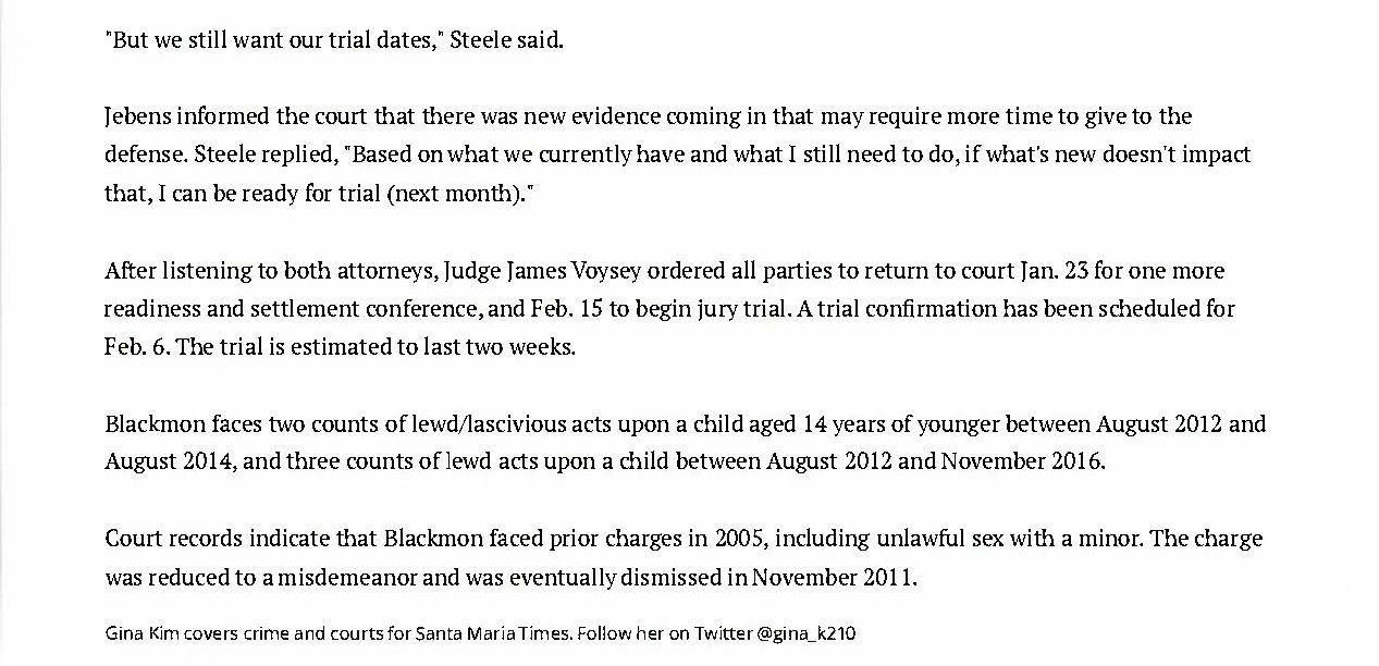A Grisly Crime: Recap of the Pierre Haobsh Trial: How the Triple-Murder Case Played Out Leading to the Guilty Verdict | December 1, 2021 | Santa Barbara Independent | Ryan P. Cruz Triple-Murder Suspect Pierre Haobsh Gives His Account of Days Leading to Han Family Murders; Defendant describes his involvement with multiple companies and his belief that the U.S. Department of Energy was targeting him | November 23, 2021 | Noozhawk | Serena Guentz Haobsh Spins a Story on the Stand: Accused of Triple Murder, Alleged Killer Gives His Version of the Evidence | November 23, 2021 | Santa Barbara Independent | Jean Yamamura & Nick Welsh Triple-Murder Suspect Pierre Haobsh Starts Testifying in Own Defense During Santa Barbara Trial: He faces murder charges in the 2016 killings of Goleta-area Dr. Weidong 'Henry' Han, Huijie 'Jennie' Yu and their daughter, Emily | November 22, 2021 | Noozhawk | Serena Guentz Defense Team Raises Doubts in Case Against Accused Han Family Killer: Pierre Haobsh's Attorneys Question Reliability of Cell Phone Data Records | November 19, 2021 | Santa Barbara Independent | Ryan P. Cruz & Jun Starkey Triple-Murder Trial for Pierre Haobsh Continues with Defense Witnesses | November 18, 2021 | Noozhawk | Serena Guentz Review of Suspect's Computer Search History May Implicate Him in Triple Homicide | November 17, 2021 | Vanguard | Mairead Perez Computer Analyst Provides Forensic Evidence in Triple Murder Case | November 16, 2021 | Vanguard | Joshua Cenzano Trial for Triple-Murder Suspect Pierre Haobsh Hears Testimony From Expert Witness: Lead investigator says the web history on Haobsh's laptop included a search for 'can 22lr hollow point penetrate the skull' | November 12, 2021 | Noozhawk | Serena Guentz Grim Friday Hearing in Haobsh Trial; Photos Displayed of Triple Murder Victims as Evidence Unfolds | November 5, 2021 | Santa Barbara Independent | Jean Yamamura Triple-Murder Trial for Pierre Haobsh Continues with Testimony From Sheriff's Personnel: Segments of Detective Jeff McDaniel's four-hour interrogation with the suspect, accused of killing the Han family in 2016, also a shown in court | November 5, 2021 | Noozhawk | Serena Guentz Inside the Interrogation Room with Accused Killer Pierre Haobsh; Witness Testimony Continued Thursday in Han Family Triple Murder Case | November 4, 2021 | Santa Barbara Independent | Ryan P. Cruz Witness Testimony Begins in Han Family Triple Murder Case: Prosecutors Lay the Foundation for Arguments Against Alleged Murderer Pierre Haobsh | October 29, 2021 | Santa Barbara Independent | Serena Guentz Triple-Murder Trial Starts for Pierre Haobsh, Accused of 2016 Slayings of Han Family | October 28, 2021 | Noozhawk | Giana Magnoli P ublic Defender Objects to Late Trial Video Evidence, Suggesting It Was Racist and Offensive | September 1, 2021 | Vanguard | Carson Eschen Santa Barbara DA Drops Bid for Death Penalty in Han Family Murder Case: In Exchange, Triple Homicide Defendant Agrees to Trial by Judge Instead of Jury | August 13, 2021 | Santa Barbara Independent | Nick Welsh Triple-Murder Suspect Pierre Haobsh Waives Right to Jury Trial, Will Have Case Heard in a Bench Trial: Santa Barbara County District Attorney's Office drops intention to seek death penalty in the case, attorneys said Thursday | August 12, 2021 | Noozhawk | Brooke Holland Public Defender Argues Defendant Should Be Allowed to Possess Discovery During Trial; District Attorney Disagrees, Citing Safety Concern | August 12, 2021 | Vanguard | Michelle Lagos Defendant Waive Rights, Accepts Plea Deal, Pleads No Contest to Charges | August 8, 2021 | Vanguard | Lauren Smith Triple-Murder Suspect Pierre Haobsh Expected to Waive Right to Jury Trial, Defense Says: Attorneys make a brief appearance as they work toward a final agreement for a bench trial in the deaths of Dr. Henry Han, his wife and child | July 22, 2021 | Noozhawk | Brooke Holland Santa Barbara County judge approves motion to continue MS-13 trial May 3 | January 8, 2021 | Santa Maria Times | Dave Minsky