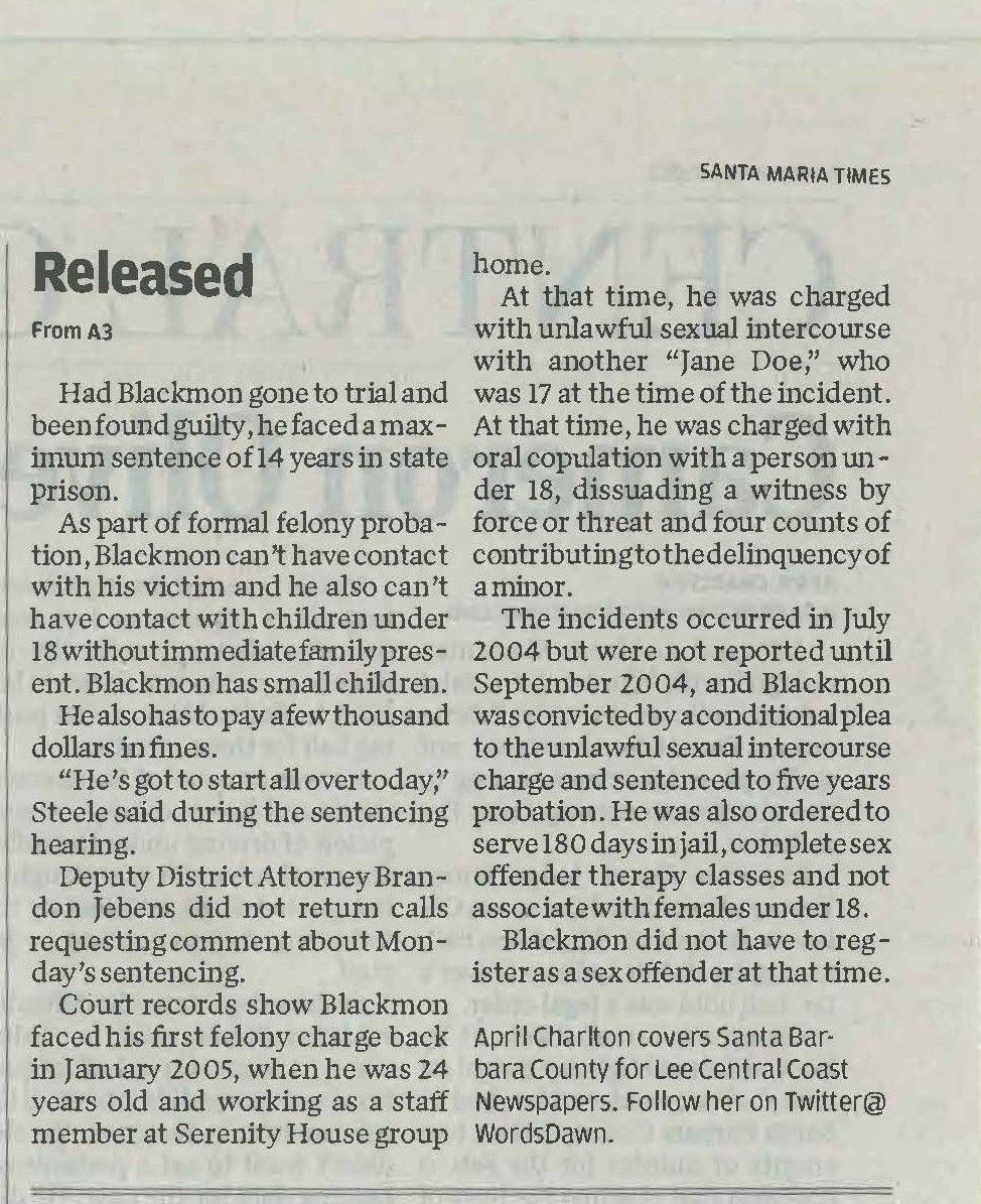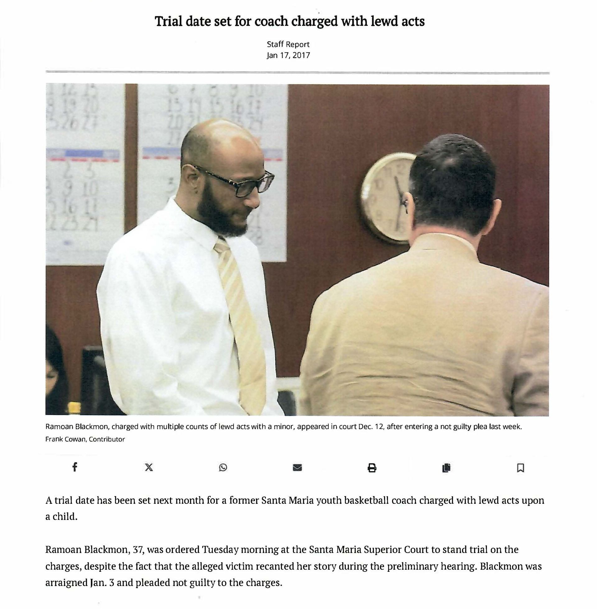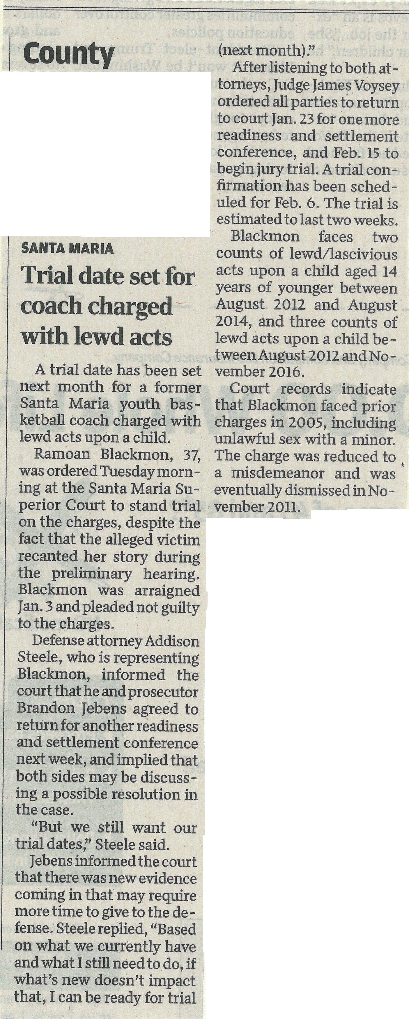 Defendants In Marilyn Pharis's Death Make Brief Court Appearance | November 19, 2015 | Noozhawk | Janene Scully Goleta-Area Man Accused of Killing His Family Enters Not Guilty by Reason of Insanity | October 21, 2015 | Noozhawk | Lara Cooper Arraignment Delayed for Former Hancock College Basketball Players Charged With Murder | October 19, 2015 | Noozhawk | Janene Scully At a Glance: Santa Maria: Arraignment continued again in Lompoc murder case | September 30, 2015 | Lompoc Record Men accused in Marilyn Pharis attack in court, case continued: New attorney on board as Public Defender's Office prepares for potential death penalty defense | September 17, 2015 | Santa Ynes Valley News | Kyle Harding Men accused in Marilyn Pharis attack in court, case continued: New attorney on board as Public Defender's Office prepares for potential death penalty defense | September 17, 2015 | Santa Maria Times | Kyle Harding Psychiatric Search Narrows in Holzer Case: Five Forensic Experts Considered to Perform Evaluation | September 16, 2015 | Santa Barbara Independent | Kelsey Knorp Prosecution in Lompoc murder case focuses on social media activity | September 1, 2015 | Santa Maria Times | Kenny Lindberg Inept Inmate Care by Corizon? Supervisors Must Decide Path for County Inmates' Health | August 20, 2015 | Santa Barbara Independent | Kelsey Brugger Defense continues cross-examination of boy, 14 | August 20, 2015 | Santa Barbara Times | Kenny Lindberg Man Accused of Murdering Family May Enter Insanity Plea in Santa Barbara Court | August 11, 2015 | Noozhawk | Lara Cooper Last U-Haul defendant sentenced | August 3, 2015 | Santa Ynez Valley News | Ryah Cooley Last U-Haul defendant sentenced | August 3, 2015 | Santa Maria Times | Ryah Cooley Man accused of ordering murder from behind bars appears in court: Three others enter not-guilty pleas, will proceed to trial | July 21, 2015 | Santa Maria Times | Kyle Harding Judge Rules Former Allan Hancock College Basketball Players to Be Tried on Murder, Other Charges | June 24, 2015 | Noozhawk | Janene Scully Preliminary Hearing Begins for Former Hancock College Basketball Players Charged with Murder: Ali Mohammed and Lavell White are accused of the fatal shooting of a 23-year-0ld man in Santa Maria during an alleged drug deal | June 23, 2015 | Noozhawk | Janene Scully Preliminary hearing set in robbery and carjacking case | May 27, 2015 | Santa Maria Times | Kyle Harding Five Men Sentenced to Life in Prison Without Parole for Torture-Murder of Anthony Ibarra: Judge rules on numerous motions during the hearing, during which family members of Ibarra speak out about 'the nightmare that will never end | May 22, 2015 | Noozhawk | Janene Scully Trio Held to Answer on Charges Related to Guadalupe Homicide | May 16, 2015 | Lompoc Record | Kyle Harding State Prison Inmate Accused of Orchestrating Murder of Santa Maria Man: Judge rules three other defendants should stand trial in the shooting of Javier Limon | May 15, 2015 | Noozhawk | Janene Scully 5 of 6 Defendants Found Guilty of First Degree Murder in U-Haul Trial: Sixth defendant pleads to kidnapping after mistrial declared | April 7, 2015 | Santa Maria Times | Kyle Harding 5 of 6 Defendants Found Guilty of First Degree Murder in U-Haul Trial: Sixth defendant pleads to kidnapping after mistrial declared | April 7, 2015 | Santa Ynez Valley News | Kyle Harding 5 Men Found Guilty in Santa Maria Torture-Murder Case: Jury in Ibarra case returns guilty verdicts against five of the six defendants | April 7, 2015 | Noozhawk | Janene Scully U-Haul juror dismissed, deliberations start over | March 31, 2015 | Santa Maria Times | Kyle Harding Jury Begins Deliberating in Santa Maria Torture-Murder Trial | March 24, 2015 | Noozhawk | Janene Scully U-Haul closing arguments continue | March 20, 2015 | Santa Maria Times | Kyle Harding U-Haul defense casts doubt on witness credibility | March 19, 2015 | Santa Maria Times | Kyle Harding County Lines: Santa Maria: U-Haul defense casts doubt on witness credibility | March 19, 2015 | Santa Maria Times No hearing yet for Hancock College basketball players | March 16, 2015 | Santa Maria Times | Staff Report Sentencing Hearing an Explosive Ending to Santa Barbara County's First Human Trafficking Trial: Brannon Lawrence Pitcher, found guilty by a jury of prostituting a teen girl, is kicked out of the courtroom for shouting at the judge | March 13, 2015 | Noozhawk | Lara Cooper Second Defendant Testifies in Ibarra Murder Trial | March 13, 2015 | Noozhawk | Janene Scully Second U-Haul Defendant Testifies, Counters Allegations | March 12, 2015 | Lompoc Record | Kyle Harding Sentencing Delayed in Human Trafficking Case | March 8, 2015 | Santa Barbara Independent | Colleen Flaherty Cameron Oliver Arraigned on Murder Charges is Drunk Driving Crash | March 8, 201 5 | News Channel 12-3-11 | News Channel 3-12 Week 8: Santa Maria Ibarra Murder Trial | March 7, 2015 | New Channel 12-3-11 | News Channel 3-12 Defendant testifies he was not present when Anthony Ibarra died | March 6, 2015 | Santa Maria Times | Kyle Harding U-Haul Defendant Takes the Stand | March 5, 2015 | Santa Maria Times | Kyle Harding Defendant Takes Witness Stand in Own Defense in Ibarra Murder Trial: Anthony "AJ" Solis denies gang membership during testimony | March 5, 2015 | Noozhawk | Janene Scully Defense Expert Testifies About Phrase 'Gang Associate' During Ibarra Murder Trial | March 3, 2015 | Noozhawk | Janene Scully Prosecution Rests in Santa Maria Trial of Six Defendants Charged in Ibarra Murder: Defense attorneys ask the judge to acquit their clients, accused of the gang-related torture-slaying of Anthony Ibarra in March 2013 | February 27, 2015 | Noozhawk | Janene Scully U-Haul defense continues cross-examination of SMPD gang detective | February 26, 2015 | Santa Maria Times | Kyle Harding U-Haul defense attorneys question SMPD detective: Prosecutor, detective paint picture of local gang violence | February 24, 2015 | Santa M