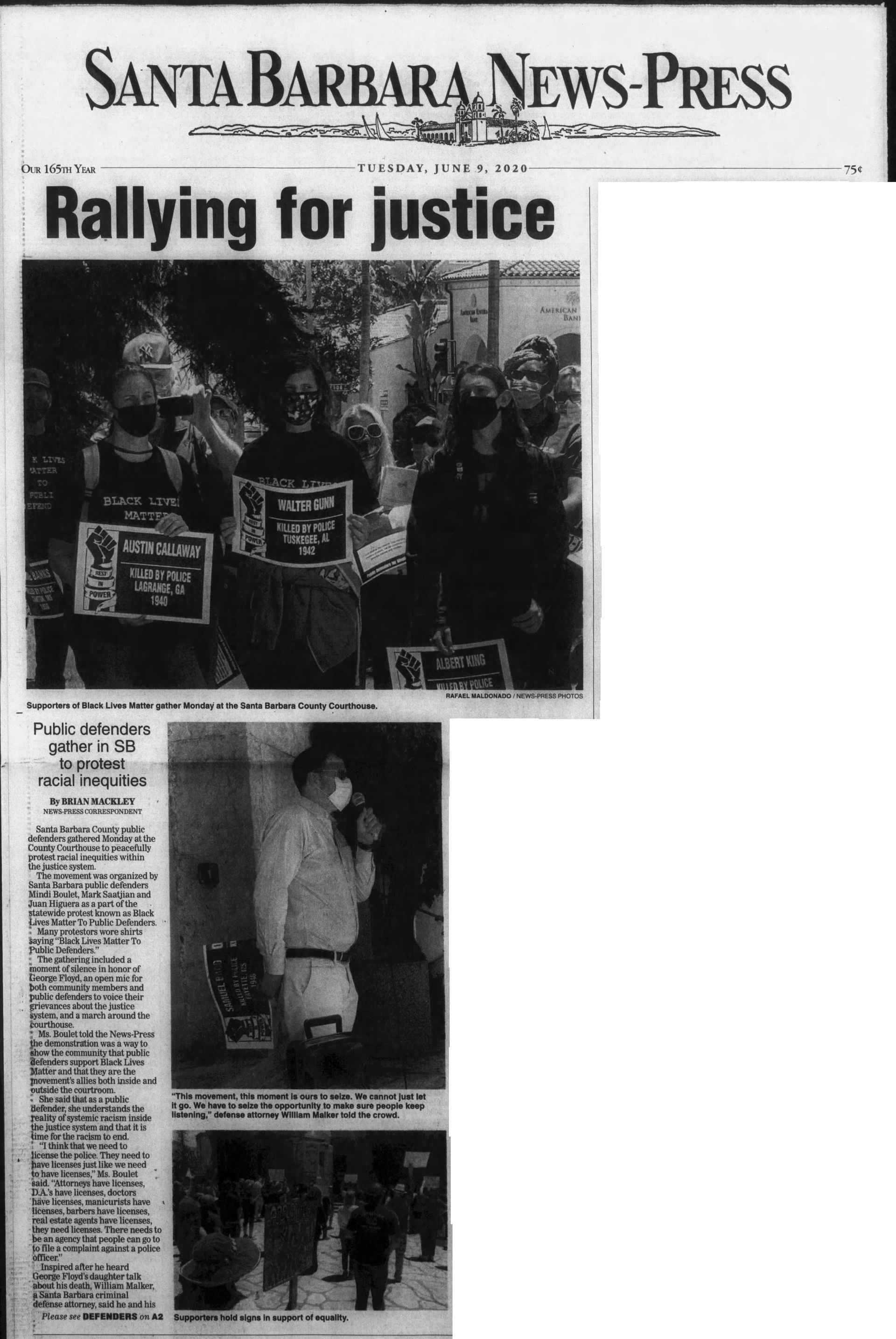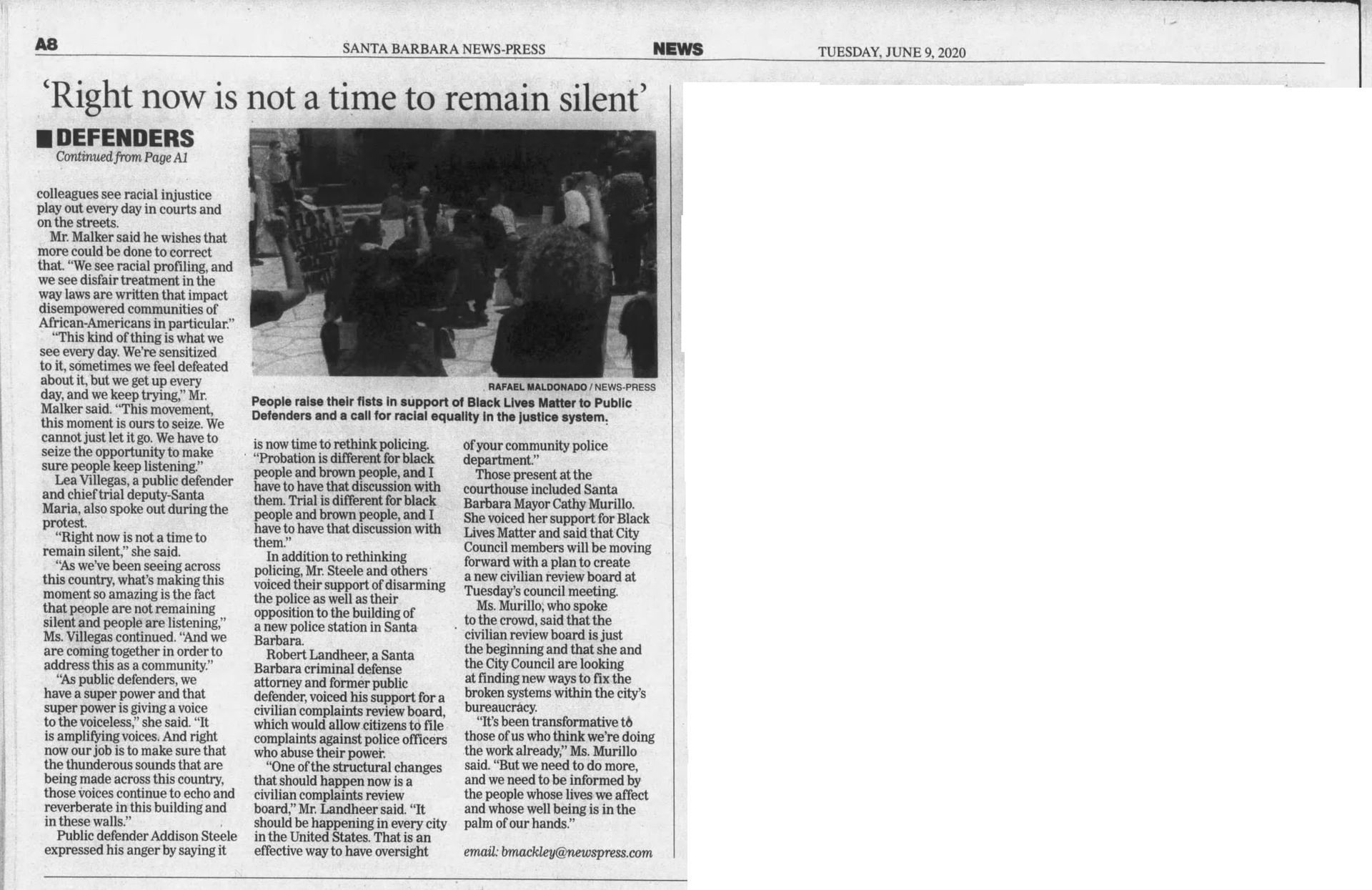 Attorneys Discuss Jury Selection for Man Charged With Murdering Dr. Henry Han and Family | October 28, 2020 | Noozhawk | Brooke Holland Public Defenders Set Plan for One-on-One Virtual Meeting with Triple-Murder Suspect Pierre Haobsh | August 12, 2020 | Noozhawk | Brooke Holland Court Hearing Held for Pierre Haobsh, Suspect in 2016 Murders of Dr. Henry Han and Family: His attorneys say accessibility issues are hindering efforts to schedule a trial; the case is scheduled to return to court next month | July 29, 2020 | Noozhawk | Brooke Holland Santa Barbara Public Defenders Demand Civil Justice in Black Lives Matter Demonstration | June 8, 2020 | News Channel 12-3-11 | Scott Sheahen Public Defenders Make a Stand for Black Lives | June 8, 2020 | Santa Barbara Independent | Jean Yamamura MS-13 judge to consider protecting juror identities | February 14, 2020 | Santa Maria Times | Dave Minsky