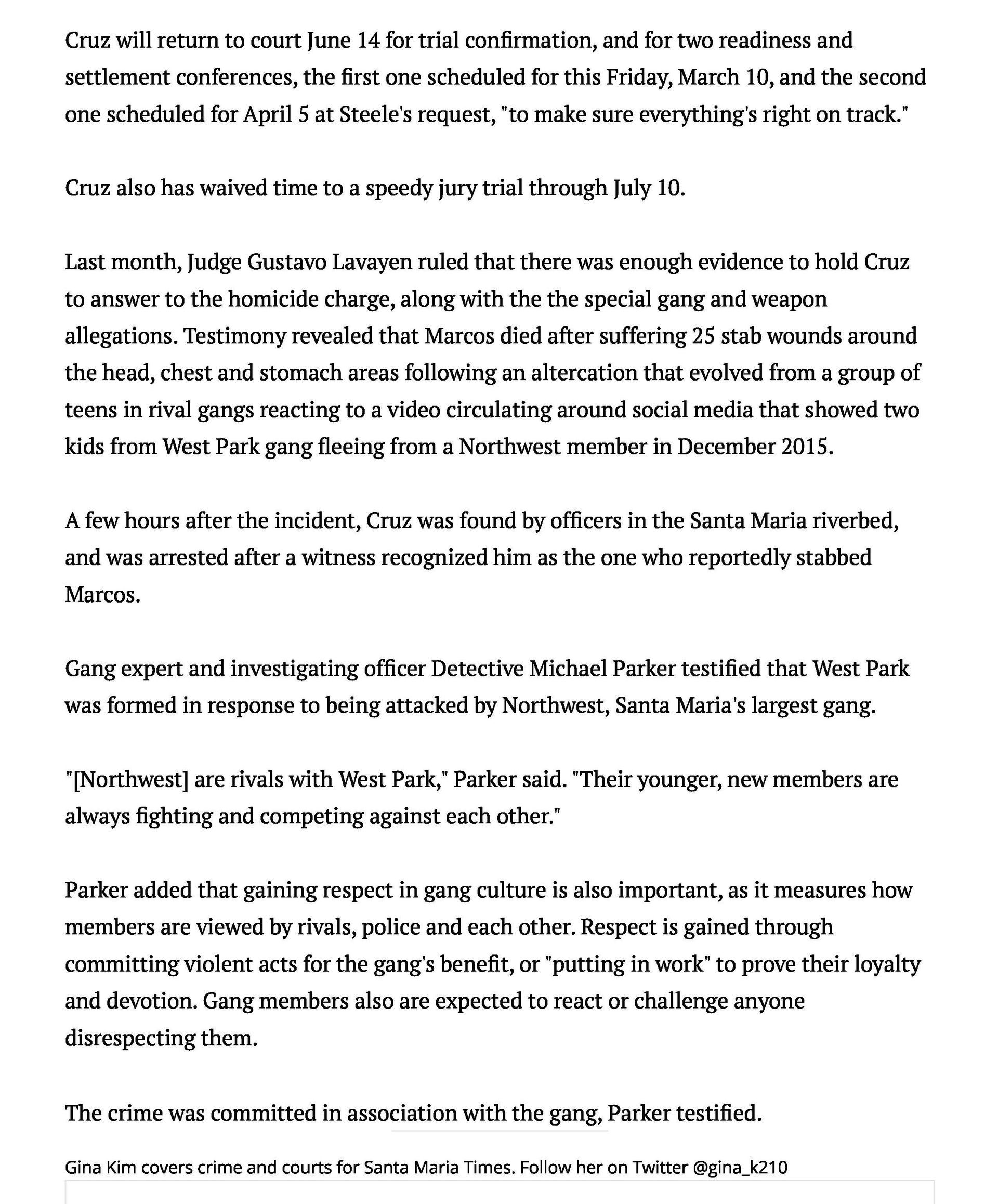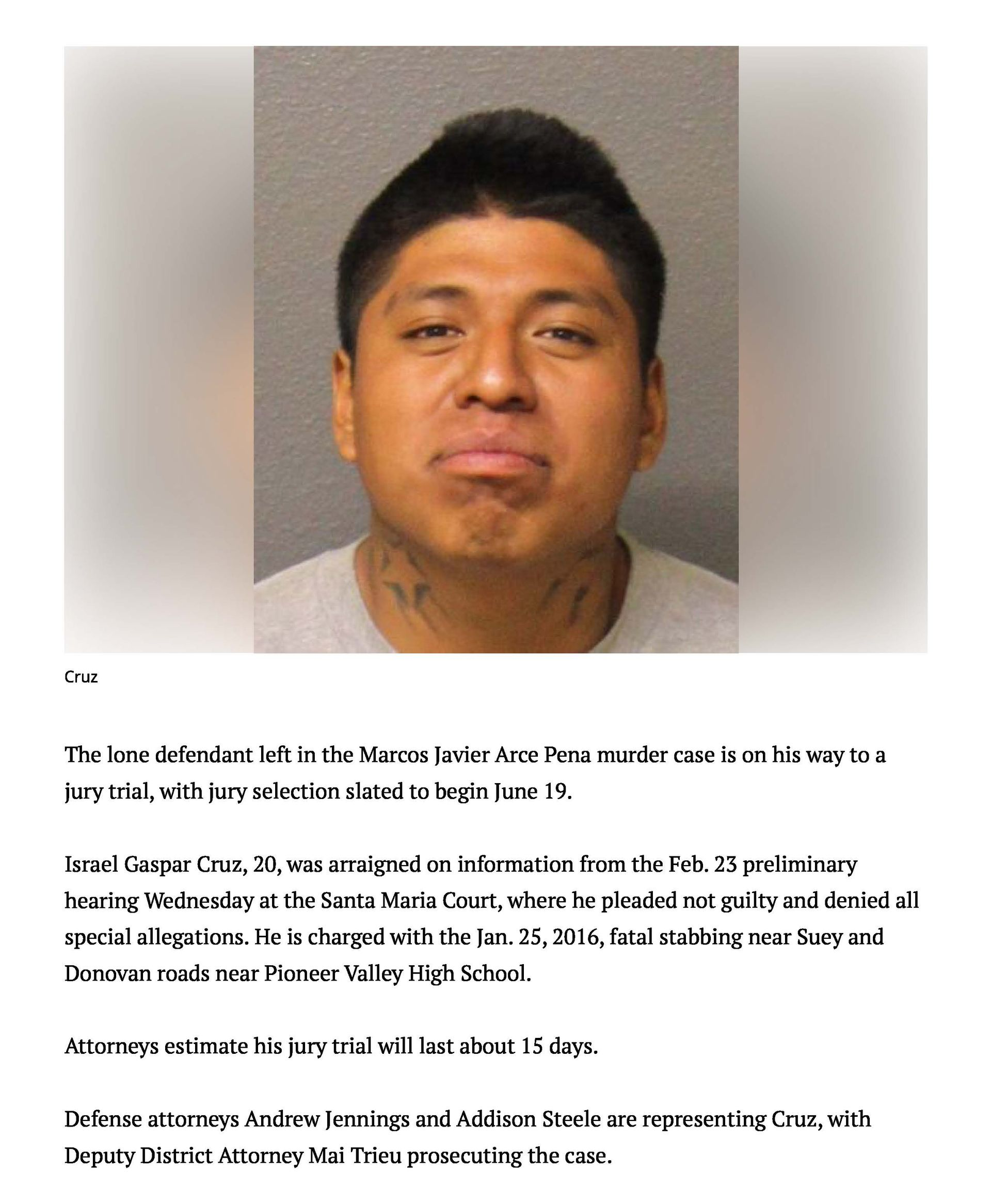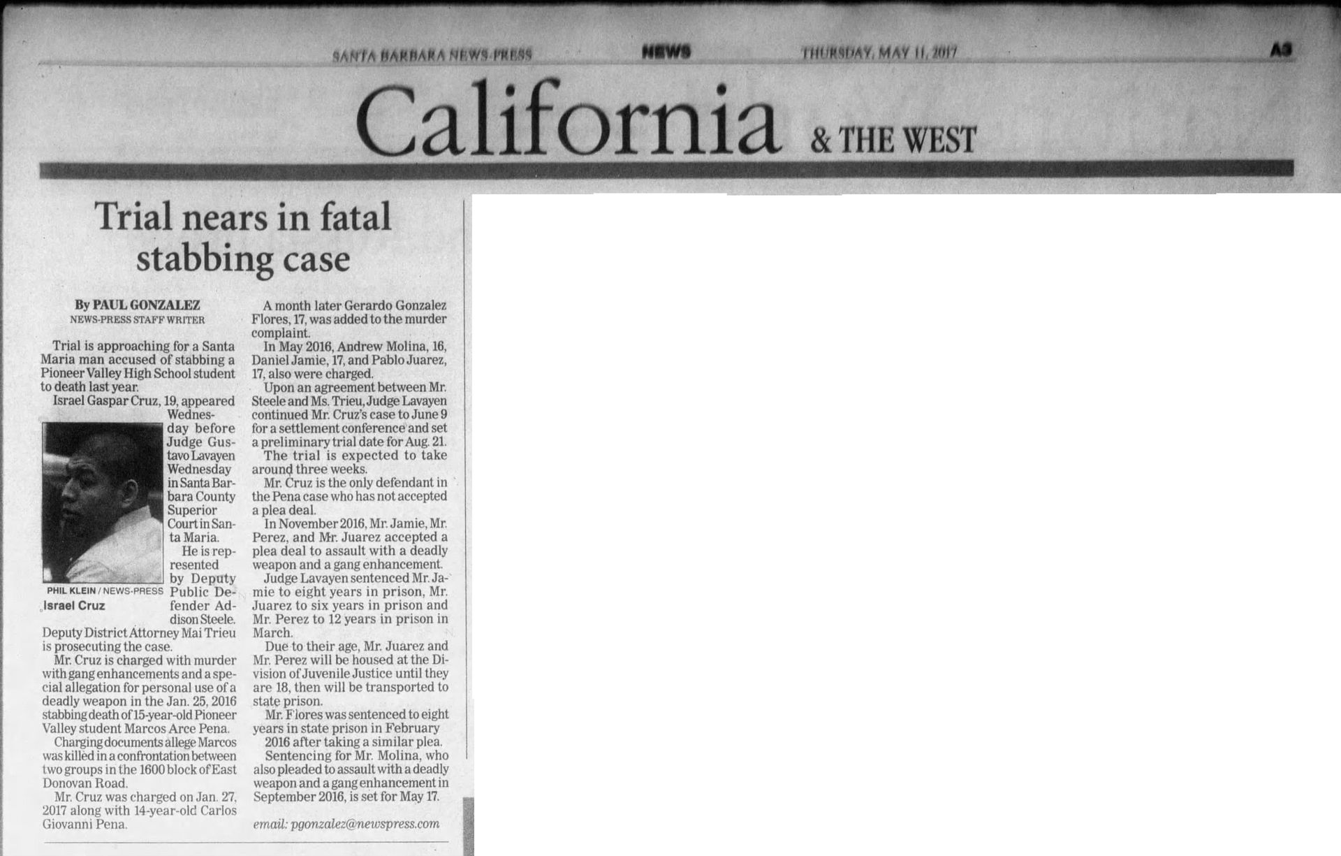 Defendants In Marilyn Pharis's Death Make Brief Court Appearance | November 19, 2015 | Noozhawk | Janene Scully Goleta-Area Man Accused of Killing His Family Enters Not Guilty by Reason of Insanity | October 21, 2015 | Noozhawk | Lara Cooper Arraignment Delayed for Former Hancock College Basketball Players Charged With Murder | October 19, 2015 | Noozhawk | Janene Scully At a Glance: Santa Maria: Arraignment continued again in Lompoc murder case | September 30, 2015 | Lompoc Record Men accused in Marilyn Pharis attack in court, case continued: New attorney on board as Public Defender's Office prepares for potential death penalty defense | September 17, 2015 | Santa Ynes Valley News | Kyle Harding Men accused in Marilyn Pharis attack in court, case continued: New attorney on board as Public Defender's Office prepares for potential death penalty defense | September 17, 2015 | Santa Maria Times | Kyle Harding Psychiatric Search Narrows in Holzer Case: Five Forensic Experts Considered to Perform Evaluation | September 16, 2015 | Santa Barbara Independent | Kelsey Knorp Prosecution in Lompoc murder case focuses on social media activity | September 1, 2015 | Santa Maria Times | Kenny Lindberg Inept Inmate Care by Corizon? Supervisors Must Decide Path for County Inmates' Health | August 20, 2015 | Santa Barbara Independent | Kelsey Brugger Defense continues cross-examination of boy, 14 | August 20, 2015 | Santa Barbara Times | Kenny Lindberg Man Accused of Murdering Family May Enter Insanity Plea in Santa Barbara Court | August 11, 2015 | Noozhawk | Lara Cooper Last U-Haul defendant sentenced | August 3, 2015 | Santa Ynez Valley News | Ryah Cooley Last U-Haul defendant sentenced | August 3, 2015 | Santa Maria Times | Ryah Cooley Man accused of ordering murder from behind bars appears in court: Three others enter not-guilty pleas, will proceed to trial | July 21, 2015 | Santa Maria Times | Kyle Harding Judge Rules Former Allan Hancock College Basketball Players to Be Tried on Murder, Other Charges | June 24, 2015 | Noozhawk | Janene Scully Preliminary Hearing Begins for Former Hancock College Basketball Players Charged with Murder: Ali Mohammed and Lavell White are accused of the fatal shooting of a 23-year-0ld man in Santa Maria during an alleged drug deal | June 23, 2015 | Noozhawk | Janene Scully Preliminary hearing set in robbery and carjacking case | May 27, 2015 | Santa Maria Times | Kyle Harding Five Men Sentenced to Life in Prison Without Parole for Torture-Murder of Anthony Ibarra: Judge rules on numerous motions during the hearing, during which family members of Ibarra speak out about 'the nightmare that will never end | May 22, 2015 | Noozhawk | Janene Scully Trio Held to Answer on Charges Related to Guadalupe Homicide | May 16, 2015 | Lompoc Record | Kyle Harding State Prison Inmate Accused of Orchestrating Murder of Santa Maria Man: Judge rules three other defendants should stand trial in the shooting of Javier Limon | May 15, 2015 | Noozhawk | Janene Scully 5 of 6 Defendants Found Guilty of First Degree Murder in U-Haul Trial: Sixth defendant pleads to kidnapping after mistrial declared | April 7, 2015 | Santa Maria Times | Kyle Harding 5 of 6 Defendants Found Guilty of First Degree Murder in U-Haul Trial: Sixth defendant pleads to kidnapping after mistrial declared | April 7, 2015 | Santa Ynez Valley News | Kyle Harding 5 Men Found Guilty in Santa Maria Torture-Murder Case: Jury in Ibarra case returns guilty verdicts against five of the six defendants | April 7, 2015 | Noozhawk | Janene Scully U-Haul juror dismissed, deliberations start over | March 31, 2015 | Santa Maria Times | Kyle Harding Jury Begins Deliberating in Santa Maria Torture-Murder Trial | March 24, 2015 | Noozhawk | Janene Scully U-Haul closing arguments continue | March 20, 2015 | Santa Maria Times | Kyle Harding U-Haul defense casts doubt on witness credibility | March 19, 2015 | Santa Maria Times | Kyle Harding County Lines: Santa Maria: U-Haul defense casts doubt on witness credibility | March 19, 2015 | Santa Maria Times No hearing yet for Hancock College basketball players | March 16, 2015 | Santa Maria Times | Staff Report Sentencing Hearing an Explosive Ending to Santa Barbara County's First Human Trafficking Trial: Brannon Lawrence Pitcher, found guilty by a jury of prostituting a teen girl, is kicked out of the courtroom for shouting at the judge | March 13, 2015 | Noozhawk | Lara Cooper Second Defendant Testifies in Ibarra Murder Trial | March 13, 2015 | Noozhawk | Janene Scully Second U-Haul Defendant Testifies, Counters Allegations | March 12, 2015 | Lompoc Record | Kyle Harding Sentencing Delayed in Human Trafficking Case | March 8, 2015 | Santa Barbara Independent | Colleen Flaherty Cameron Oliver Arraigned on Murder Charges is Drunk Driving Crash | March 8, 201 5 | News Channel 12-3-11 | News Channel 3-12 Week 8: Santa Maria Ibarra Murder Trial | March 7, 2015 | New Channel 12-3-11 | News Channel 3-12 Defendant testifies he was not present when Anthony Ibarra died | March 6, 2015 | Santa Maria Times | Kyle Harding U-Haul Defendant Takes the Stand | March 5, 2015 | Santa Maria Times | Kyle Harding Defendant Takes Witness Stand in Own Defense in Ibarra Murder Trial: Anthony "AJ" Solis denies gang membership during testimony | March 5, 2015 | Noozhawk | Janene Scully Defense Expert Testifies About Phrase 'Gang Associate' During Ibarra Murder Trial | March 3, 2015 | Noozhawk | Janene Scully Prosecution Rests in Santa Maria Trial of Six Defendants Charged in Ibarra Murder: Defense attorneys ask the judge to acquit their clients, accused of the gang-related torture-slaying of Anthony Ibarra in March 2013 | February 27, 2015 | Noozhawk | Janene Scully U-Haul defense continues cross-examination of SMPD gang detective | February 26, 2015 | Santa Maria Times | Kyle Harding U-Haul defense attorneys question SMPD detective: Prosecutor, detective paint picture of local gang violence | February 24, 2015 | Santa M