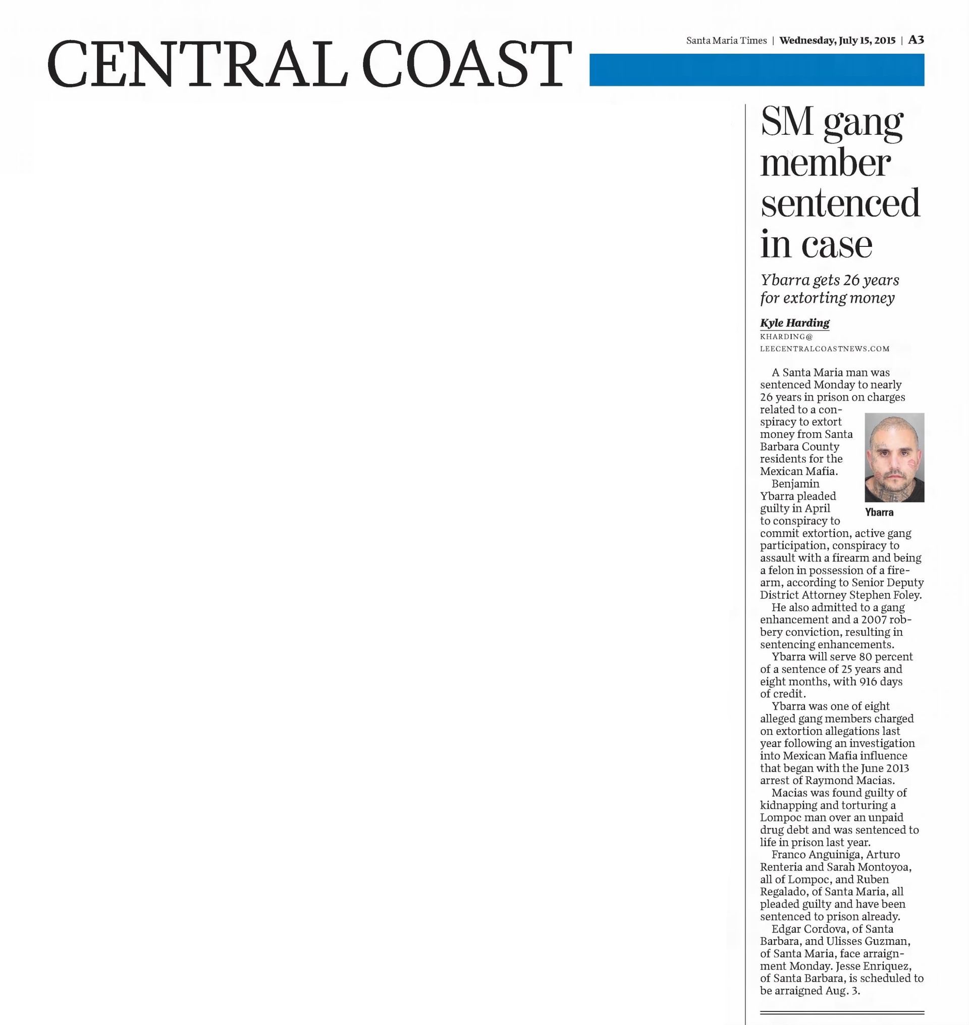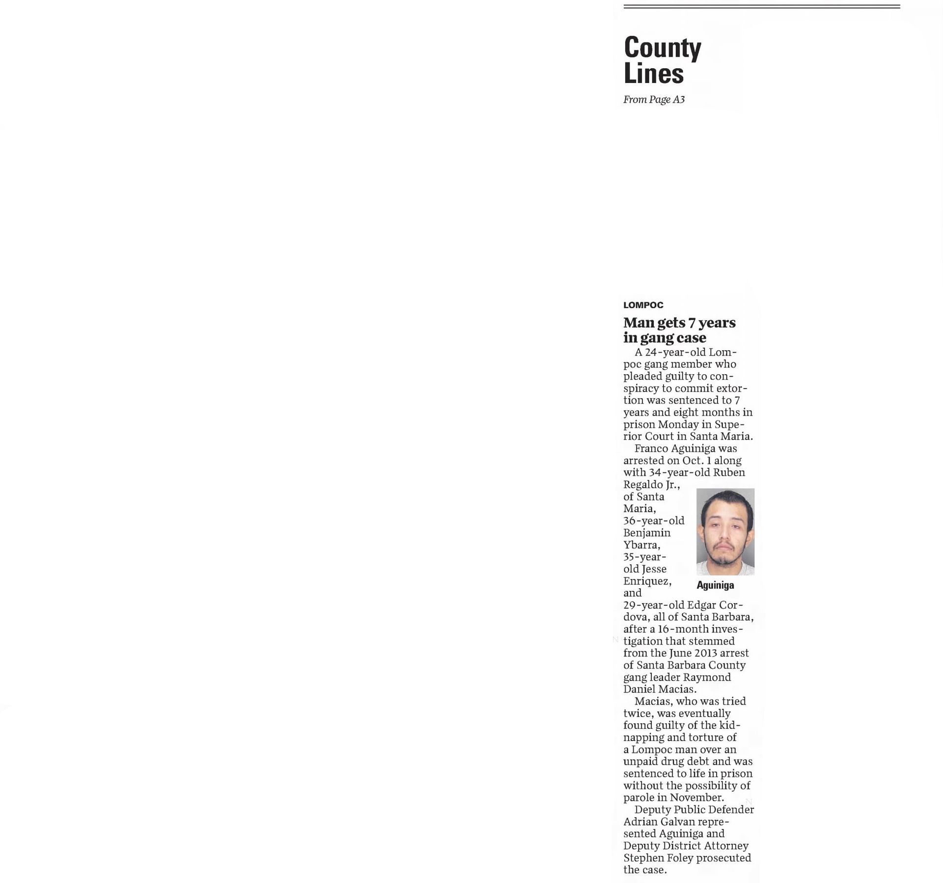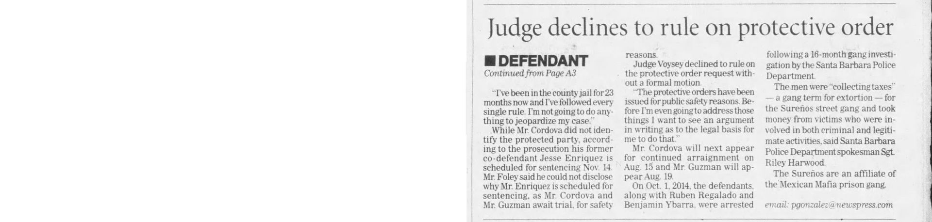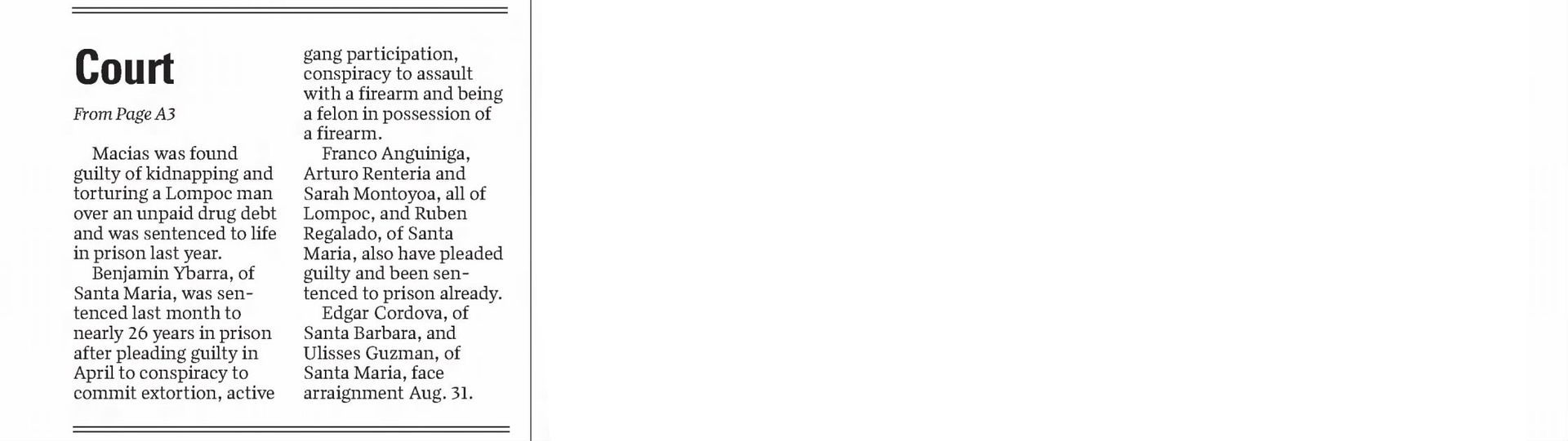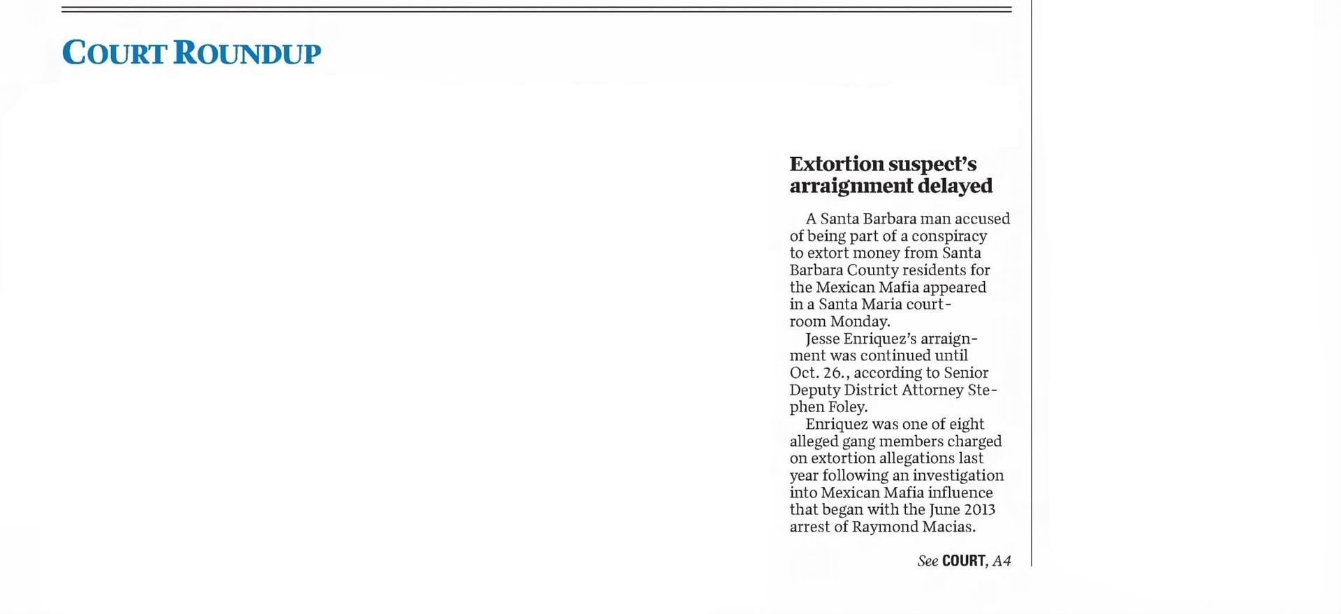 Defendants In Marilyn Pharis's Death Make Brief Court Appearance | November 19, 2015 | Noozhawk | Janene Scully Goleta-Area Man Accused of Killing His Family Enters Not Guilty by Reason of Insanity | October 21, 2015 | Noozhawk | Lara Cooper Arraignment Delayed for Former Hancock College Basketball Players Charged With Murder | October 19, 2015 | Noozhawk | Janene Scully At a Glance: Santa Maria: Arraignment continued again in Lompoc murder case | September 30, 2015 | Lompoc Record Men accused in Marilyn Pharis attack in court, case continued: New attorney on board as Public Defender's Office prepares for potential death penalty defense | September 17, 2015 | Santa Ynes Valley News | Kyle Harding Men accused in Marilyn Pharis attack in court, case continued: New attorney on board as Public Defender's Office prepares for potential death penalty defense | September 17, 2015 | Santa Maria Times | Kyle Harding Psychiatric Search Narrows in Holzer Case: Five Forensic Experts Considered to Perform Evaluation | September 16, 2015 | Santa Barbara Independent | Kelsey Knorp Prosecution in Lompoc murder case focuses on social media activity | September 1, 2015 | Santa Maria Times | Kenny Lindberg Inept Inmate Care by Corizon? Supervisors Must Decide Path for County Inmates' Health | August 20, 2015 | Santa Barbara Independent | Kelsey Brugger Defense continues cross-examination of boy, 14 | August 20, 2015 | Santa Barbara Times | Kenny Lindberg Man Accused of Murdering Family May Enter Insanity Plea in Santa Barbara Court | August 11, 2015 | Noozhawk | Lara Cooper Last U-Haul defendant sentenced | August 3, 2015 | Santa Ynez Valley News | Ryah Cooley Last U-Haul defendant sentenced | August 3, 2015 | Santa Maria Times | Ryah Cooley Man accused of ordering murder from behind bars appears in court: Three others enter not-guilty pleas, will proceed to trial | July 21, 2015 | Santa Maria Times | Kyle Harding Judge Rules Former Allan Hancock College Basketball Players to Be Tried on Murder, Other Charges | June 24, 2015 | Noozhawk | Janene Scully Preliminary Hearing Begins for Former Hancock College Basketball Players Charged with Murder: Ali Mohammed and Lavell White are accused of the fatal shooting of a 23-year-0ld man in Santa Maria during an alleged drug deal | June 23, 2015 | Noozhawk | Janene Scully Preliminary hearing set in robbery and carjacking case | May 27, 2015 | Santa Maria Times | Kyle Harding Five Men Sentenced to Life in Prison Without Parole for Torture-Murder of Anthony Ibarra: Judge rules on numerous motions during the hearing, during which family members of Ibarra speak out about 'the nightmare that will never end | May 22, 2015 | Noozhawk | Janene Scully Trio Held to Answer on Charges Related to Guadalupe Homicide | May 16, 2015 | Lompoc Record | Kyle Harding State Prison Inmate Accused of Orchestrating Murder of Santa Maria Man: Judge rules three other defendants should stand trial in the shooting of Javier Limon | May 15, 2015 | Noozhawk | Janene Scully 5 of 6 Defendants Found Guilty of First Degree Murder in U-Haul Trial: Sixth defendant pleads to kidnapping after mistrial declared | April 7, 2015 | Santa Maria Times | Kyle Harding 5 of 6 Defendants Found Guilty of First Degree Murder in U-Haul Trial: Sixth defendant pleads to kidnapping after mistrial declared | April 7, 2015 | Santa Ynez Valley News | Kyle Harding 5 Men Found Guilty in Santa Maria Torture-Murder Case: Jury in Ibarra case returns guilty verdicts against five of the six defendants | April 7, 2015 | Noozhawk | Janene Scully U-Haul juror dismissed, deliberations start over | March 31, 2015 | Santa Maria Times | Kyle Harding Jury Begins Deliberating in Santa Maria Torture-Murder Trial | March 24, 2015 | Noozhawk | Janene Scully U-Haul closing arguments continue | March 20, 2015 | Santa Maria Times | Kyle Harding U-Haul defense casts doubt on witness credibility | March 19, 2015 | Santa Maria Times | Kyle Harding County Lines: Santa Maria: U-Haul defense casts doubt on witness credibility | March 19, 2015 | Santa Maria Times No hearing yet for Hancock College basketball players | March 16, 2015 | Santa Maria Times | Staff Report Sentencing Hearing an Explosive Ending to Santa Barbara County's First Human Trafficking Trial: Brannon Lawrence Pitcher, found guilty by a jury of prostituting a teen girl, is kicked out of the courtroom for shouting at the judge | March 13, 2015 | Noozhawk | Lara Cooper Second Defendant Testifies in Ibarra Murder Trial | March 13, 2015 | Noozhawk | Janene Scully Second U-Haul Defendant Testifies, Counters Allegations | March 12, 2015 | Lompoc Record | Kyle Harding Sentencing Delayed in Human Trafficking Case | March 8, 2015 | Santa Barbara Independent | Colleen Flaherty Cameron Oliver Arraigned on Murder Charges is Drunk Driving Crash | March 8, 201 5 | News Channel 12-3-11 | News Channel 3-12 Week 8: Santa Maria Ibarra Murder Trial | March 7, 2015 | New Channel 12-3-11 | News Channel 3-12 Defendant testifies he was not present when Anthony Ibarra died | March 6, 2015 | Santa Maria Times | Kyle Harding U-Haul Defendant Takes the Stand | March 5, 2015 | Santa Maria Times | Kyle Harding Defendant Takes Witness Stand in Own Defense in Ibarra Murder Trial: Anthony "AJ" Solis denies gang membership during testimony | March 5, 2015 | Noozhawk | Janene Scully Defense Expert Testifies About Phrase 'Gang Associate' During Ibarra Murder Trial | March 3, 2015 | Noozhawk | Janene Scully Prosecution Rests in Santa Maria Trial of Six Defendants Charged in Ibarra Murder: Defense attorneys ask the judge to acquit their clients, accused of the gang-related torture-slaying of Anthony Ibarra in March 2013 | February 27, 2015 | Noozhawk | Janene Scully U-Haul defense continues cross-examination of SMPD gang detective | February 26, 2015 | Santa Maria Times | Kyle Harding U-Haul defense attorneys question SMPD detective: Prosecutor, detective paint picture of local gang violence | February 24, 2015 | Santa M
