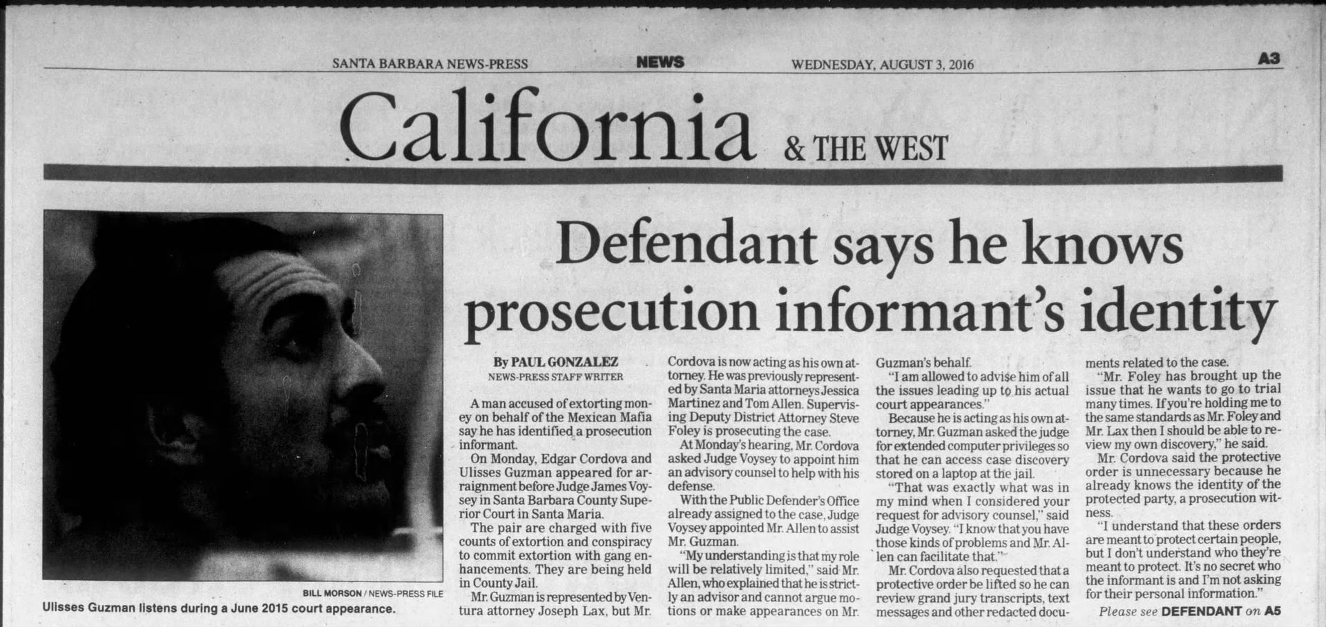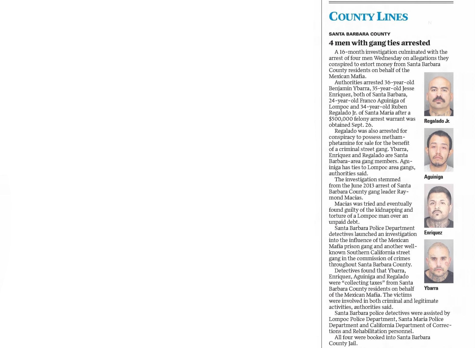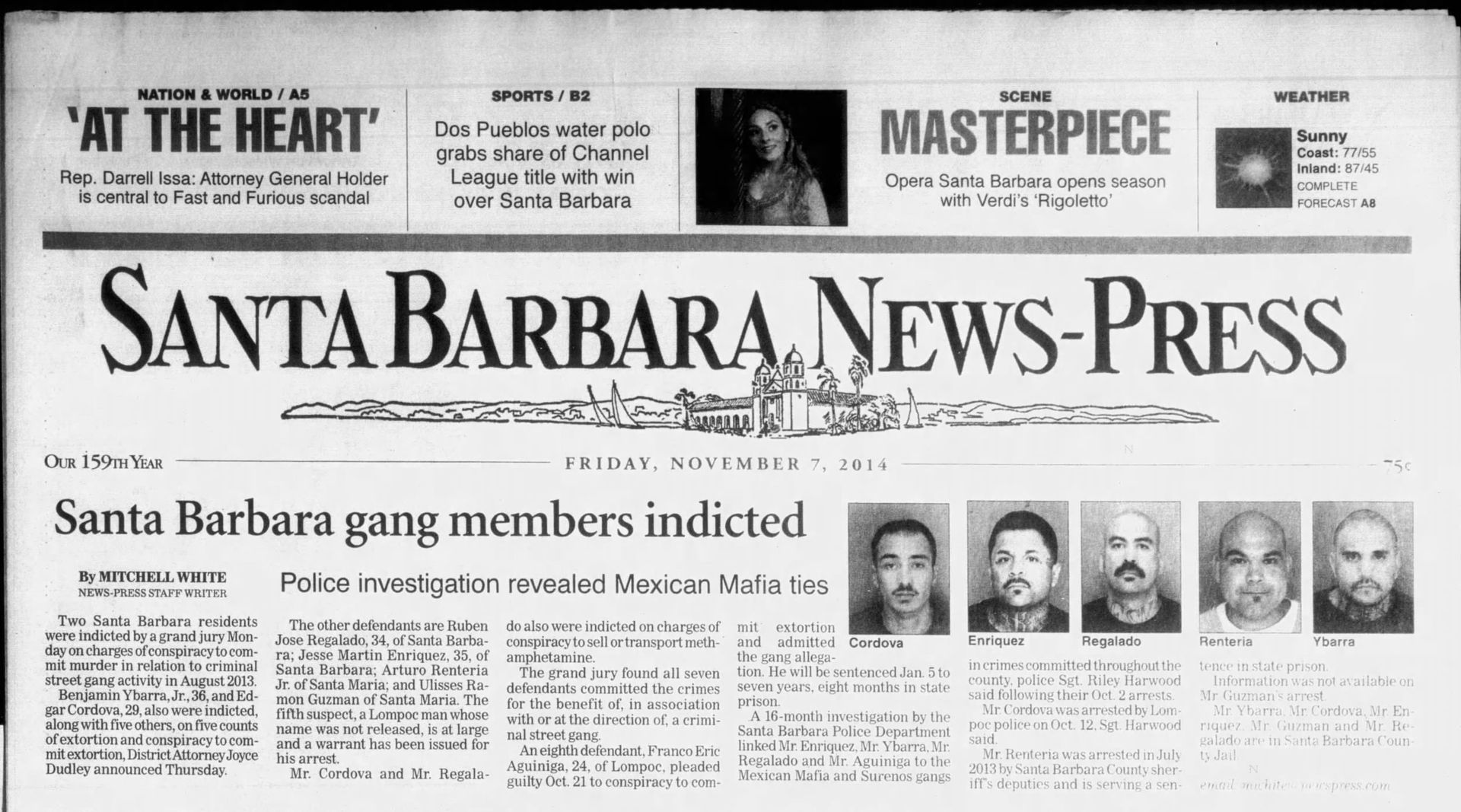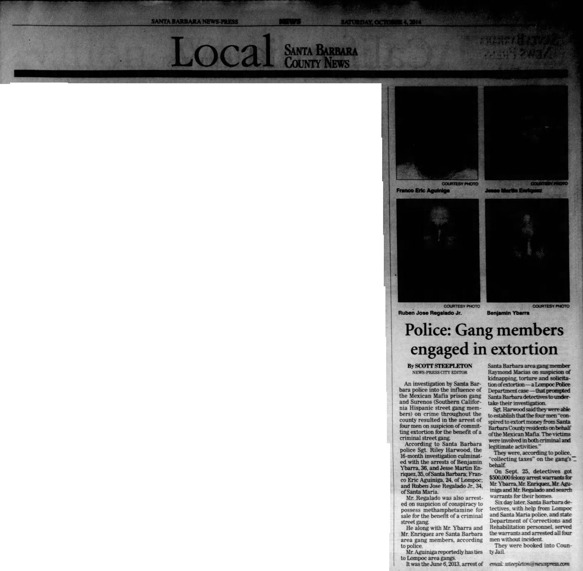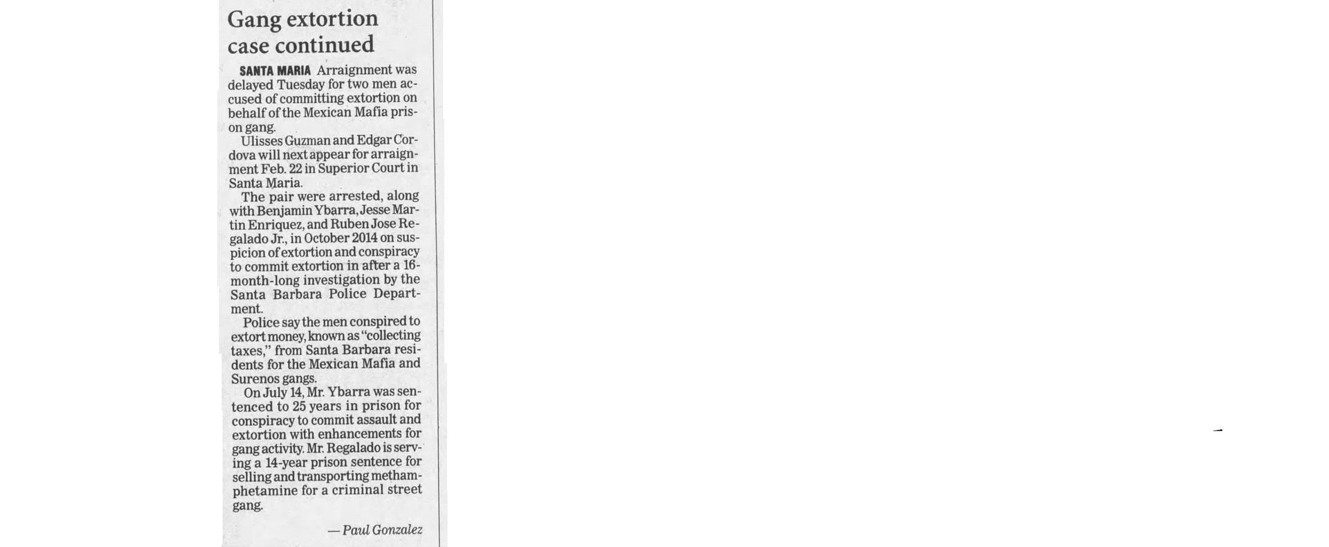 Defendants In Marilyn Pharis's Death Make Brief Court Appearance | November 19, 2015 | Noozhawk | Janene Scully Goleta-Area Man Accused of Killing His Family Enters Not Guilty by Reason of Insanity | October 21, 2015 | Noozhawk | Lara Cooper Arraignment Delayed for Former Hancock College Basketball Players Charged With Murder | October 19, 2015 | Noozhawk | Janene Scully At a Glance: Santa Maria: Arraignment continued again in Lompoc murder case | September 30, 2015 | Lompoc Record Men accused in Marilyn Pharis attack in court, case continued: New attorney on board as Public Defender's Office prepares for potential death penalty defense | September 17, 2015 | Santa Ynes Valley News | Kyle Harding Men accused in Marilyn Pharis attack in court, case continued: New attorney on board as Public Defender's Office prepares for potential death penalty defense | September 17, 2015 | Santa Maria Times | Kyle Harding Psychiatric Search Narrows in Holzer Case: Five Forensic Experts Considered to Perform Evaluation | September 16, 2015 | Santa Barbara Independent | Kelsey Knorp Prosecution in Lompoc murder case focuses on social media activity | September 1, 2015 | Santa Maria Times | Kenny Lindberg Inept Inmate Care by Corizon? Supervisors Must Decide Path for County Inmates' Health | August 20, 2015 | Santa Barbara Independent | Kelsey Brugger Defense continues cross-examination of boy, 14 | August 20, 2015 | Santa Barbara Times | Kenny Lindberg Man Accused of Murdering Family May Enter Insanity Plea in Santa Barbara Court | August 11, 2015 | Noozhawk | Lara Cooper Last U-Haul defendant sentenced | August 3, 2015 | Santa Ynez Valley News | Ryah Cooley Last U-Haul defendant sentenced | August 3, 2015 | Santa Maria Times | Ryah Cooley Man accused of ordering murder from behind bars appears in court: Three others enter not-guilty pleas, will proceed to trial | July 21, 2015 | Santa Maria Times | Kyle Harding Judge Rules Former Allan Hancock College Basketball Players to Be Tried on Murder, Other Charges | June 24, 2015 | Noozhawk | Janene Scully Preliminary Hearing Begins for Former Hancock College Basketball Players Charged with Murder: Ali Mohammed and Lavell White are accused of the fatal shooting of a 23-year-0ld man in Santa Maria during an alleged drug deal | June 23, 2015 | Noozhawk | Janene Scully Preliminary hearing set in robbery and carjacking case | May 27, 2015 | Santa Maria Times | Kyle Harding Five Men Sentenced to Life in Prison Without Parole for Torture-Murder of Anthony Ibarra: Judge rules on numerous motions during the hearing, during which family members of Ibarra speak out about 'the nightmare that will never end | May 22, 2015 | Noozhawk | Janene Scully Trio Held to Answer on Charges Related to Guadalupe Homicide | May 16, 2015 | Lompoc Record | Kyle Harding State Prison Inmate Accused of Orchestrating Murder of Santa Maria Man: Judge rules three other defendants should stand trial in the shooting of Javier Limon | May 15, 2015 | Noozhawk | Janene Scully 5 of 6 Defendants Found Guilty of First Degree Murder in U-Haul Trial: Sixth defendant pleads to kidnapping after mistrial declared | April 7, 2015 | Santa Maria Times | Kyle Harding 5 of 6 Defendants Found Guilty of First Degree Murder in U-Haul Trial: Sixth defendant pleads to kidnapping after mistrial declared | April 7, 2015 | Santa Ynez Valley News | Kyle Harding 5 Men Found Guilty in Santa Maria Torture-Murder Case: Jury in Ibarra case returns guilty verdicts against five of the six defendants | April 7, 2015 | Noozhawk | Janene Scully U-Haul juror dismissed, deliberations start over | March 31, 2015 | Santa Maria Times | Kyle Harding Jury Begins Deliberating in Santa Maria Torture-Murder Trial | March 24, 2015 | Noozhawk | Janene Scully U-Haul closing arguments continue | March 20, 2015 | Santa Maria Times | Kyle Harding U-Haul defense casts doubt on witness credibility | March 19, 2015 | Santa Maria Times | Kyle Harding County Lines: Santa Maria: U-Haul defense casts doubt on witness credibility | March 19, 2015 | Santa Maria Times No hearing yet for Hancock College basketball players | March 16, 2015 | Santa Maria Times | Staff Report Sentencing Hearing an Explosive Ending to Santa Barbara County's First Human Trafficking Trial: Brannon Lawrence Pitcher, found guilty by a jury of prostituting a teen girl, is kicked out of the courtroom for shouting at the judge | March 13, 2015 | Noozhawk | Lara Cooper Second Defendant Testifies in Ibarra Murder Trial | March 13, 2015 | Noozhawk | Janene Scully Second U-Haul Defendant Testifies, Counters Allegations | March 12, 2015 | Lompoc Record | Kyle Harding Sentencing Delayed in Human Trafficking Case | March 8, 2015 | Santa Barbara Independent | Colleen Flaherty Cameron Oliver Arraigned on Murder Charges is Drunk Driving Crash | March 8, 201 5 | News Channel 12-3-11 | News Channel 3-12 Week 8: Santa Maria Ibarra Murder Trial | March 7, 2015 | New Channel 12-3-11 | News Channel 3-12 Defendant testifies he was not present when Anthony Ibarra died | March 6, 2015 | Santa Maria Times | Kyle Harding U-Haul Defendant Takes the Stand | March 5, 2015 | Santa Maria Times | Kyle Harding Defendant Takes Witness Stand in Own Defense in Ibarra Murder Trial: Anthony "AJ" Solis denies gang membership during testimony | March 5, 2015 | Noozhawk | Janene Scully Defense Expert Testifies About Phrase 'Gang Associate' During Ibarra Murder Trial | March 3, 2015 | Noozhawk | Janene Scully Prosecution Rests in Santa Maria Trial of Six Defendants Charged in Ibarra Murder: Defense attorneys ask the judge to acquit their clients, accused of the gang-related torture-slaying of Anthony Ibarra in March 2013 | February 27, 2015 | Noozhawk | Janene Scully U-Haul defense continues cross-examination of SMPD gang detective | February 26, 2015 | Santa Maria Times | Kyle Harding U-Haul defense attorneys question SMPD detective: Prosecutor, detective paint picture of local gang violence | February 24, 2015 | Santa M