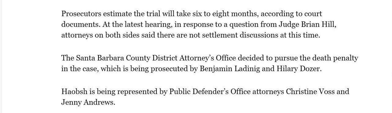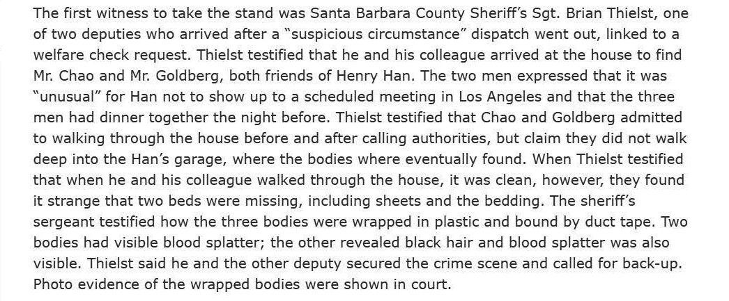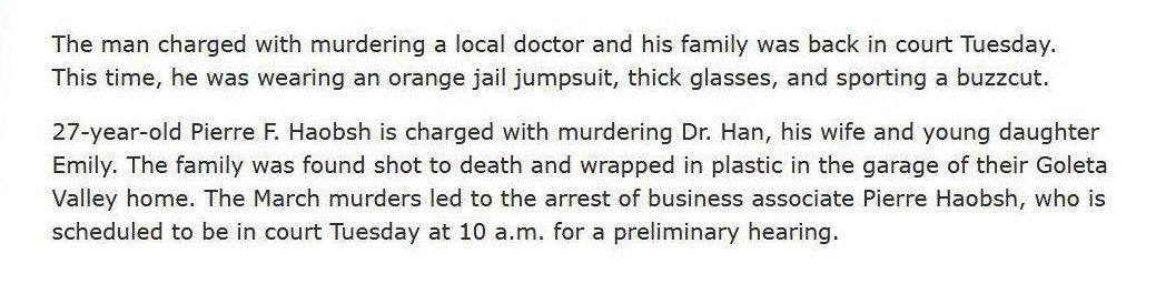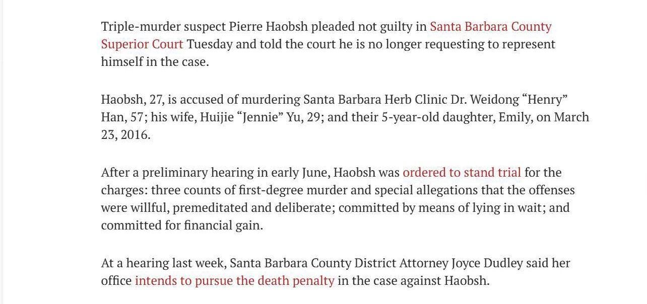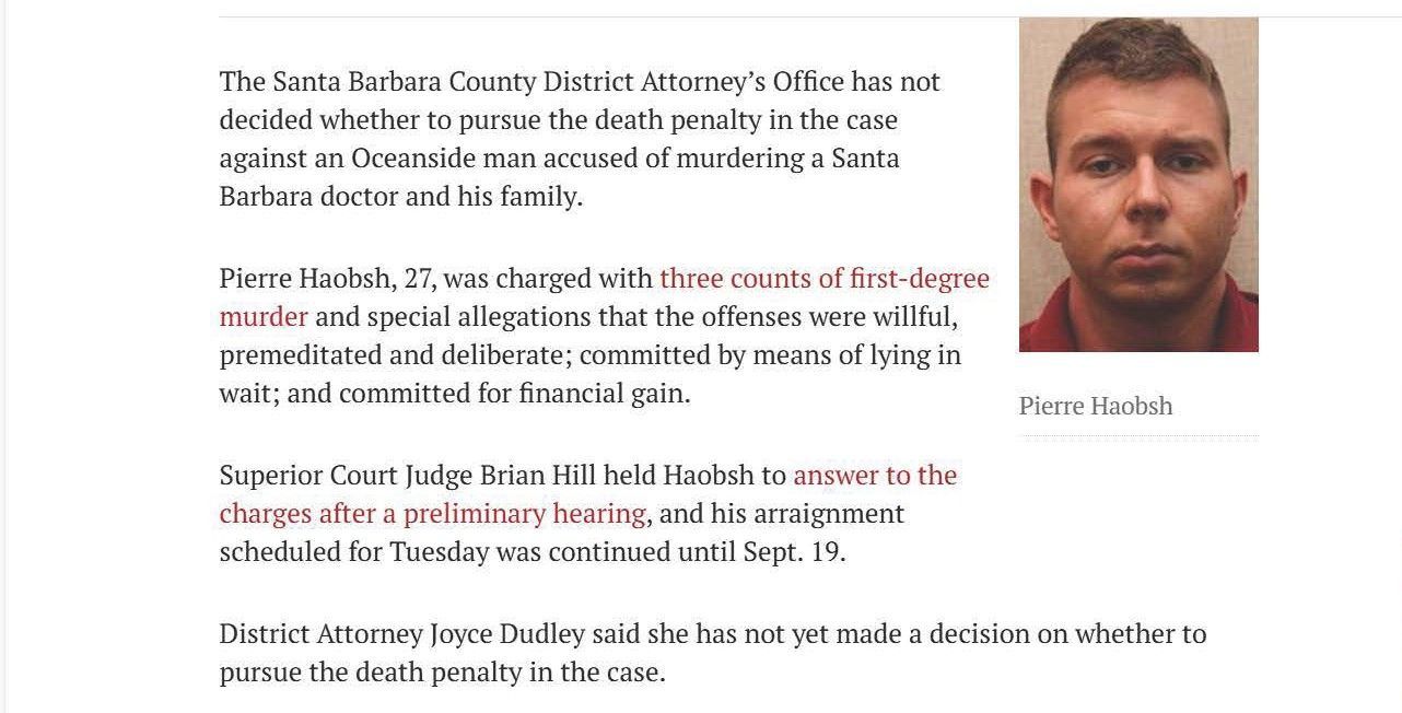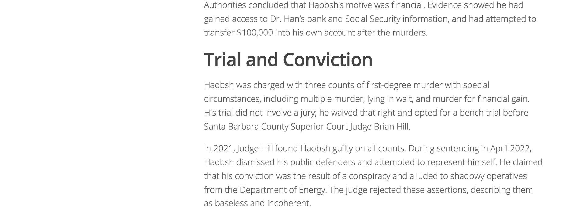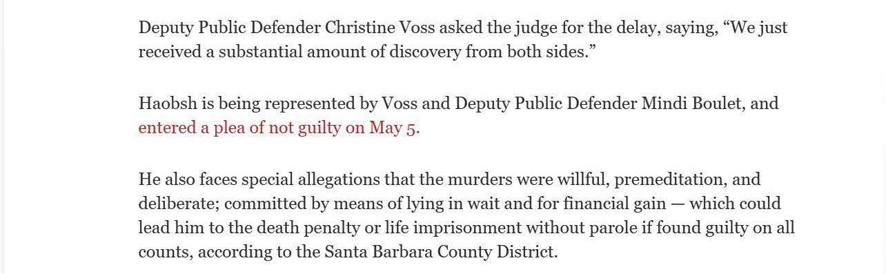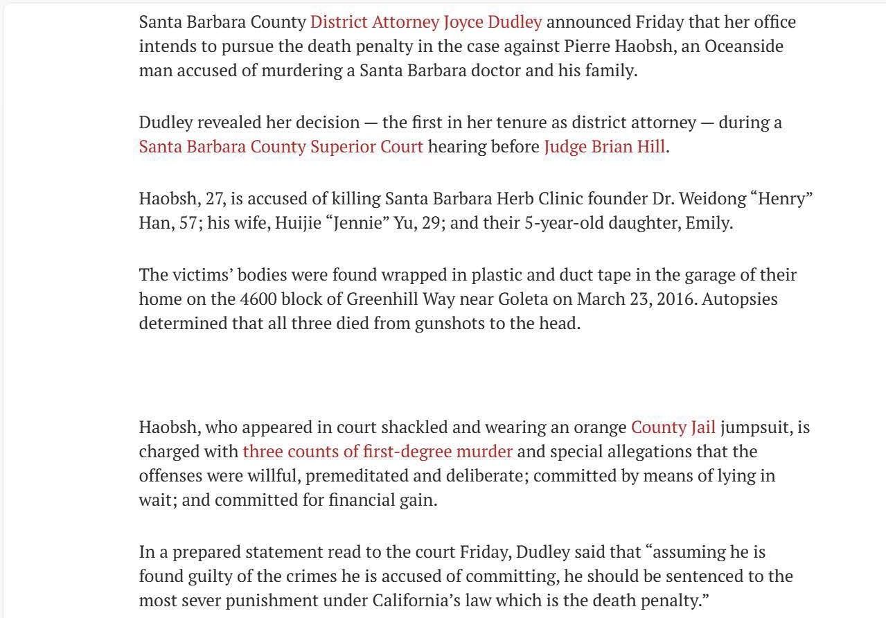 - Charges: Three counts of murder (Penal Code § 187(a)) with special circumstances of murder for financial gain (Penal Code § 190.2(a)(1)) and multiple murder (Penal Code § 190.2(a)(3), as well as a great bodily injury enhancement (Penal Code § 12022.7).