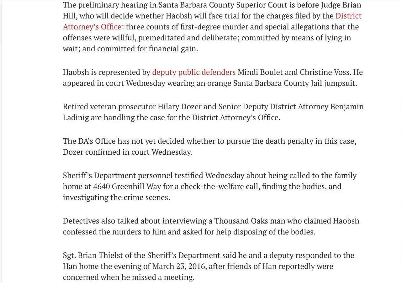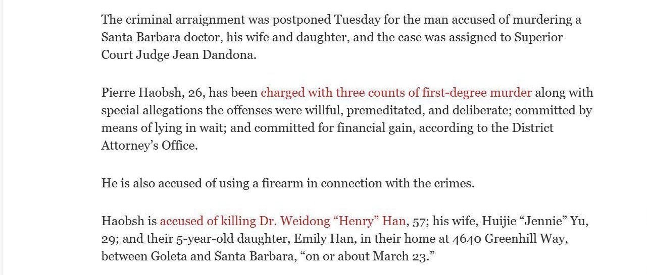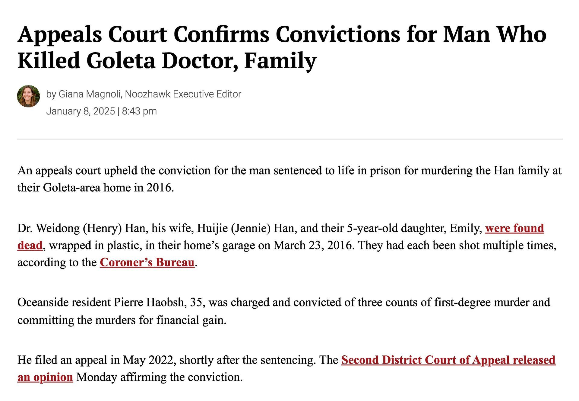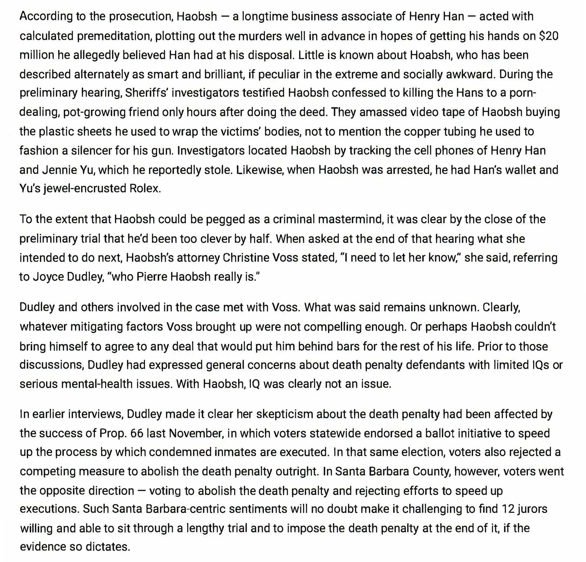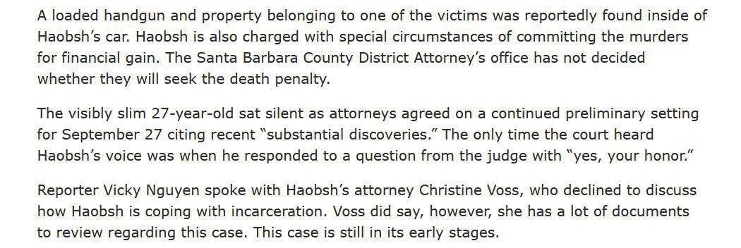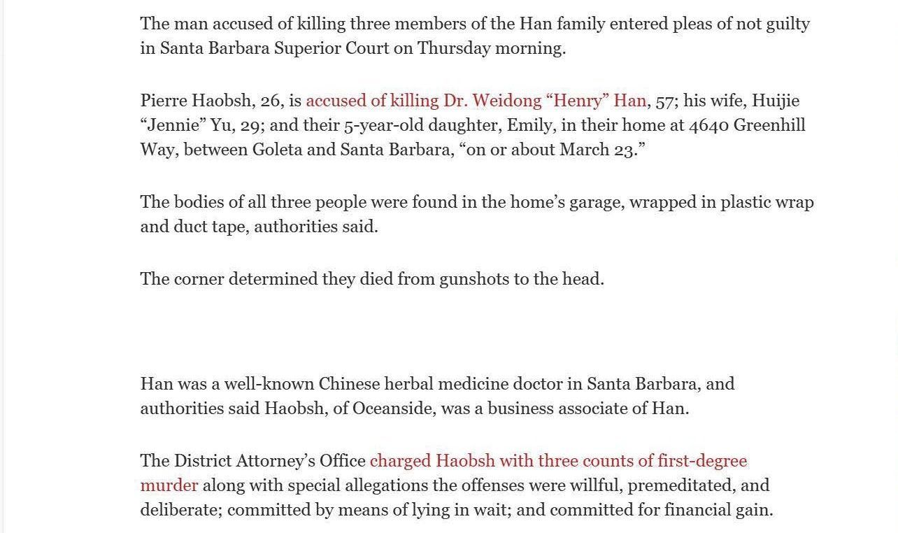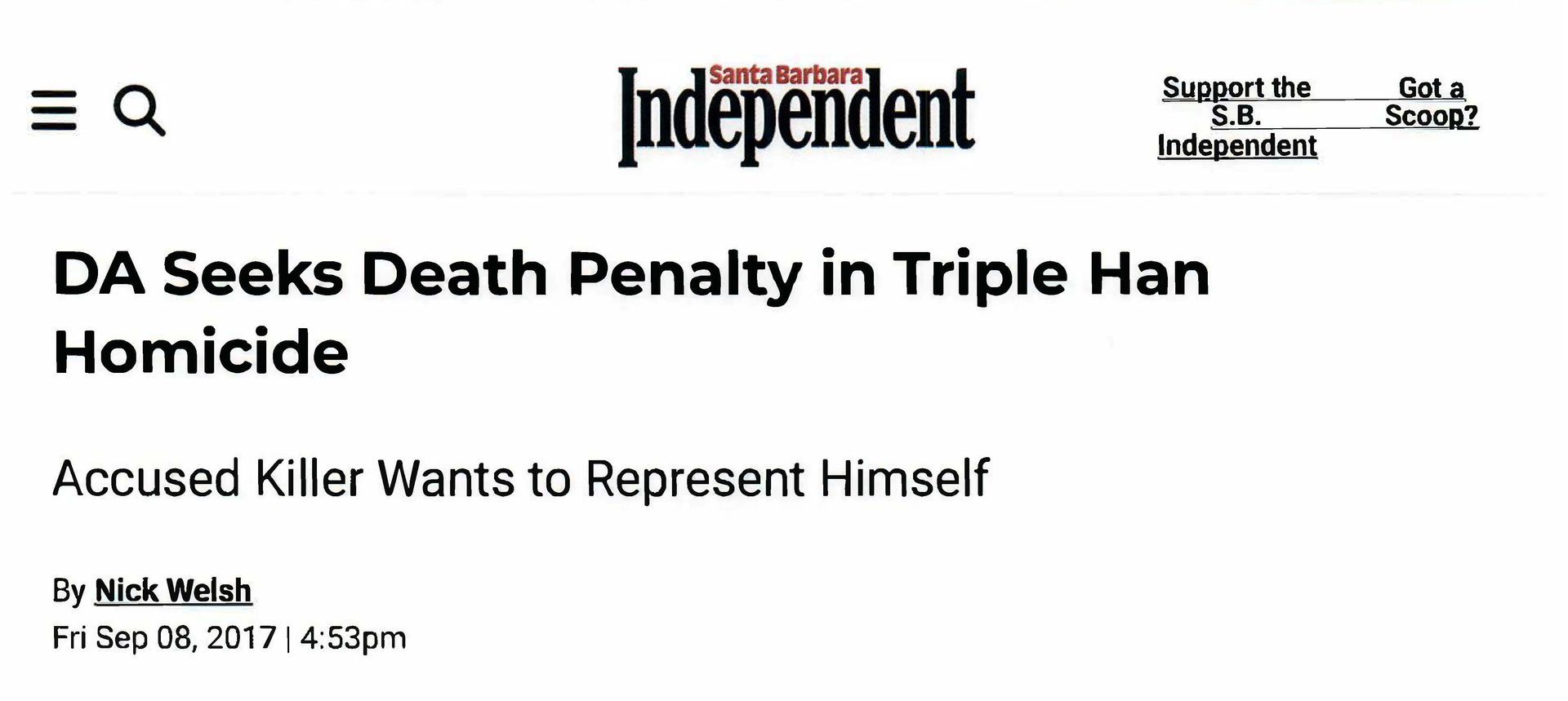 - Charges: Three counts of murder (Penal Code § 187(a)) with special circumstances of murder for financial gain (Penal Code § 190.2(a)(1)) and multiple murder (Penal Code § 190.2(a)(3), as well as a great bodily injury enhancement (Penal Code § 12022.7).