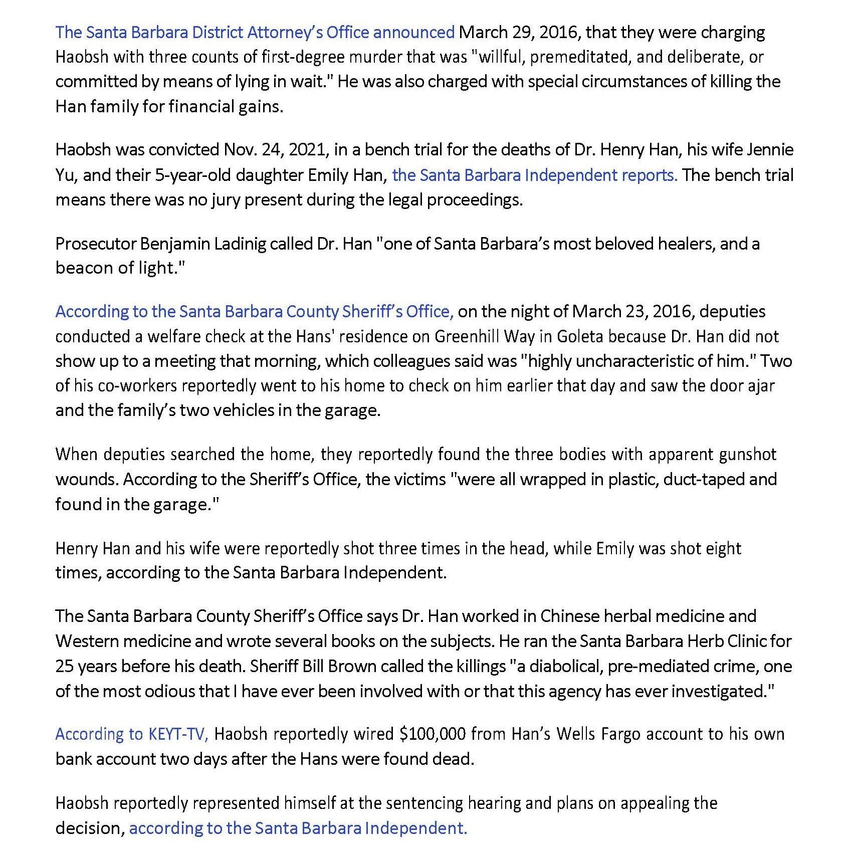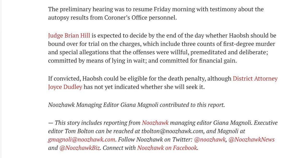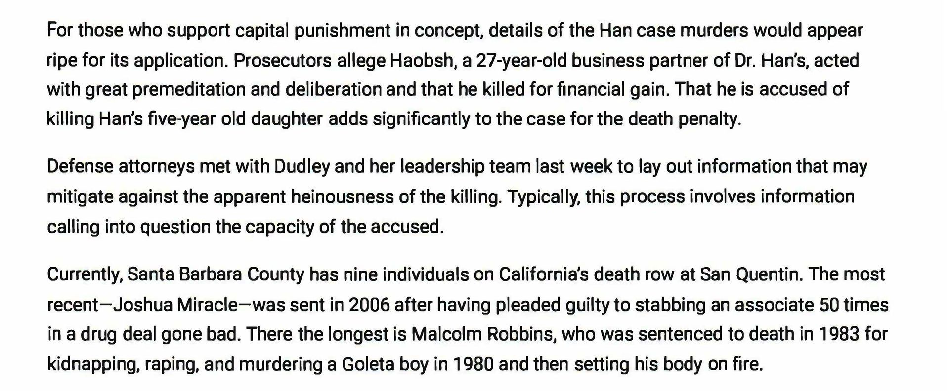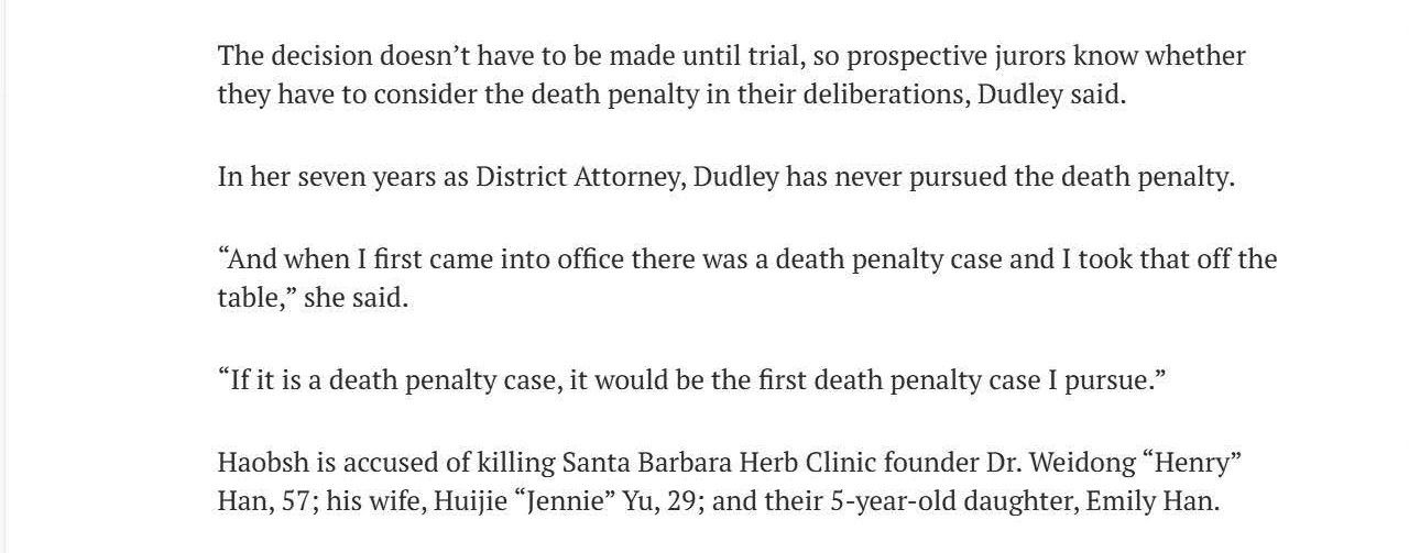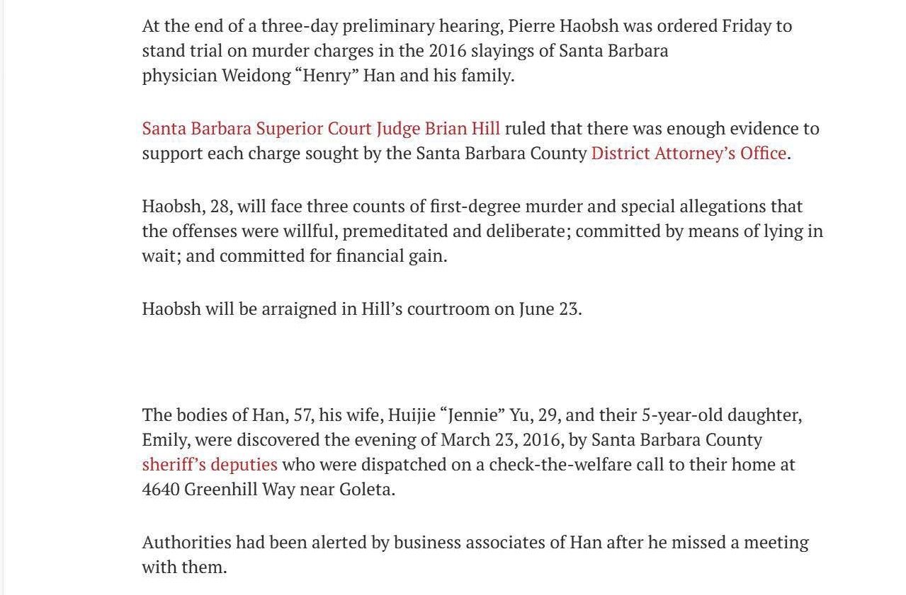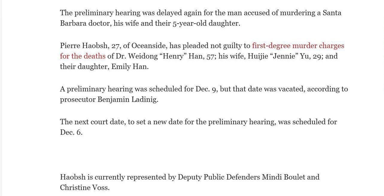 - Charges: Three counts of murder (Penal Code § 187(a)) with special circumstances of murder for financial gain (Penal Code § 190.2(a)(1)) and multiple murder (Penal Code § 190.2(a)(3), as well as a great bodily injury enhancement (Penal Code § 12022.7).