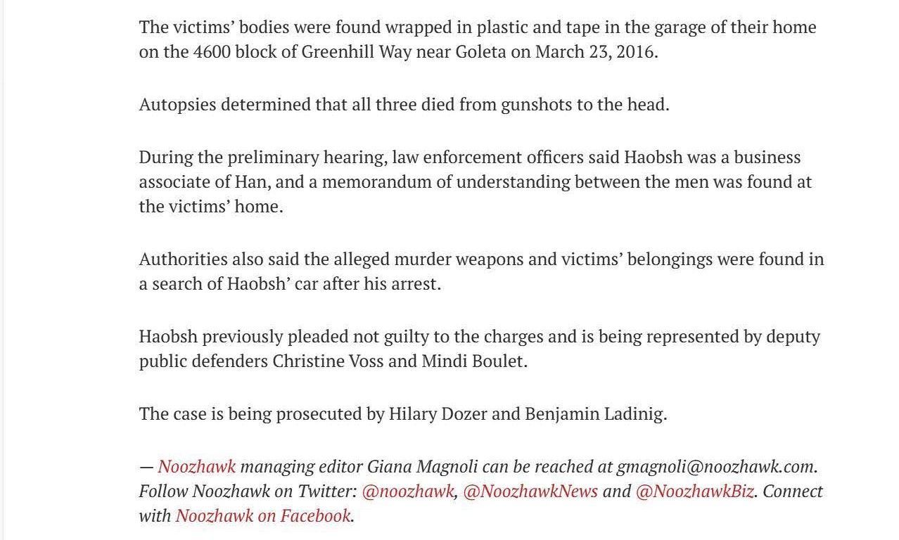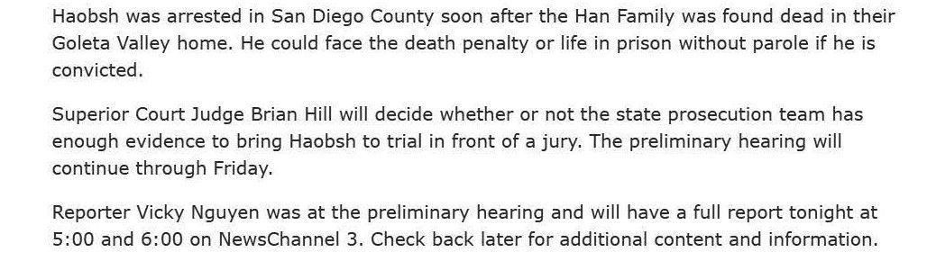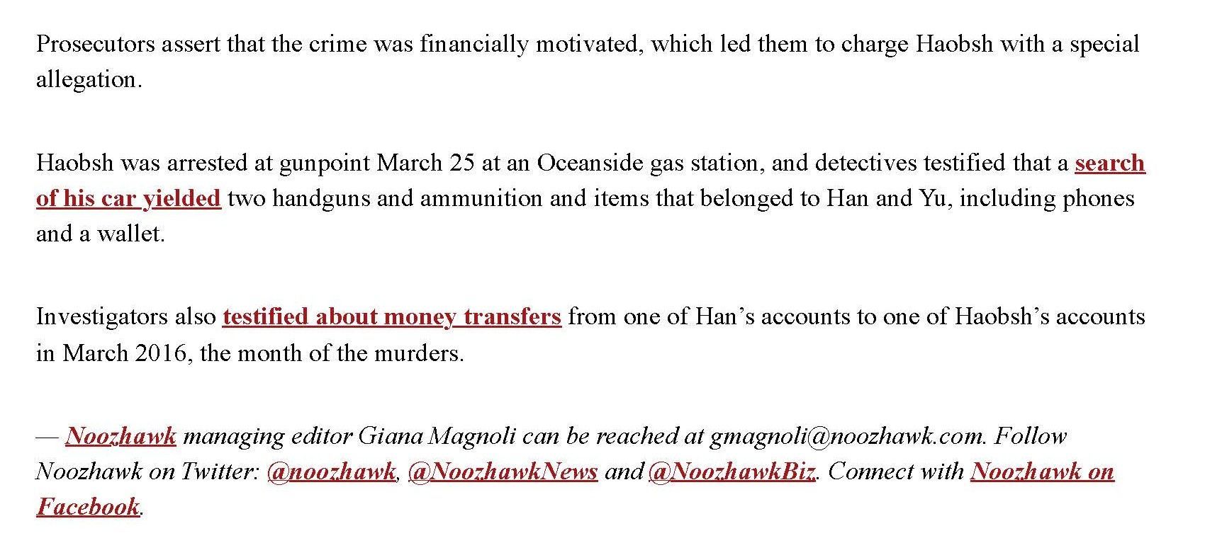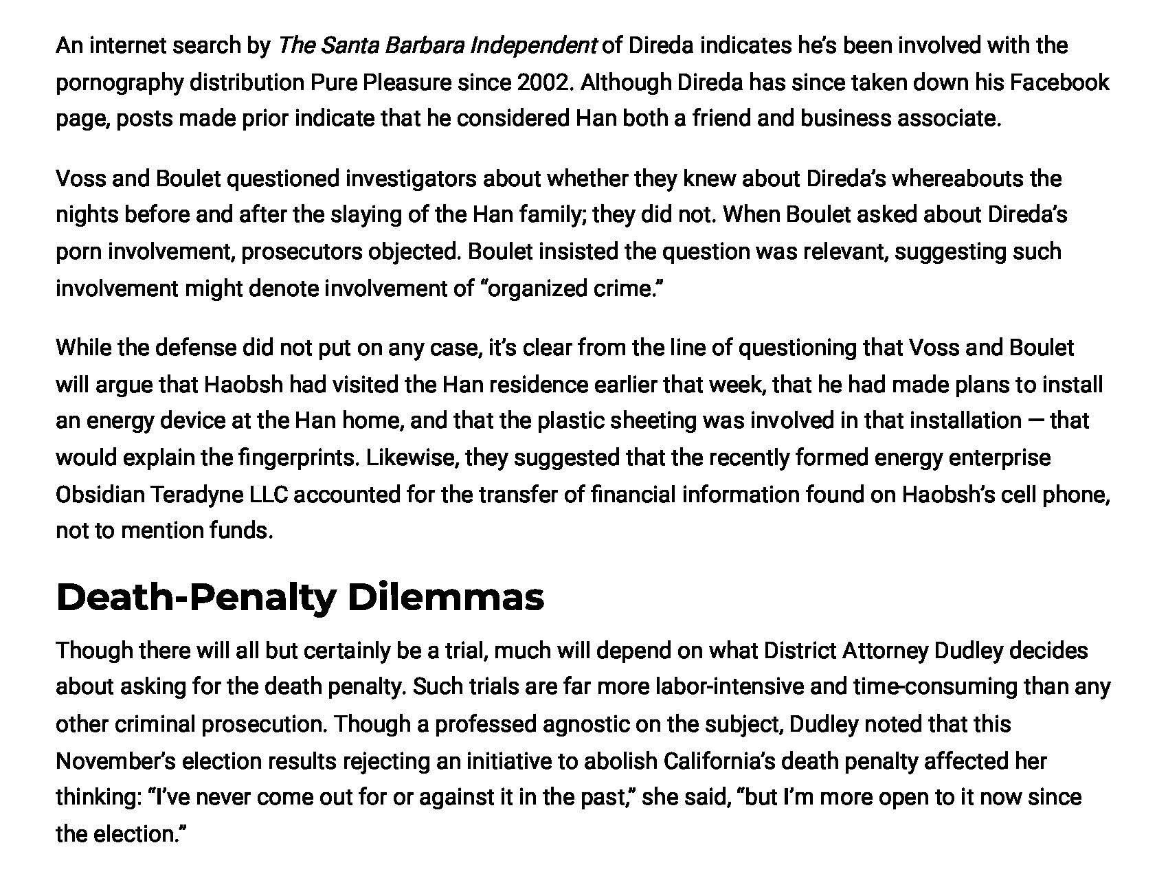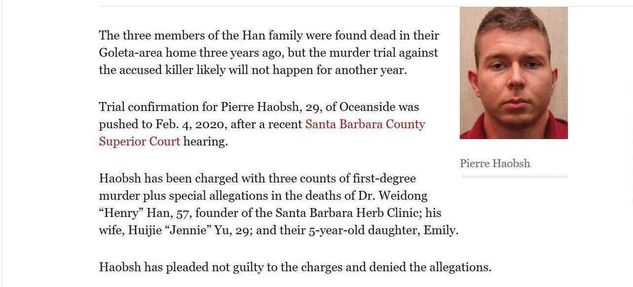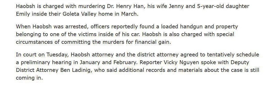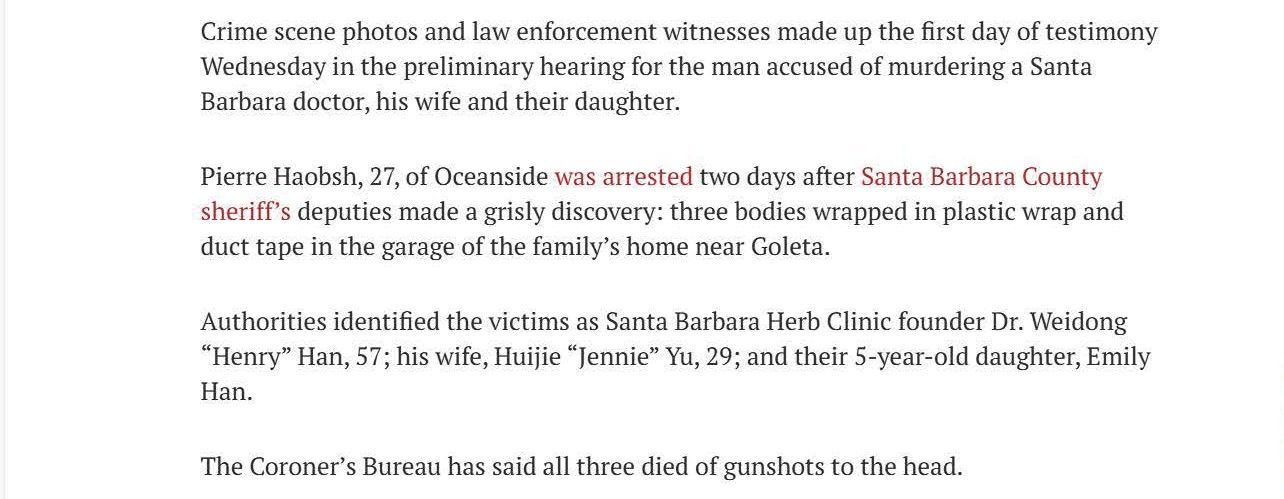 - Charges: Three counts of murder (Penal Code § 187(a)) with special circumstances of murder for financial gain (Penal Code § 190.2(a)(1)) and multiple murder (Penal Code § 190.2(a)(3), as well as a great bodily injury enhancement (Penal Code § 12022.7).