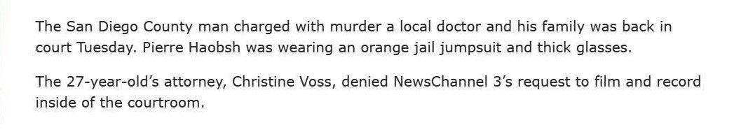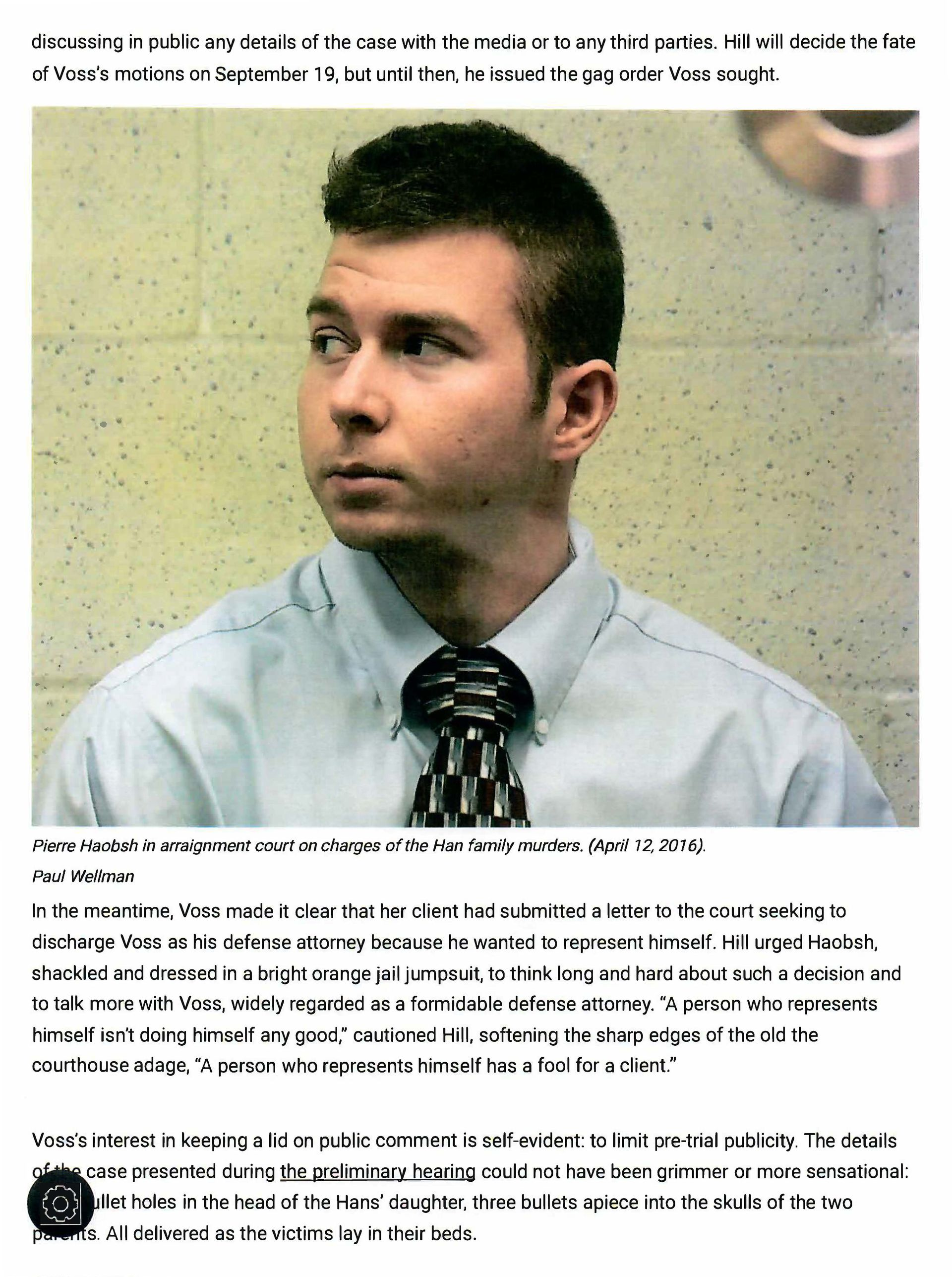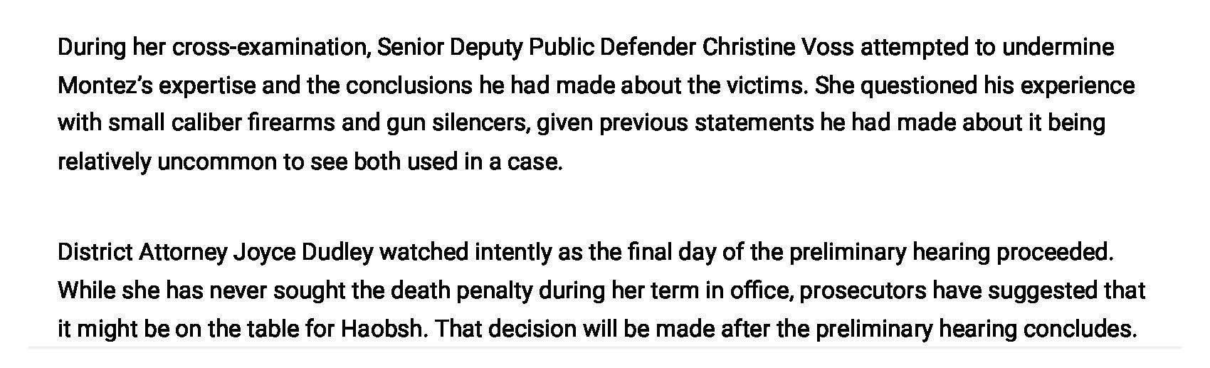 One of the highlights of the case was that after Pierre's preliminary hearing Christine found out that the district attorney was going to give a press conference after Pierre's court date. She knew that meant that the district attorney was going to announce that they were going to seek the death penalty, and then have a press conference to make a statement that would only taint potential jurors. Christine then, on the fly, filed a motion for a gag order, which the judge granted, the district attorney had to cancel the press conference.