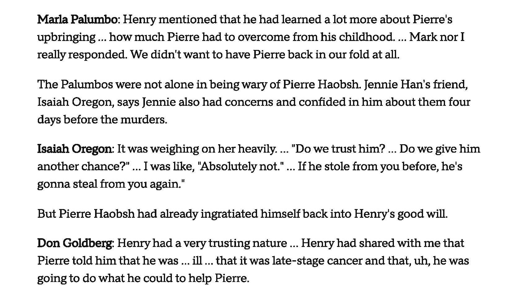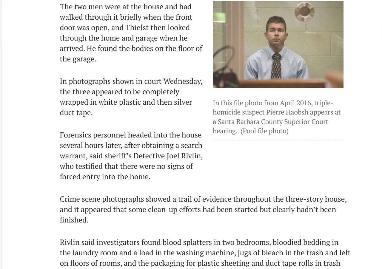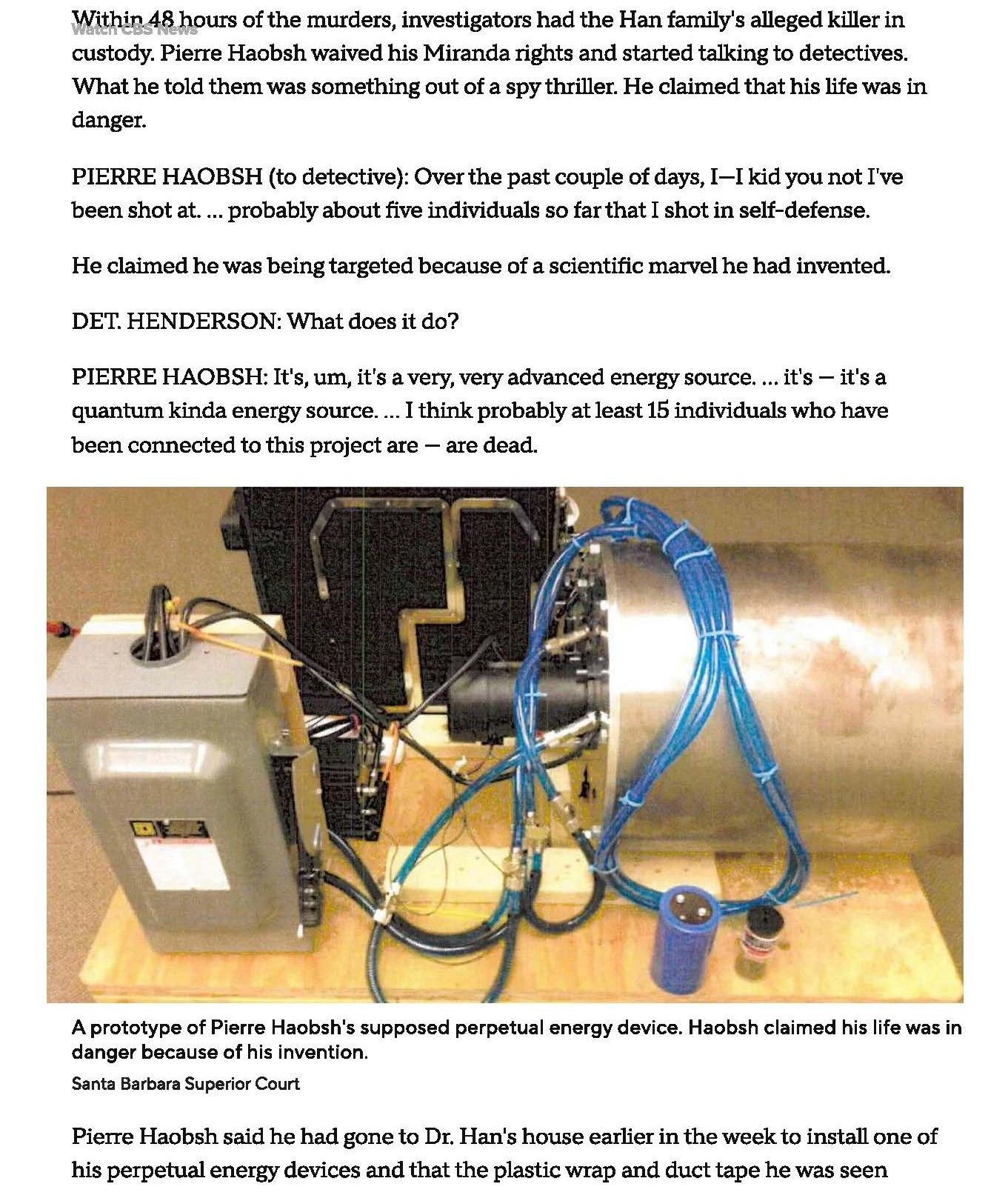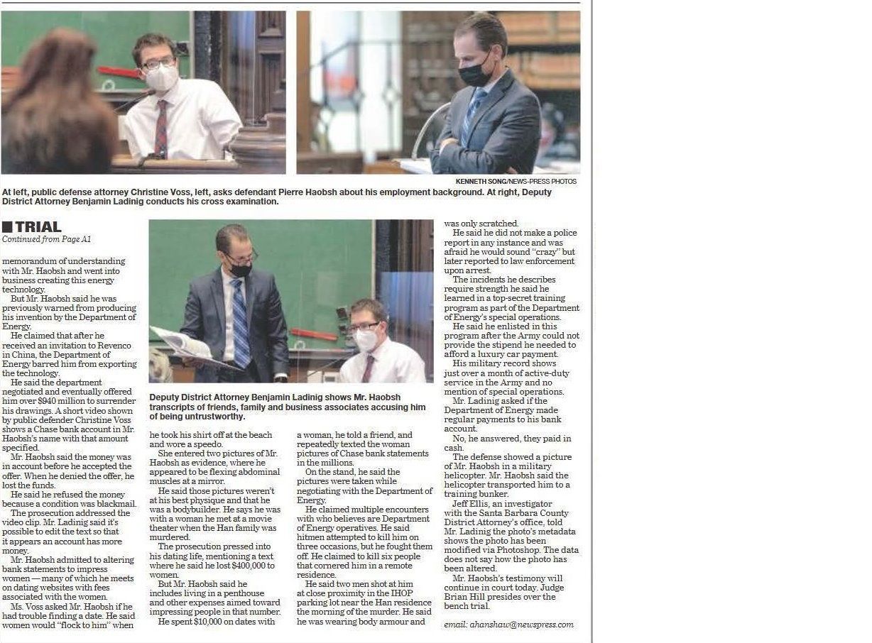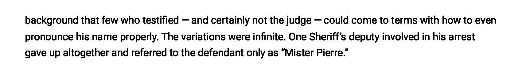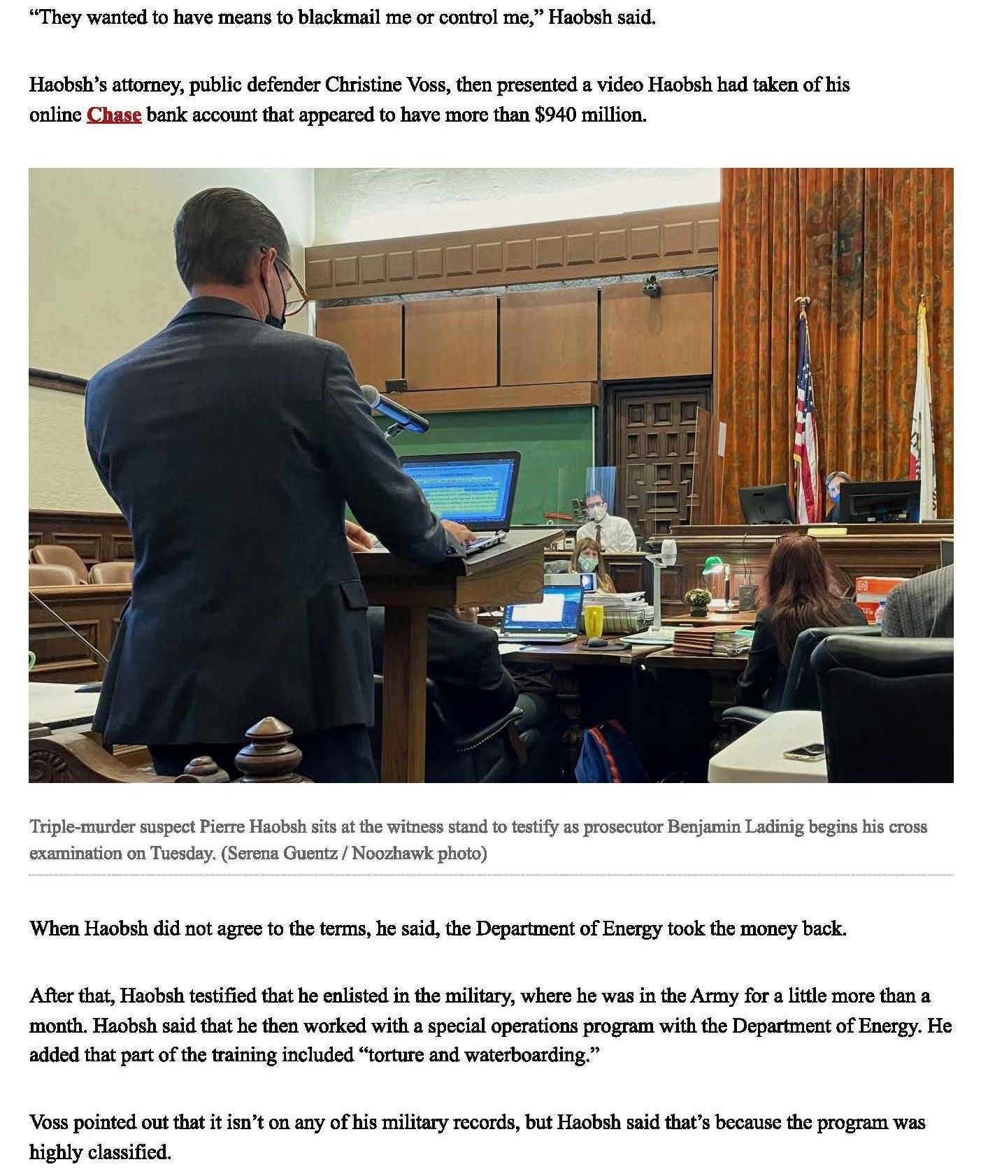 This was a triple murder case. Pierre was facing the Death Penalty. Christine started out, as is the case in all capital murders, by trying to convince the district attorney to not seek death. When that didn't work she made sure that everything was prepared for trial. Right before the trial started there was agreement between the district attorney and Christine to remove the death penalty from the case. Pierre and Christine agreed to elect a court trial (a trial with just a judge instead of a jury) and the district attorney agreed to remove the death penalty from the case. Pierre testified at his trial to what the press called, "A fantastical story" of the Department of Energy committing the murders to frame him. Pierre's testimony was that he had invented a perpetual energy machine and that the Department of Energy then set out to stop him because his invention would bankrupt the fossil fuel industry, which the Department of Energy was intent on protecting. He testified about a Department energy tactical team attempting to kill him, but that he killed the entire tactical team before they could kill him, and that he then fled the scene, and when he later returned the bodies of the tactical team members had been removed and the scene was cleaned up so that no one would be able tell that there had been a multiple fatality five on one gunfight. He also testified that although he did not make it through Army boot camp, he was recruited to be a secret government agent and was trained at an underground black ops site. When asked why there was no record of his work as a secret agent, his answer that it was of course all classified. When asked during the trial if he's mentally ill, he testified that was not.
