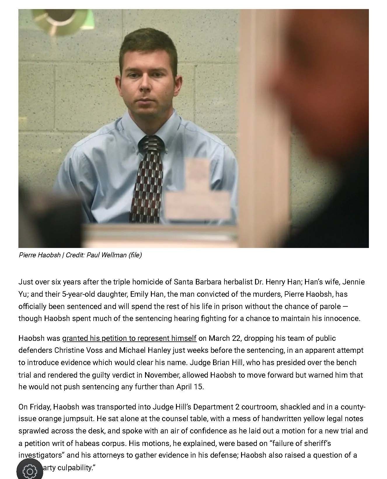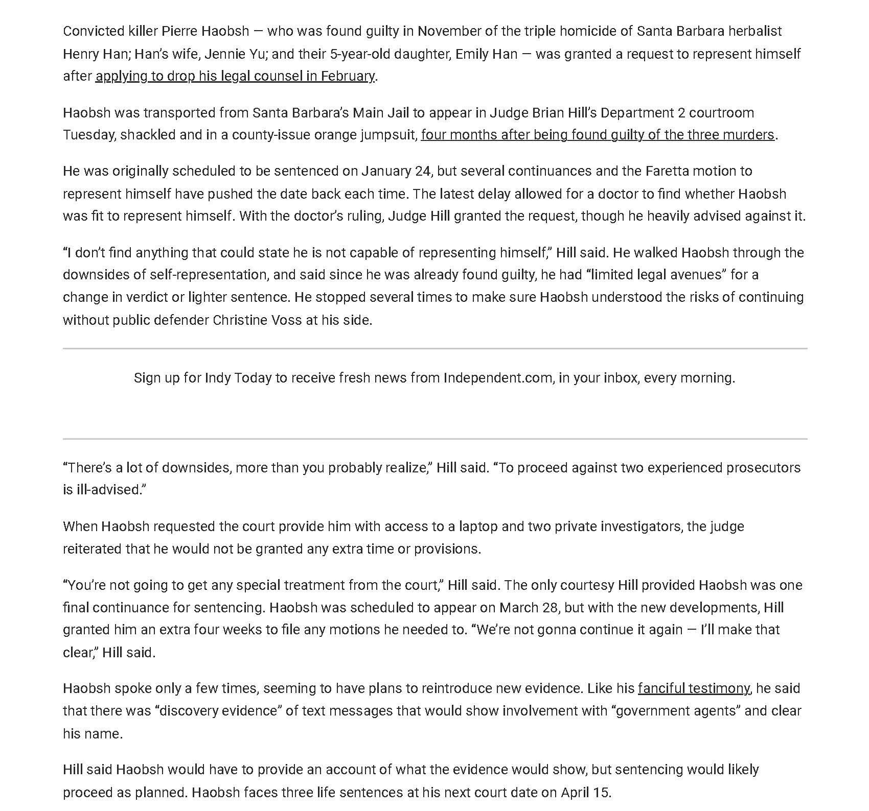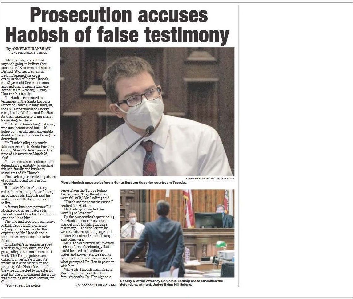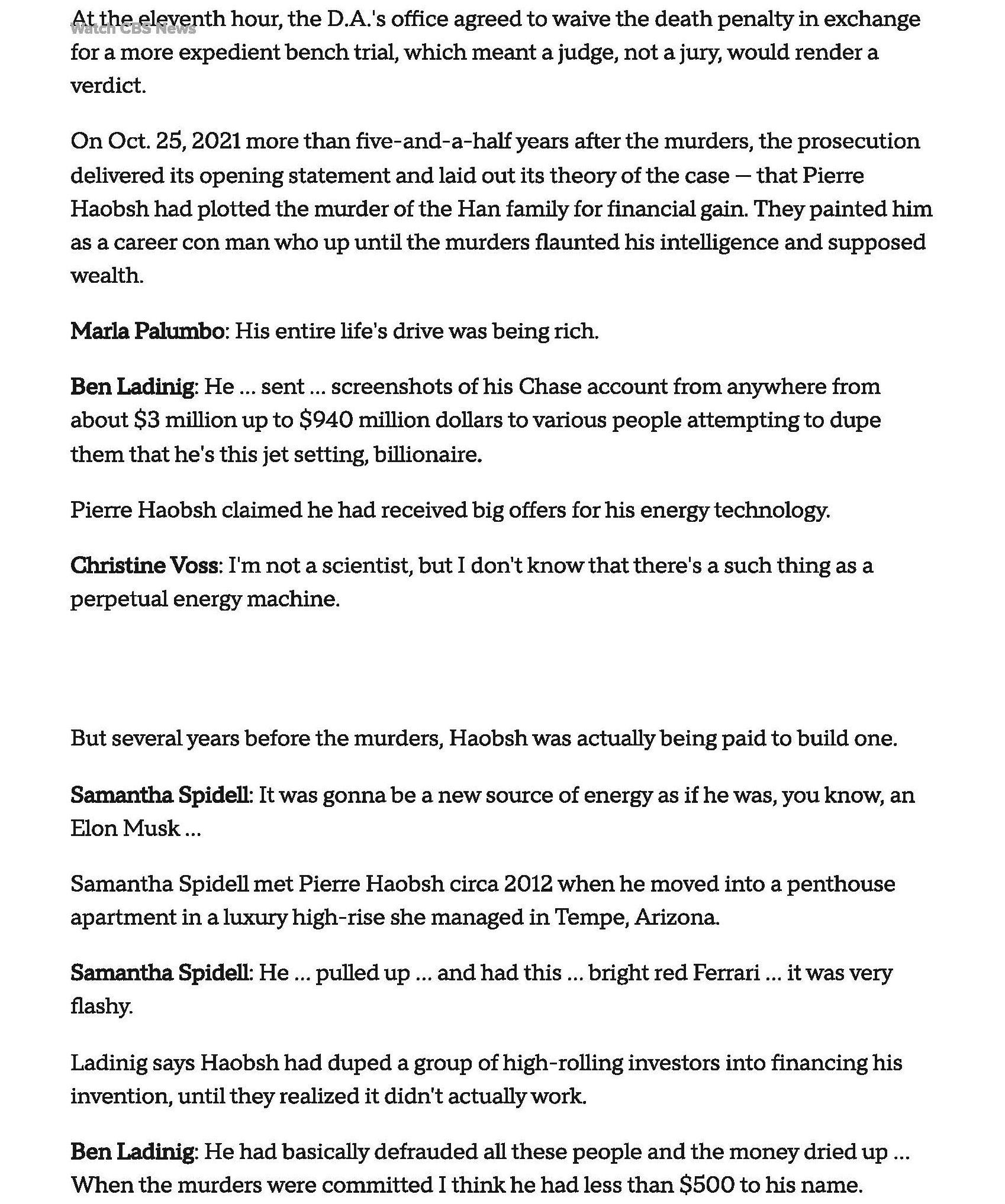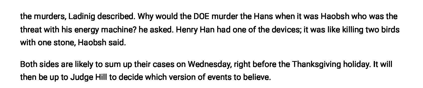 This was a triple murder case. Pierre was facing the Death Penalty. Christine started out, as is the case in all capital murders, by trying to convince the district attorney to not seek death. When that didn't work she made sure that everything was prepared for trial. Right before the trial started there was agreement between the district attorney and Christine to remove the death penalty from the case. Pierre and Christine agreed to elect a court trial (a trial with just a judge instead of a jury) and the district attorney agreed to remove the death penalty from the case. Pierre testified at his trial to what the press called, "A fantastical story" of the Department of Energy committing the murders to frame him. Pierre's testimony was that he had invented a perpetual energy machine and that the Department of Energy then set out to stop him because his invention would bankrupt the fossil fuel industry, which the Department of Energy was intent on protecting. He testified about a Department energy tactical team attempting to kill him, but that he killed the entire tactical team before they could kill him, and that he then fled the scene, and when he later returned the bodies of the tactical team members had been removed and the scene was cleaned up so that no one would be able tell that there had been a multiple fatality five on one gunfight. He also testified that although he did not make it through Army boot camp, he was recruited to be a secret government agent and was trained at an underground black ops site. When asked why there was no record of his work as a secret agent, his answer that it was of course all classified. When asked during the trial if he's mentally ill, he testified that was not.