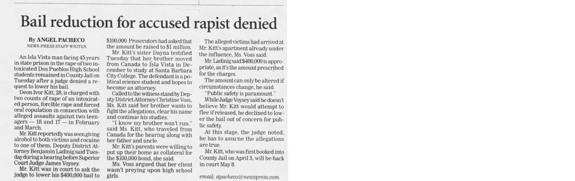 A Grisly Crime: Recap of the Pierre Haobsh Trial: How the Triple-Murder Case Played Out Leading to the Guilty Verdict | December 1, 2021 | Santa Barbara Independent | Ryan P. Cruz Triple-Murder Suspect Pierre Haobsh Gives His Account of Days Leading to Han Family Murders; Defendant describes his involvement with multiple companies and his belief that the U.S. Department of Energy was targeting him | November 23, 2021 | Noozhawk | Serena Guentz Haobsh Spins a Story on the Stand: Accused of Triple Murder, Alleged Killer Gives His Version of the Evidence | November 23, 2021 | Santa Barbara Independent | Jean Yamamura & Nick Welsh Triple-Murder Suspect Pierre Haobsh Starts Testifying in Own Defense During Santa Barbara Trial: He faces murder charges in the 2016 killings of Goleta-area Dr. Weidong 'Henry' Han, Huijie 'Jennie' Yu and their daughter, Emily | November 22, 2021 | Noozhawk | Serena Guentz Defense Team Raises Doubts in Case Against Accused Han Family Killer: Pierre Haobsh's Attorneys Question Reliability of Cell Phone Data Records | November 19, 2021 | Santa Barbara Independent | Ryan P. Cruz & Jun Starkey Triple-Murder Trial for Pierre Haobsh Continues with Defense Witnesses | November 18, 2021 | Noozhawk | Serena Guentz Review of Suspect's Computer Search History May Implicate Him in Triple Homicide | November 17, 2021 | Vanguard | Mairead Perez Computer Analyst Provides Forensic Evidence in Triple Murder Case | November 16, 2021 | Vanguard | Joshua Cenzano Trial for Triple-Murder Suspect Pierre Haobsh Hears Testimony From Expert Witness: Lead investigator says the web history on Haobsh's laptop included a search for 'can 22lr hollow point penetrate the skull' | November 12, 2021 | Noozhawk | Serena Guentz Grim Friday Hearing in Haobsh Trial; Photos Displayed of Triple Murder Victims as Evidence Unfolds | November 5, 2021 | Santa Barbara Independent | Jean Yamamura Triple-Murder Trial for Pierre Haobsh Continues with Testimony From Sheriff's Personnel: Segments of Detective Jeff McDaniel's four-hour interrogation with the suspect, accused of killing the Han family in 2016, also a shown in court | November 5, 2021 | Noozhawk | Serena Guentz Inside the Interrogation Room with Accused Killer Pierre Haobsh; Witness Testimony Continued Thursday in Han Family Triple Murder Case | November 4, 2021 | Santa Barbara Independent | Ryan P. Cruz Witness Testimony Begins in Han Family Triple Murder Case: Prosecutors Lay the Foundation for Arguments Against Alleged Murderer Pierre Haobsh | October 29, 2021 | Santa Barbara Independent | Serena Guentz Triple-Murder Trial Starts for Pierre Haobsh, Accused of 2016 Slayings of Han Family | October 28, 2021 | Noozhawk | Giana Magnoli P ublic Defender Objects to Late Trial Video Evidence, Suggesting It Was Racist and Offensive | September 1, 2021 | Vanguard | Carson Eschen Santa Barbara DA Drops Bid for Death Penalty in Han Family Murder Case: In Exchange, Triple Homicide Defendant Agrees to Trial by Judge Instead of Jury | August 13, 2021 | Santa Barbara Independent | Nick Welsh Triple-Murder Suspect Pierre Haobsh Waives Right to Jury Trial, Will Have Case Heard in a Bench Trial: Santa Barbara County District Attorney's Office drops intention to seek death penalty in the case, attorneys said Thursday | August 12, 2021 | Noozhawk | Brooke Holland Public Defender Argues Defendant Should Be Allowed to Possess Discovery During Trial; District Attorney Disagrees, Citing Safety Concern | August 12, 2021 | Vanguard | Michelle Lagos Defendant Waive Rights, Accepts Plea Deal, Pleads No Contest to Charges | August 8, 2021 | Vanguard | Lauren Smith Triple-Murder Suspect Pierre Haobsh Expected to Waive Right to Jury Trial, Defense Says: Attorneys make a brief appearance as they work toward a final agreement for a bench trial in the deaths of Dr. Henry Han, his wife and child | July 22, 2021 | Noozhawk | Brooke Holland Santa Barbara County judge approves motion to continue MS-13 trial May 3 | January 8, 2021 | Santa Maria Times | Dave Minsky