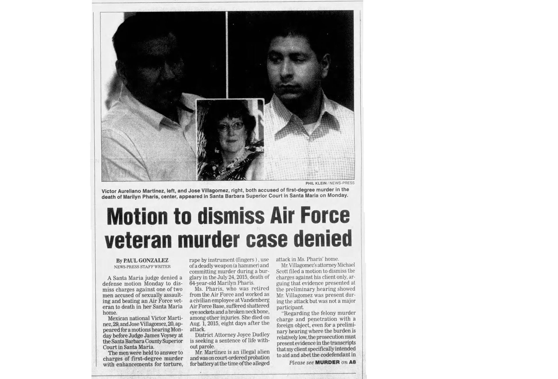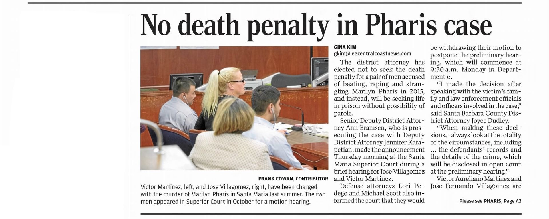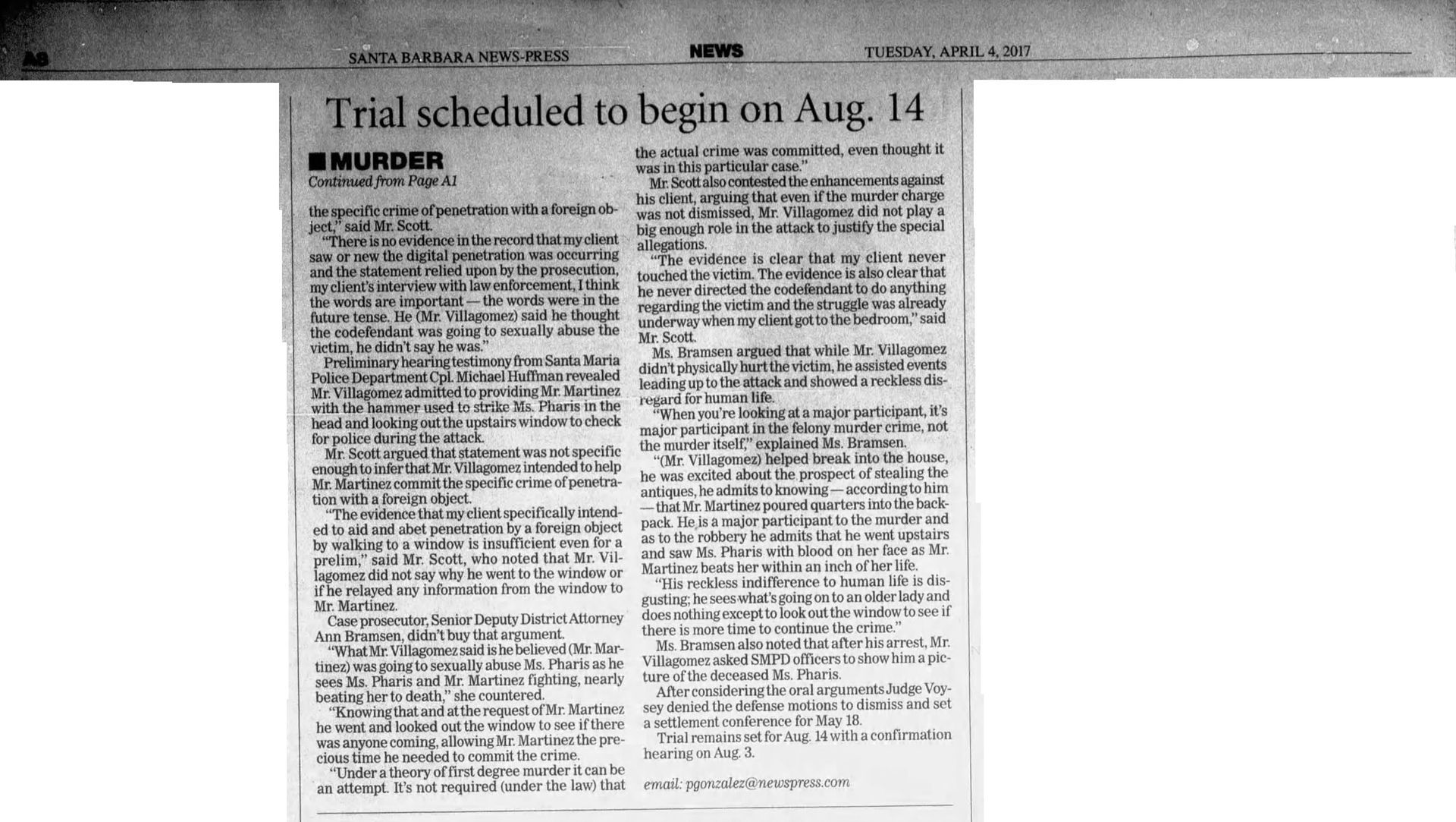 Defendants In Marilyn Pharis's Death Make Brief Court Appearance | November 19, 2015 | Noozhawk | Janene Scully Goleta-Area Man Accused of Killing His Family Enters Not Guilty by Reason of Insanity | October 21, 2015 | Noozhawk | Lara Cooper Arraignment Delayed for Former Hancock College Basketball Players Charged With Murder | October 19, 2015 | Noozhawk | Janene Scully At a Glance: Santa Maria: Arraignment continued again in Lompoc murder case | September 30, 2015 | Lompoc Record Men accused in Marilyn Pharis attack in court, case continued: New attorney on board as Public Defender's Office prepares for potential death penalty defense | September 17, 2015 | Santa Ynes Valley News | Kyle Harding Men accused in Marilyn Pharis attack in court, case continued: New attorney on board as Public Defender's Office prepares for potential death penalty defense | September 17, 2015 | Santa Maria Times | Kyle Harding Psychiatric Search Narrows in Holzer Case: Five Forensic Experts Considered to Perform Evaluation | September 16, 2015 | Santa Barbara Independent | Kelsey Knorp Prosecution in Lompoc murder case focuses on social media activity | September 1, 2015 | Santa Maria Times | Kenny Lindberg Inept Inmate Care by Corizon? Supervisors Must Decide Path for County Inmates' Health | August 20, 2015 | Santa Barbara Independent | Kelsey Brugger Defense continues cross-examination of boy, 14 | August 20, 2015 | Santa Barbara Times | Kenny Lindberg Man Accused of Murdering Family May Enter Insanity Plea in Santa Barbara Court | August 11, 2015 | Noozhawk | Lara Cooper Last U-Haul defendant sentenced | August 3, 2015 | Santa Ynez Valley News | Ryah Cooley Last U-Haul defendant sentenced | August 3, 2015 | Santa Maria Times | Ryah Cooley Man accused of ordering murder from behind bars appears in court: Three others enter not-guilty pleas, will proceed to trial | July 21, 2015 | Santa Maria Times | Kyle Harding Judge Rules Former Allan Hancock College Basketball Players to Be Tried on Murder, Other Charges | June 24, 2015 | Noozhawk | Janene Scully Preliminary Hearing Begins for Former Hancock College Basketball Players Charged with Murder: Ali Mohammed and Lavell White are accused of the fatal shooting of a 23-year-0ld man in Santa Maria during an alleged drug deal | June 23, 2015 | Noozhawk | Janene Scully Preliminary hearing set in robbery and carjacking case | May 27, 2015 | Santa Maria Times | Kyle Harding Five Men Sentenced to Life in Prison Without Parole for Torture-Murder of Anthony Ibarra: Judge rules on numerous motions during the hearing, during which family members of Ibarra speak out about 'the nightmare that will never end | May 22, 2015 | Noozhawk | Janene Scully Trio Held to Answer on Charges Related to Guadalupe Homicide | May 16, 2015 | Lompoc Record | Kyle Harding State Prison Inmate Accused of Orchestrating Murder of Santa Maria Man: Judge rules three other defendants should stand trial in the shooting of Javier Limon | May 15, 2015 | Noozhawk | Janene Scully 5 of 6 Defendants Found Guilty of First Degree Murder in U-Haul Trial: Sixth defendant pleads to kidnapping after mistrial declared | April 7, 2015 | Santa Maria Times | Kyle Harding 5 of 6 Defendants Found Guilty of First Degree Murder in U-Haul Trial: Sixth defendant pleads to kidnapping after mistrial declared | April 7, 2015 | Santa Ynez Valley News | Kyle Harding 5 Men Found Guilty in Santa Maria Torture-Murder Case: Jury in Ibarra case returns guilty verdicts against five of the six defendants | April 7, 2015 | Noozhawk | Janene Scully U-Haul juror dismissed, deliberations start over | March 31, 2015 | Santa Maria Times | Kyle Harding Jury Begins Deliberating in Santa Maria Torture-Murder Trial | March 24, 2015 | Noozhawk | Janene Scully U-Haul closing arguments continue | March 20, 2015 | Santa Maria Times | Kyle Harding U-Haul defense casts doubt on witness credibility | March 19, 2015 | Santa Maria Times | Kyle Harding County Lines: Santa Maria: U-Haul defense casts doubt on witness credibility | March 19, 2015 | Santa Maria Times No hearing yet for Hancock College basketball players | March 16, 2015 | Santa Maria Times | Staff Report Sentencing Hearing an Explosive Ending to Santa Barbara County's First Human Trafficking Trial: Brannon Lawrence Pitcher, found guilty by a jury of prostituting a teen girl, is kicked out of the courtroom for shouting at the judge | March 13, 2015 | Noozhawk | Lara Cooper Second Defendant Testifies in Ibarra Murder Trial | March 13, 2015 | Noozhawk | Janene Scully Second U-Haul Defendant Testifies, Counters Allegations | March 12, 2015 | Lompoc Record | Kyle Harding Sentencing Delayed in Human Trafficking Case | March 8, 2015 | Santa Barbara Independent | Colleen Flaherty Cameron Oliver Arraigned on Murder Charges is Drunk Driving Crash | March 8, 201 5 | News Channel 12-3-11 | News Channel 3-12 Week 8: Santa Maria Ibarra Murder Trial | March 7, 2015 | New Channel 12-3-11 | News Channel 3-12 Defendant testifies he was not present when Anthony Ibarra died | March 6, 2015 | Santa Maria Times | Kyle Harding U-Haul Defendant Takes the Stand | March 5, 2015 | Santa Maria Times | Kyle Harding Defendant Takes Witness Stand in Own Defense in Ibarra Murder Trial: Anthony "AJ" Solis denies gang membership during testimony | March 5, 2015 | Noozhawk | Janene Scully Defense Expert Testifies About Phrase 'Gang Associate' During Ibarra Murder Trial | March 3, 2015 | Noozhawk | Janene Scully Prosecution Rests in Santa Maria Trial of Six Defendants Charged in Ibarra Murder: Defense attorneys ask the judge to acquit their clients, accused of the gang-related torture-slaying of Anthony Ibarra in March 2013 | February 27, 2015 | Noozhawk | Janene Scully U-Haul defense continues cross-examination of SMPD gang detective | February 26, 2015 | Santa Maria Times | Kyle Harding U-Haul defense attorneys question SMPD detective: Prosecutor, detective paint picture of local gang violence | February 24, 2015 | Santa M