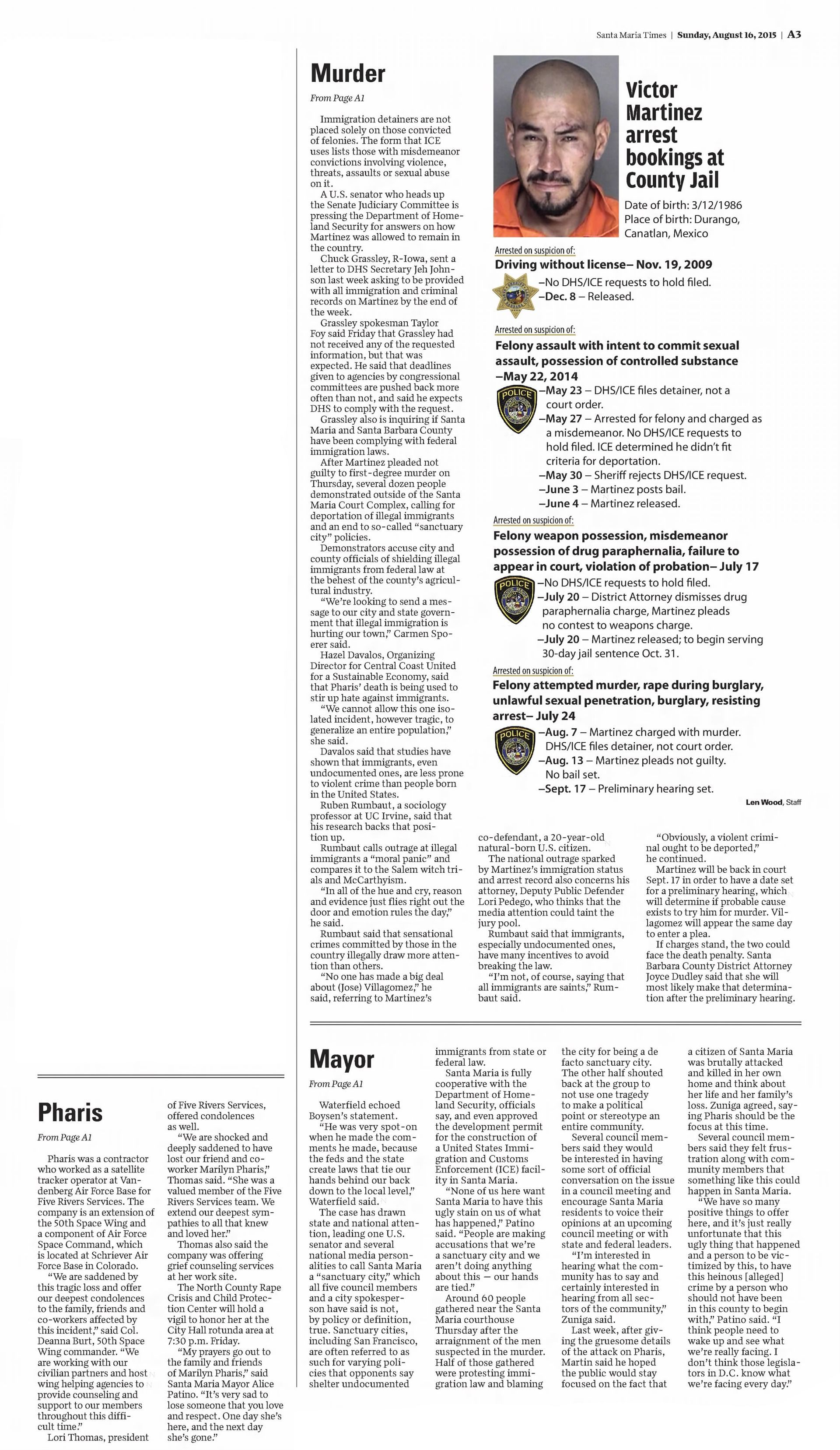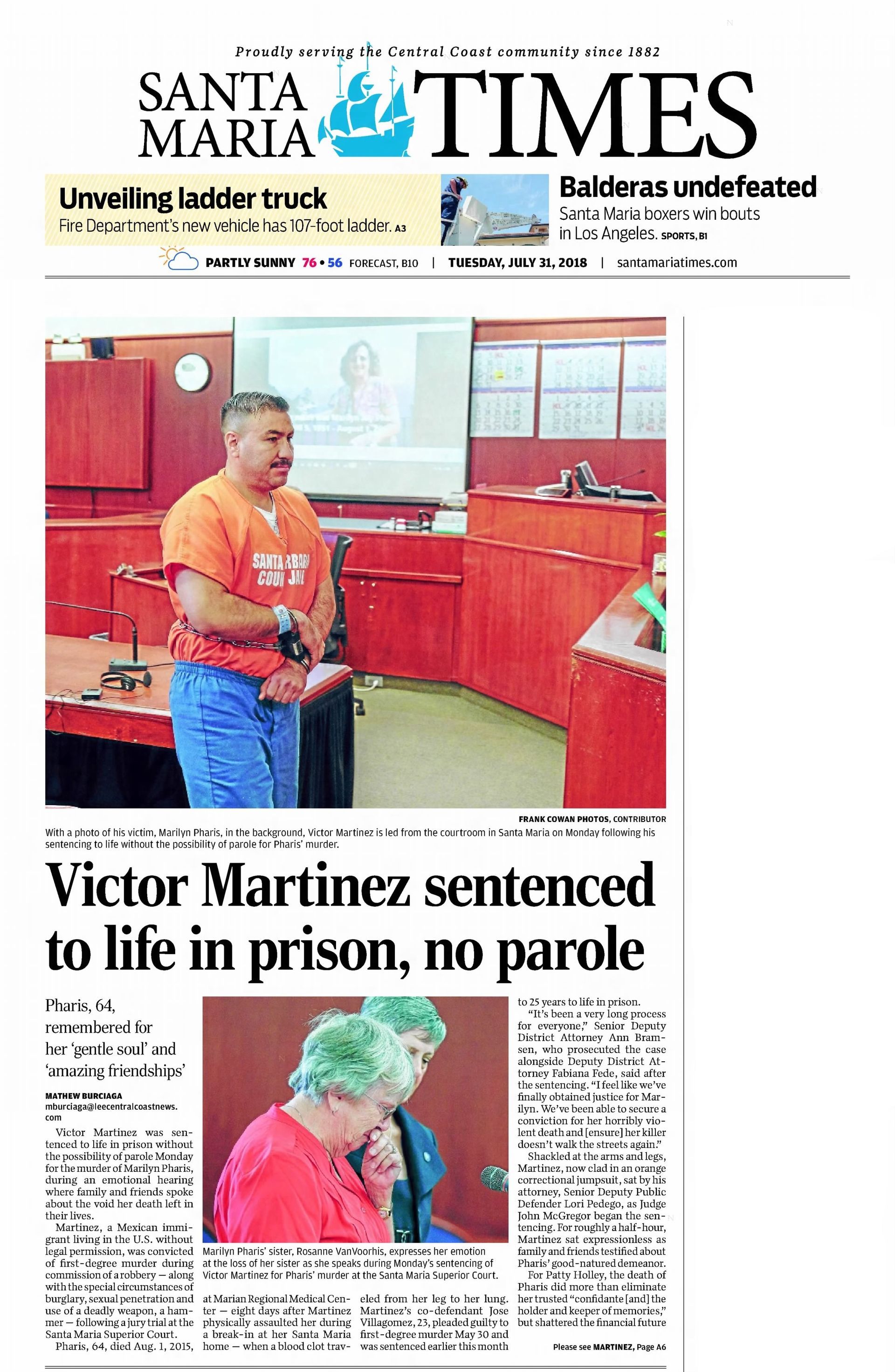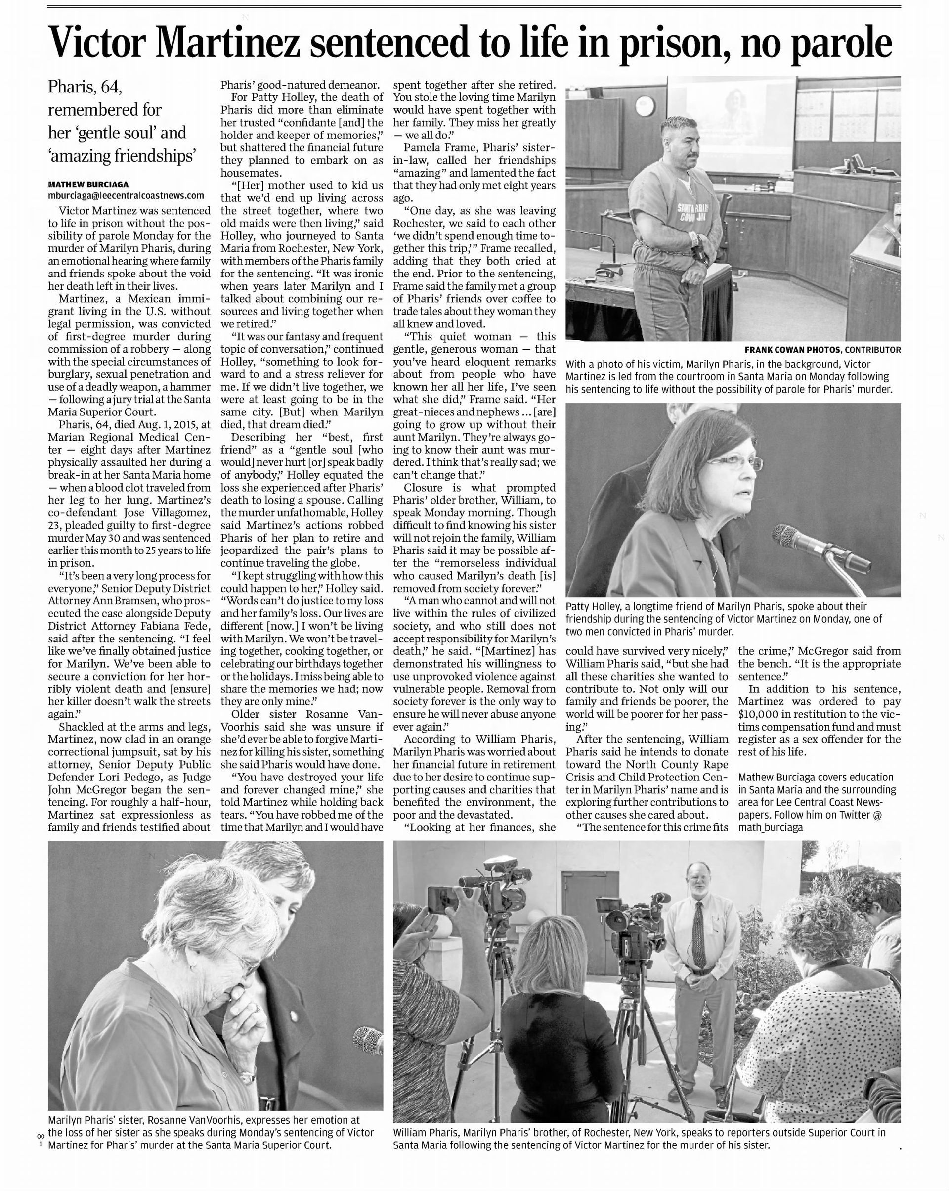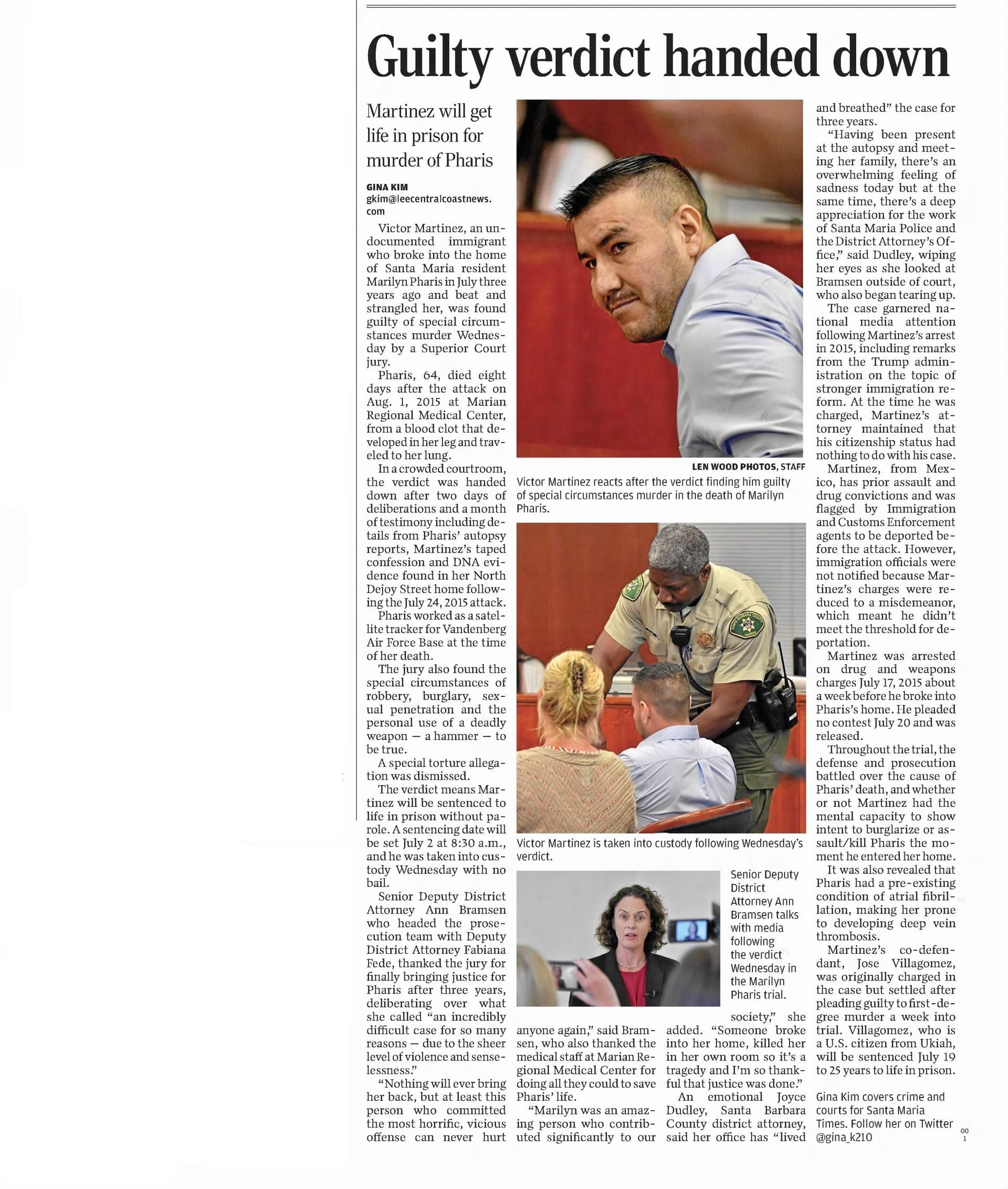 Defendants In Marilyn Pharis's Death Make Brief Court Appearance | November 19, 2015 | Noozhawk | Janene Scully Goleta-Area Man Accused of Killing His Family Enters Not Guilty by Reason of Insanity | October 21, 2015 | Noozhawk | Lara Cooper Arraignment Delayed for Former Hancock College Basketball Players Charged With Murder | October 19, 2015 | Noozhawk | Janene Scully At a Glance: Santa Maria: Arraignment continued again in Lompoc murder case | September 30, 2015 | Lompoc Record Men accused in Marilyn Pharis attack in court, case continued: New attorney on board as Public Defender's Office prepares for potential death penalty defense | September 17, 2015 | Santa Ynes Valley News | Kyle Harding Men accused in Marilyn Pharis attack in court, case continued: New attorney on board as Public Defender's Office prepares for potential death penalty defense | September 17, 2015 | Santa Maria Times | Kyle Harding Psychiatric Search Narrows in Holzer Case: Five Forensic Experts Considered to Perform Evaluation | September 16, 2015 | Santa Barbara Independent | Kelsey Knorp Prosecution in Lompoc murder case focuses on social media activity | September 1, 2015 | Santa Maria Times | Kenny Lindberg Inept Inmate Care by Corizon? Supervisors Must Decide Path for County Inmates' Health | August 20, 2015 | Santa Barbara Independent | Kelsey Brugger Defense continues cross-examination of boy, 14 | August 20, 2015 | Santa Barbara Times | Kenny Lindberg Man Accused of Murdering Family May Enter Insanity Plea in Santa Barbara Court | August 11, 2015 | Noozhawk | Lara Cooper Last U-Haul defendant sentenced | August 3, 2015 | Santa Ynez Valley News | Ryah Cooley Last U-Haul defendant sentenced | August 3, 2015 | Santa Maria Times | Ryah Cooley Man accused of ordering murder from behind bars appears in court: Three others enter not-guilty pleas, will proceed to trial | July 21, 2015 | Santa Maria Times | Kyle Harding Judge Rules Former Allan Hancock College Basketball Players to Be Tried on Murder, Other Charges | June 24, 2015 | Noozhawk | Janene Scully Preliminary Hearing Begins for Former Hancock College Basketball Players Charged with Murder: Ali Mohammed and Lavell White are accused of the fatal shooting of a 23-year-0ld man in Santa Maria during an alleged drug deal | June 23, 2015 | Noozhawk | Janene Scully Preliminary hearing set in robbery and carjacking case | May 27, 2015 | Santa Maria Times | Kyle Harding Five Men Sentenced to Life in Prison Without Parole for Torture-Murder of Anthony Ibarra: Judge rules on numerous motions during the hearing, during which family members of Ibarra speak out about 'the nightmare that will never end | May 22, 2015 | Noozhawk | Janene Scully Trio Held to Answer on Charges Related to Guadalupe Homicide | May 16, 2015 | Lompoc Record | Kyle Harding State Prison Inmate Accused of Orchestrating Murder of Santa Maria Man: Judge rules three other defendants should stand trial in the shooting of Javier Limon | May 15, 2015 | Noozhawk | Janene Scully 5 of 6 Defendants Found Guilty of First Degree Murder in U-Haul Trial: Sixth defendant pleads to kidnapping after mistrial declared | April 7, 2015 | Santa Maria Times | Kyle Harding 5 of 6 Defendants Found Guilty of First Degree Murder in U-Haul Trial: Sixth defendant pleads to kidnapping after mistrial declared | April 7, 2015 | Santa Ynez Valley News | Kyle Harding 5 Men Found Guilty in Santa Maria Torture-Murder Case: Jury in Ibarra case returns guilty verdicts against five of the six defendants | April 7, 2015 | Noozhawk | Janene Scully U-Haul juror dismissed, deliberations start over | March 31, 2015 | Santa Maria Times | Kyle Harding Jury Begins Deliberating in Santa Maria Torture-Murder Trial | March 24, 2015 | Noozhawk | Janene Scully U-Haul closing arguments continue | March 20, 2015 | Santa Maria Times | Kyle Harding U-Haul defense casts doubt on witness credibility | March 19, 2015 | Santa Maria Times | Kyle Harding County Lines: Santa Maria: U-Haul defense casts doubt on witness credibility | March 19, 2015 | Santa Maria Times No hearing yet for Hancock College basketball players | March 16, 2015 | Santa Maria Times | Staff Report Sentencing Hearing an Explosive Ending to Santa Barbara County's First Human Trafficking Trial: Brannon Lawrence Pitcher, found guilty by a jury of prostituting a teen girl, is kicked out of the courtroom for shouting at the judge | March 13, 2015 | Noozhawk | Lara Cooper Second Defendant Testifies in Ibarra Murder Trial | March 13, 2015 | Noozhawk | Janene Scully Second U-Haul Defendant Testifies, Counters Allegations | March 12, 2015 | Lompoc Record | Kyle Harding Sentencing Delayed in Human Trafficking Case | March 8, 2015 | Santa Barbara Independent | Colleen Flaherty Cameron Oliver Arraigned on Murder Charges is Drunk Driving Crash | March 8, 201 5 | News Channel 12-3-11 | News Channel 3-12 Week 8: Santa Maria Ibarra Murder Trial | March 7, 2015 | New Channel 12-3-11 | News Channel 3-12 Defendant testifies he was not present when Anthony Ibarra died | March 6, 2015 | Santa Maria Times | Kyle Harding U-Haul Defendant Takes the Stand | March 5, 2015 | Santa Maria Times | Kyle Harding Defendant Takes Witness Stand in Own Defense in Ibarra Murder Trial: Anthony "AJ" Solis denies gang membership during testimony | March 5, 2015 | Noozhawk | Janene Scully Defense Expert Testifies About Phrase 'Gang Associate' During Ibarra Murder Trial | March 3, 2015 | Noozhawk | Janene Scully Prosecution Rests in Santa Maria Trial of Six Defendants Charged in Ibarra Murder: Defense attorneys ask the judge to acquit their clients, accused of the gang-related torture-slaying of Anthony Ibarra in March 2013 | February 27, 2015 | Noozhawk | Janene Scully U-Haul defense continues cross-examination of SMPD gang detective | February 26, 2015 | Santa Maria Times | Kyle Harding U-Haul defense attorneys question SMPD detective: Prosecutor, detective paint picture of local gang violence | February 24, 2015 | Santa M