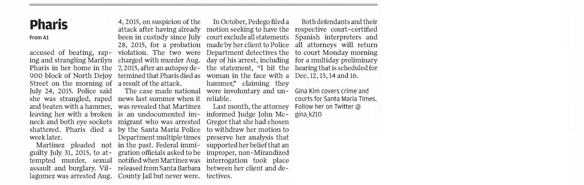 Attorneys Discuss Jury Selection for Man Charged With Murdering Dr. Henry Han and Family | October 28, 2020 | Noozhawk | Brooke Holland Public Defenders Set Plan for One-on-One Virtual Meeting with Triple-Murder Suspect Pierre Haobsh | August 12, 2020 | Noozhawk | Brooke Holland Court Hearing Held for Pierre Haobsh, Suspect in 2016 Murders of Dr. Henry Han and Family: His attorneys say accessibility issues are hindering efforts to schedule a trial; the case is scheduled to return to court next month | July 29, 2020 | Noozhawk | Brooke Holland Santa Barbara Public Defenders Demand Civil Justice in Black Lives Matter Demonstration | June 8, 2020 | News Channel 12-3-11 | Scott Sheahen Public Defenders Make a Stand for Black Lives | June 8, 2020 | Santa Barbara Independent | Jean Yamamura MS-13 judge to consider protecting juror identities | February 14, 2020 | Santa Maria Times | Dave Minsky