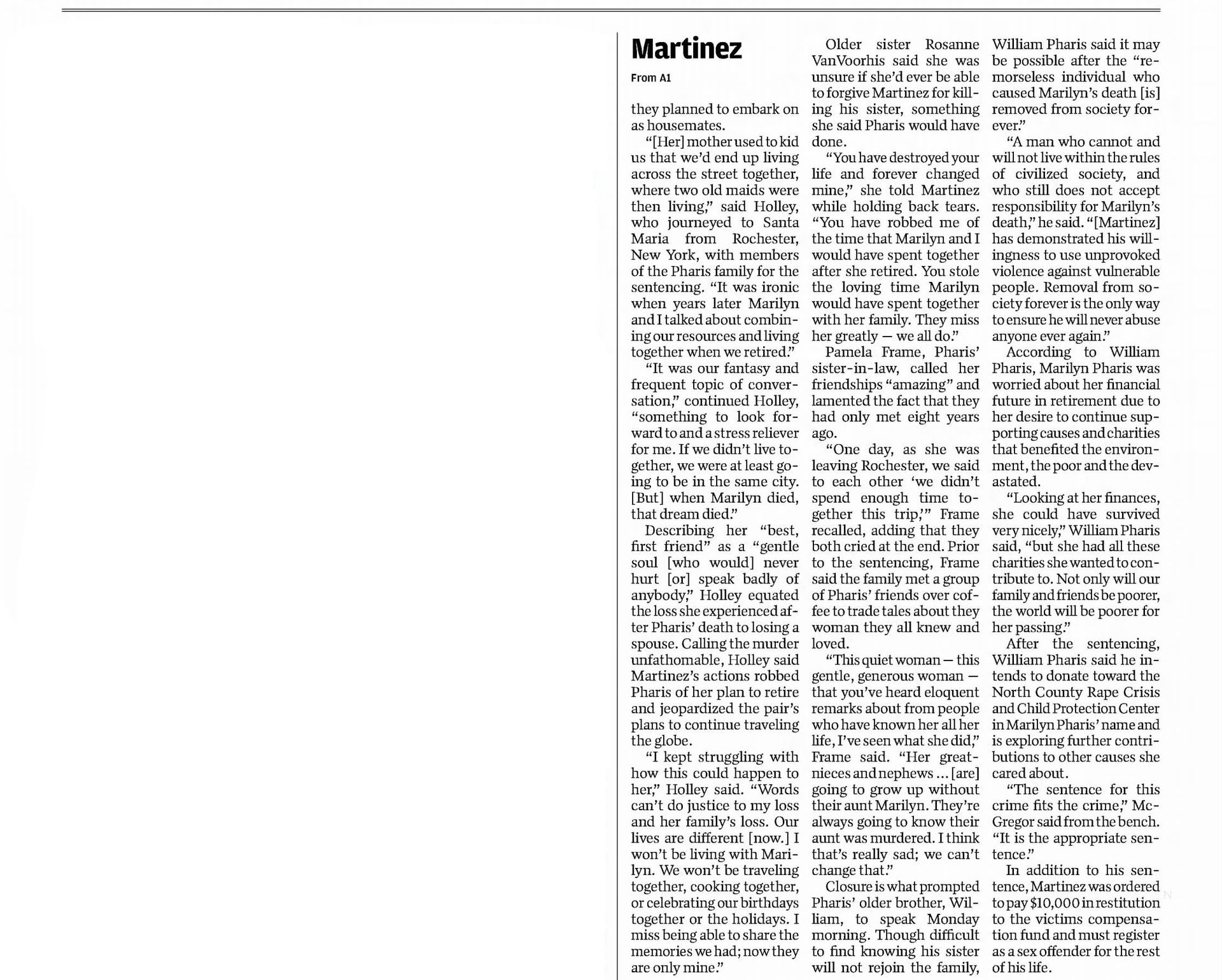 A Grisly Crime: Recap of the Pierre Haobsh Trial: How the Triple-Murder Case Played Out Leading to the Guilty Verdict | December 1, 2021 | Santa Barbara Independent | Ryan P. Cruz Triple-Murder Suspect Pierre Haobsh Gives His Account of Days Leading to Han Family Murders; Defendant describes his involvement with multiple companies and his belief that the U.S. Department of Energy was targeting him | November 23, 2021 | Noozhawk | Serena Guentz Haobsh Spins a Story on the Stand: Accused of Triple Murder, Alleged Killer Gives His Version of the Evidence | November 23, 2021 | Santa Barbara Independent | Jean Yamamura & Nick Welsh Triple-Murder Suspect Pierre Haobsh Starts Testifying in Own Defense During Santa Barbara Trial: He faces murder charges in the 2016 killings of Goleta-area Dr. Weidong 'Henry' Han, Huijie 'Jennie' Yu and their daughter, Emily | November 22, 2021 | Noozhawk | Serena Guentz Defense Team Raises Doubts in Case Against Accused Han Family Killer: Pierre Haobsh's Attorneys Question Reliability of Cell Phone Data Records | November 19, 2021 | Santa Barbara Independent | Ryan P. Cruz & Jun Starkey Triple-Murder Trial for Pierre Haobsh Continues with Defense Witnesses | November 18, 2021 | Noozhawk | Serena Guentz Review of Suspect's Computer Search History May Implicate Him in Triple Homicide | November 17, 2021 | Vanguard | Mairead Perez Computer Analyst Provides Forensic Evidence in Triple Murder Case | November 16, 2021 | Vanguard | Joshua Cenzano Trial for Triple-Murder Suspect Pierre Haobsh Hears Testimony From Expert Witness: Lead investigator says the web history on Haobsh's laptop included a search for 'can 22lr hollow point penetrate the skull' | November 12, 2021 | Noozhawk | Serena Guentz Grim Friday Hearing in Haobsh Trial; Photos Displayed of Triple Murder Victims as Evidence Unfolds | November 5, 2021 | Santa Barbara Independent | Jean Yamamura Triple-Murder Trial for Pierre Haobsh Continues with Testimony From Sheriff's Personnel: Segments of Detective Jeff McDaniel's four-hour interrogation with the suspect, accused of killing the Han family in 2016, also a shown in court | November 5, 2021 | Noozhawk | Serena Guentz Inside the Interrogation Room with Accused Killer Pierre Haobsh; Witness Testimony Continued Thursday in Han Family Triple Murder Case | November 4, 2021 | Santa Barbara Independent | Ryan P. Cruz Witness Testimony Begins in Han Family Triple Murder Case: Prosecutors Lay the Foundation for Arguments Against Alleged Murderer Pierre Haobsh | October 29, 2021 | Santa Barbara Independent | Serena Guentz Triple-Murder Trial Starts for Pierre Haobsh, Accused of 2016 Slayings of Han Family | October 28, 2021 | Noozhawk | Giana Magnoli P ublic Defender Objects to Late Trial Video Evidence, Suggesting It Was Racist and Offensive | September 1, 2021 | Vanguard | Carson Eschen Santa Barbara DA Drops Bid for Death Penalty in Han Family Murder Case: In Exchange, Triple Homicide Defendant Agrees to Trial by Judge Instead of Jury | August 13, 2021 | Santa Barbara Independent | Nick Welsh Triple-Murder Suspect Pierre Haobsh Waives Right to Jury Trial, Will Have Case Heard in a Bench Trial: Santa Barbara County District Attorney's Office drops intention to seek death penalty in the case, attorneys said Thursday | August 12, 2021 | Noozhawk | Brooke Holland Public Defender Argues Defendant Should Be Allowed to Possess Discovery During Trial; District Attorney Disagrees, Citing Safety Concern | August 12, 2021 | Vanguard | Michelle Lagos Defendant Waive Rights, Accepts Plea Deal, Pleads No Contest to Charges | August 8, 2021 | Vanguard | Lauren Smith Triple-Murder Suspect Pierre Haobsh Expected to Waive Right to Jury Trial, Defense Says: Attorneys make a brief appearance as they work toward a final agreement for a bench trial in the deaths of Dr. Henry Han, his wife and child | July 22, 2021 | Noozhawk | Brooke Holland Santa Barbara County judge approves motion to continue MS-13 trial May 3 | January 8, 2021 | Santa Maria Times | Dave Minsky