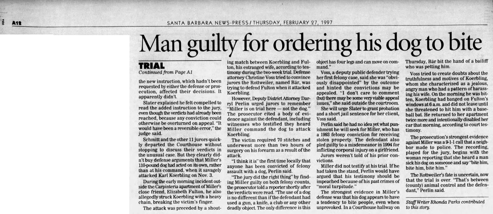 The District Attorney wanted to send Christine's client to prison for ordering his rottweiler to attack someone