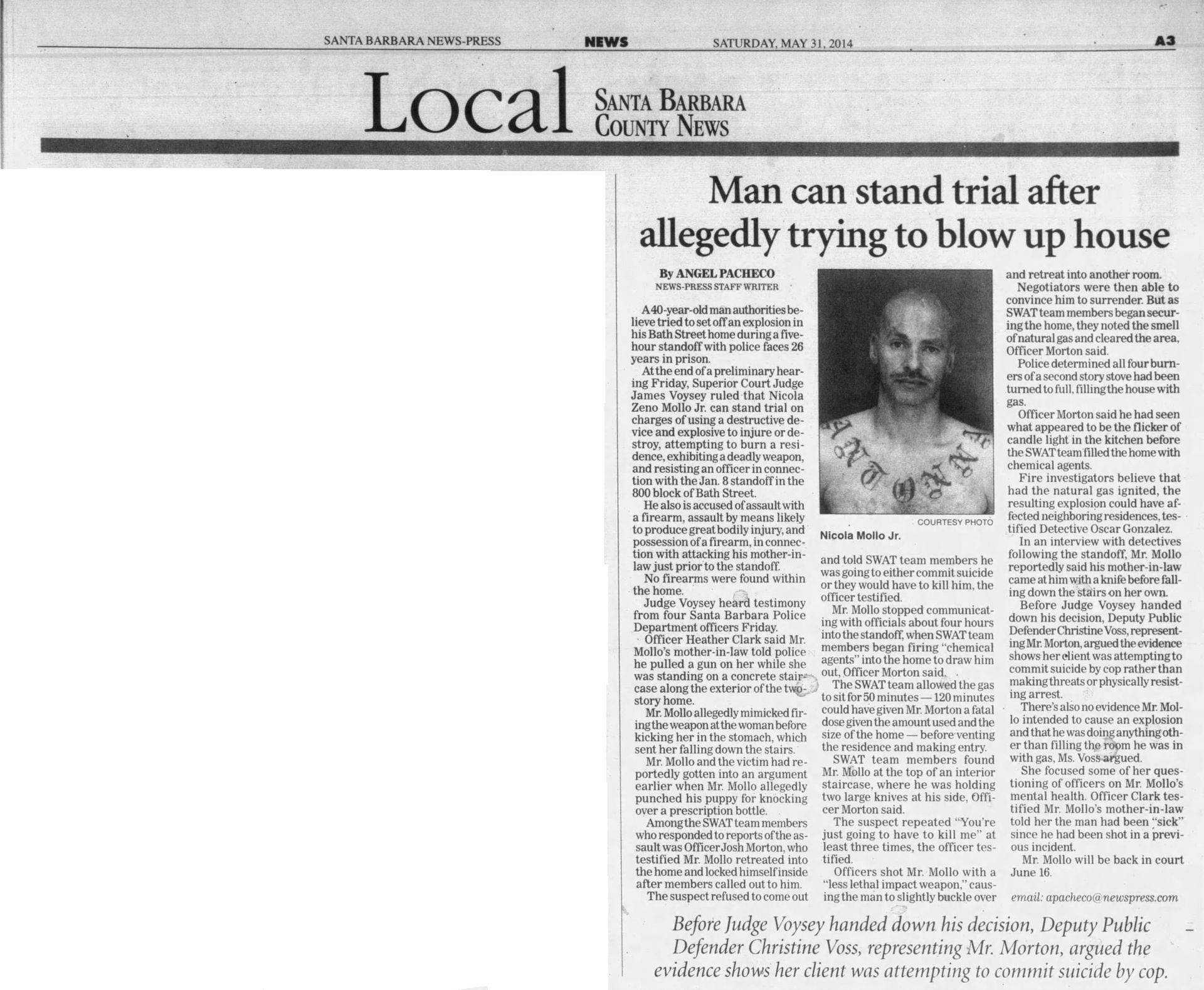 Defendants In Marilyn Pharis's Death Make Brief Court Appearance | November 19, 2015 | Noozhawk | Janene Scully Goleta-Area Man Accused of Killing His Family Enters Not Guilty by Reason of Insanity | October 21, 2015 | Noozhawk | Lara Cooper Arraignment Delayed for Former Hancock College Basketball Players Charged With Murder | October 19, 2015 | Noozhawk | Janene Scully At a Glance: Santa Maria: Arraignment continued again in Lompoc murder case | September 30, 2015 | Lompoc Record Men accused in Marilyn Pharis attack in court, case continued: New attorney on board as Public Defender's Office prepares for potential death penalty defense | September 17, 2015 | Santa Ynes Valley News | Kyle Harding Men accused in Marilyn Pharis attack in court, case continued: New attorney on board as Public Defender's Office prepares for potential death penalty defense | September 17, 2015 | Santa Maria Times | Kyle Harding Psychiatric Search Narrows in Holzer Case: Five Forensic Experts Considered to Perform Evaluation | September 16, 2015 | Santa Barbara Independent | Kelsey Knorp Prosecution in Lompoc murder case focuses on social media activity | September 1, 2015 | Santa Maria Times | Kenny Lindberg Inept Inmate Care by Corizon? Supervisors Must Decide Path for County Inmates' Health | August 20, 2015 | Santa Barbara Independent | Kelsey Brugger Defense continues cross-examination of boy, 14 | August 20, 2015 | Santa Barbara Times | Kenny Lindberg Man Accused of Murdering Family May Enter Insanity Plea in Santa Barbara Court | August 11, 2015 | Noozhawk | Lara Cooper Last U-Haul defendant sentenced | August 3, 2015 | Santa Ynez Valley News | Ryah Cooley Last U-Haul defendant sentenced | August 3, 2015 | Santa Maria Times | Ryah Cooley Man accused of ordering murder from behind bars appears in court: Three others enter not-guilty pleas, will proceed to trial | July 21, 2015 | Santa Maria Times | Kyle Harding Judge Rules Former Allan Hancock College Basketball Players to Be Tried on Murder, Other Charges | June 24, 2015 | Noozhawk | Janene Scully Preliminary Hearing Begins for Former Hancock College Basketball Players Charged with Murder: Ali Mohammed and Lavell White are accused of the fatal shooting of a 23-year-0ld man in Santa Maria during an alleged drug deal | June 23, 2015 | Noozhawk | Janene Scully Preliminary hearing set in robbery and carjacking case | May 27, 2015 | Santa Maria Times | Kyle Harding Five Men Sentenced to Life in Prison Without Parole for Torture-Murder of Anthony Ibarra: Judge rules on numerous motions during the hearing, during which family members of Ibarra speak out about 'the nightmare that will never end | May 22, 2015 | Noozhawk | Janene Scully Trio Held to Answer on Charges Related to Guadalupe Homicide | May 16, 2015 | Lompoc Record | Kyle Harding State Prison Inmate Accused of Orchestrating Murder of Santa Maria Man: Judge rules three other defendants should stand trial in the shooting of Javier Limon | May 15, 2015 | Noozhawk | Janene Scully 5 of 6 Defendants Found Guilty of First Degree Murder in U-Haul Trial: Sixth defendant pleads to kidnapping after mistrial declared | April 7, 2015 | Santa Maria Times | Kyle Harding 5 of 6 Defendants Found Guilty of First Degree Murder in U-Haul Trial: Sixth defendant pleads to kidnapping after mistrial declared | April 7, 2015 | Santa Ynez Valley News | Kyle Harding 5 Men Found Guilty in Santa Maria Torture-Murder Case: Jury in Ibarra case returns guilty verdicts against five of the six defendants | April 7, 2015 | Noozhawk | Janene Scully U-Haul juror dismissed, deliberations start over | March 31, 2015 | Santa Maria Times | Kyle Harding Jury Begins Deliberating in Santa Maria Torture-Murder Trial | March 24, 2015 | Noozhawk | Janene Scully U-Haul closing arguments continue | March 20, 2015 | Santa Maria Times | Kyle Harding U-Haul defense casts doubt on witness credibility | March 19, 2015 | Santa Maria Times | Kyle Harding County Lines: Santa Maria: U-Haul defense casts doubt on witness credibility | March 19, 2015 | Santa Maria Times No hearing yet for Hancock College basketball players | March 16, 2015 | Santa Maria Times | Staff Report Sentencing Hearing an Explosive Ending to Santa Barbara County's First Human Trafficking Trial: Brannon Lawrence Pitcher, found guilty by a jury of prostituting a teen girl, is kicked out of the courtroom for shouting at the judge | March 13, 2015 | Noozhawk | Lara Cooper Second Defendant Testifies in Ibarra Murder Trial | March 13, 2015 | Noozhawk | Janene Scully Second U-Haul Defendant Testifies, Counters Allegations | March 12, 2015 | Lompoc Record | Kyle Harding Sentencing Delayed in Human Trafficking Case | March 8, 2015 | Santa Barbara Independent | Colleen Flaherty Cameron Oliver Arraigned on Murder Charges is Drunk Driving Crash | March 8, 201 5 | News Channel 12-3-11 | News Channel 3-12 Week 8: Santa Maria Ibarra Murder Trial | March 7, 2015 | New Channel 12-3-11 | News Channel 3-12 Defendant testifies he was not present when Anthony Ibarra died | March 6, 2015 | Santa Maria Times | Kyle Harding U-Haul Defendant Takes the Stand | March 5, 2015 | Santa Maria Times | Kyle Harding Defendant Takes Witness Stand in Own Defense in Ibarra Murder Trial: Anthony "AJ" Solis denies gang membership during testimony | March 5, 2015 | Noozhawk | Janene Scully Defense Expert Testifies About Phrase 'Gang Associate' During Ibarra Murder Trial | March 3, 2015 | Noozhawk | Janene Scully Prosecution Rests in Santa Maria Trial of Six Defendants Charged in Ibarra Murder: Defense attorneys ask the judge to acquit their clients, accused of the gang-related torture-slaying of Anthony Ibarra in March 2013 | February 27, 2015 | Noozhawk | Janene Scully U-Haul defense continues cross-examination of SMPD gang detective | February 26, 2015 | Santa Maria Times | Kyle Harding U-Haul defense attorneys question SMPD detective: Prosecutor, detective paint picture of local gang violence | February 24, 2015 | Santa M