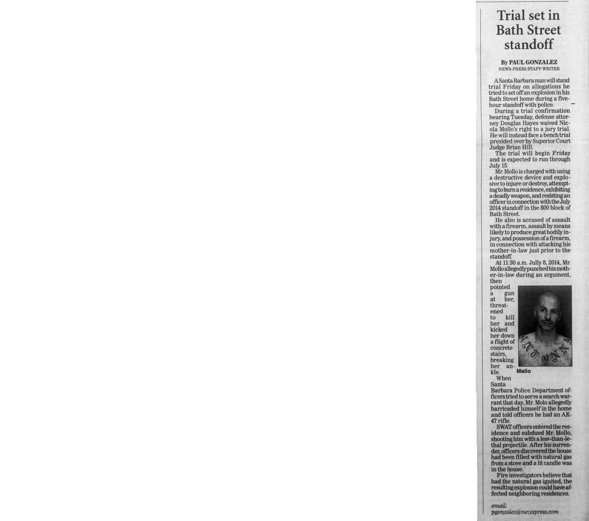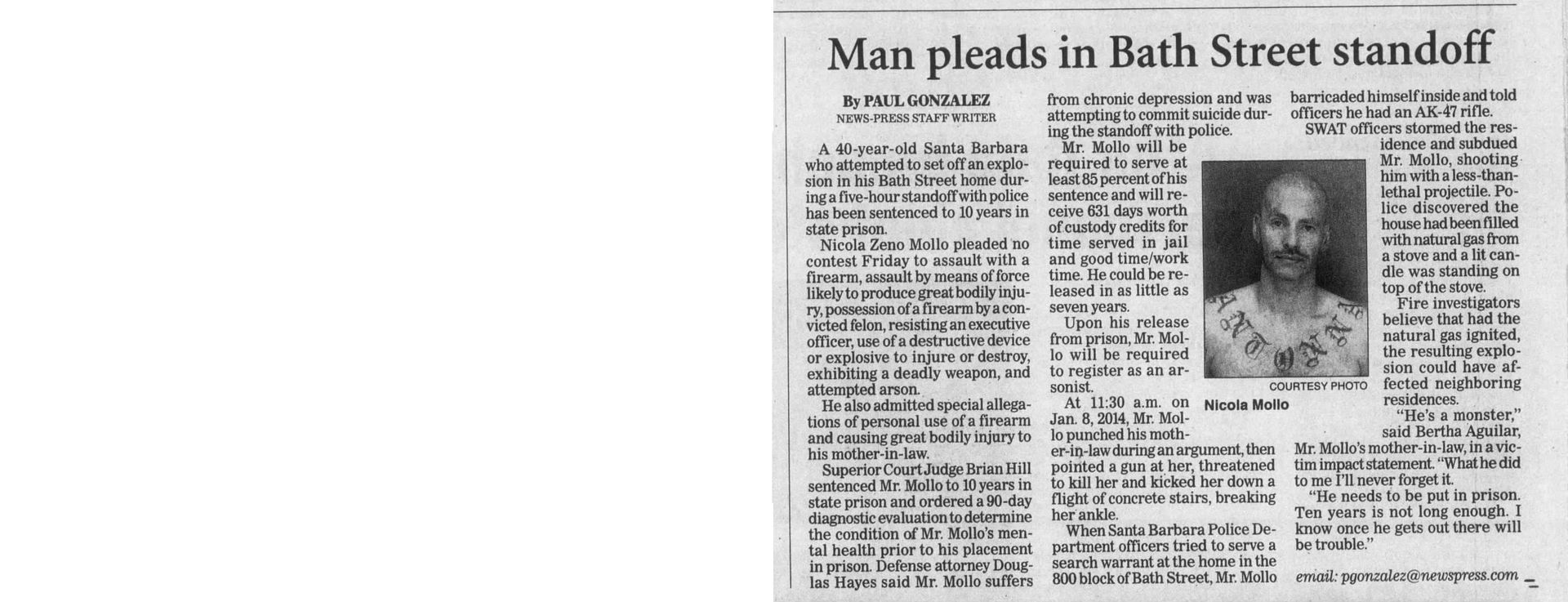 What Were Noozhawk's 16 Most-Read Stories of 2016?: Carnage, killings, wildfires and court cases captivated readers during a tumultuous year | December 30, 2016 | Noozhawk | Tom Bolton and Giana Magnoli Man Gets Seven Years in Domestic Violence Case | December 21, 2016 | Santa Barbara Independent | Kelsey Brugger Santa Maria youth basketball coach to face trial on molestation charges | December 20, 2016 | San Luis Obispo Tribune | Janene Scully Santa Maria Youth Basketball Coach Will Face Trial on Molestation Charges | December 19, 2016 | Noozhawk | Janene Scully Tentative April Trial Date Set for Goleta-Area Quadruple Murder Case: Nicolas Holzer has entered an insanity plea to charges he murdered his parents and two sons in August of 2014 | December 15, 2016 | Noozhawk | Giana Magnoli Han family murder suspect sent letter to DA after alleged crimes | December 6, 2016 | News Channel 12-3-11 | News Channel 3-12 Basketball coach charged with lewd acts pleads not guilty | December 5, 2016 | Santa Maria Times | Gina Kim Preliminary Hearing Date Delayed for Santa Barbara-Area Triple-Murder Suspect | November 15, 2016 | Noozhawk | Giana Magnoli Han Family Murder Suspect Appears Appears in Santa Barbara Court Tuesday | August 9, 2016 | News Channel 12-3-11 | News Channel 3-12 Hearing Delayed for Suspect in Han Family Triple Murder Case | August 9, 2016 | Noozhawk | Brooke Holland Former youth pastor charged with sex abuse sentenced to 8 years | July 6, 2016 | Santa Maria Times | Gina Kim Haobsh Claims Innocence in Han Family Murders: Not Guilty Plea Pushes Case Forward | May 5, 2016 | Santa Barbara Independent | Lena Garcia Triple-Murder Suspect Pleads Not Guilty in Santa Barbara Superior Court | May 5, 2016 | Noozhawk | Giana Magnoli Operation Matador defendants will wait to set preliminary hearing: Suspects linked to MS-13 will return to court in July | April 29, 2016 | Santa Maria Times | Gina Kim Attorneys Subpoena Mental-Health Records in Goleta-Area Quadruple Murder Case: Nicolas Holzer has entered an insanity plea for killing of his parents and 2 children in 2014 | April 26, 2016 | Noozhawk | Giana Magnoli Arraignment for SM man accused of sex abuse continued | April 25, 2016 | Santa Maria Times | April Charlton Haobsh Denied Access to Public Defender; Attorney Not Allowed in County Jail, Calls Block "Unprecedented" | April 14, 2016 | Santa Barbara Independent | Lena Garcia Pierre Haobsh Makes Second Court Appearance | April 13, 2016 | YouTube | News Channel 3-12 Arraignment Delayed Again For Triple-A Suspect Pierre Haobsh: Man accused of killing Dr. Weidong "Henry" Han, his wife and daughter ordered to return to Santa Barbara Superior Court on May 5 | April 12, 2016 | Noozhawk | Giana Magnoli Inside the Han Family Murders: The Investigation, and Legacy of Dr. Henry Han | March 30, 2016 | Santa Barbara Independent | Lena Garcia Triple-Homicide Suspect Appears in Court to Face First-Degree Murder Charges: Pierre Haobsh is also accused of special allegations that could lead to death penalty in slayings of 3 Han family members | March 28, 2016 | Noozhawk | Sam Goldman MS-13 Gang Arraignment | March 18, 2016 | YouTube | Santa Maria Times