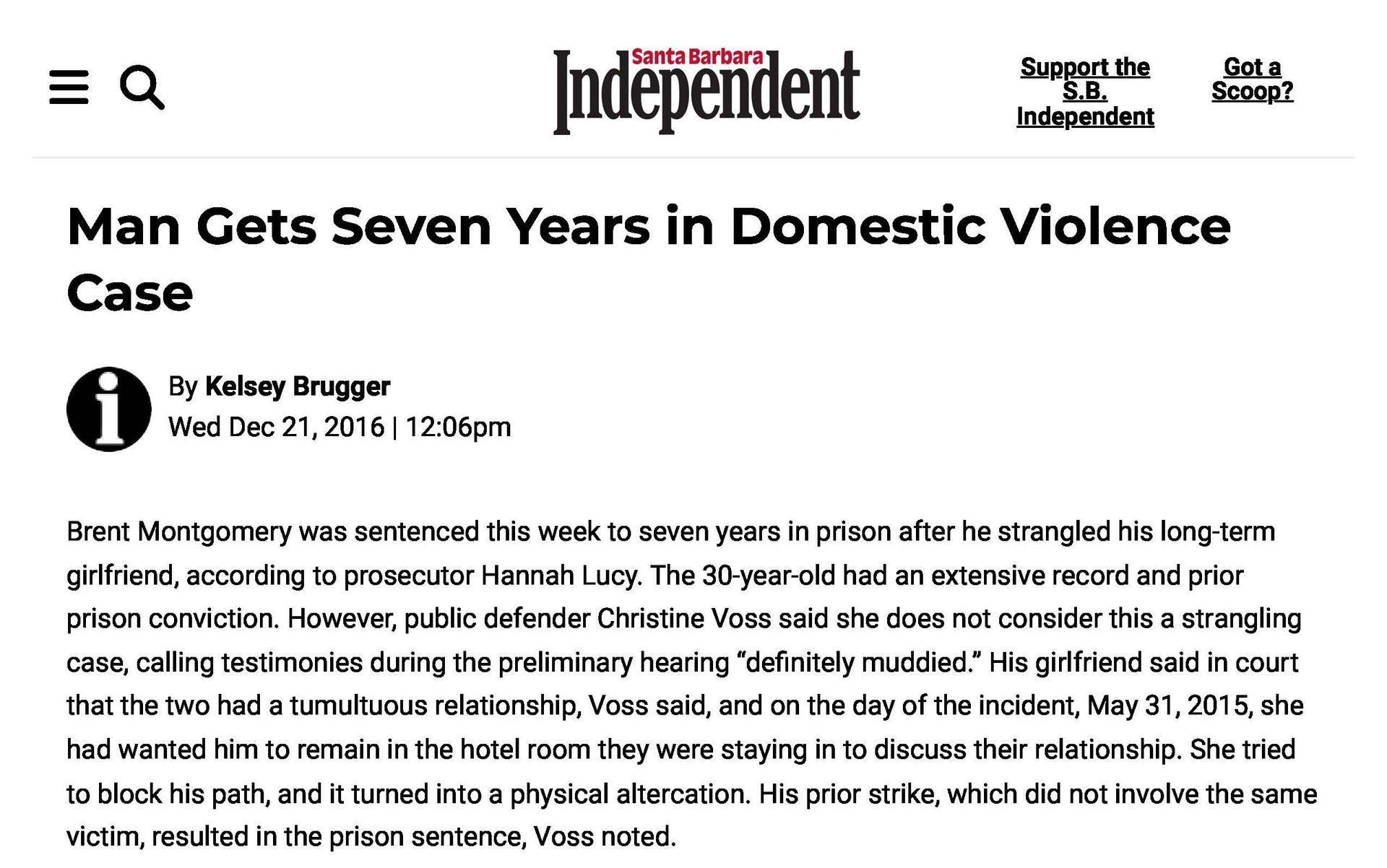What Were Noozhawk's 16 Most-Read Stories of 2016?: Carnage, killings, wildfires and court cases captivated readers during a tumultuous year | December 30, 2016 | Noozhawk | Tom Bolton and Giana Magnoli Man Gets Seven Years in Domestic Violence Case | December 21, 2016 | Santa Barbara Independent | Kelsey Brugger Santa Maria youth basketball coach to face trial on molestation charges | December 20, 2016 | San Luis Obispo Tribune | Janene Scully Santa Maria Youth Basketball Coach Will Face Trial on Molestation Charges | December 19, 2016 | Noozhawk | Janene Scully Tentative April Trial Date Set for Goleta-Area Quadruple Murder Case: Nicolas Holzer has entered an insanity plea to charges he murdered his parents and two sons in August of 2014 | December 15, 2016 | Noozhawk | Giana Magnoli Han family murder suspect sent letter to DA after alleged crimes | December 6, 2016 | News Channel 12-3-11 | News Channel 3-12 Basketball coach charged with lewd acts pleads not guilty | December 5, 2016 | Santa Maria Times | Gina Kim Preliminary Hearing Date Delayed for Santa Barbara-Area Triple-Murder Suspect | November 15, 2016 | Noozhawk | Giana Magnoli Han Family Murder Suspect Appears Appears in Santa Barbara Court Tuesday | August 9, 2016 | News Channel 12-3-11 | News Channel 3-12 Hearing Delayed for Suspect in Han Family Triple Murder Case | August 9, 2016 | Noozhawk | Brooke Holland Former youth pastor charged with sex abuse sentenced to 8 years | July 6, 2016 | Santa Maria Times | Gina Kim Haobsh Claims Innocence in Han Family Murders: Not Guilty Plea Pushes Case Forward | May 5, 2016 | Santa Barbara Independent | Lena Garcia Triple-Murder Suspect Pleads Not Guilty in Santa Barbara Superior Court | May 5, 2016 | Noozhawk | Giana Magnoli Operation Matador defendants will wait to set preliminary hearing: Suspects linked to MS-13 will return to court in July | April 29, 2016 | Santa Maria Times | Gina Kim Attorneys Subpoena Mental-Health Records in Goleta-Area Quadruple Murder Case: Nicolas Holzer has entered an insanity plea for killing of his parents and 2 children in 2014 | April 26, 2016 | Noozhawk | Giana Magnoli Arraignment for SM man accused of sex abuse continued | April 25, 2016 | Santa Maria Times | April Charlton Haobsh Denied Access to Public Defender; Attorney Not Allowed in County Jail, Calls Block "Unprecedented" | April 14, 2016 | Santa Barbara Independent | Lena Garcia Pierre Haobsh Makes Second Court Appearance | April 13, 2016 | YouTube | News Channel 3-12 Arraignment Delayed Again For Triple-A Suspect Pierre Haobsh: Man accused of killing Dr. Weidong "Henry" Han, his wife and daughter ordered to return to Santa Barbara Superior Court on May 5 | April 12, 2016 | Noozhawk | Giana Magnoli Inside the Han Family Murders: The Investigation, and Legacy of Dr. Henry Han | March 30, 2016 | Santa Barbara Independent | Lena Garcia Triple-Homicide Suspect Appears in Court to Face First-Degree Murder Charges: Pierre Haobsh is also accused of special allegations that could lead to death penalty in slayings of 3 Han family members | March 28, 2016 | Noozhawk | Sam Goldman MS-13 Gang Arraignment | March 18, 2016 | YouTube | Santa Maria Times