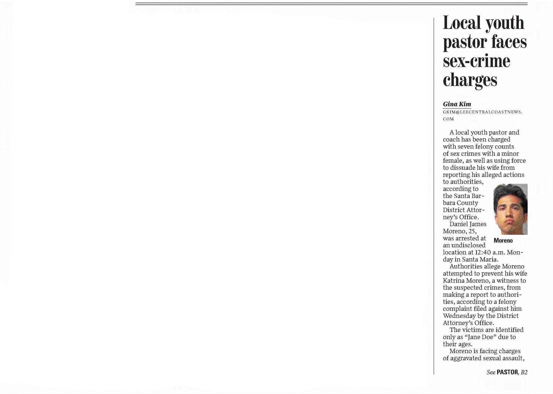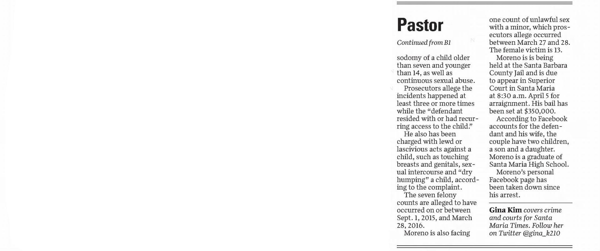 What Were Noozhawk's 16 Most-Read Stories of 2016?: Carnage, killings, wildfires and court cases captivated readers during a tumultuous year | December 30, 2016 | Noozhawk | Tom Bolton and Giana Magnoli Man Gets Seven Years in Domestic Violence Case | December 21, 2016 | Santa Barbara Independent | Kelsey Brugger Santa Maria youth basketball coach to face trial on molestation charges | December 20, 2016 | San Luis Obispo Tribune | Janene Scully Santa Maria Youth Basketball Coach Will Face Trial on Molestation Charges | December 19, 2016 | Noozhawk | Janene Scully Tentative April Trial Date Set for Goleta-Area Quadruple Murder Case: Nicolas Holzer has entered an insanity plea to charges he murdered his parents and two sons in August of 2014 | December 15, 2016 | Noozhawk | Giana Magnoli Han family murder suspect sent letter to DA after alleged crimes | December 6, 2016 | News Channel 12-3-11 | News Channel 3-12 Basketball coach charged with lewd acts pleads not guilty | December 5, 2016 | Santa Maria Times | Gina Kim Preliminary Hearing Date Delayed for Santa Barbara-Area Triple-Murder Suspect | November 15, 2016 | Noozhawk | Giana Magnoli Han Family Murder Suspect Appears Appears in Santa Barbara Court Tuesday | August 9, 2016 | News Channel 12-3-11 | News Channel 3-12 Hearing Delayed for Suspect in Han Family Triple Murder Case | August 9, 2016 | Noozhawk | Brooke Holland Former youth pastor charged with sex abuse sentenced to 8 years | July 6, 2016 | Santa Maria Times | Gina Kim Haobsh Claims Innocence in Han Family Murders: Not Guilty Plea Pushes Case Forward | May 5, 2016 | Santa Barbara Independent | Lena Garcia Triple-Murder Suspect Pleads Not Guilty in Santa Barbara Superior Court | May 5, 2016 | Noozhawk | Giana Magnoli Operation Matador defendants will wait to set preliminary hearing: Suspects linked to MS-13 will return to court in July | April 29, 2016 | Santa Maria Times | Gina Kim Attorneys Subpoena Mental-Health Records in Goleta-Area Quadruple Murder Case: Nicolas Holzer has entered an insanity plea for killing of his parents and 2 children in 2014 | April 26, 2016 | Noozhawk | Giana Magnoli Arraignment for SM man accused of sex abuse continued | April 25, 2016 | Santa Maria Times | April Charlton Haobsh Denied Access to Public Defender; Attorney Not Allowed in County Jail, Calls Block "Unprecedented" | April 14, 2016 | Santa Barbara Independent | Lena Garcia Pierre Haobsh Makes Second Court Appearance | April 13, 2016 | YouTube | News Channel 3-12 Arraignment Delayed Again For Triple-A Suspect Pierre Haobsh: Man accused of killing Dr. Weidong "Henry" Han, his wife and daughter ordered to return to Santa Barbara Superior Court on May 5 | April 12, 2016 | Noozhawk | Giana Magnoli Inside the Han Family Murders: The Investigation, and Legacy of Dr. Henry Han | March 30, 2016 | Santa Barbara Independent | Lena Garcia Triple-Homicide Suspect Appears in Court to Face First-Degree Murder Charges: Pierre Haobsh is also accused of special allegations that could lead to death penalty in slayings of 3 Han family members | March 28, 2016 | Noozhawk | Sam Goldman MS-13 Gang Arraignment | March 18, 2016 | YouTube | Santa Maria Times