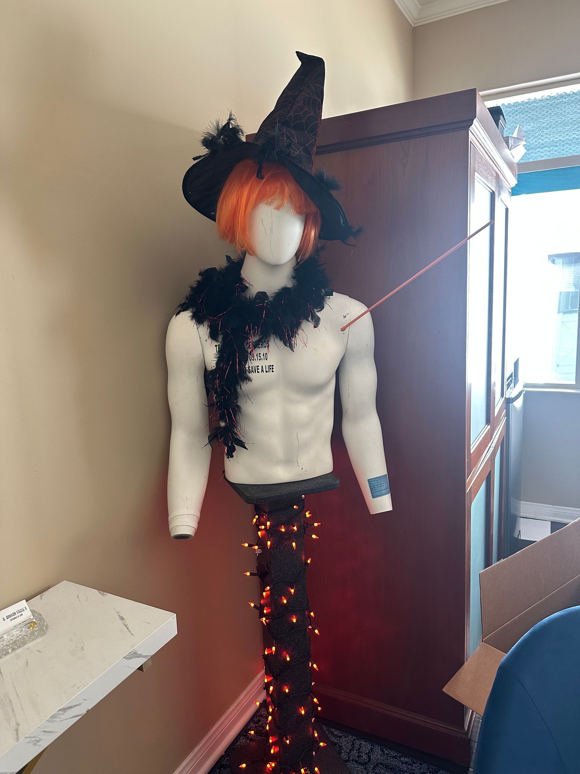 The UCSB interns dress up Mr. 319 for holidays and occasions.  It's unclear what the occasion is here.  Maybe it's Fiesta, maybe it's summer solstice, not sure.