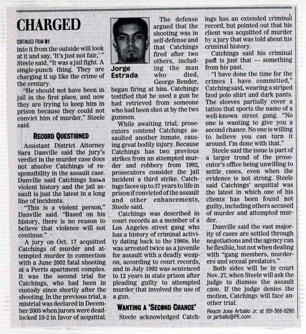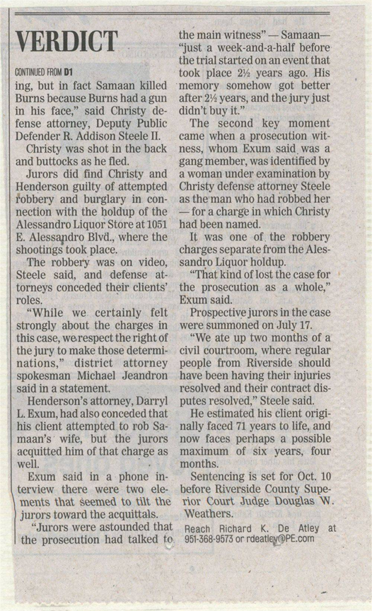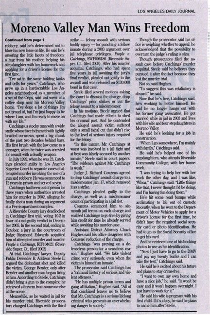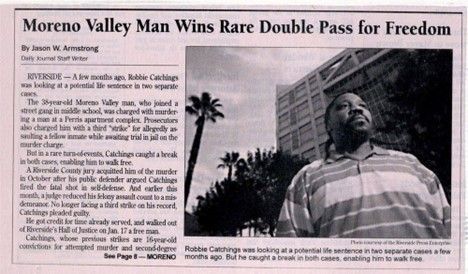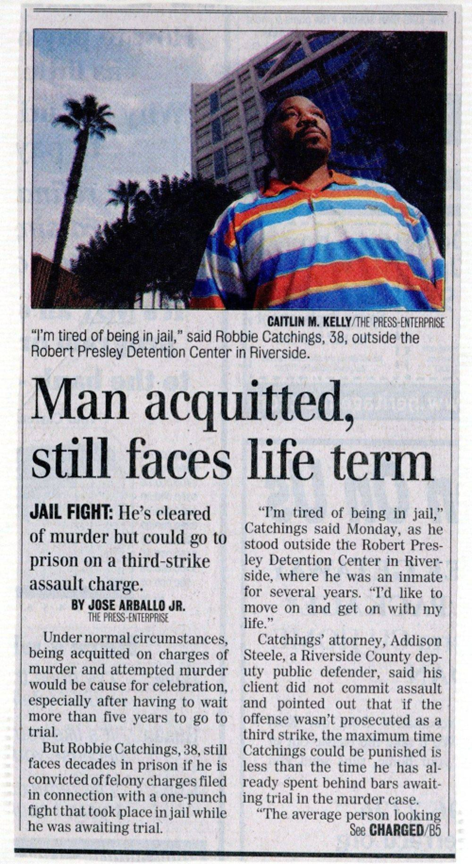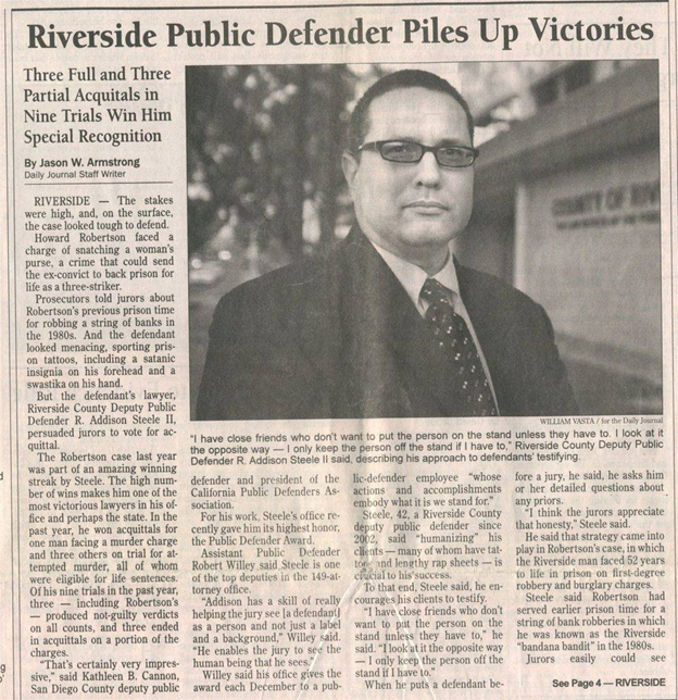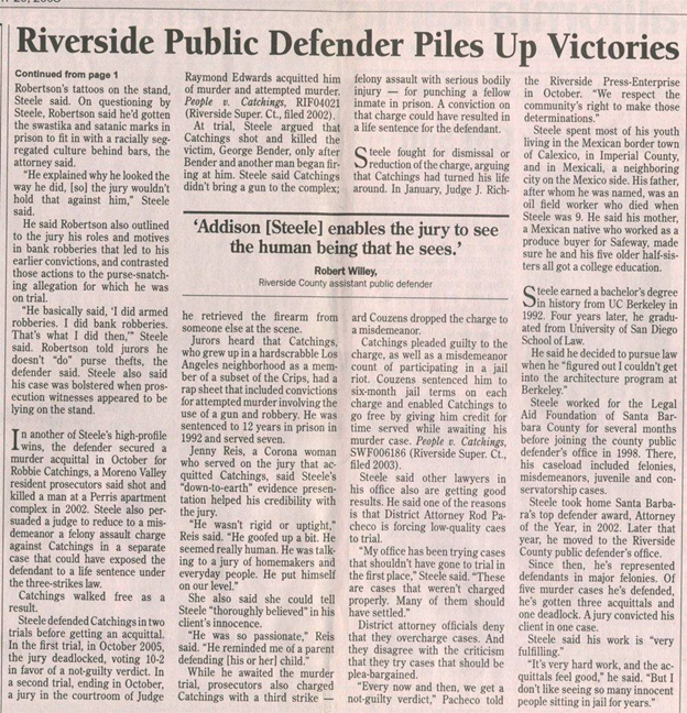 In another of Steele's high-profile wins, the defender secured a murder acquittal in October for Robbie Catchings, a Moreno Valley resident prosecutor said shot and killed a man at a Perris apartment complex in 2002. Steele also persuaded a judge to reduce to a misdemeanor a felony assault charge against Catchings in a separate case that could have exposed the defendant to a life sentence under the three-strikes law.