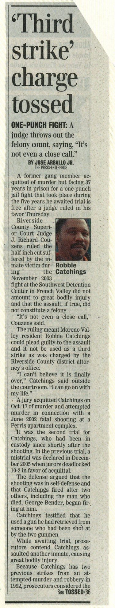 - After we won the murder trial, the district attorney tried to give Robbie a life in prison sentence because he was a third striker and had gotten in a jail fight while he was waiting for his trial when he was acquitted of all charges. I filed a series of motions, including a bail motion when they tried to have Robbie sent back to jail, a motion to dismiss the jail fight case, a motion to strike the strike priors, and a motion to reduce the charge to a misdemeanor. The judge reduced the case to a misdemeanor. Robbie pled guilty to the misdemeanor for credit for time already served, and it was finally all over. Robbie was able to go home and take care of his ailing mother.