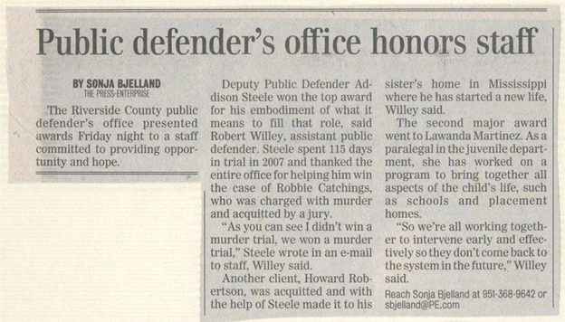 Robbie was also featured in a newspaper article covering when I was named Riverside County Public Defenders Office Attorney of the Year.
