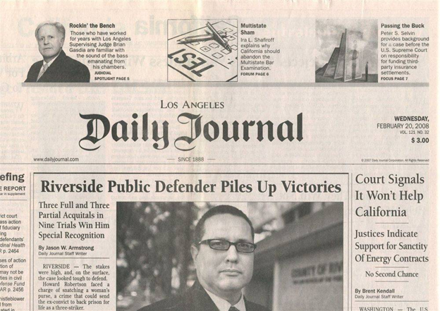 - Riverside Public Defender Piles Up Victories: Three Full and Three Partial Acquittals in Nine Trials Win Him Special Recognition, Jason W. Armstrong, Los Angeles Daily Journal, Volume 121, Number 32, February 20, 2008.