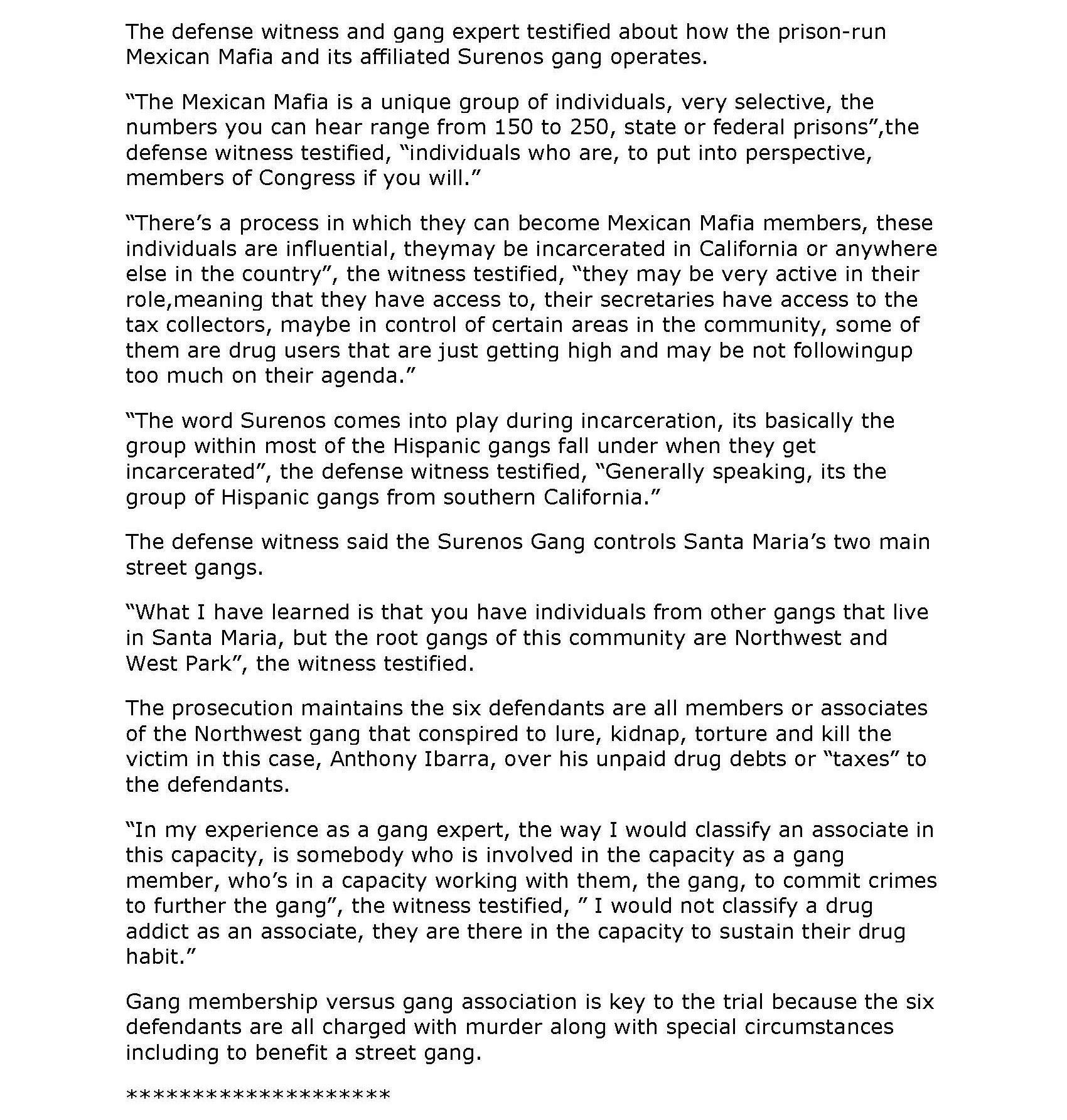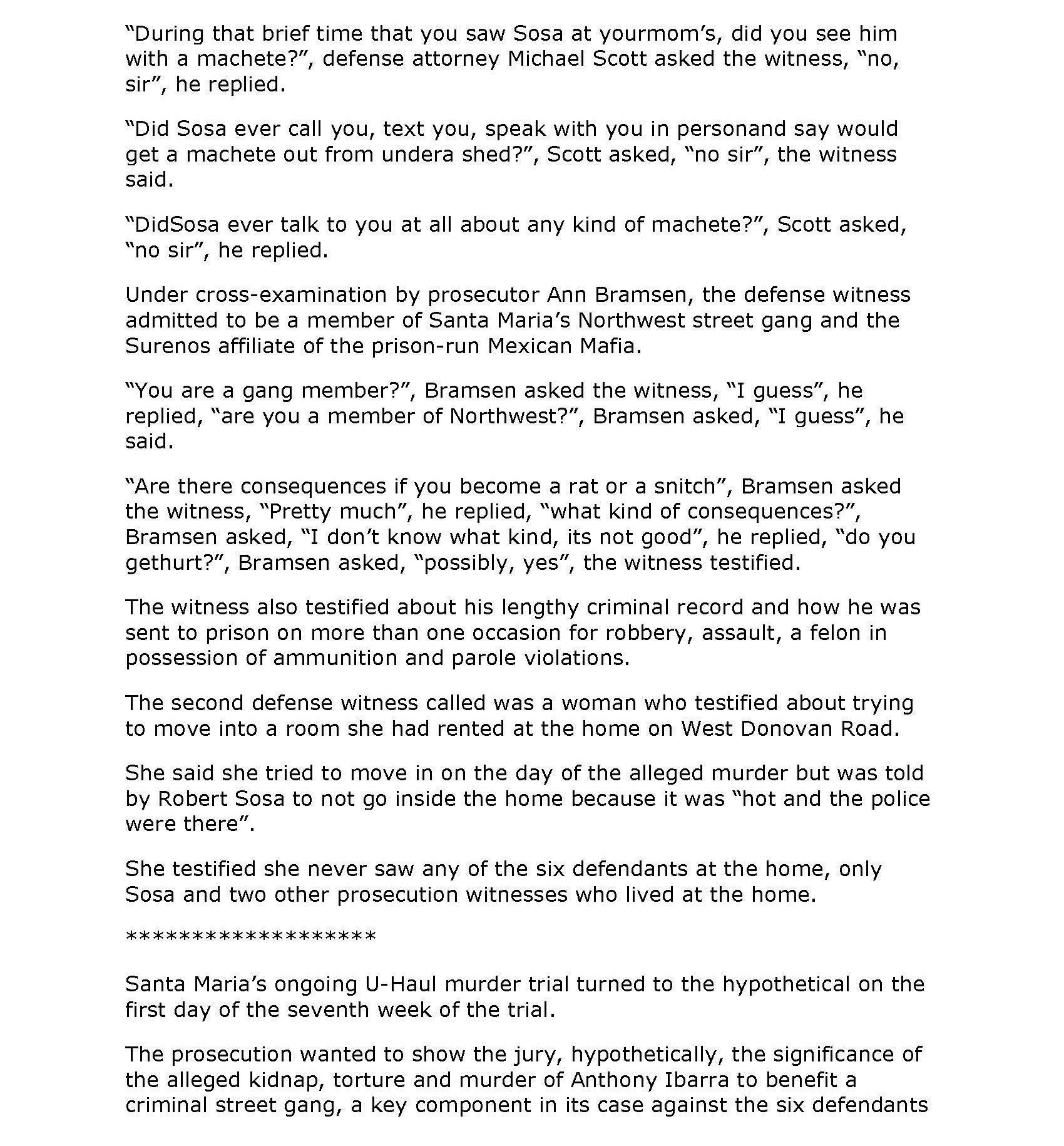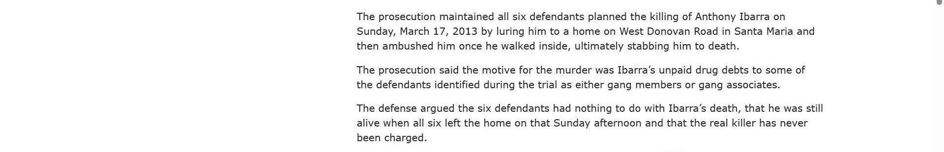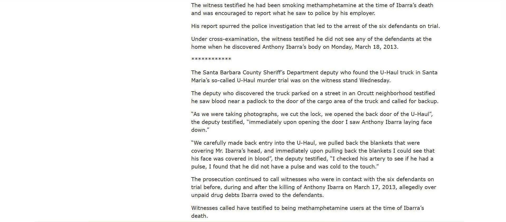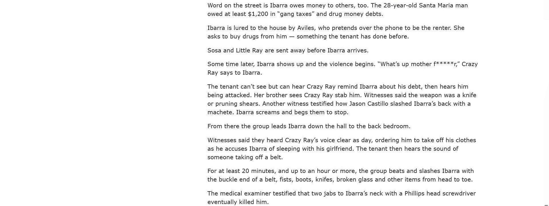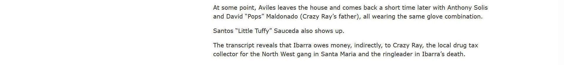 The district attorney's theory was that the decedent was a drug dealer, and that he had been scamming customers as well as not paying "taxes" to the Mexican Mafia. The district attorney believed that a co-defendant with the nickname (they said gang moniker) of Crazy Ray, had recruited a group to "check" (impose a punishment) on the decedent for both ripping off customers and for not paying a portion of his proceeds to the Mexican Mafia. The believed that the group then tortured the decedent to death, rented a U-Haul, put his body in the U-Haul and abandoned it. The incident occurred at a house that didn't belong to any of the people in the group with Crazy Ray. The house belonged to two people that testified as witnesses for the prosecution, Angel "Buddha" Escobar and his sister Marissa Escobar, who were put in the witness protection program. That means that the government paid to set the witnesses up with new lives in exchange for their snitch testimony. What the defense presented was that Crazy Ray and his group were at the house, but they had left and that it was in fact the district attorney's two witnesses that had killed the decedent, and that after the fact they called upon Crazy Ray to help with the aftermath. The defense was that he may have helped after the fact, but neither he nor anyone in his group did the killing. The defense that was presented was that various members of the group had come and gone from the house, but none were there when the murder occurred.