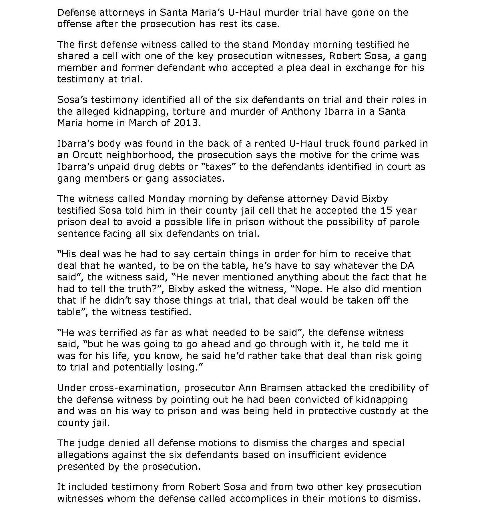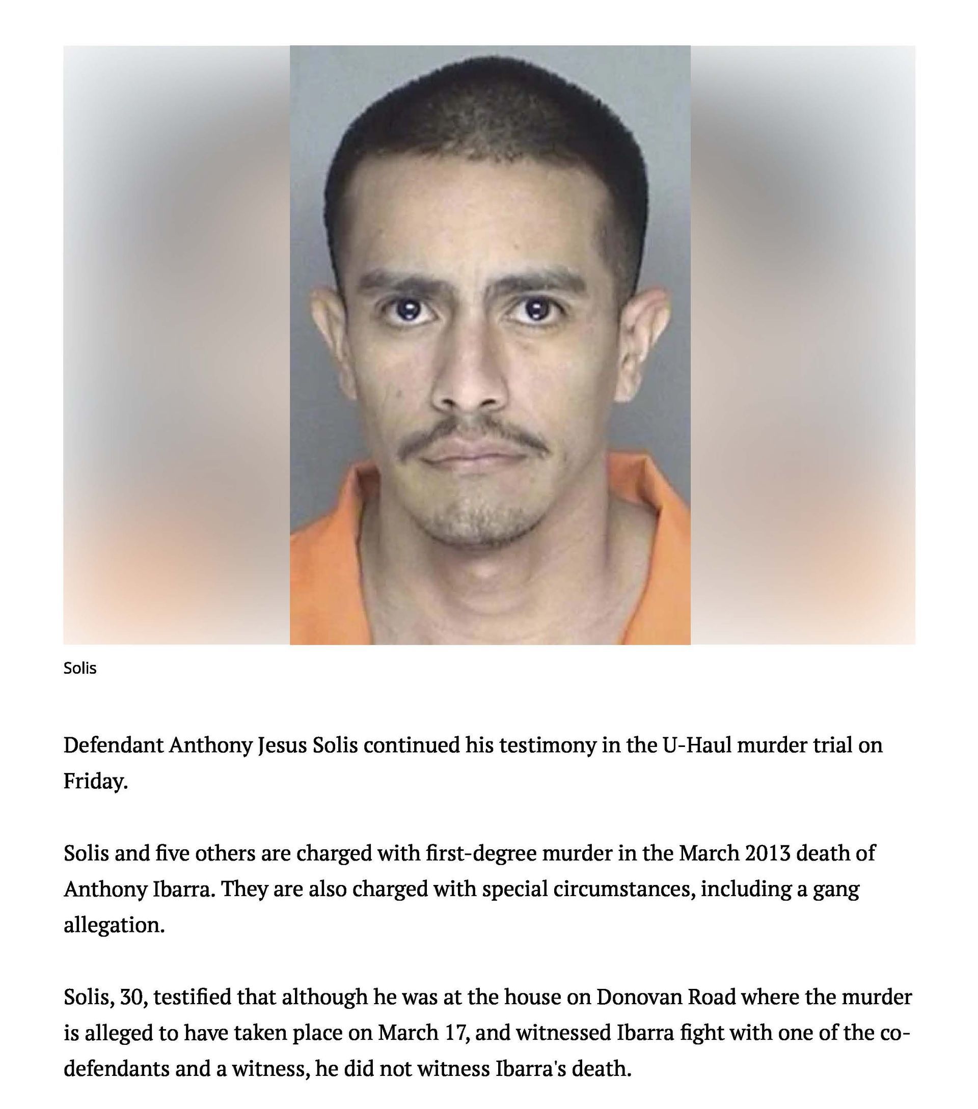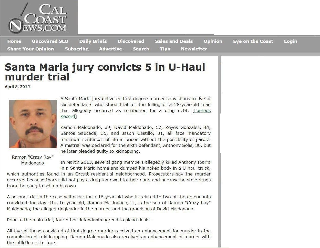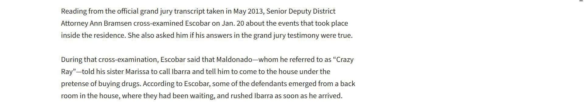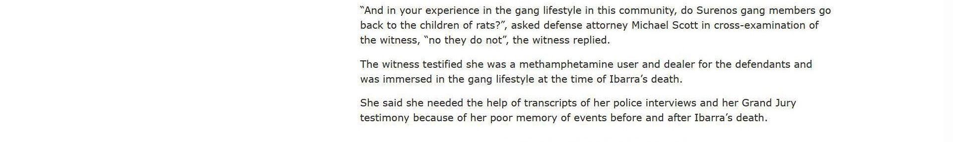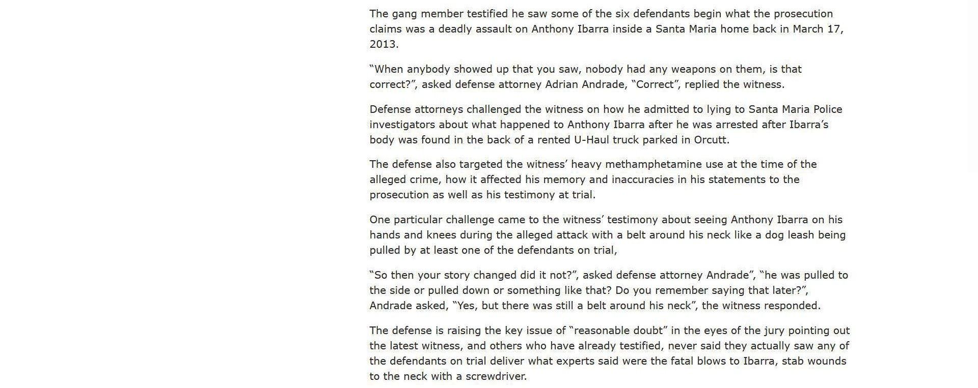 The district attorney's theory was that the decedent was a drug dealer, and that he had been scamming customers as well as not paying "taxes" to the Mexican Mafia. The district attorney believed that a co-defendant with the nickname (they said gang moniker) of Crazy Ray, had recruited a group to "check" (impose a punishment) on the decedent for both ripping off customers and for not paying a portion of his proceeds to the Mexican Mafia. The believed that the group then tortured the decedent to death, rented a U-Haul, put his body in the U-Haul and abandoned it. The incident occurred at a house that didn't belong to any of the people in the group with Crazy Ray. The house belonged to two people that testified as witnesses for the prosecution, Angel "Buddha" Escobar and his sister Marissa Escobar, who were put in the witness protection program. That means that the government paid to set the witnesses up with new lives in exchange for their snitch testimony. What the defense presented was that Crazy Ray and his group were at the house, but they had left and that it was in fact the district attorney's two witnesses that had killed the decedent, and that after the fact they called upon Crazy Ray to help with the aftermath. The defense was that he may have helped after the fact, but neither he nor anyone in his group did the killing. The defense that was presented was that various members of the group had come and gone from the house, but none were there when the murder occurred.