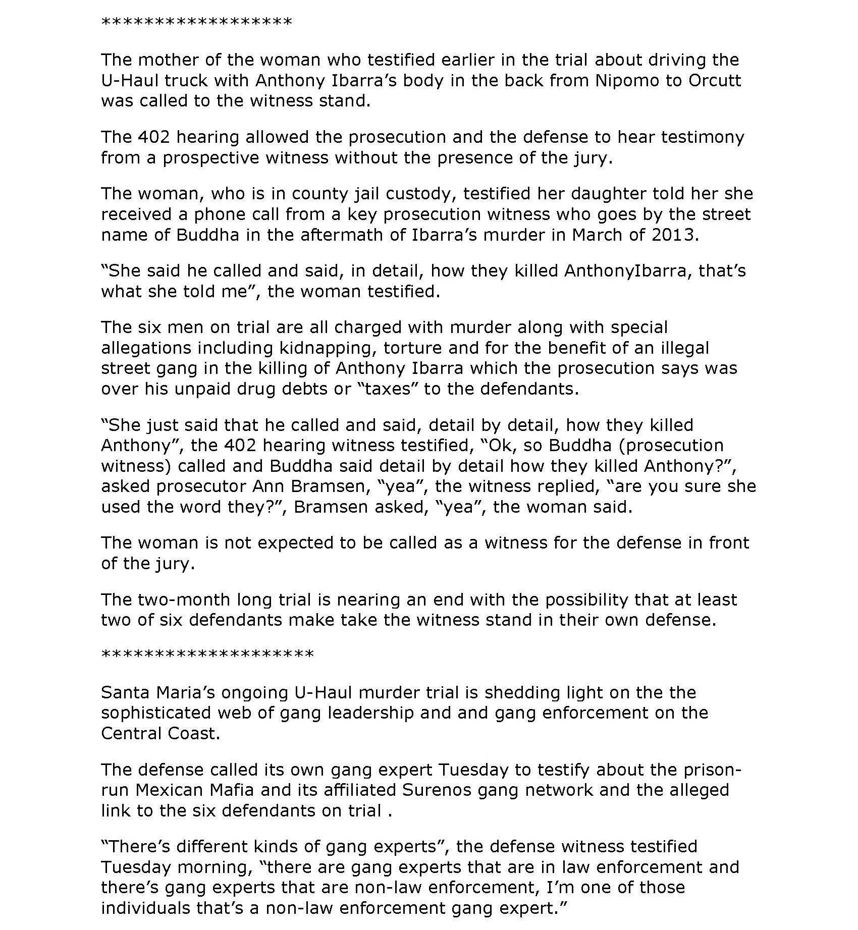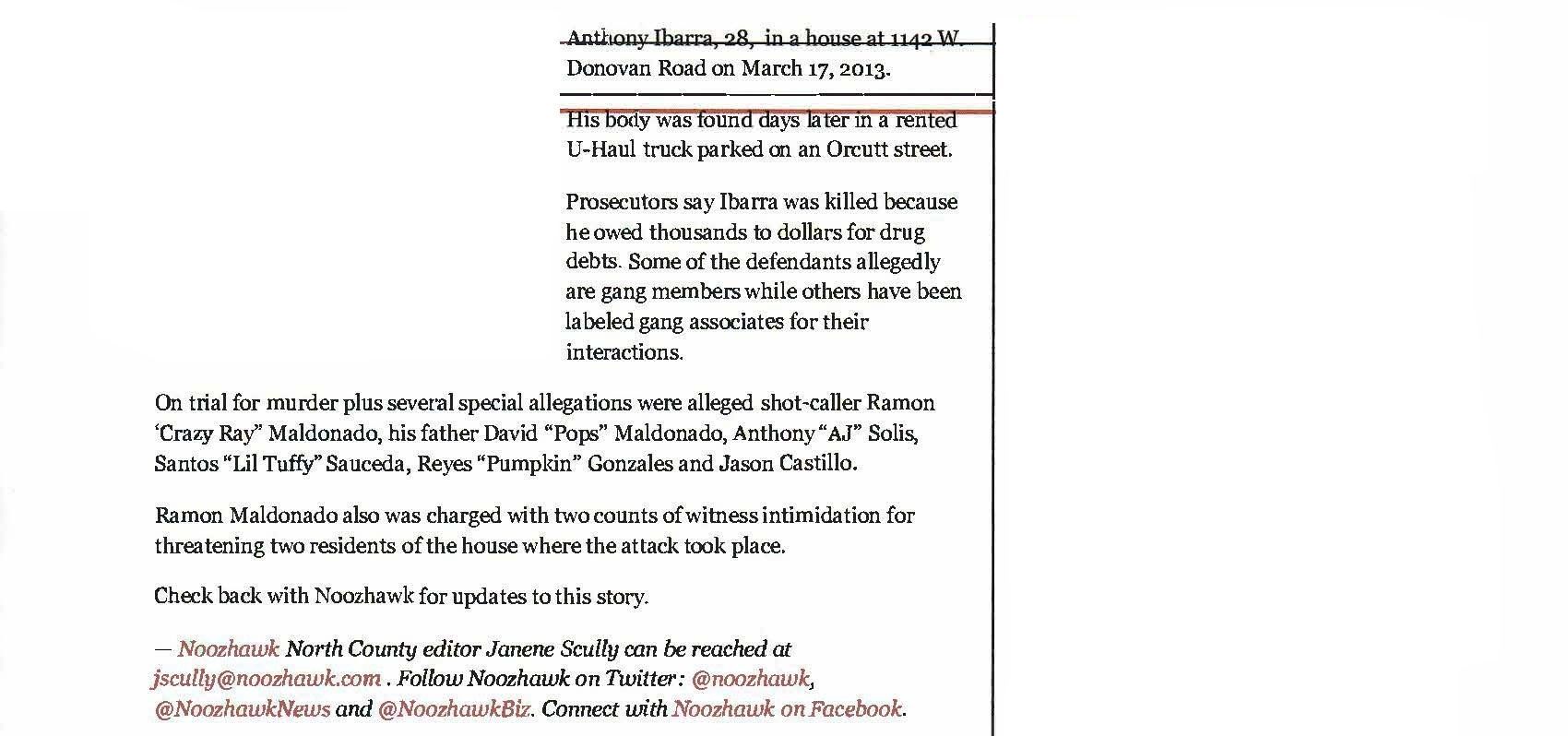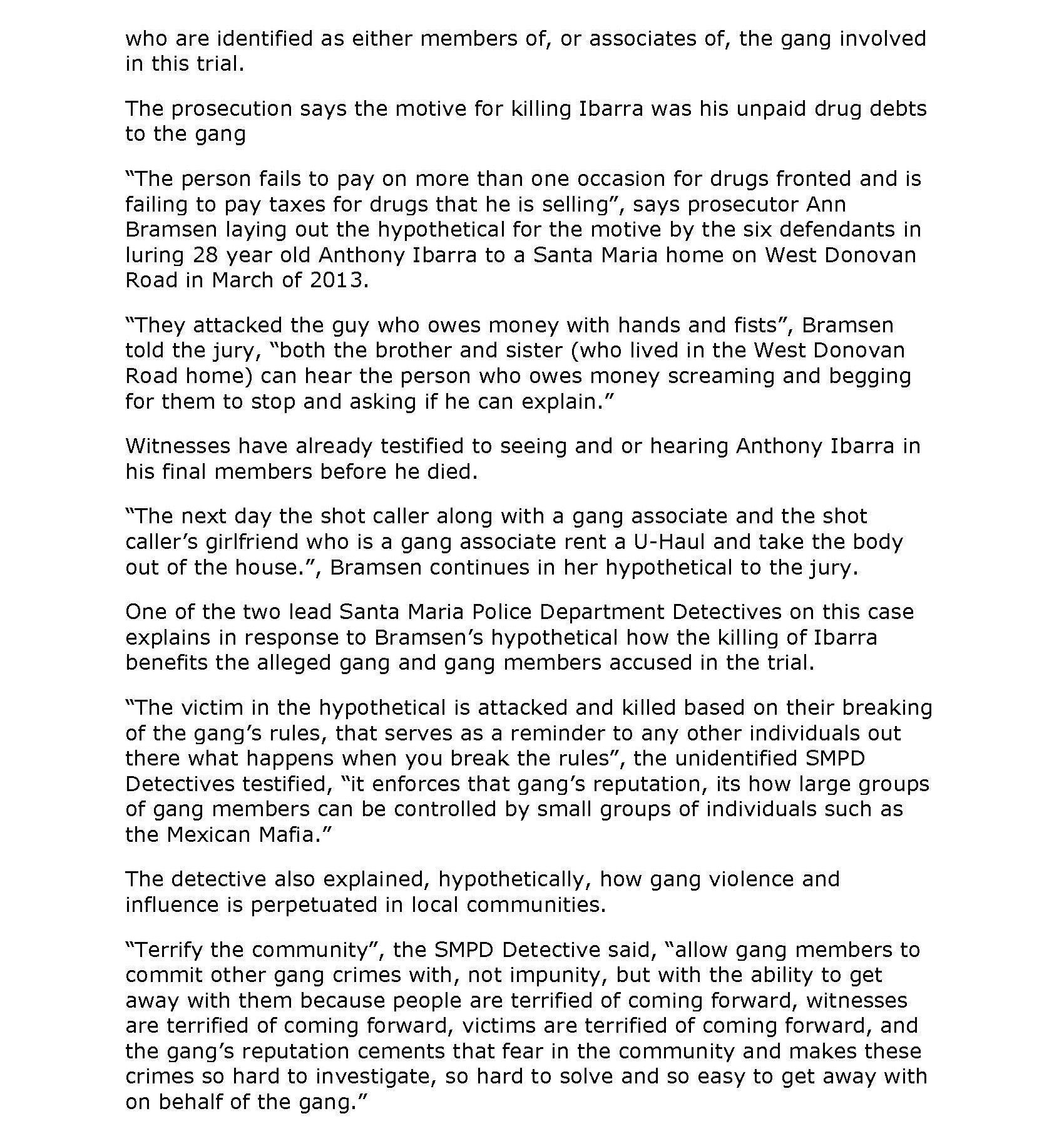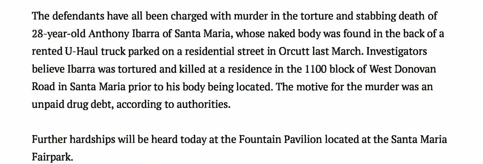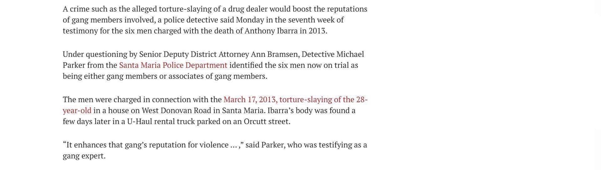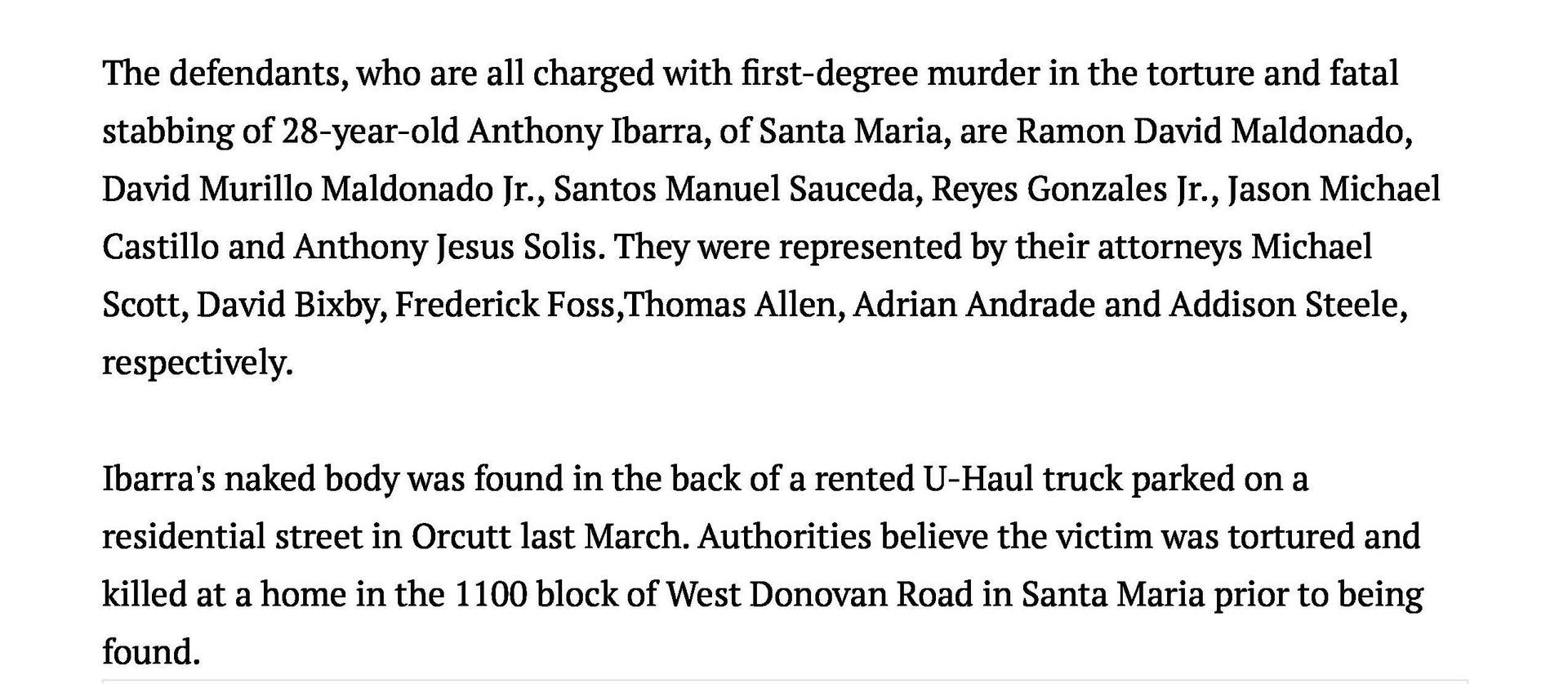 The district attorney's theory was that the decedent was a drug dealer, and that he had been scamming customers as well as not paying "taxes" to the Mexican Mafia. The district attorney believed that a co-defendant with the nickname (they said gang moniker) of Crazy Ray, had recruited a group to "check" (impose a punishment) on the decedent for both ripping off customers and for not paying a portion of his proceeds to the Mexican Mafia. The believed that the group then tortured the decedent to death, rented a U-Haul, put his body in the U-Haul and abandoned it. The incident occurred at a house that didn't belong to any of the people in the group with Crazy Ray. The house belonged to two people that testified as witnesses for the prosecution, Angel "Buddha" Escobar and his sister Marissa Escobar, who were put in the witness protection program. That means that the government paid to set the witnesses up with new lives in exchange for their snitch testimony. What the defense presented was that Crazy Ray and his group were at the house, but they had left and that it was in fact the district attorney's two witnesses that had killed the decedent, and that after the fact they called upon Crazy Ray to help with the aftermath. The defense was that he may have helped after the fact, but neither he nor anyone in his group did the killing. The defense that was presented was that various members of the group had come and gone from the house, but none were there when the murder occurred.