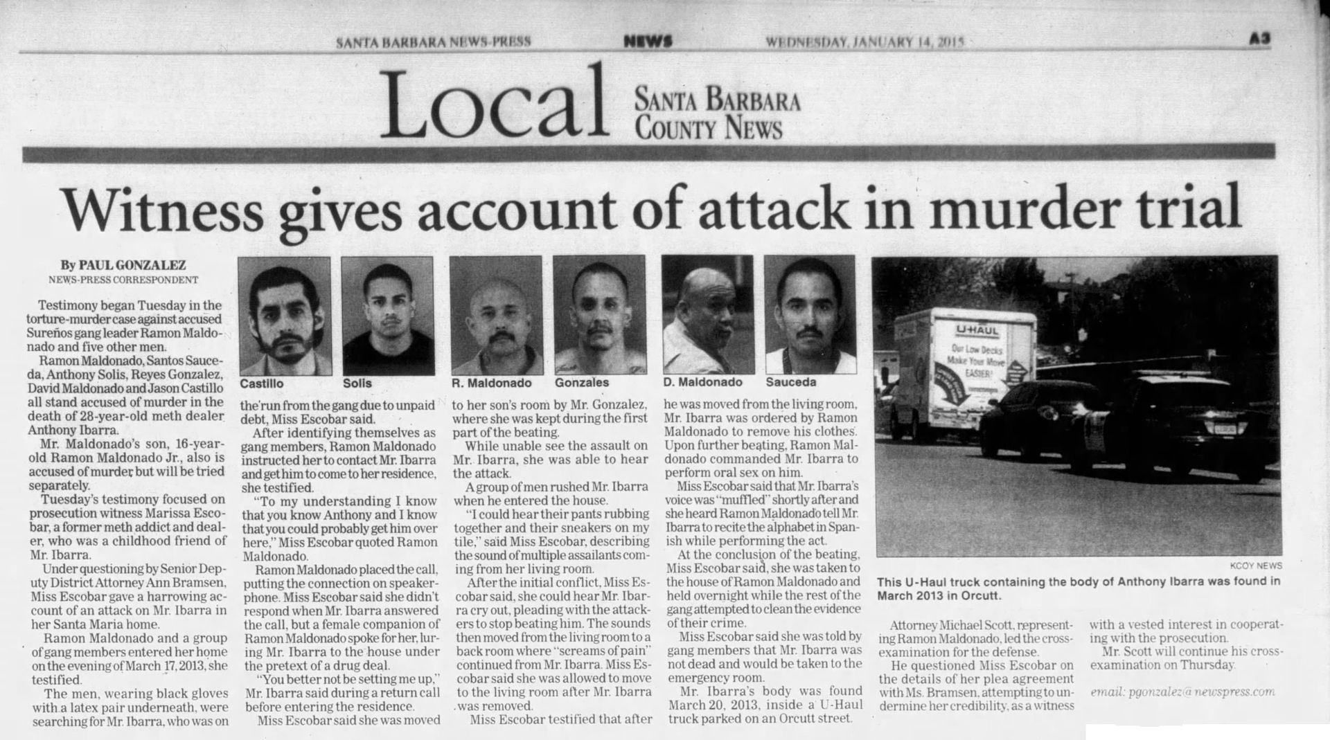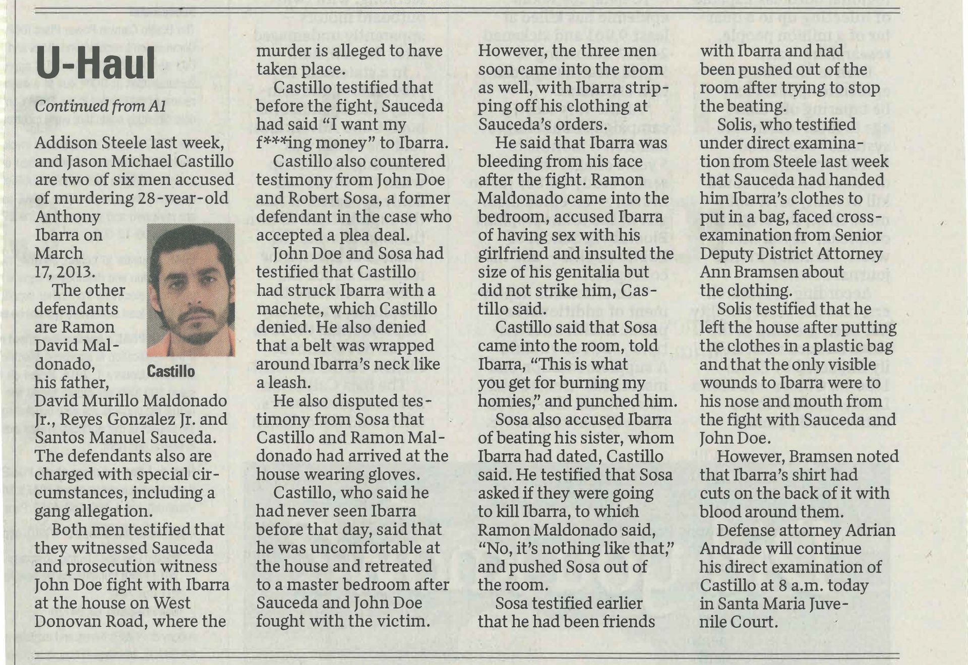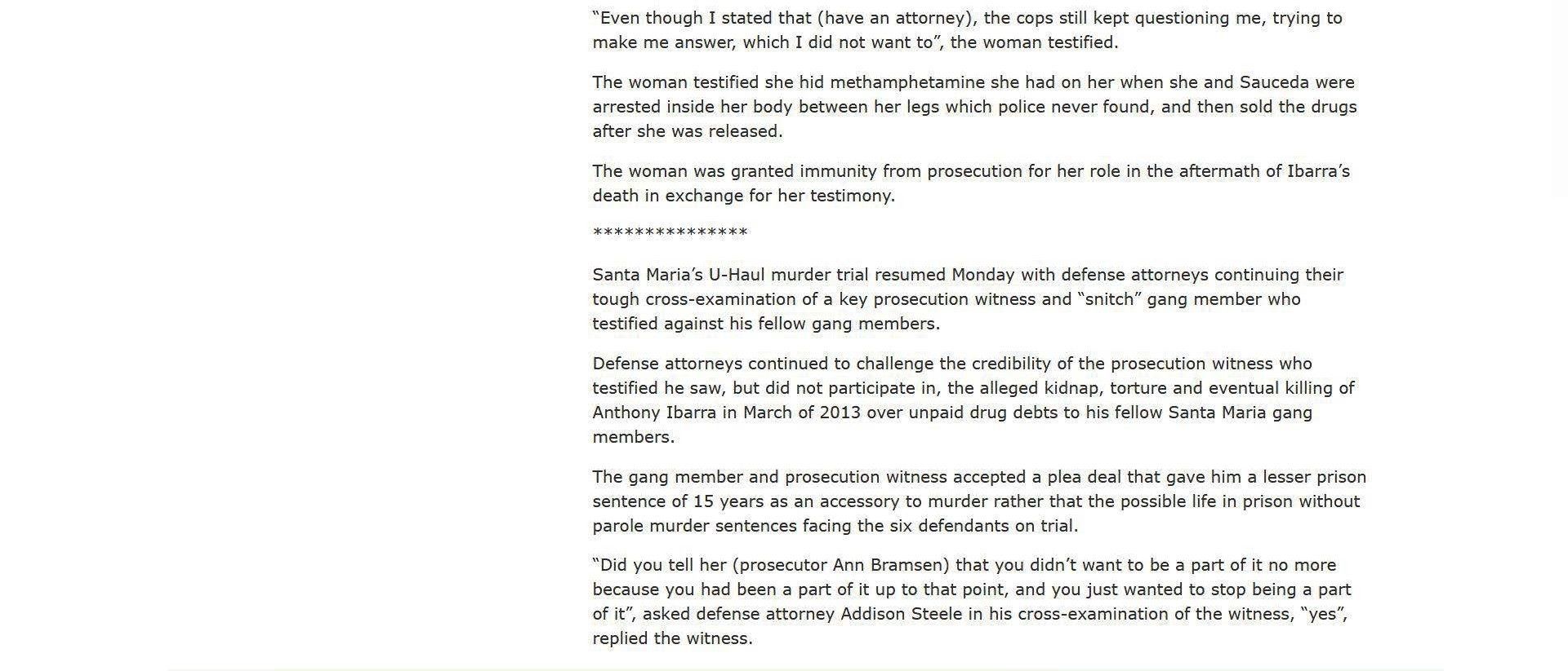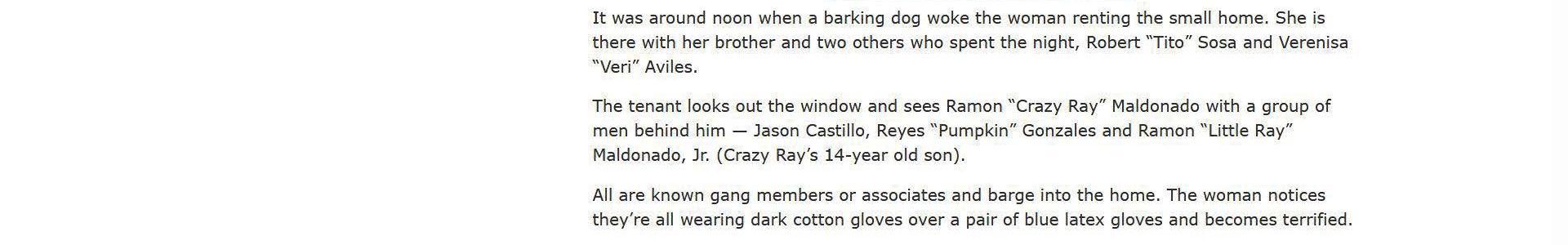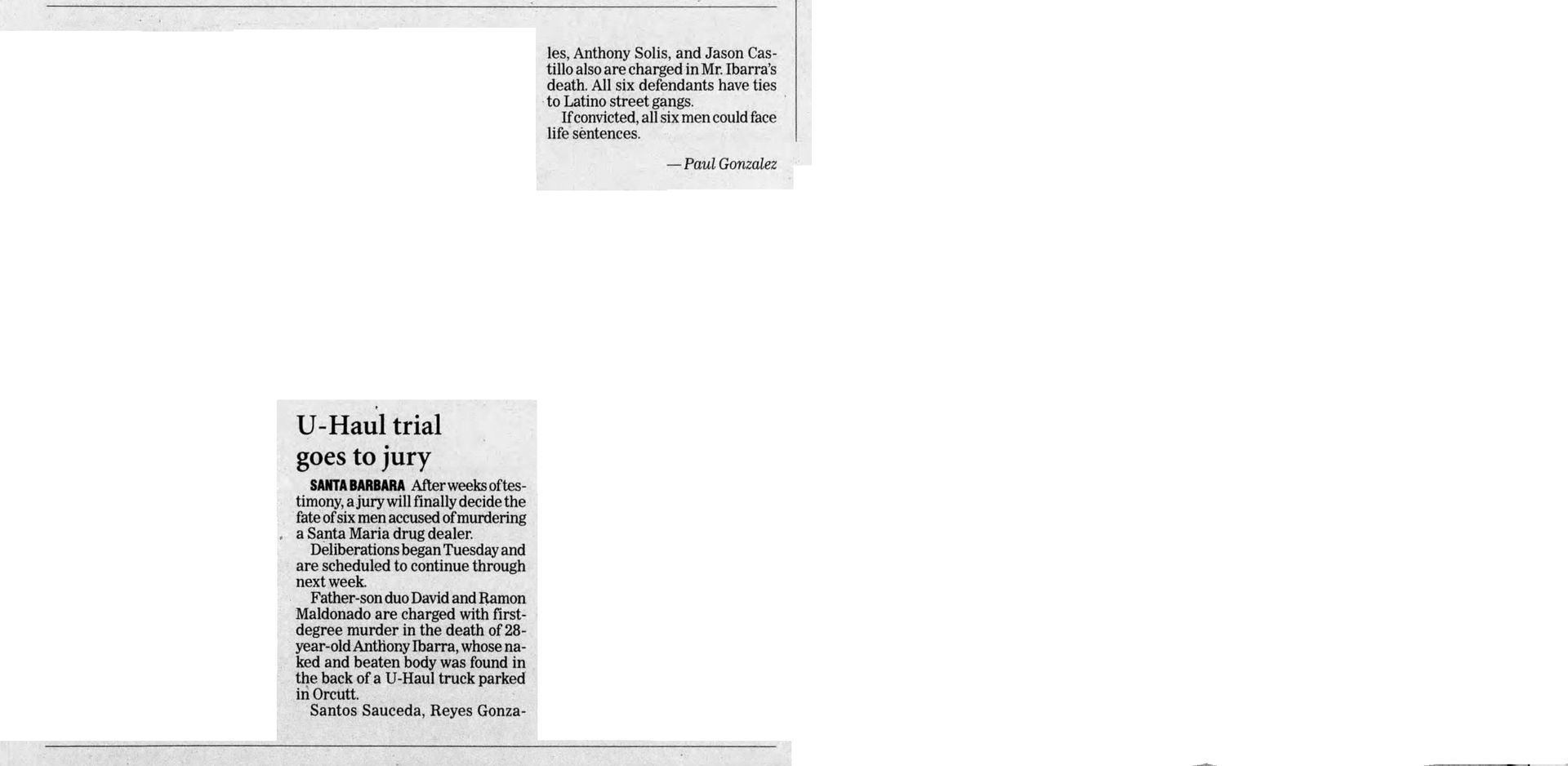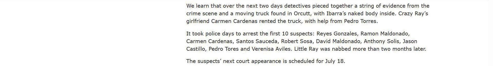 The district attorney's theory was that the decedent was a drug dealer, and that he had been scamming customers as well as not paying "taxes" to the Mexican Mafia. The district attorney believed that a co-defendant with the nickname (they said gang moniker) of Crazy Ray, had recruited a group to "check" (impose a punishment) on the decedent for both ripping off customers and for not paying a portion of his proceeds to the Mexican Mafia. The believed that the group then tortured the decedent to death, rented a U-Haul, put his body in the U-Haul and abandoned it. The incident occurred at a house that didn't belong to any of the people in the group with Crazy Ray. The house belonged to two people that testified as witnesses for the prosecution, Angel "Buddha" Escobar and his sister Marissa Escobar, who were put in the witness protection program. That means that the government paid to set the witnesses up with new lives in exchange for their snitch testimony. What the defense presented was that Crazy Ray and his group were at the house, but they had left and that it was in fact the district attorney's two witnesses that had killed the decedent, and that after the fact they called upon Crazy Ray to help with the aftermath. The defense was that he may have helped after the fact, but neither he nor anyone in his group did the killing. The defense that was presented was that various members of the group had come and gone from the house, but none were there when the murder occurred.