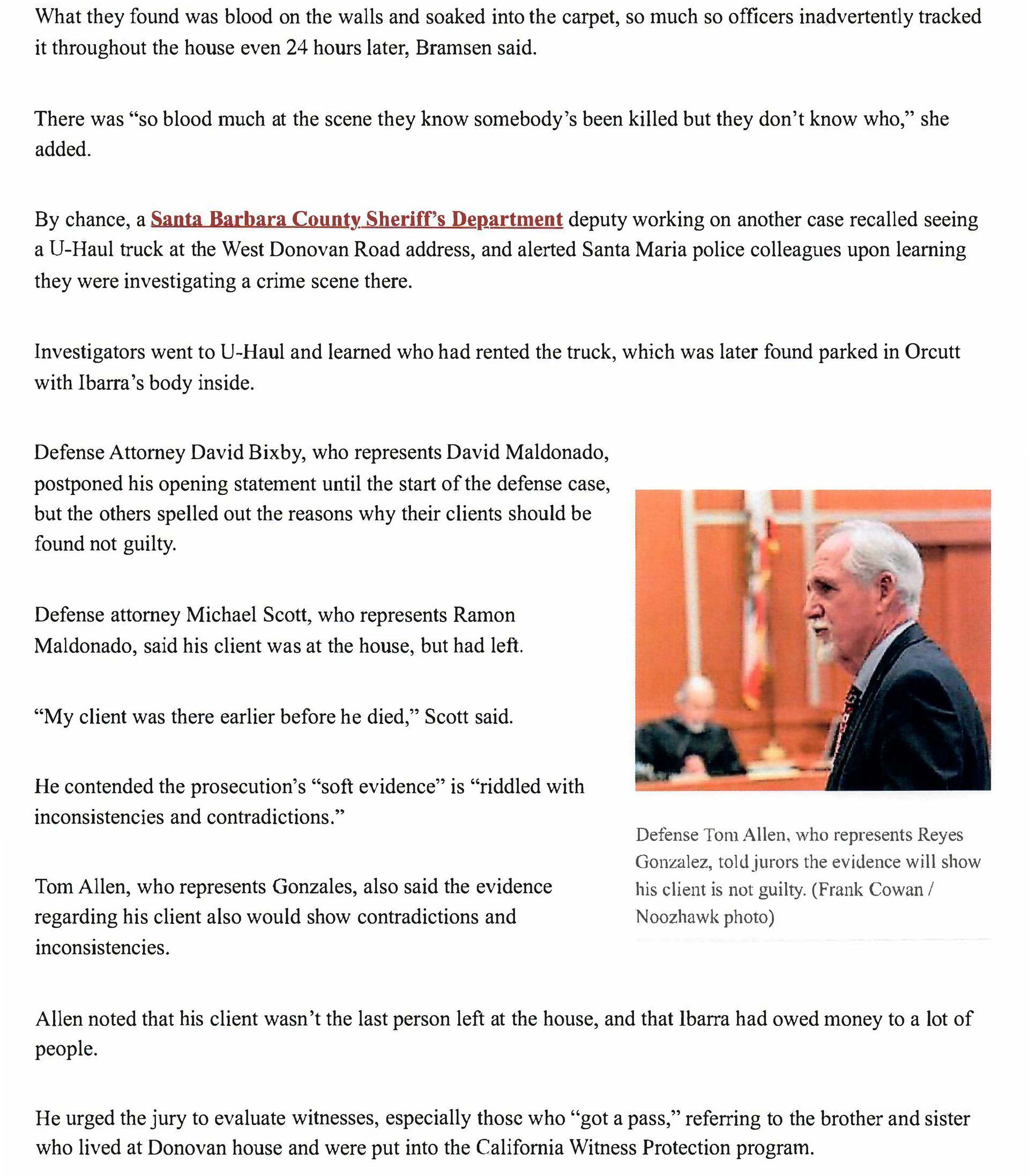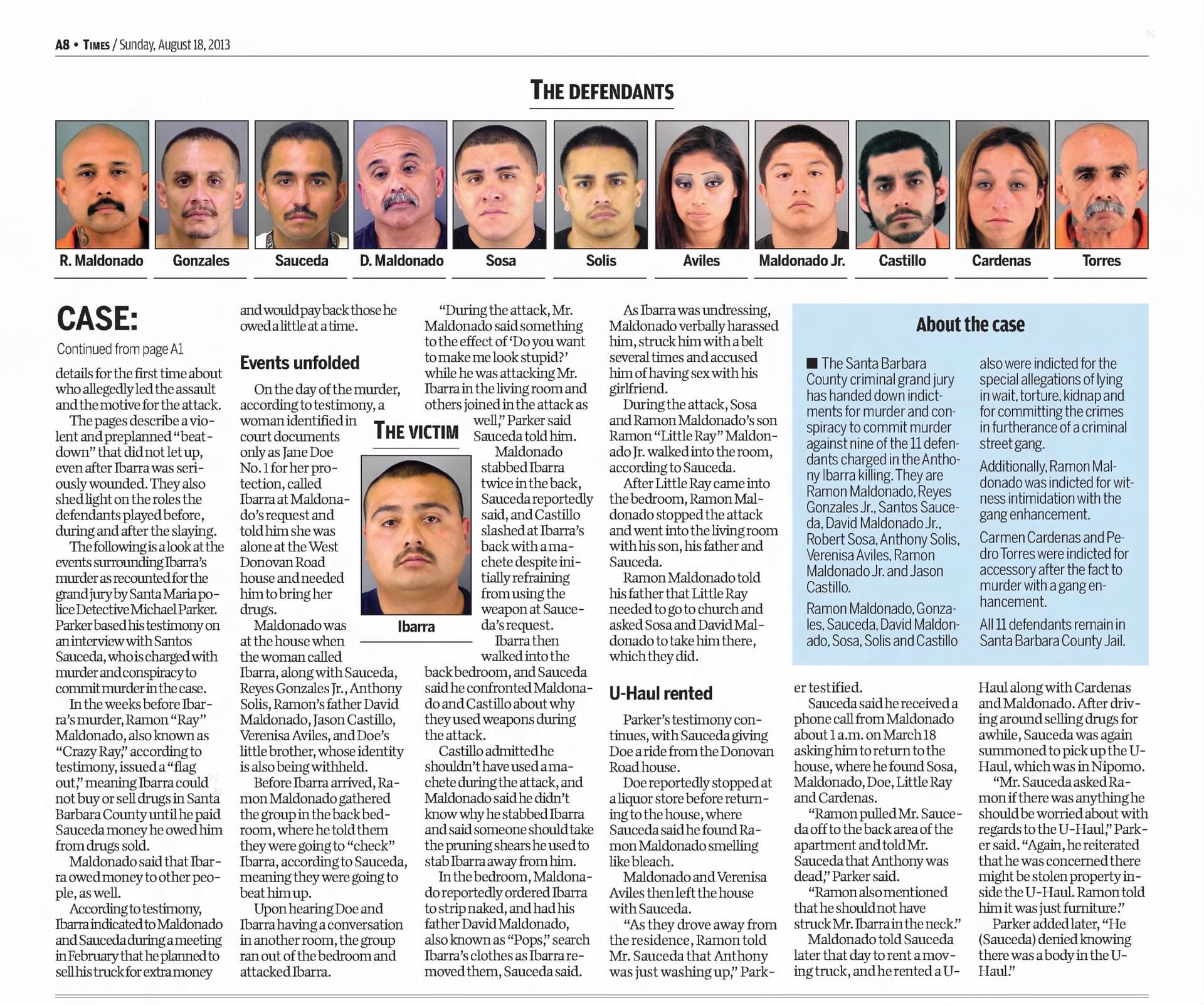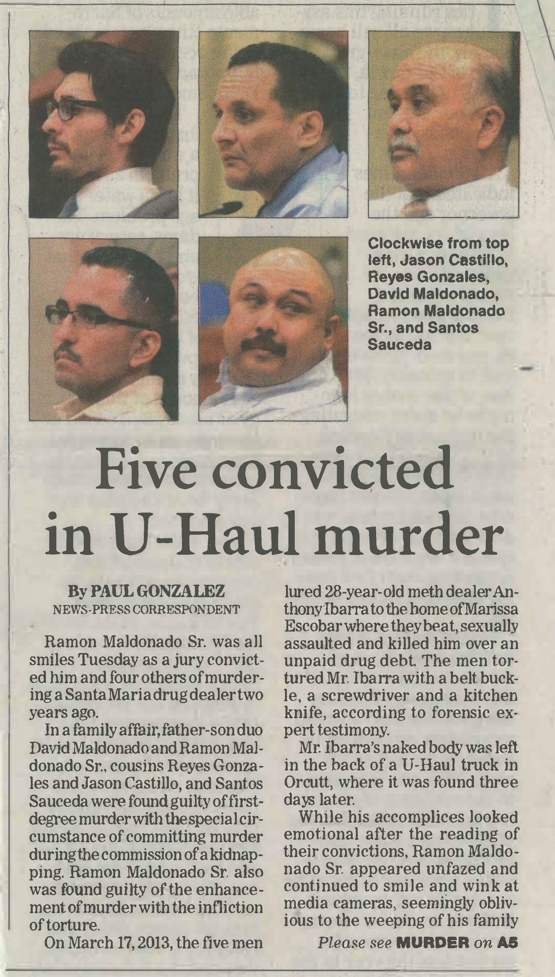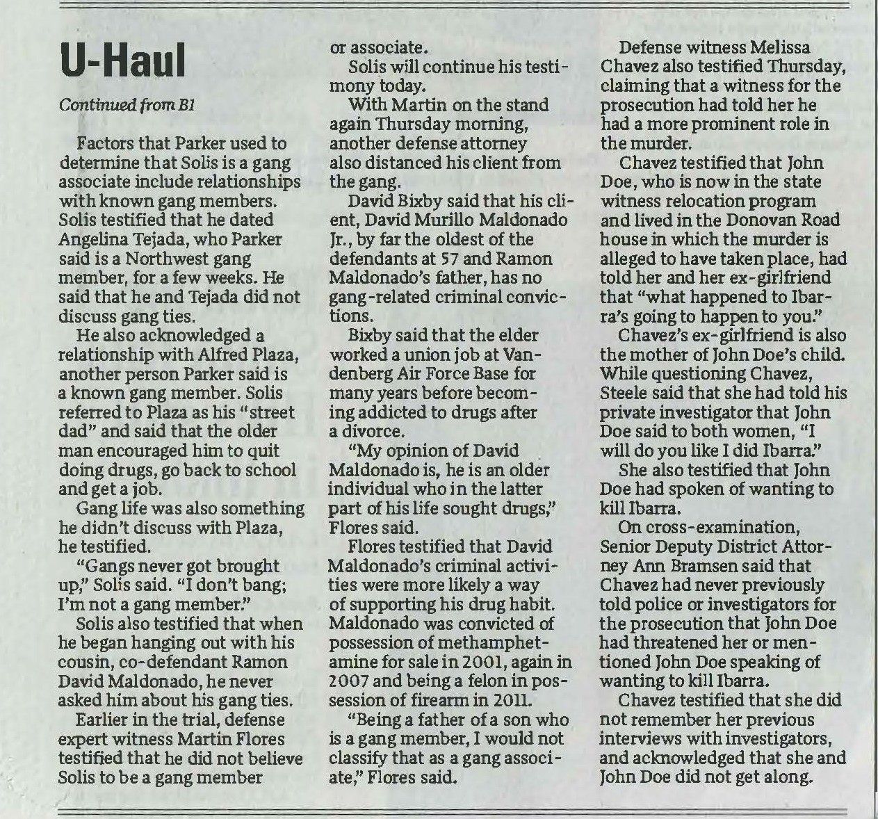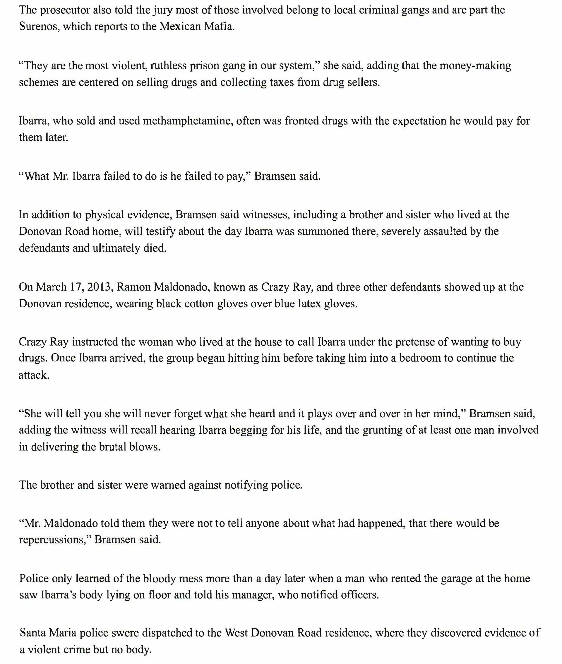 The district attorney's theory was that the decedent was a drug dealer, and that he had been scamming customers as well as not paying "taxes" to the Mexican Mafia. The district attorney believed that a co-defendant with the nickname (they said gang moniker) of Crazy Ray, had recruited a group to "check" (impose a punishment) on the decedent for both ripping off customers and for not paying a portion of his proceeds to the Mexican Mafia. The believed that the group then tortured the decedent to death, rented a U-Haul, put his body in the U-Haul and abandoned it. The incident occurred at a house that didn't belong to any of the people in the group with Crazy Ray. The house belonged to two people that testified as witnesses for the prosecution, Angel "Buddha" Escobar and his sister Marissa Escobar, who were put in the witness protection program. That means that the government paid to set the witnesses up with new lives in exchange for their snitch testimony. What the defense presented was that Crazy Ray and his group were at the house, but they had left and that it was in fact the district attorney's two witnesses that had killed the decedent, and that after the fact they called upon Crazy Ray to help with the aftermath. The defense was that he may have helped after the fact, but neither he nor anyone in his group did the killing. The defense that was presented was that various members of the group had come and gone from the house, but none were there when the murder occurred.
