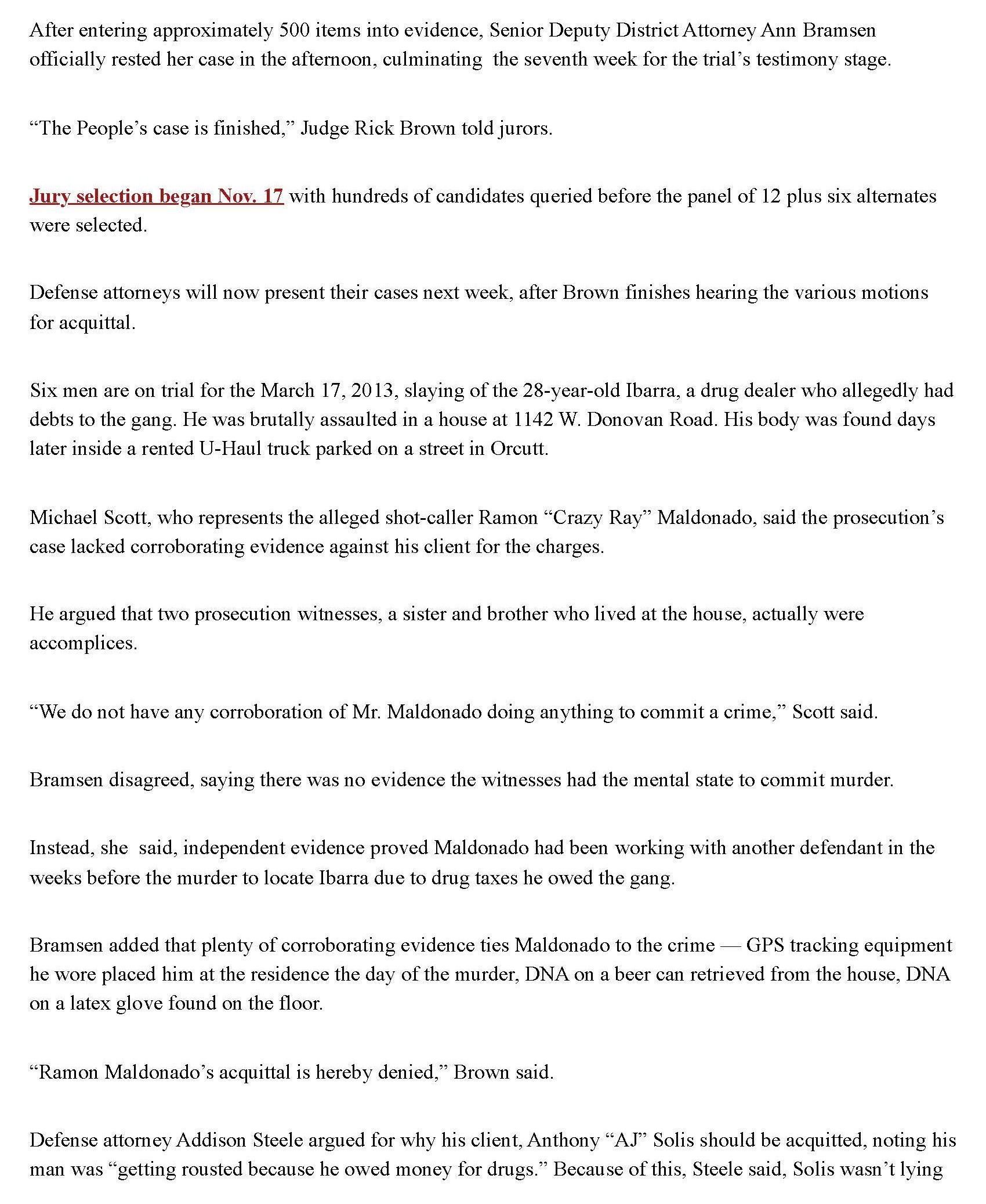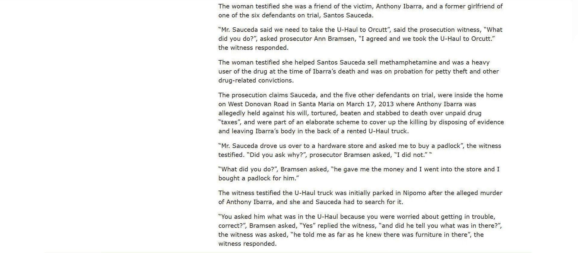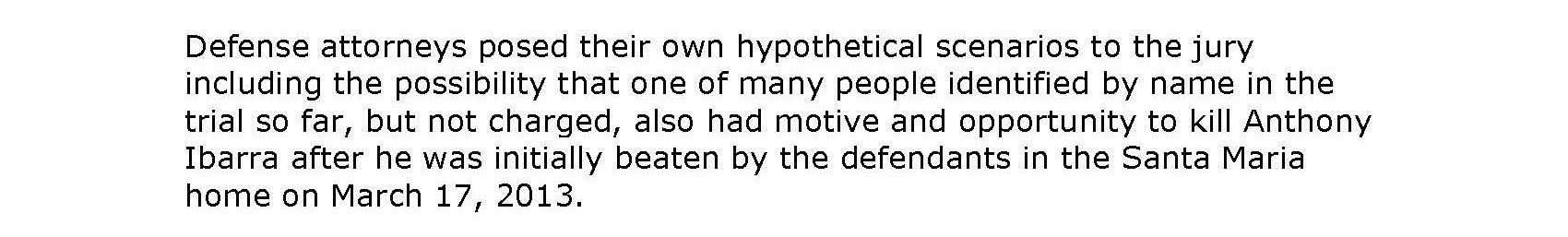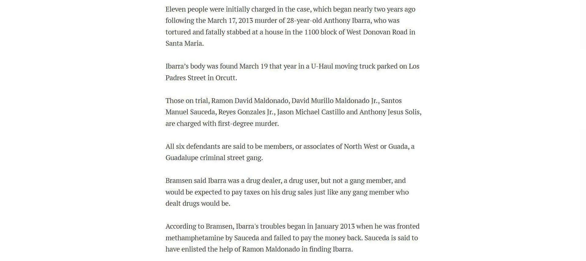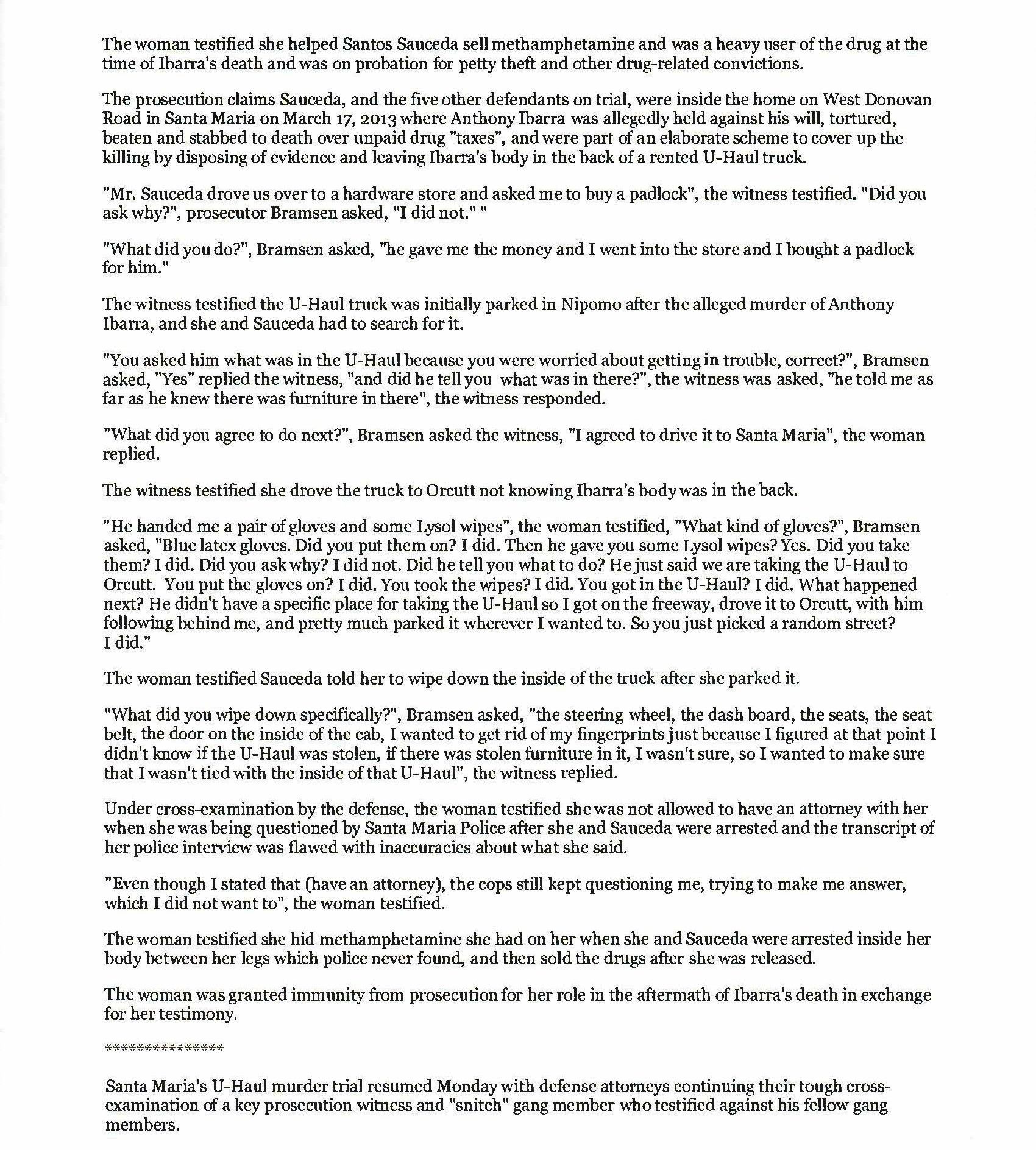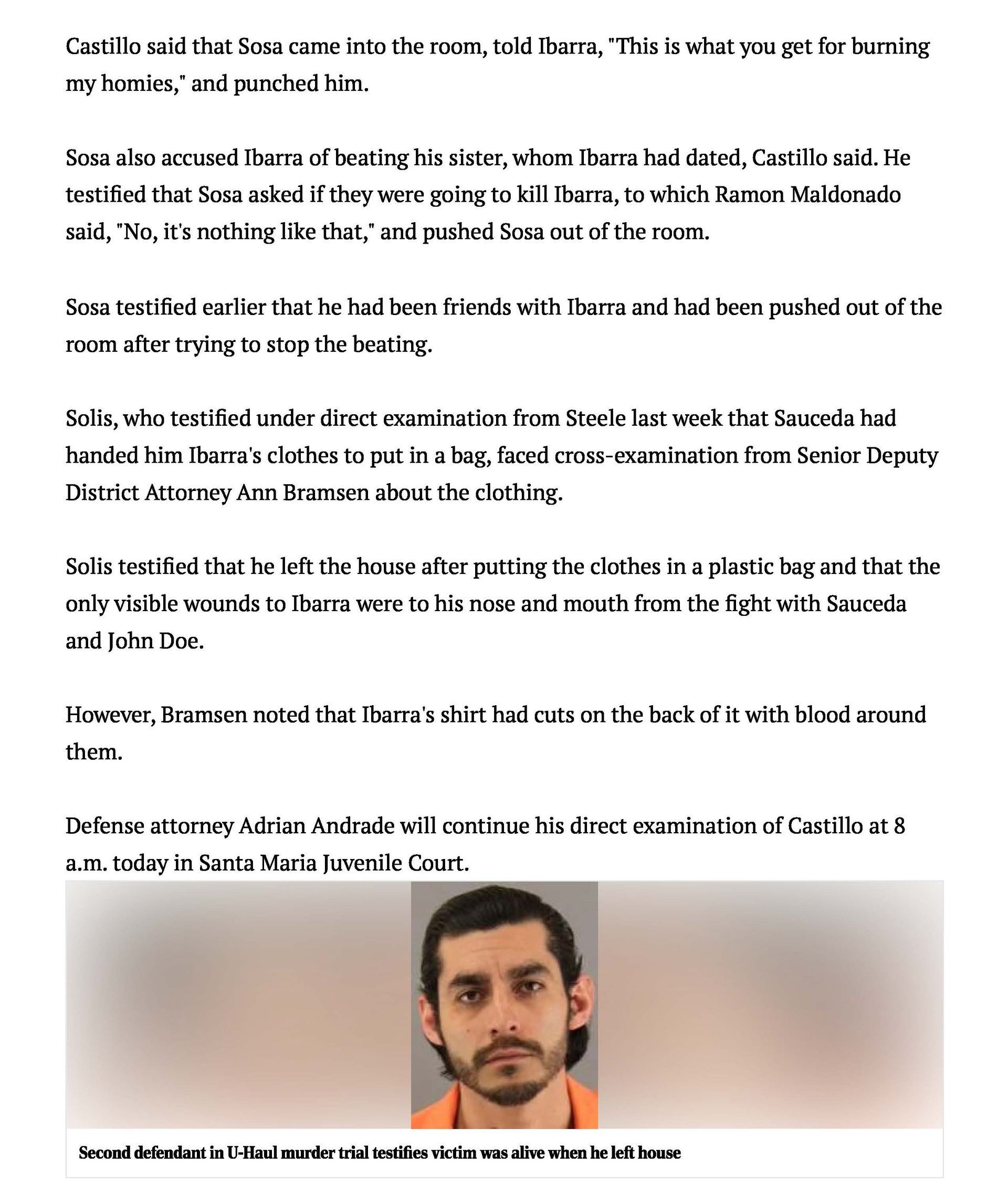 The district attorney's theory was that the decedent was a drug dealer, and that he had been scamming customers as well as not paying "taxes" to the Mexican Mafia. The district attorney believed that a co-defendant with the nickname (they said gang moniker) of Crazy Ray, had recruited a group to "check" (impose a punishment) on the decedent for both ripping off customers and for not paying a portion of his proceeds to the Mexican Mafia. The believed that the group then tortured the decedent to death, rented a U-Haul, put his body in the U-Haul and abandoned it. The incident occurred at a house that didn't belong to any of the people in the group with Crazy Ray. The house belonged to two people that testified as witnesses for the prosecution, Angel "Buddha" Escobar and his sister Marissa Escobar, who were put in the witness protection program. That means that the government paid to set the witnesses up with new lives in exchange for their snitch testimony. What the defense presented was that Crazy Ray and his group were at the house, but they had left and that it was in fact the district attorney's two witnesses that had killed the decedent, and that after the fact they called upon Crazy Ray to help with the aftermath. The defense was that he may have helped after the fact, but neither he nor anyone in his group did the killing. The defense that was presented was that various members of the group had come and gone from the house, but none were there when the murder occurred.