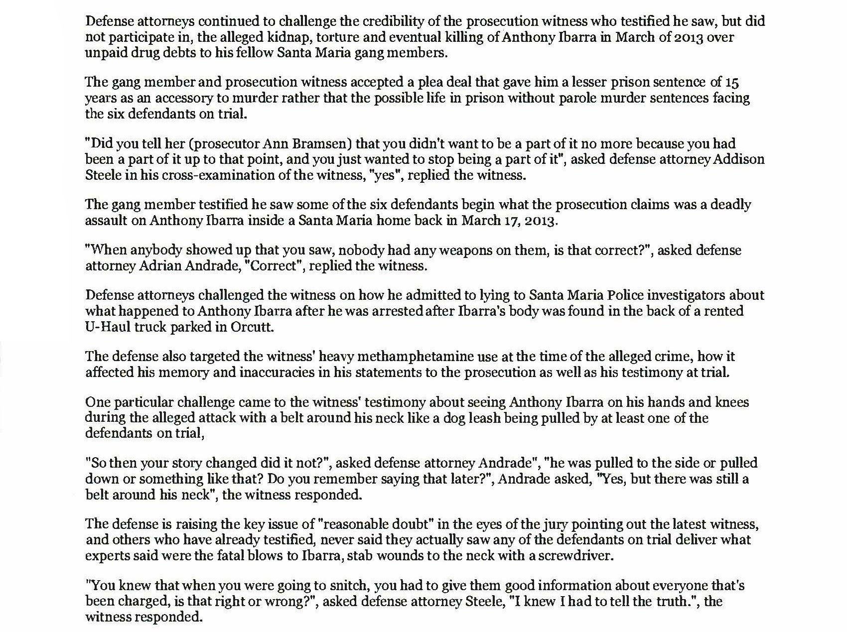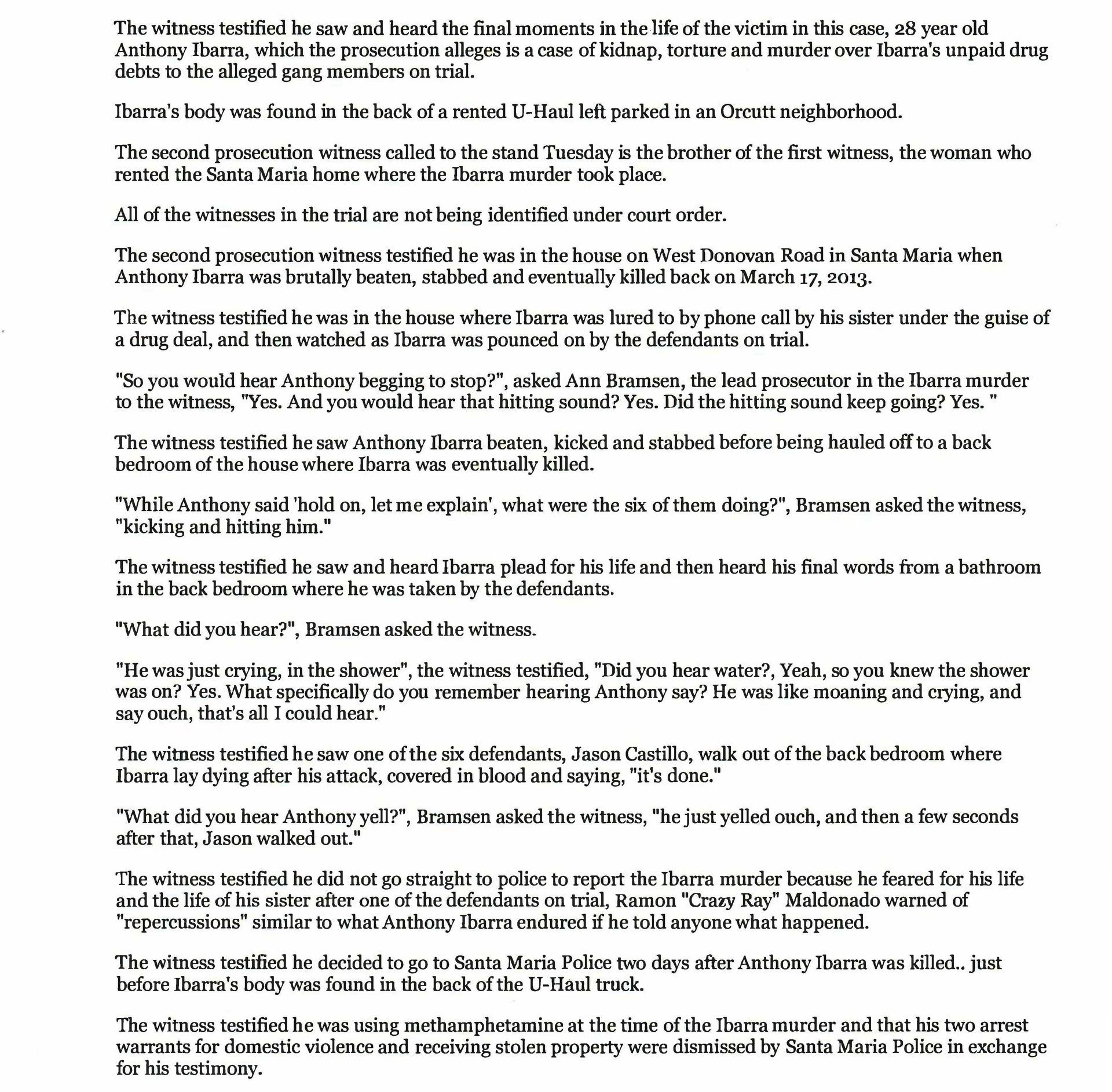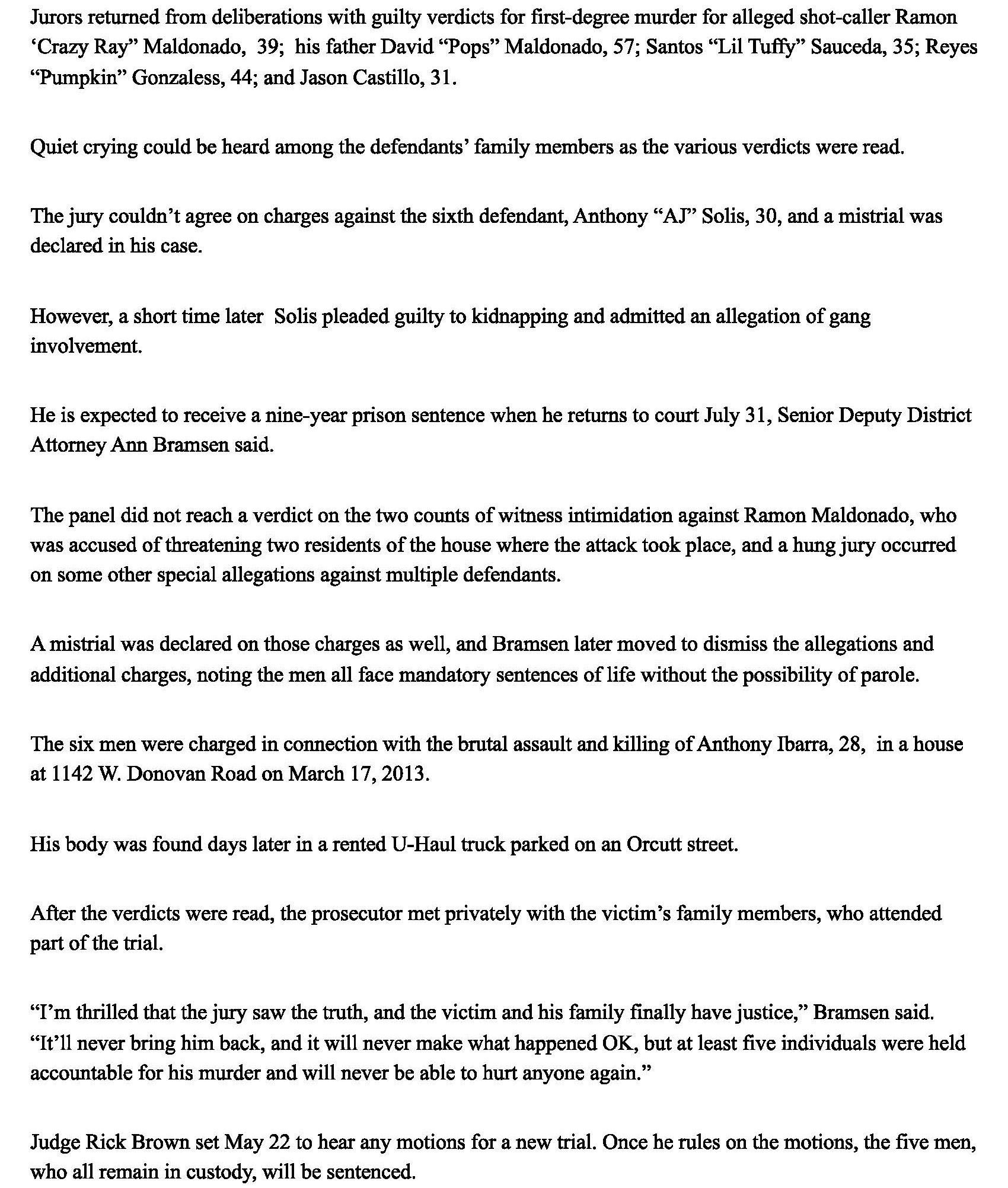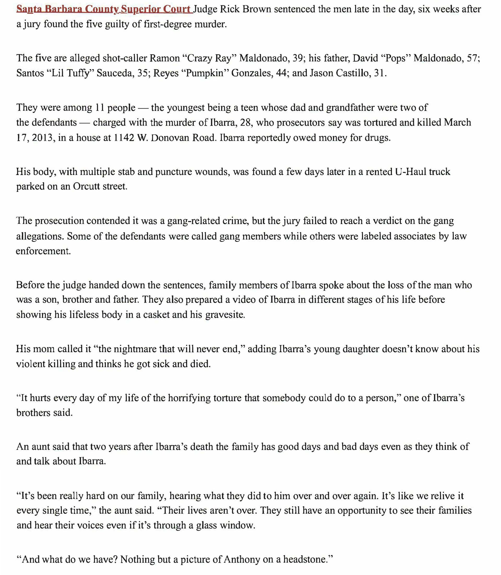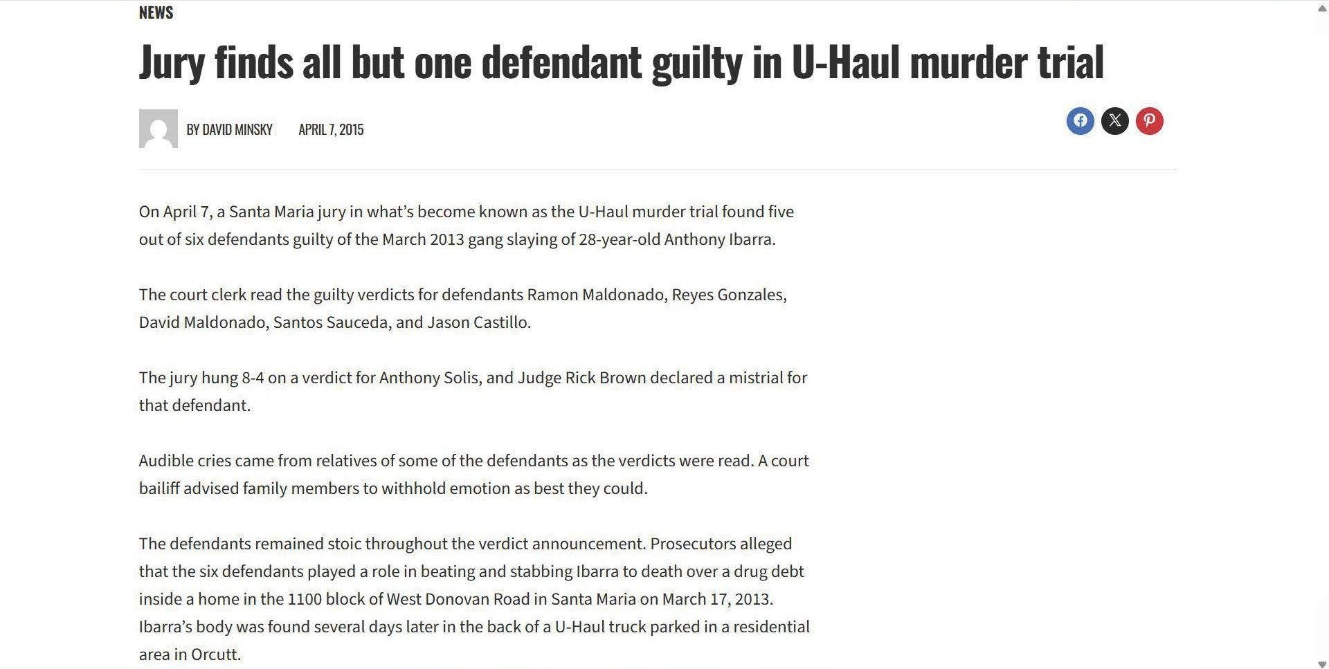 The district attorney's theory was that the decedent was a drug dealer, and that he had been scamming customers as well as not paying "taxes" to the Mexican Mafia. The district attorney believed that a co-defendant with the nickname (they said gang moniker) of Crazy Ray, had recruited a group to "check" (impose a punishment) on the decedent for both ripping off customers and for not paying a portion of his proceeds to the Mexican Mafia. The believed that the group then tortured the decedent to death, rented a U-Haul, put his body in the U-Haul and abandoned it. The incident occurred at a house that didn't belong to any of the people in the group with Crazy Ray. The house belonged to two people that testified as witnesses for the prosecution, Angel "Buddha" Escobar and his sister Marissa Escobar, who were put in the witness protection program. That means that the government paid to set the witnesses up with new lives in exchange for their snitch testimony. What the defense presented was that Crazy Ray and his group were at the house, but they had left and that it was in fact the district attorney's two witnesses that had killed the decedent, and that after the fact they called upon Crazy Ray to help with the aftermath. The defense was that he may have helped after the fact, but neither he nor anyone in his group did the killing. The defense that was presented was that various members of the group had come and gone from the house, but none were there when the murder occurred.