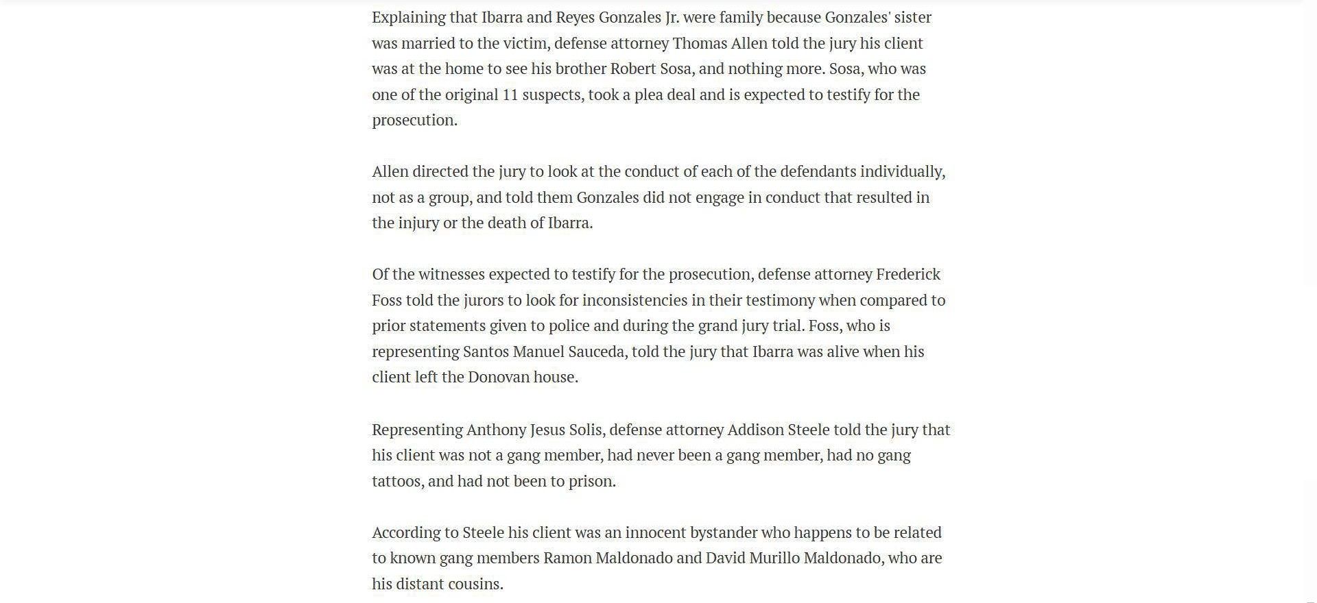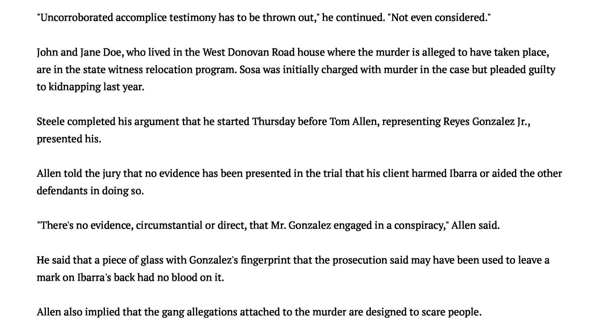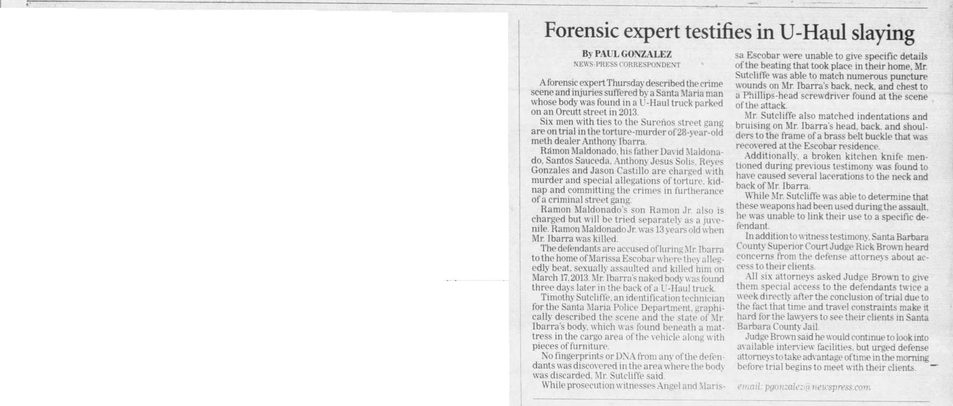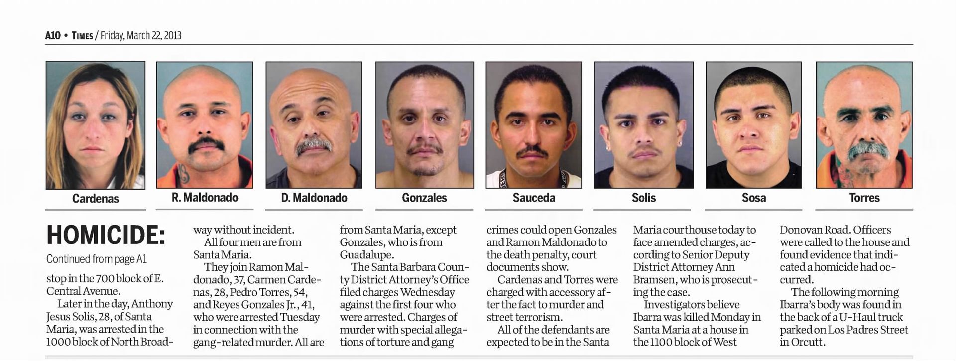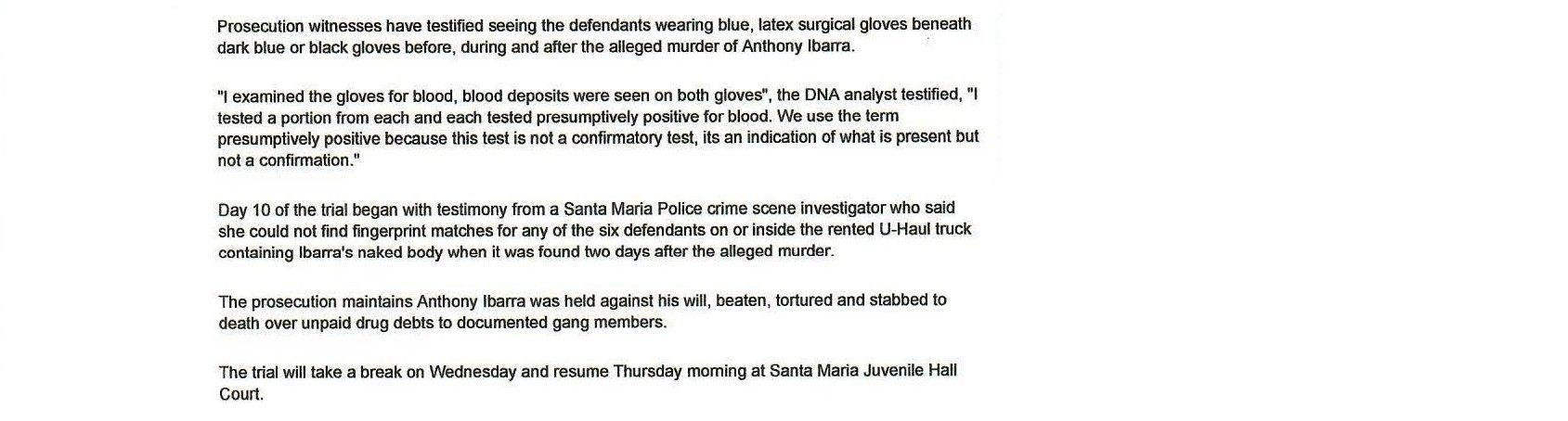 The district attorney's theory was that the decedent was a drug dealer, and that he had been scamming customers as well as not paying "taxes" to the Mexican Mafia. The district attorney believed that a co-defendant with the nickname (they said gang moniker) of Crazy Ray, had recruited a group to "check" (impose a punishment) on the decedent for both ripping off customers and for not paying a portion of his proceeds to the Mexican Mafia. The believed that the group then tortured the decedent to death, rented a U-Haul, put his body in the U-Haul and abandoned it. The incident occurred at a house that didn't belong to any of the people in the group with Crazy Ray. The house belonged to two people that testified as witnesses for the prosecution, Angel "Buddha" Escobar and his sister Marissa Escobar, who were put in the witness protection program. That means that the government paid to set the witnesses up with new lives in exchange for their snitch testimony. What the defense presented was that Crazy Ray and his group were at the house, but they had left and that it was in fact the district attorney's two witnesses that had killed the decedent, and that after the fact they called upon Crazy Ray to help with the aftermath. The defense was that he may have helped after the fact, but neither he nor anyone in his group did the killing. The defense that was presented was that various members of the group had come and gone from the house, but none were there when the murder occurred.