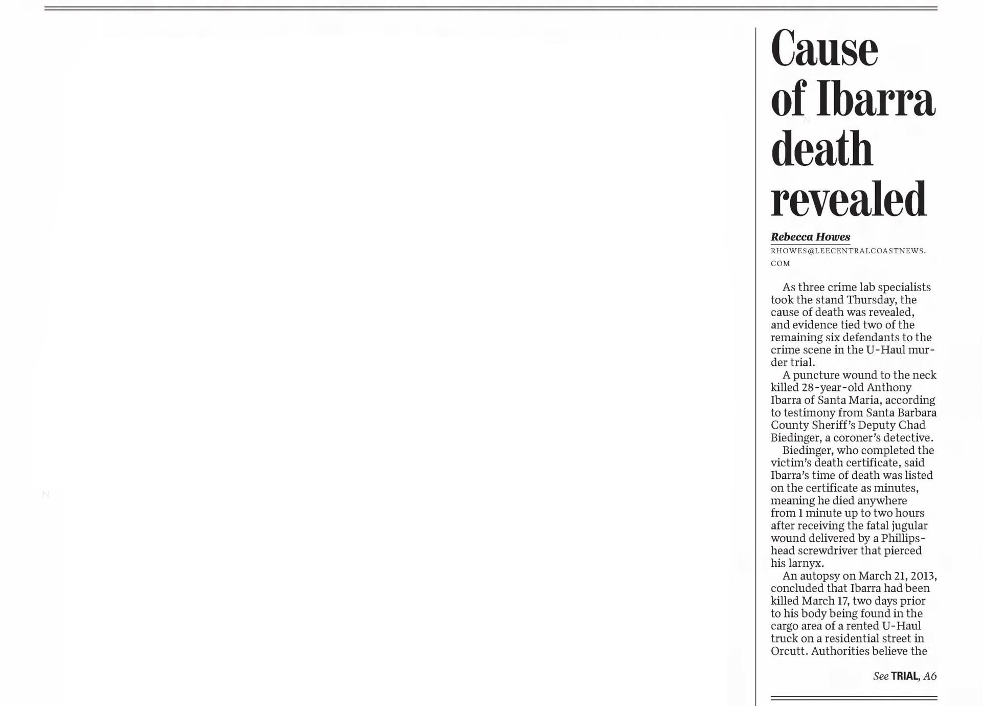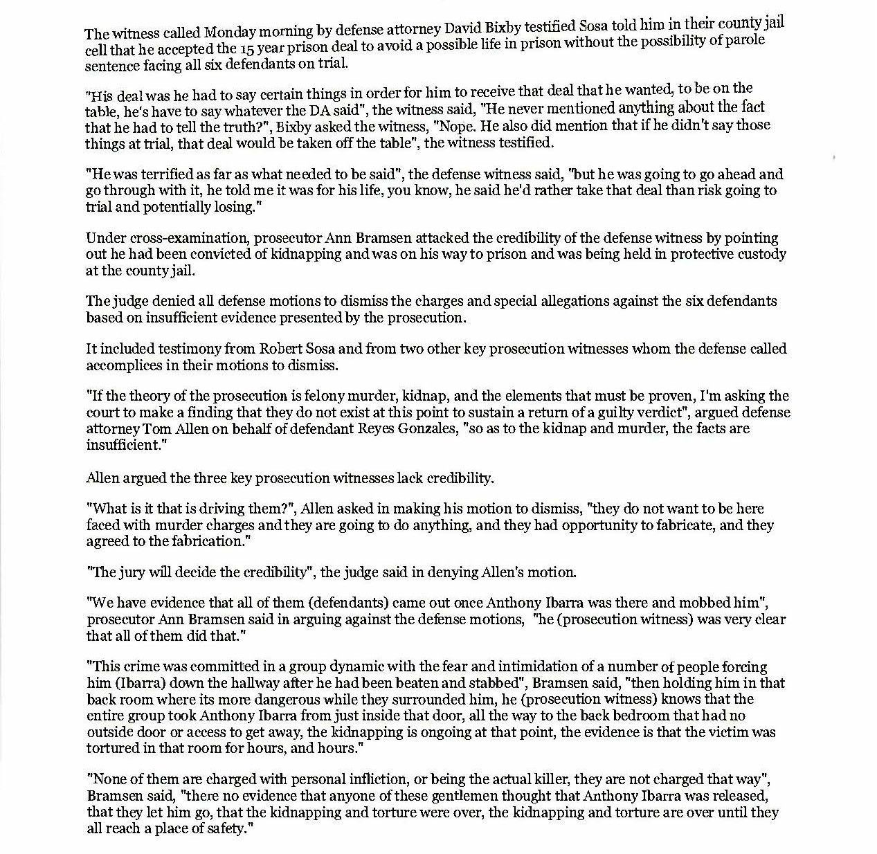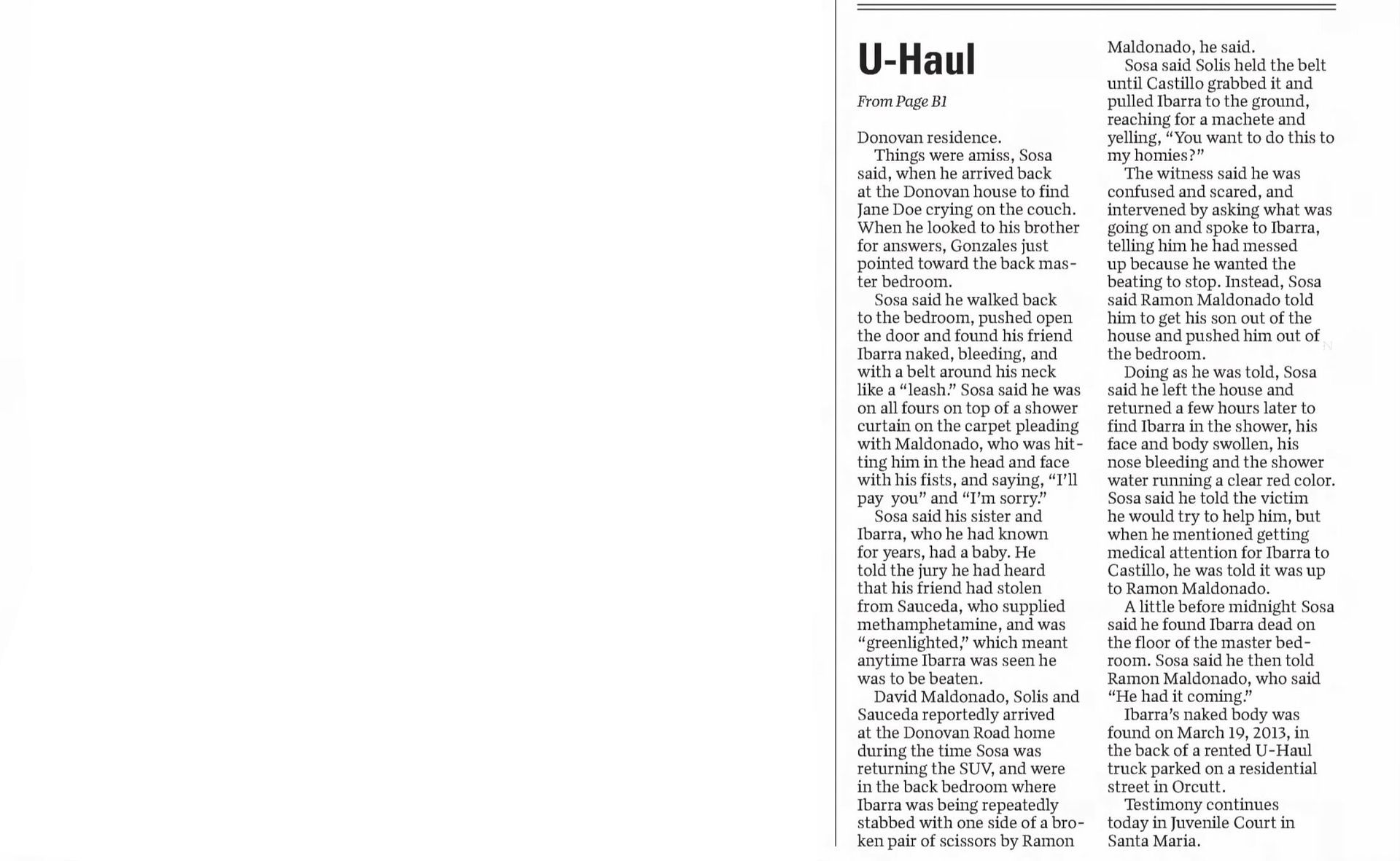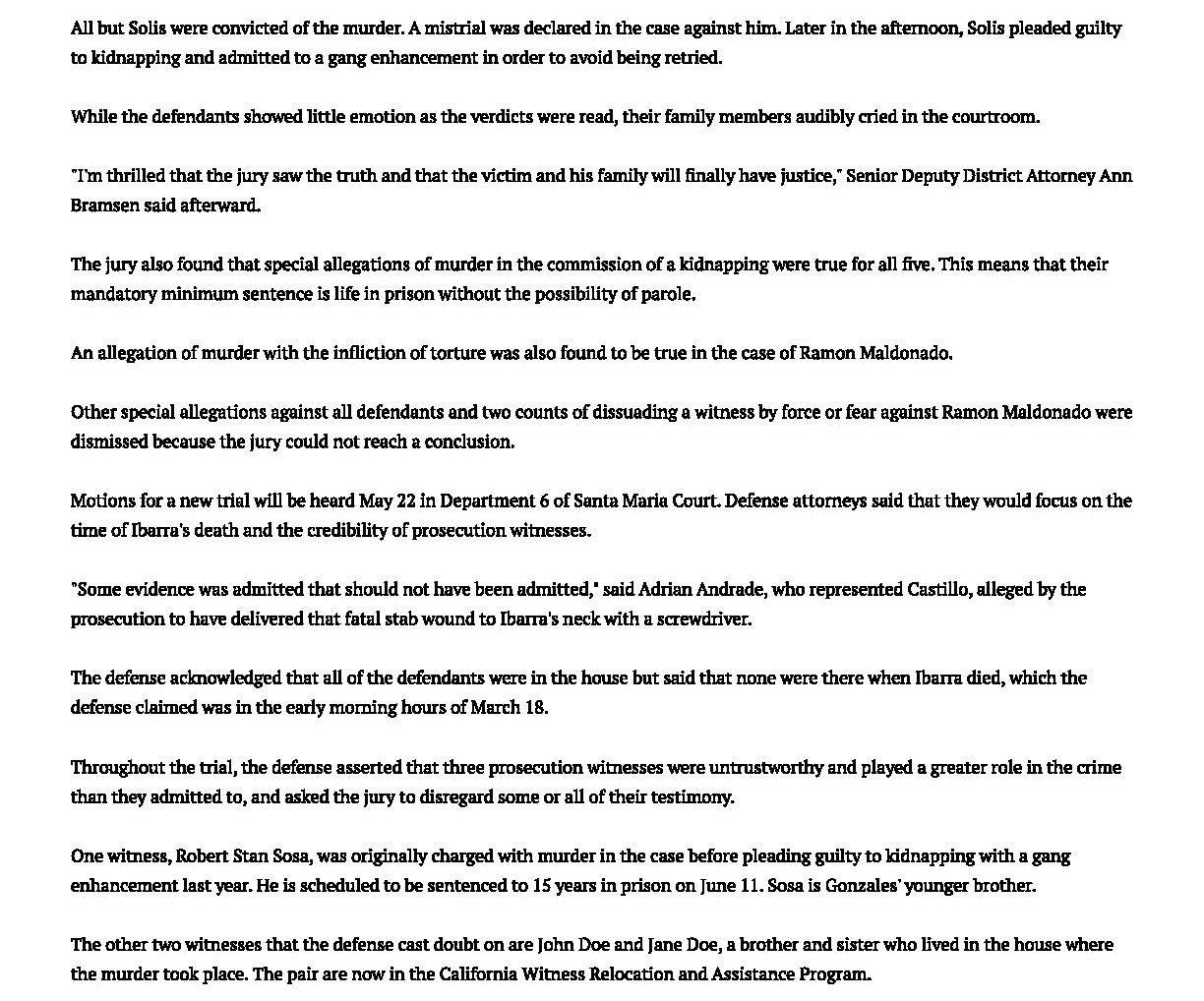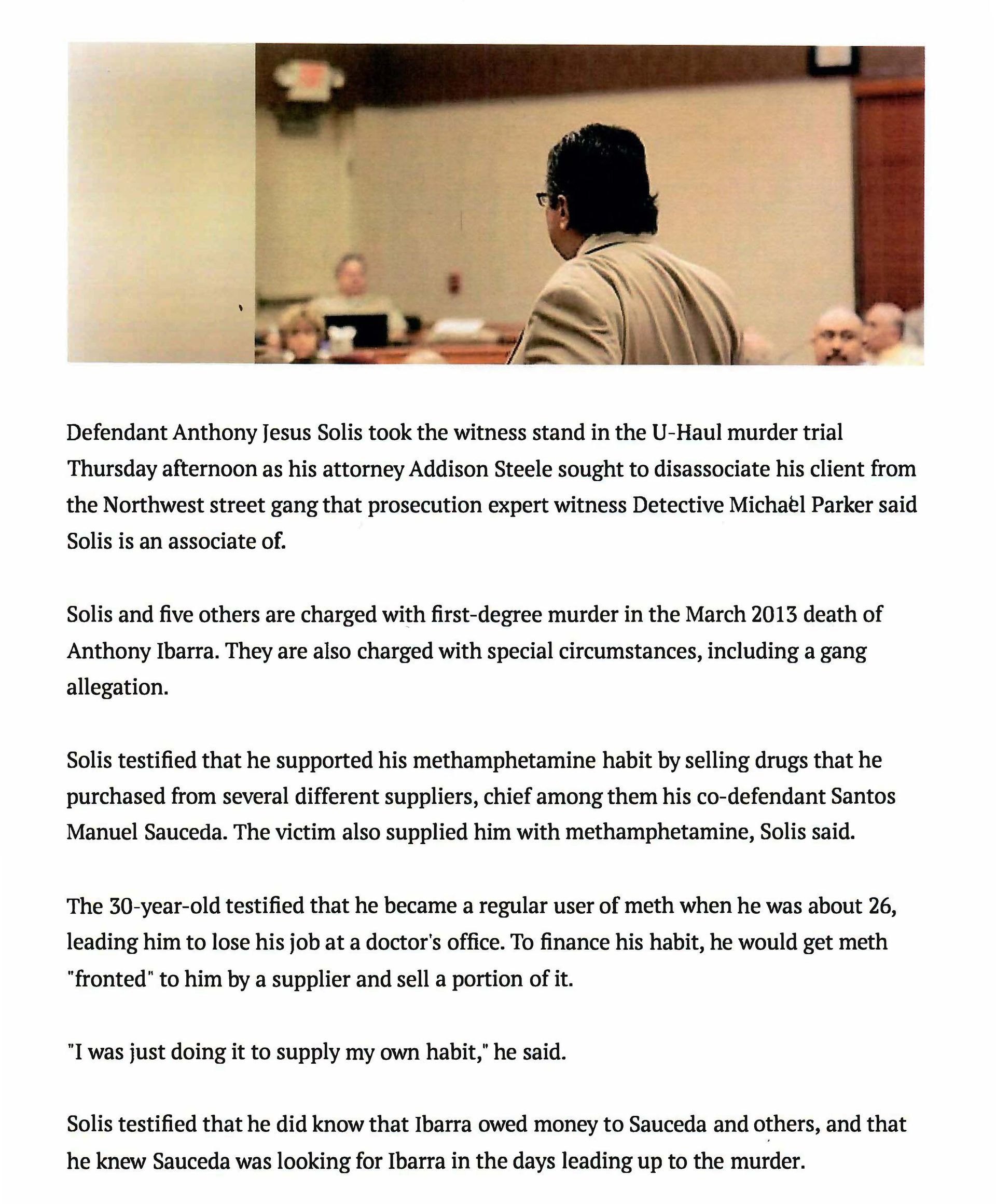 The district attorney's theory was that the decedent was a drug dealer, and that he had been scamming customers as well as not paying "taxes" to the Mexican Mafia. The district attorney believed that a co-defendant with the nickname (they said gang moniker) of Crazy Ray, had recruited a group to "check" (impose a punishment) on the decedent for both ripping off customers and for not paying a portion of his proceeds to the Mexican Mafia. The believed that the group then tortured the decedent to death, rented a U-Haul, put his body in the U-Haul and abandoned it. The incident occurred at a house that didn't belong to any of the people in the group with Crazy Ray. The house belonged to two people that testified as witnesses for the prosecution, Angel "Buddha" Escobar and his sister Marissa Escobar, who were put in the witness protection program. That means that the government paid to set the witnesses up with new lives in exchange for their snitch testimony. What the defense presented was that Crazy Ray and his group were at the house, but they had left and that it was in fact the district attorney's two witnesses that had killed the decedent, and that after the fact they called upon Crazy Ray to help with the aftermath. The defense was that he may have helped after the fact, but neither he nor anyone in his group did the killing. The defense that was presented was that various members of the group had come and gone from the house, but none were there when the murder occurred.