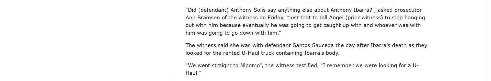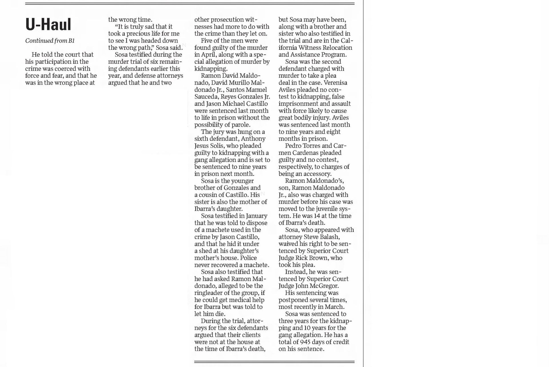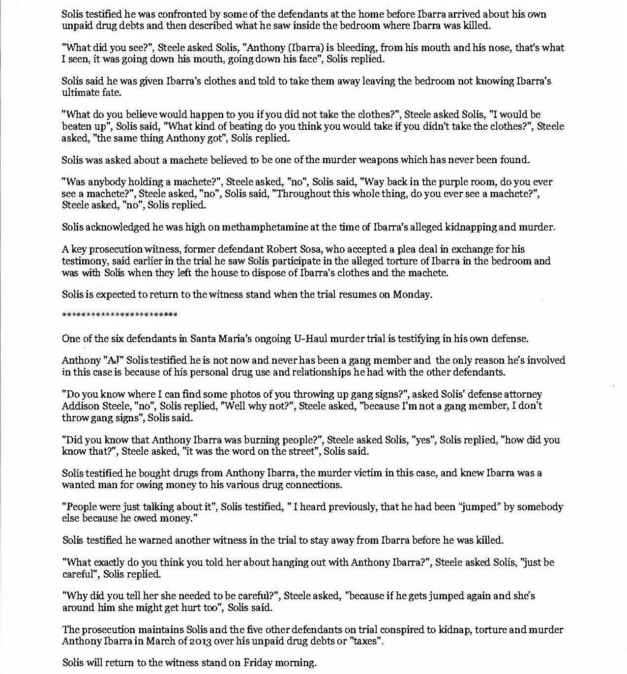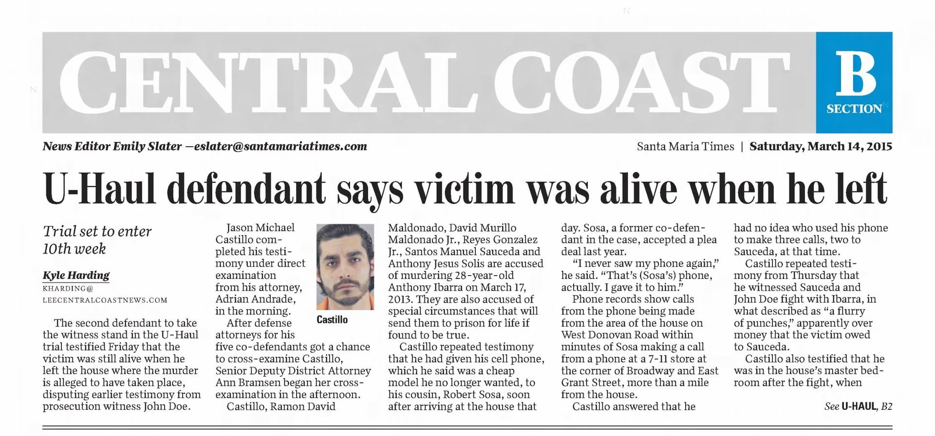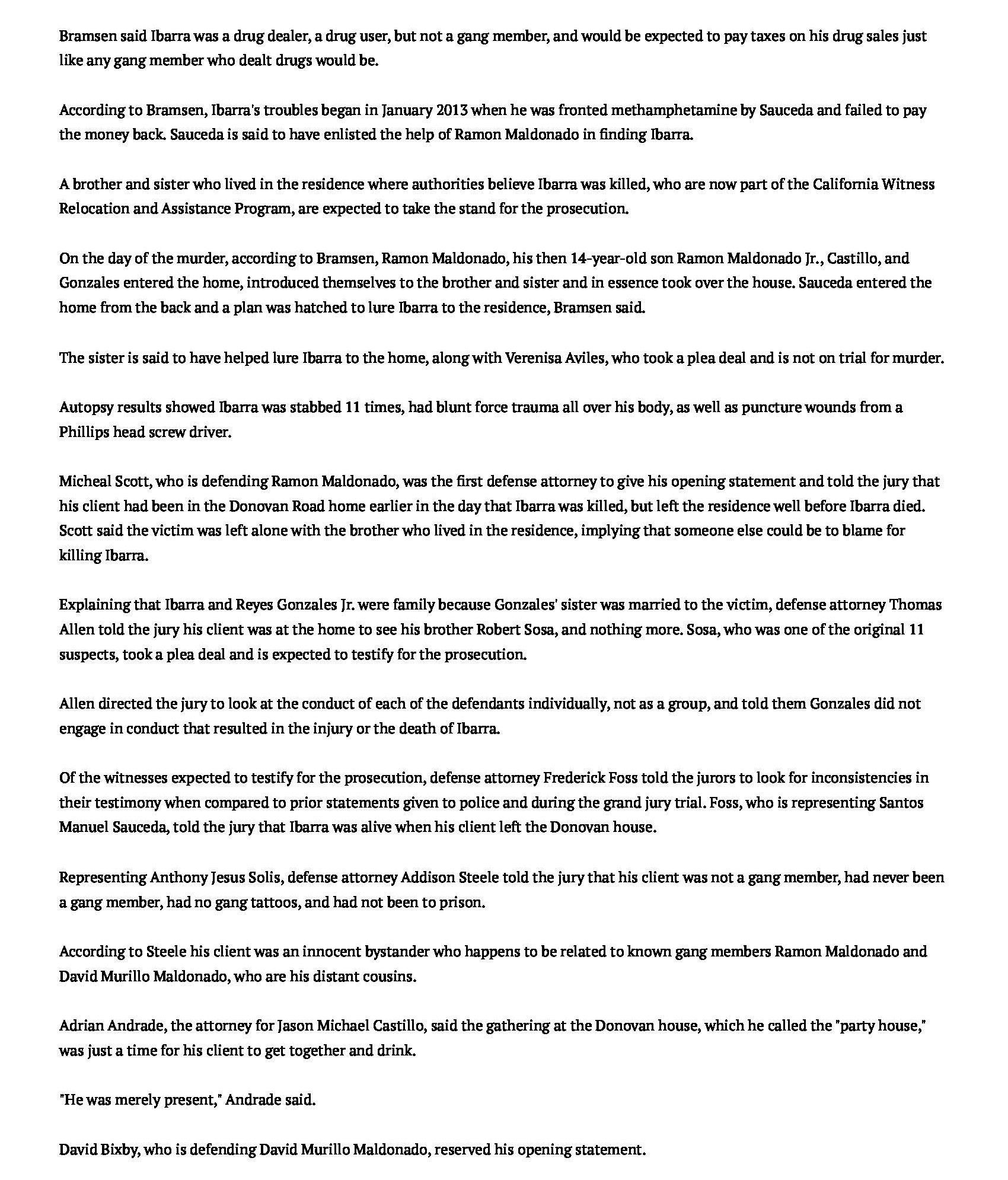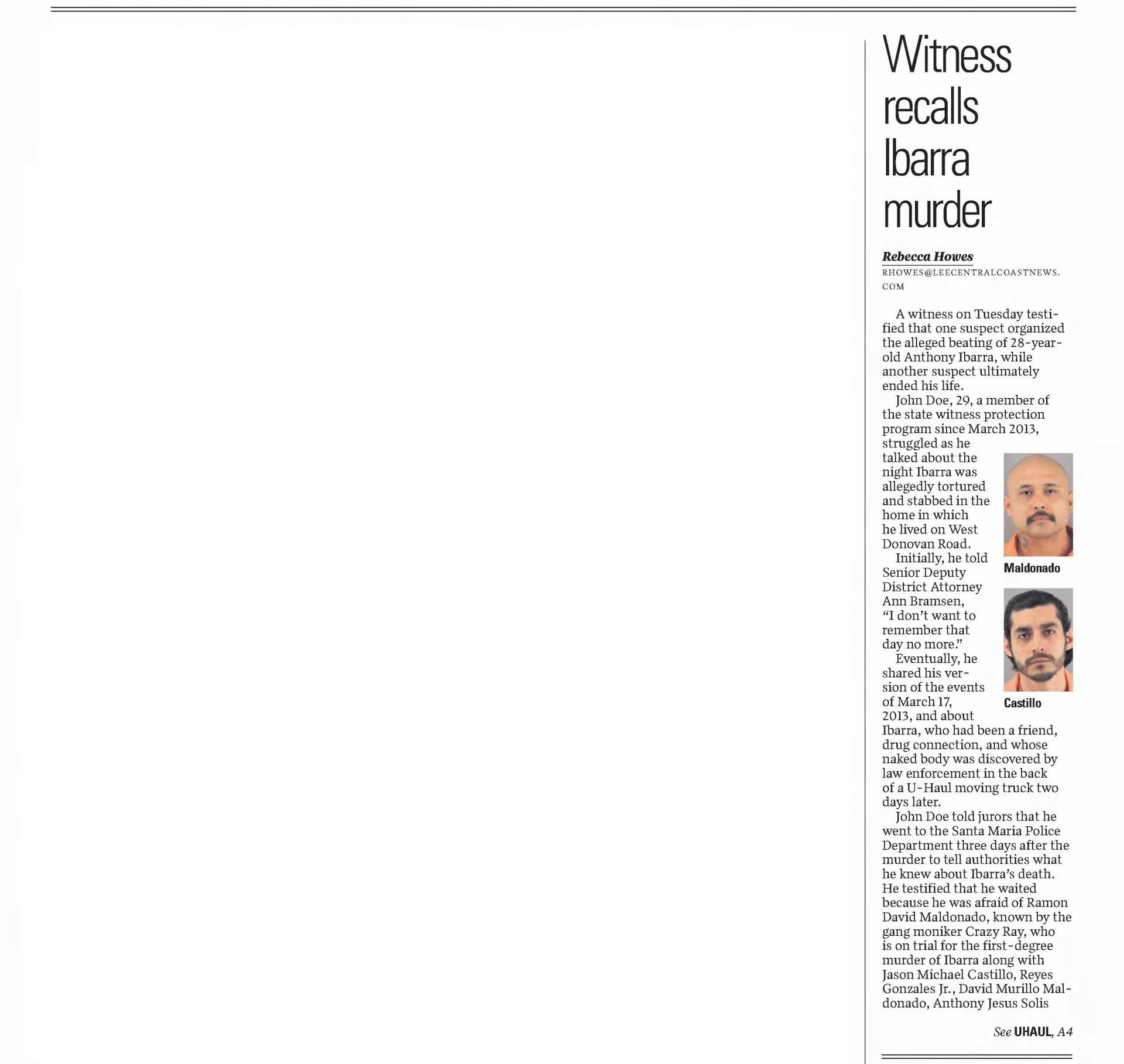 The district attorney's theory was that the decedent was a drug dealer, and that he had been scamming customers as well as not paying "taxes" to the Mexican Mafia. The district attorney believed that a co-defendant with the nickname (they said gang moniker) of Crazy Ray, had recruited a group to "check" (impose a punishment) on the decedent for both ripping off customers and for not paying a portion of his proceeds to the Mexican Mafia. The believed that the group then tortured the decedent to death, rented a U-Haul, put his body in the U-Haul and abandoned it. The incident occurred at a house that didn't belong to any of the people in the group with Crazy Ray. The house belonged to two people that testified as witnesses for the prosecution, Angel "Buddha" Escobar and his sister Marissa Escobar, who were put in the witness protection program. That means that the government paid to set the witnesses up with new lives in exchange for their snitch testimony. What the defense presented was that Crazy Ray and his group were at the house, but they had left and that it was in fact the district attorney's two witnesses that had killed the decedent, and that after the fact they called upon Crazy Ray to help with the aftermath. The defense was that he may have helped after the fact, but neither he nor anyone in his group did the killing. The defense that was presented was that various members of the group had come and gone from the house, but none were there when the murder occurred.