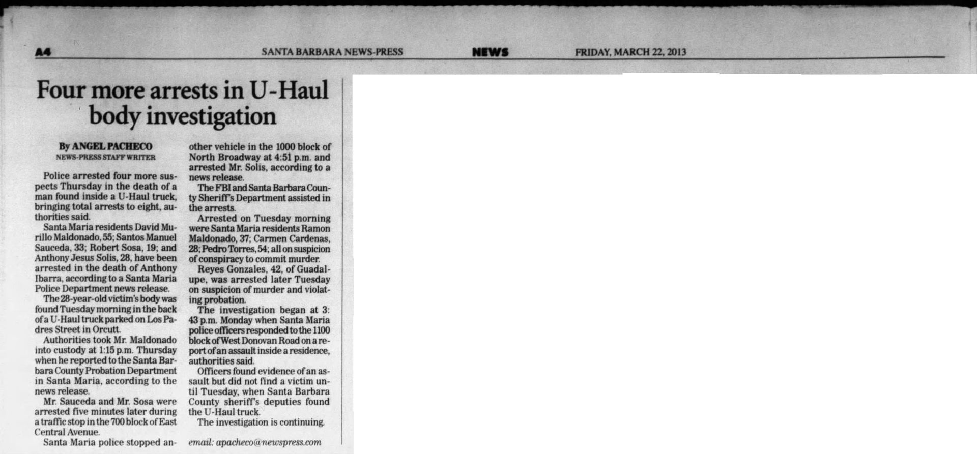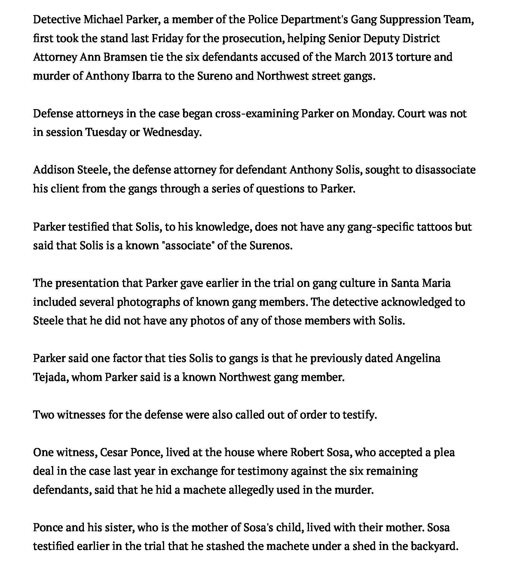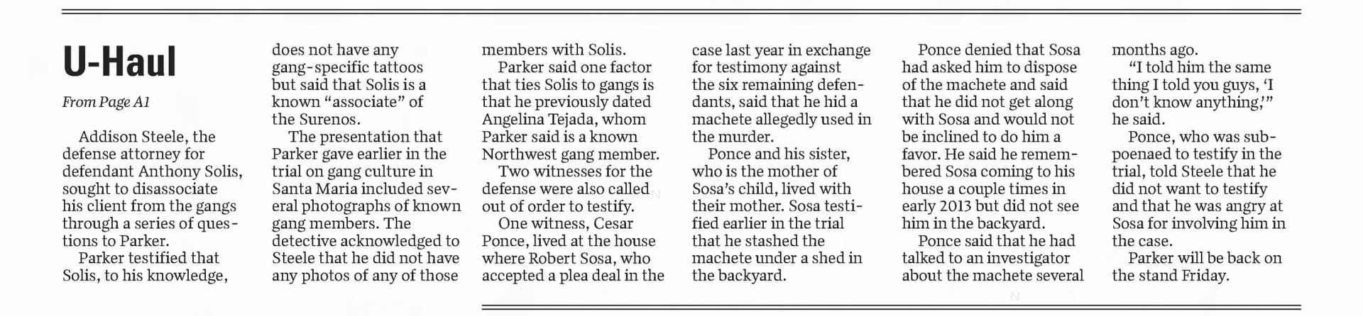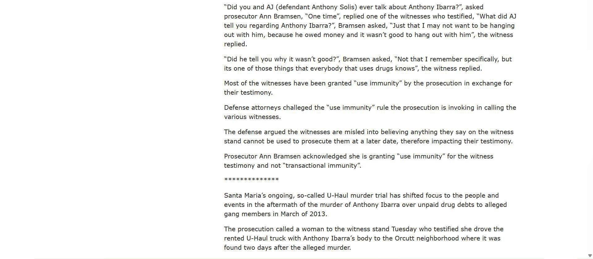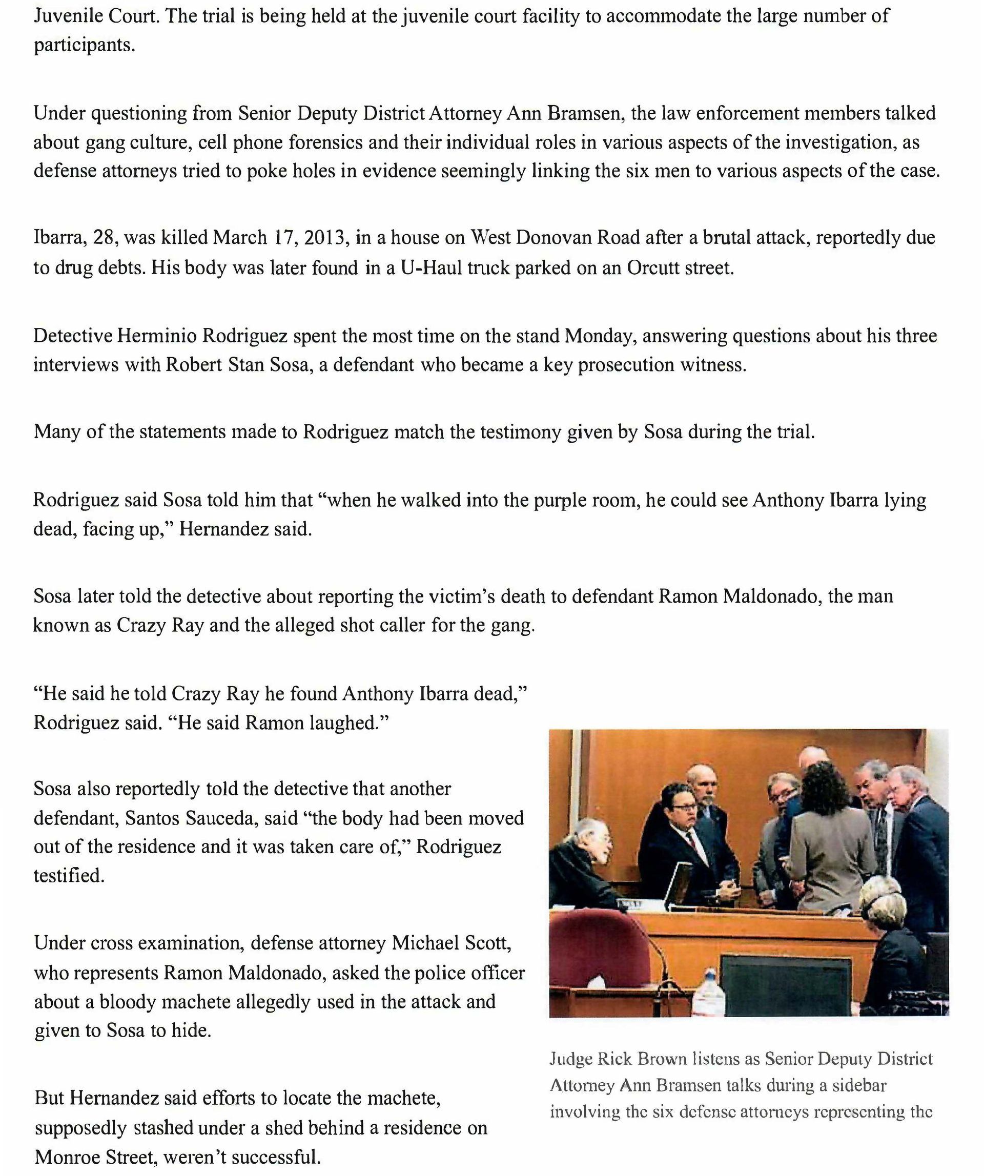 The district attorney's theory was that the decedent was a drug dealer, and that he had been scamming customers as well as not paying "taxes" to the Mexican Mafia. The district attorney believed that a co-defendant with the nickname (they said gang moniker) of Crazy Ray, had recruited a group to "check" (impose a punishment) on the decedent for both ripping off customers and for not paying a portion of his proceeds to the Mexican Mafia. The believed that the group then tortured the decedent to death, rented a U-Haul, put his body in the U-Haul and abandoned it. The incident occurred at a house that didn't belong to any of the people in the group with Crazy Ray. The house belonged to two people that testified as witnesses for the prosecution, Angel "Buddha" Escobar and his sister Marissa Escobar, who were put in the witness protection program. That means that the government paid to set the witnesses up with new lives in exchange for their snitch testimony. What the defense presented was that Crazy Ray and his group were at the house, but they had left and that it was in fact the district attorney's two witnesses that had killed the decedent, and that after the fact they called upon Crazy Ray to help with the aftermath. The defense was that he may have helped after the fact, but neither he nor anyone in his group did the killing. The defense that was presented was that various members of the group had come and gone from the house, but none were there when the murder occurred.