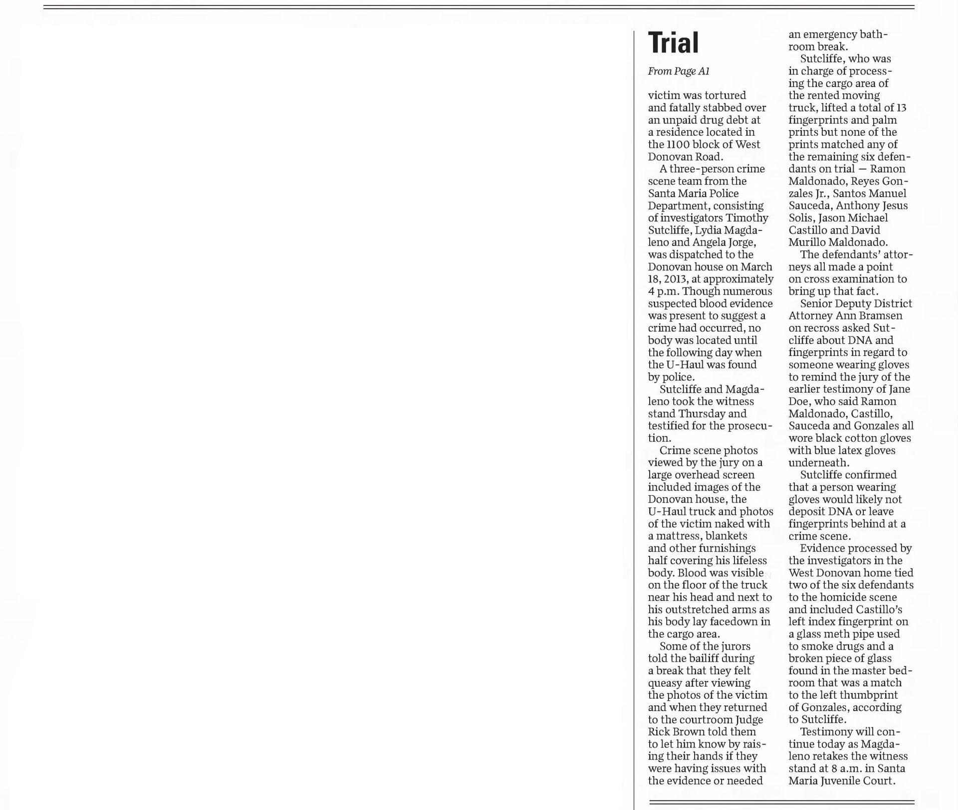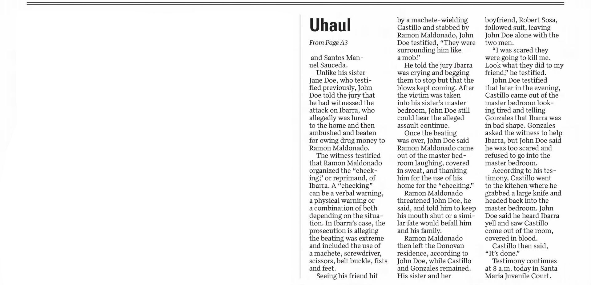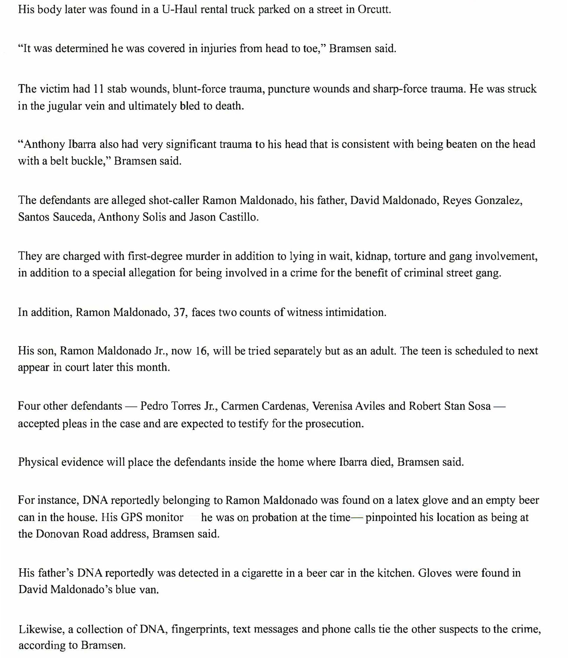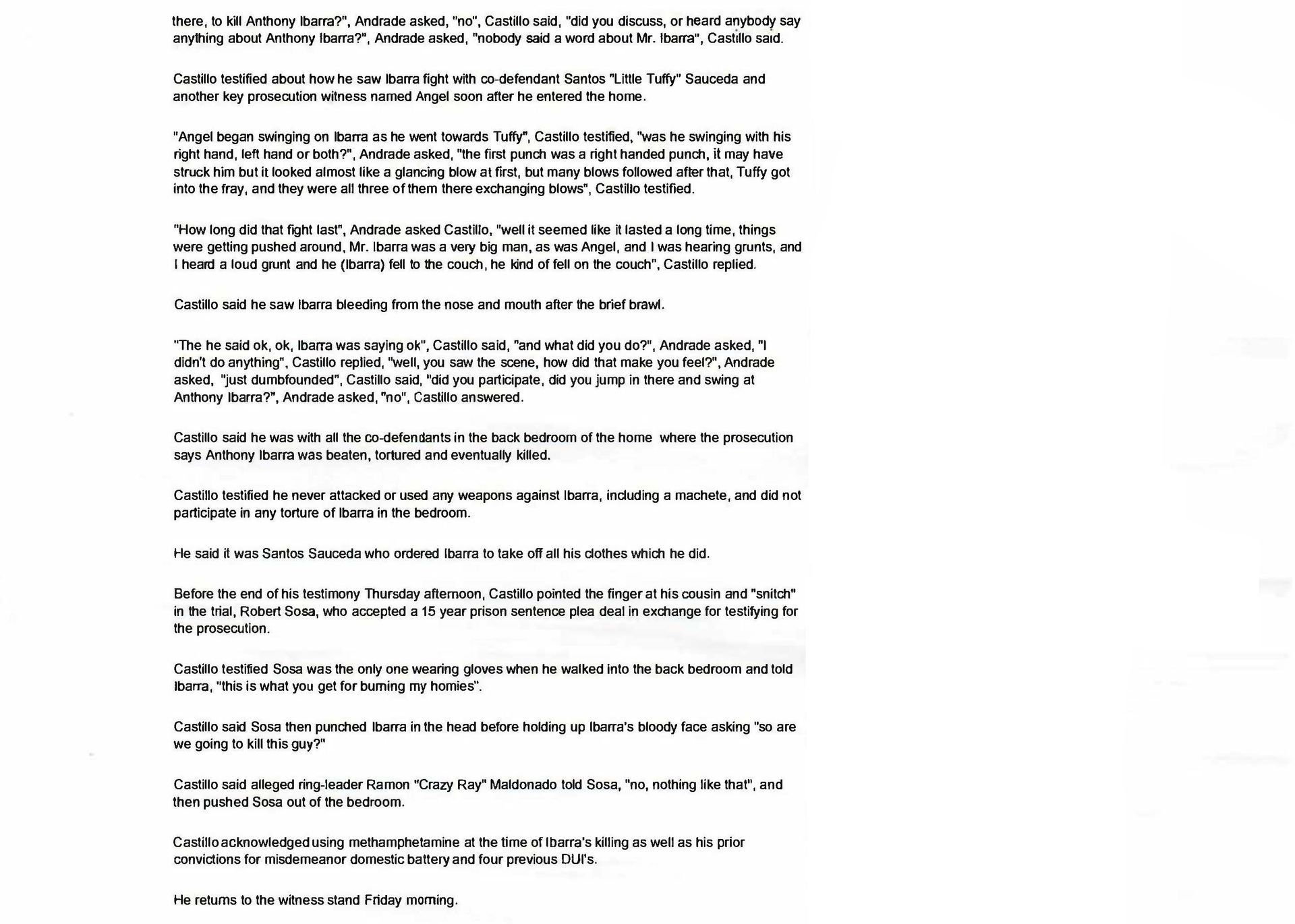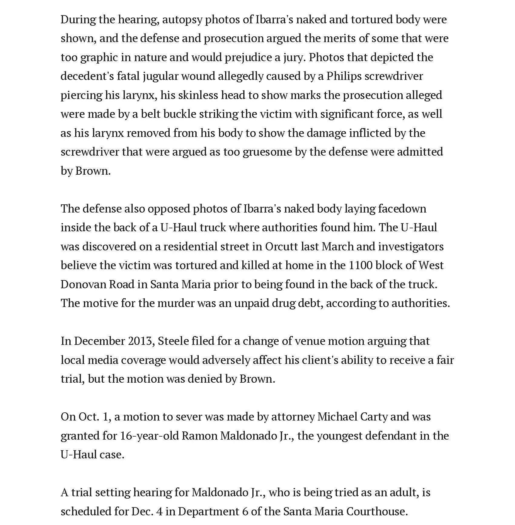 The district attorney's theory was that the decedent was a drug dealer, and that he had been scamming customers as well as not paying "taxes" to the Mexican Mafia. The district attorney believed that a co-defendant with the nickname (they said gang moniker) of Crazy Ray, had recruited a group to "check" (impose a punishment) on the decedent for both ripping off customers and for not paying a portion of his proceeds to the Mexican Mafia. The believed that the group then tortured the decedent to death, rented a U-Haul, put his body in the U-Haul and abandoned it. The incident occurred at a house that didn't belong to any of the people in the group with Crazy Ray. The house belonged to two people that testified as witnesses for the prosecution, Angel "Buddha" Escobar and his sister Marissa Escobar, who were put in the witness protection program. That means that the government paid to set the witnesses up with new lives in exchange for their snitch testimony. What the defense presented was that Crazy Ray and his group were at the house, but they had left and that it was in fact the district attorney's two witnesses that had killed the decedent, and that after the fact they called upon Crazy Ray to help with the aftermath. The defense was that he may have helped after the fact, but neither he nor anyone in his group did the killing. The defense that was presented was that various members of the group had come and gone from the house, but none were there when the murder occurred.