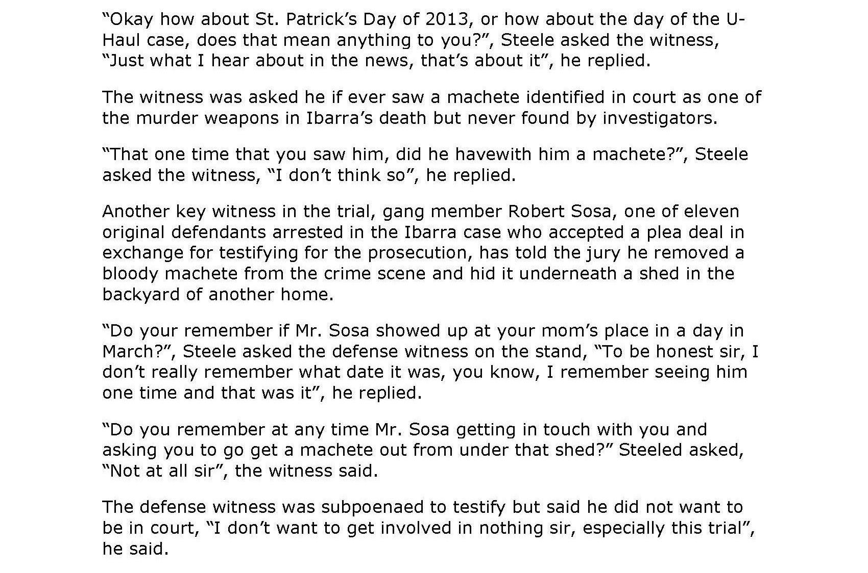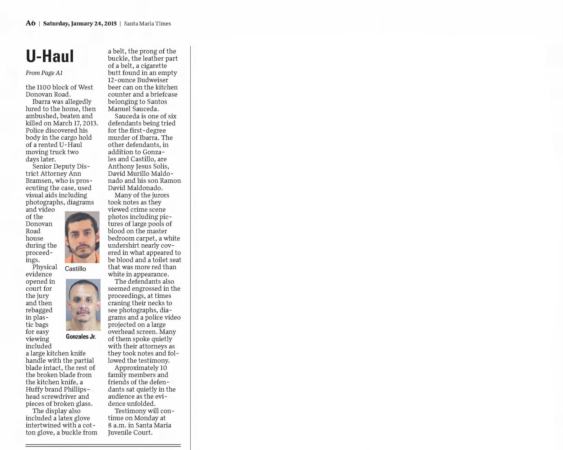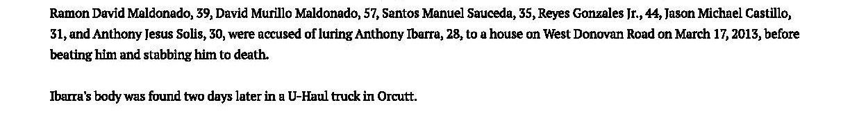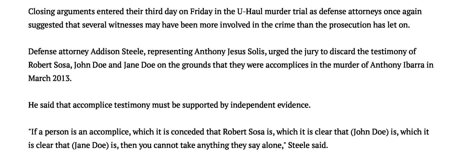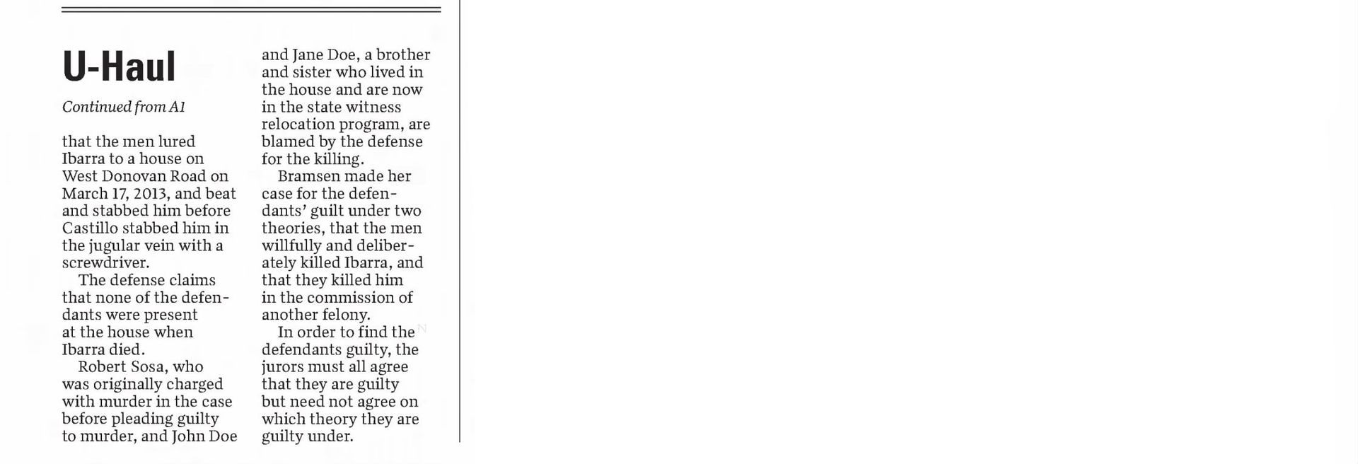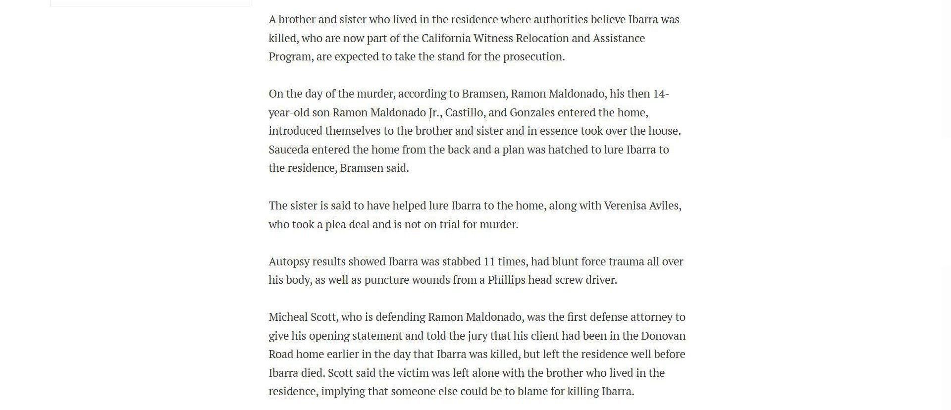 The district attorney's theory was that the decedent was a drug dealer, and that he had been scamming customers as well as not paying "taxes" to the Mexican Mafia. The district attorney believed that a co-defendant with the nickname (they said gang moniker) of Crazy Ray, had recruited a group to "check" (impose a punishment) on the decedent for both ripping off customers and for not paying a portion of his proceeds to the Mexican Mafia. The believed that the group then tortured the decedent to death, rented a U-Haul, put his body in the U-Haul and abandoned it. The incident occurred at a house that didn't belong to any of the people in the group with Crazy Ray. The house belonged to two people that testified as witnesses for the prosecution, Angel "Buddha" Escobar and his sister Marissa Escobar, who were put in the witness protection program. That means that the government paid to set the witnesses up with new lives in exchange for their snitch testimony. What the defense presented was that Crazy Ray and his group were at the house, but they had left and that it was in fact the district attorney's two witnesses that had killed the decedent, and that after the fact they called upon Crazy Ray to help with the aftermath. The defense was that he may have helped after the fact, but neither he nor anyone in his group did the killing. The defense that was presented was that various members of the group had come and gone from the house, but none were there when the murder occurred.