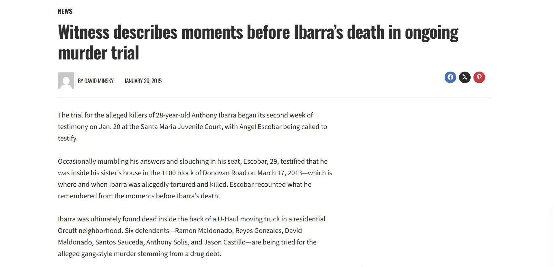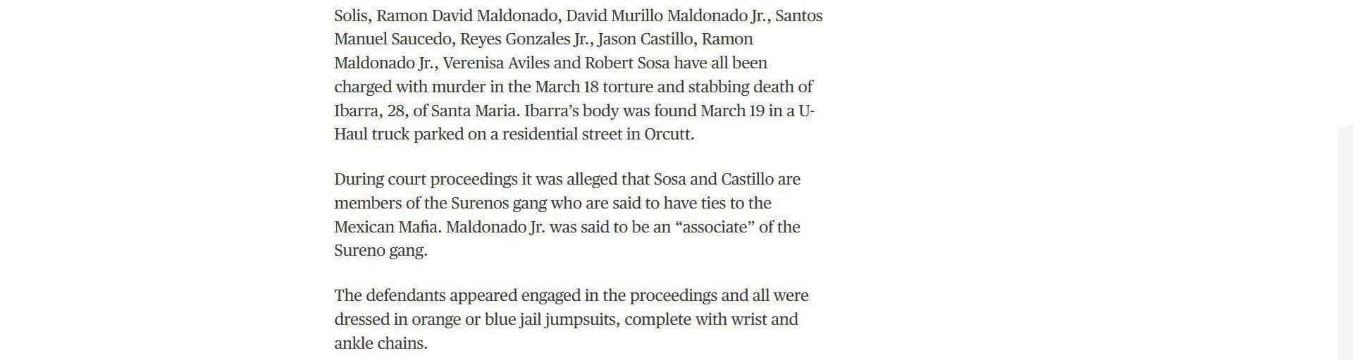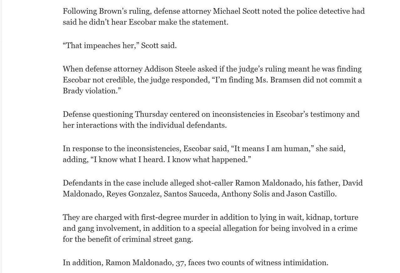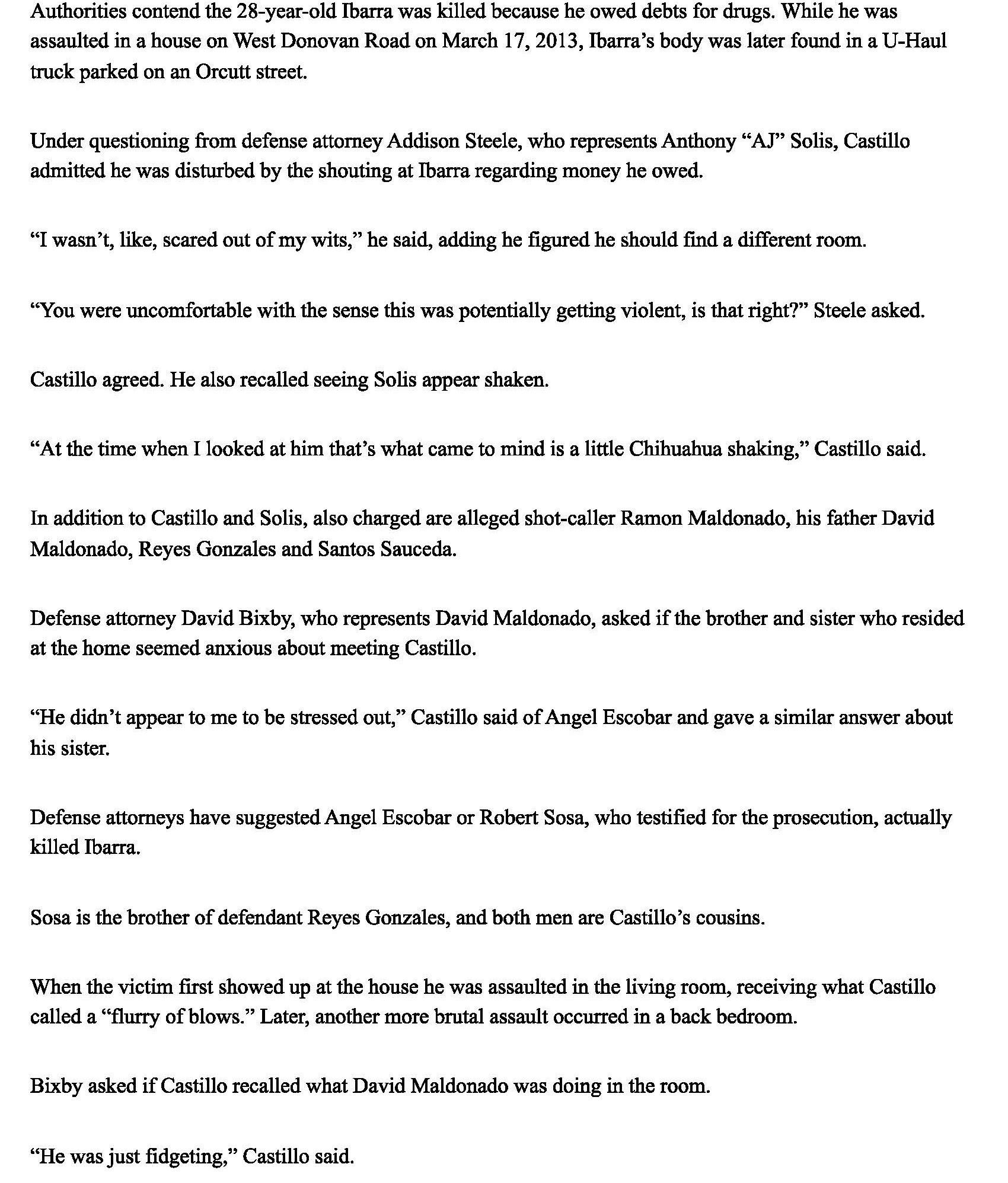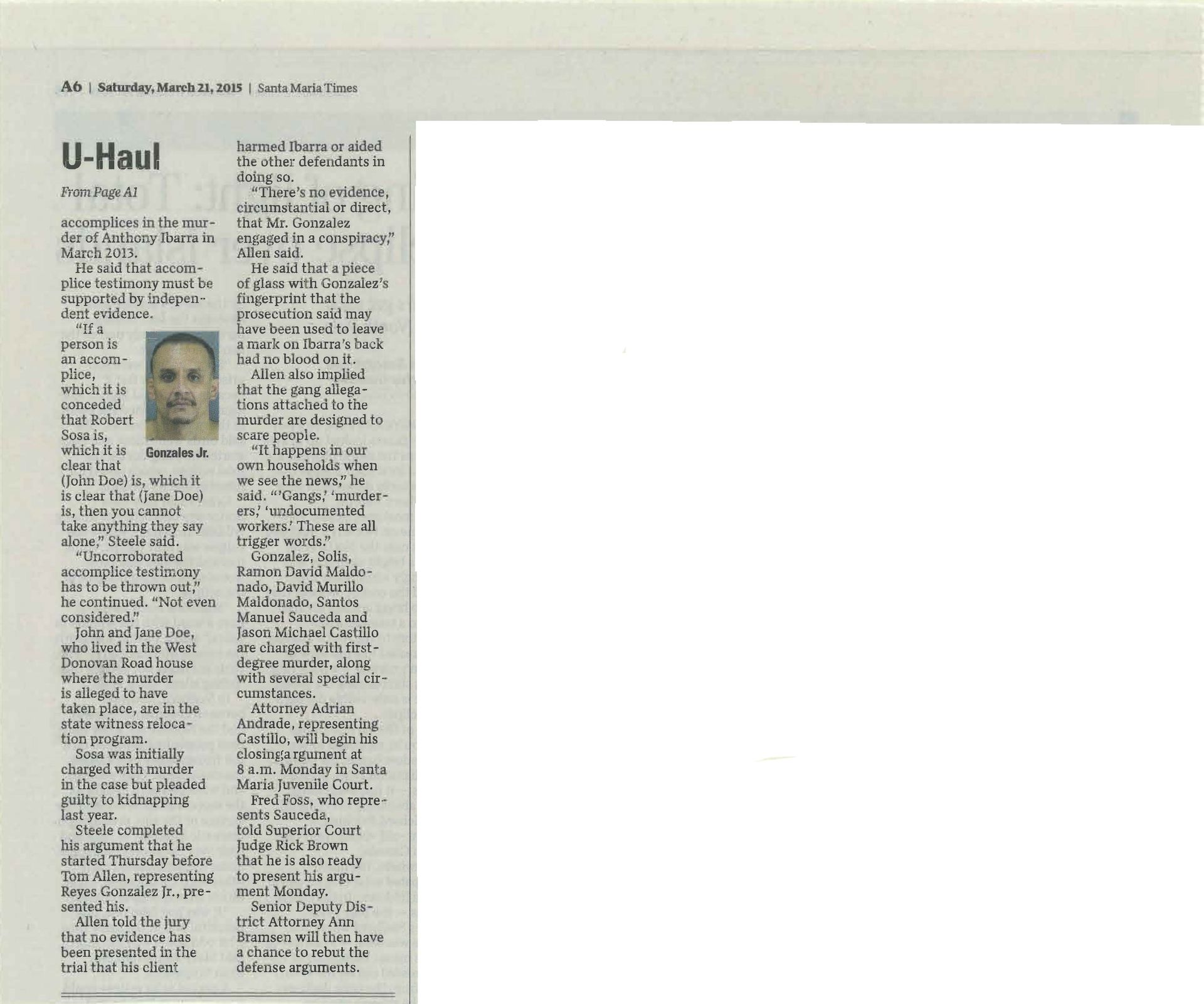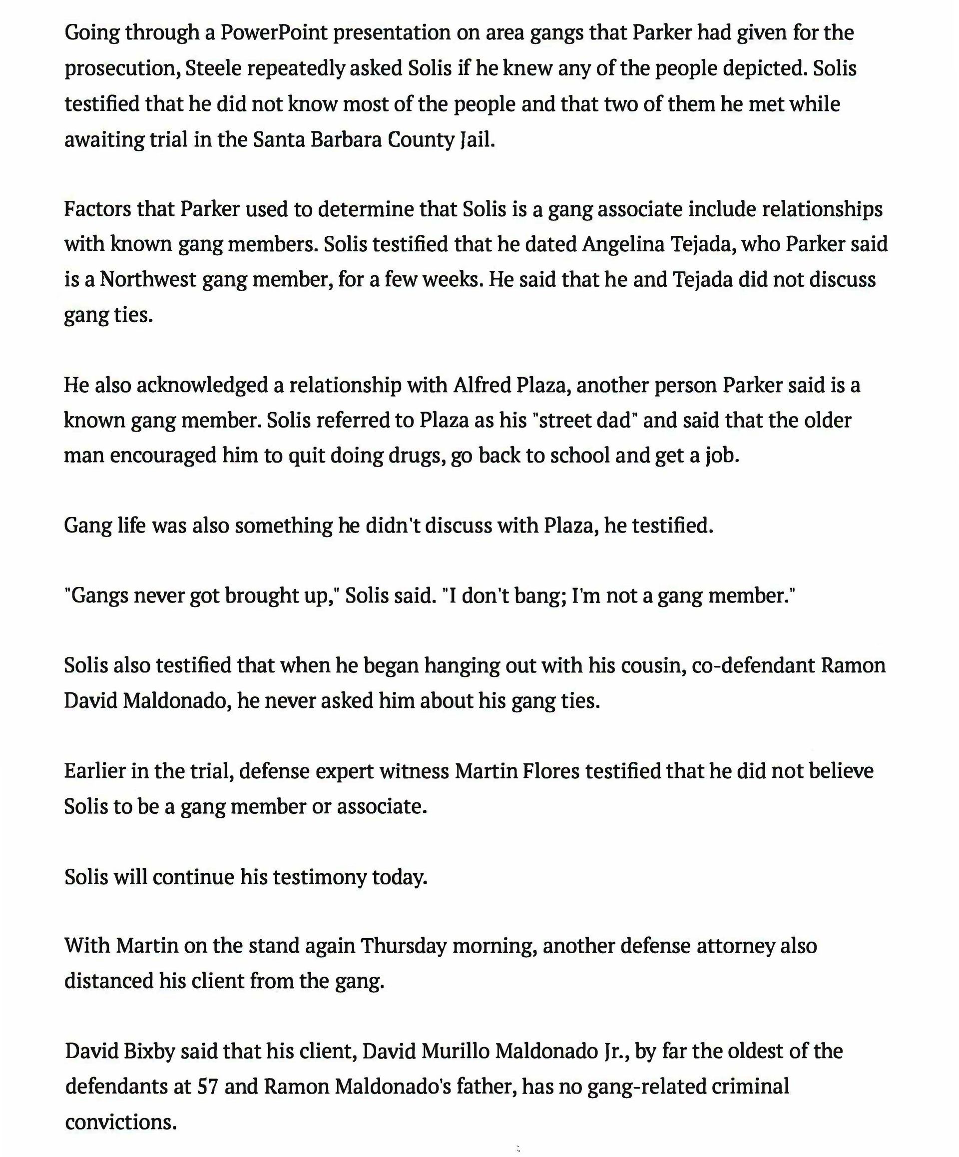 The district attorney's theory was that the decedent was a drug dealer, and that he had been scamming customers as well as not paying "taxes" to the Mexican Mafia. The district attorney believed that a co-defendant with the nickname (they said gang moniker) of Crazy Ray, had recruited a group to "check" (impose a punishment) on the decedent for both ripping off customers and for not paying a portion of his proceeds to the Mexican Mafia. The believed that the group then tortured the decedent to death, rented a U-Haul, put his body in the U-Haul and abandoned it. The incident occurred at a house that didn't belong to any of the people in the group with Crazy Ray. The house belonged to two people that testified as witnesses for the prosecution, Angel "Buddha" Escobar and his sister Marissa Escobar, who were put in the witness protection program. That means that the government paid to set the witnesses up with new lives in exchange for their snitch testimony. What the defense presented was that Crazy Ray and his group were at the house, but they had left and that it was in fact the district attorney's two witnesses that had killed the decedent, and that after the fact they called upon Crazy Ray to help with the aftermath. The defense was that he may have helped after the fact, but neither he nor anyone in his group did the killing. The defense that was presented was that various members of the group had come and gone from the house, but none were there when the murder occurred.