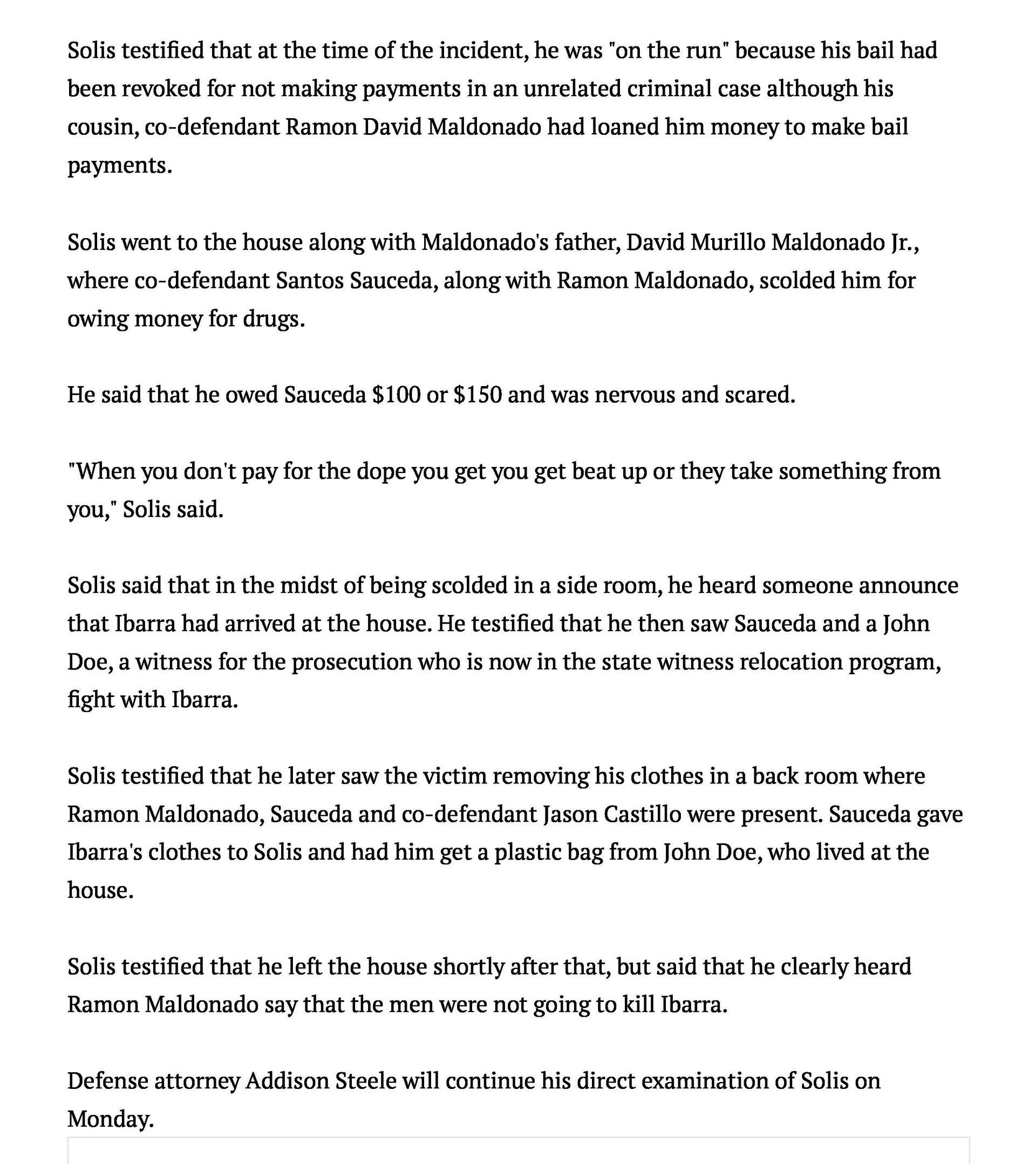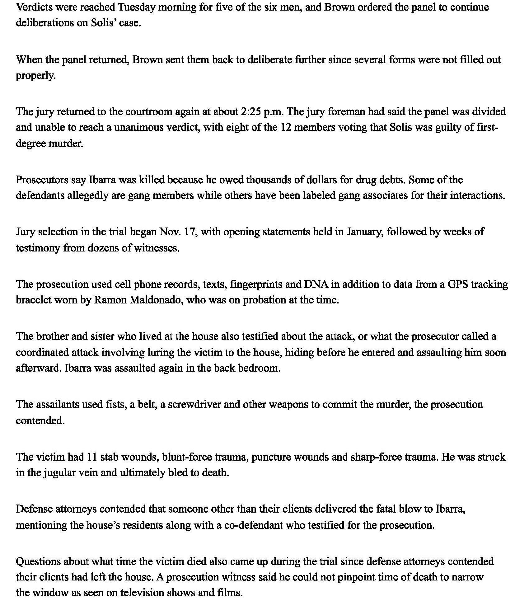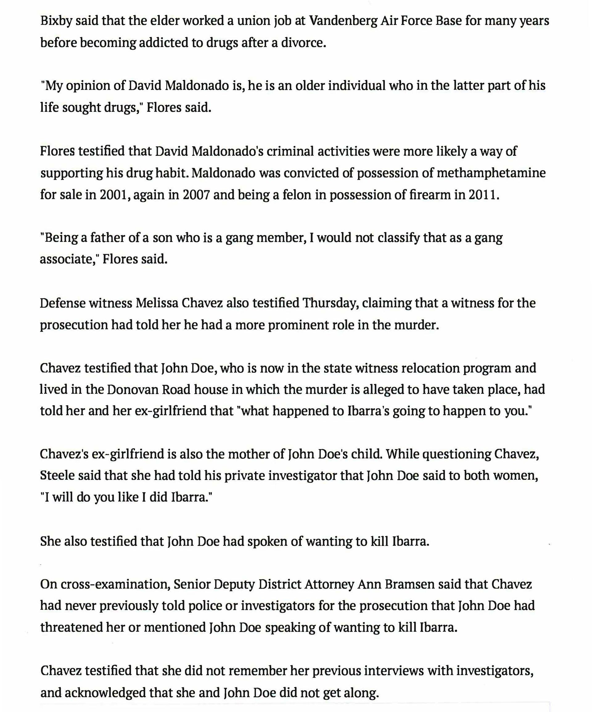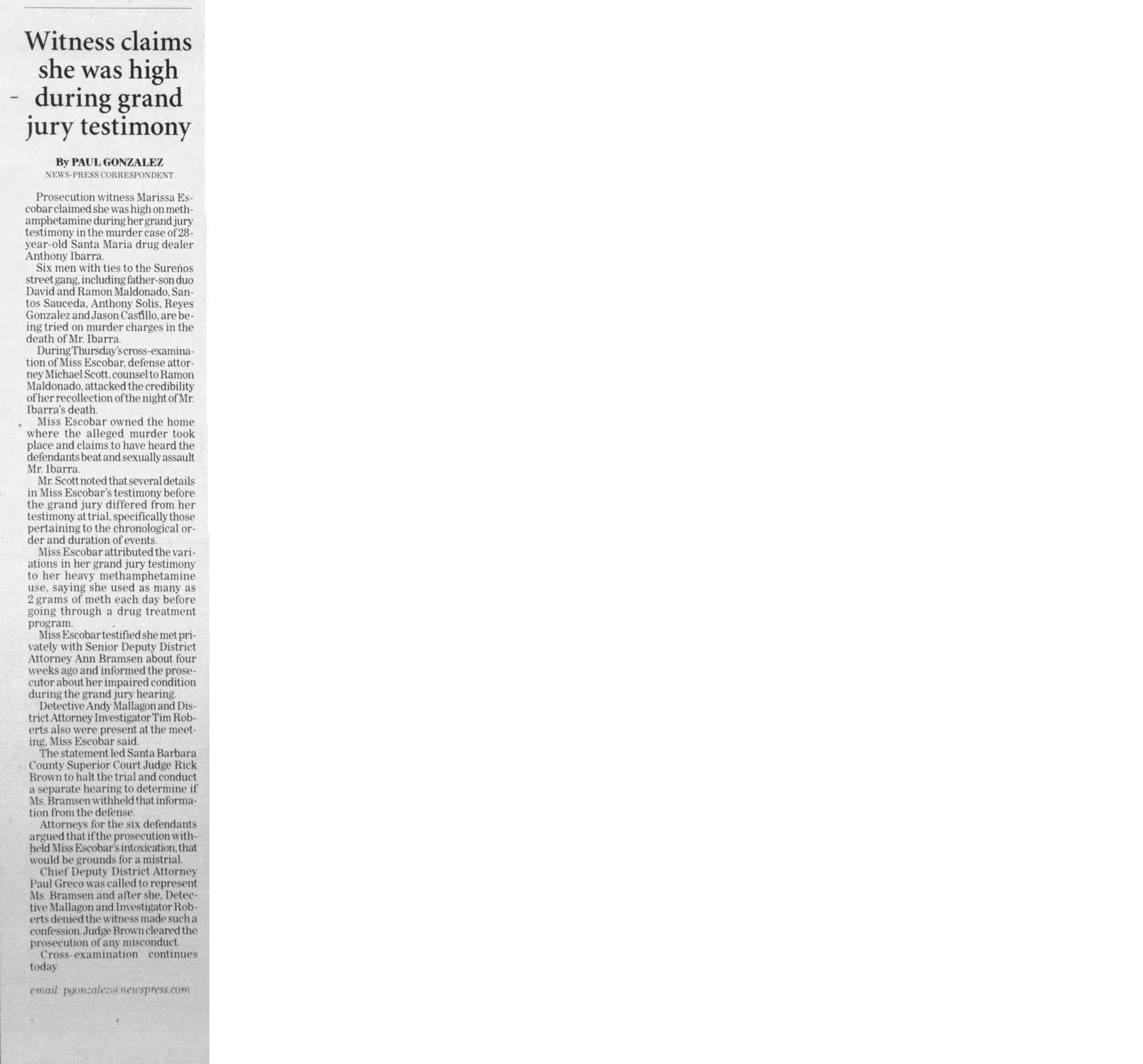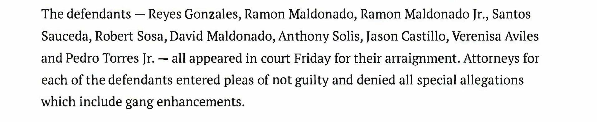 The district attorney's theory was that the decedent was a drug dealer, and that he had been scamming customers as well as not paying "taxes" to the Mexican Mafia. The district attorney believed that a co-defendant with the nickname (they said gang moniker) of Crazy Ray, had recruited a group to "check" (impose a punishment) on the decedent for both ripping off customers and for not paying a portion of his proceeds to the Mexican Mafia. The believed that the group then tortured the decedent to death, rented a U-Haul, put his body in the U-Haul and abandoned it. The incident occurred at a house that didn't belong to any of the people in the group with Crazy Ray. The house belonged to two people that testified as witnesses for the prosecution, Angel "Buddha" Escobar and his sister Marissa Escobar, who were put in the witness protection program. That means that the government paid to set the witnesses up with new lives in exchange for their snitch testimony. What the defense presented was that Crazy Ray and his group were at the house, but they had left and that it was in fact the district attorney's two witnesses that had killed the decedent, and that after the fact they called upon Crazy Ray to help with the aftermath. The defense was that he may have helped after the fact, but neither he nor anyone in his group did the killing. The defense that was presented was that various members of the group had come and gone from the house, but none were there when the murder occurred.