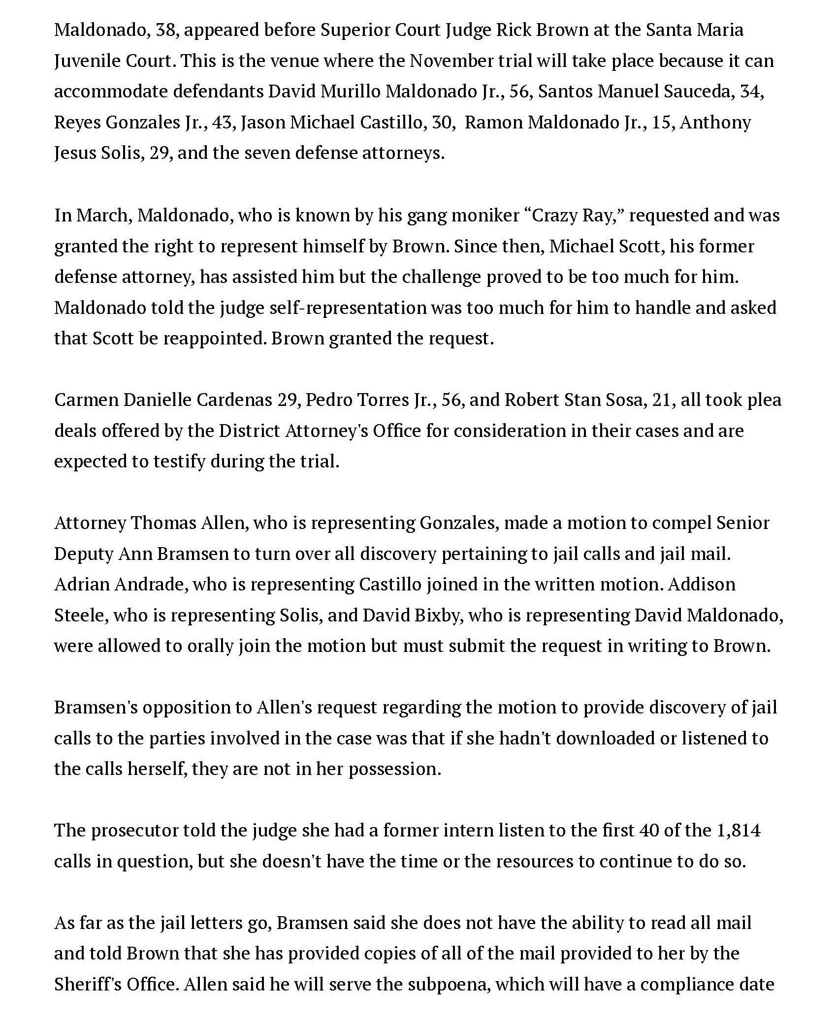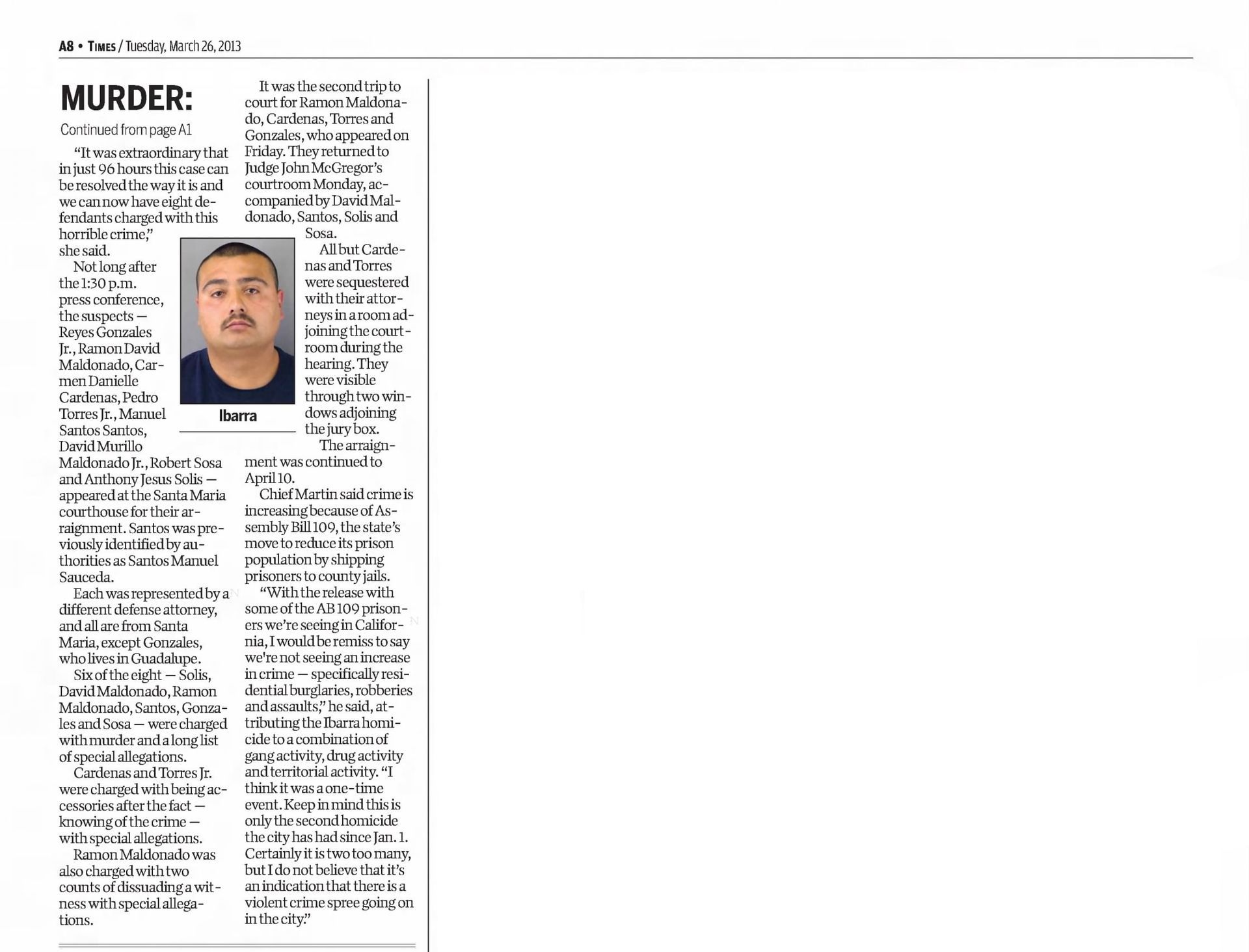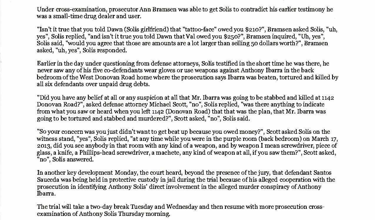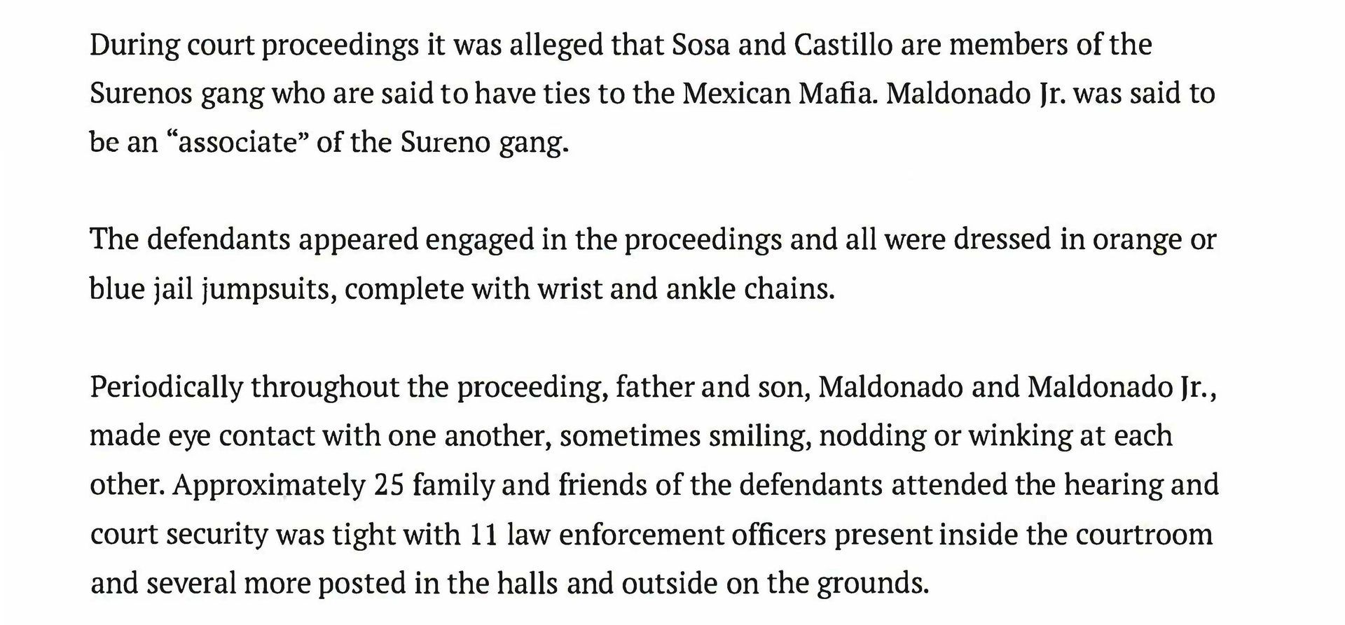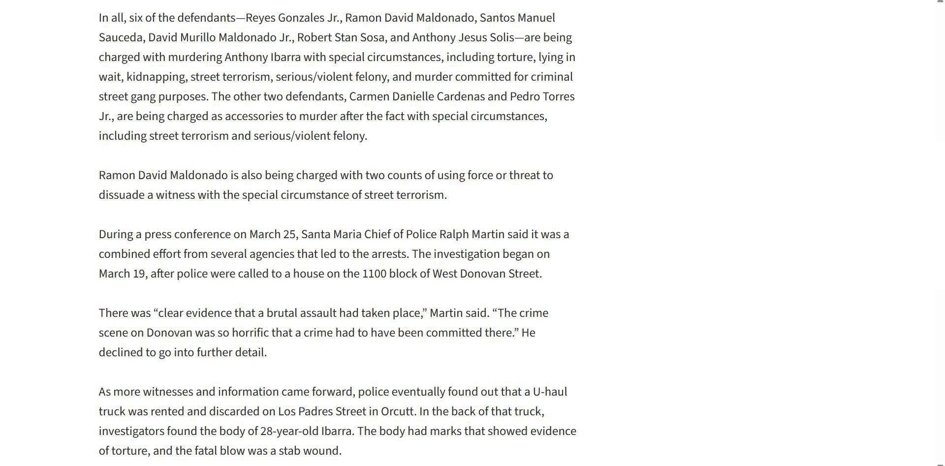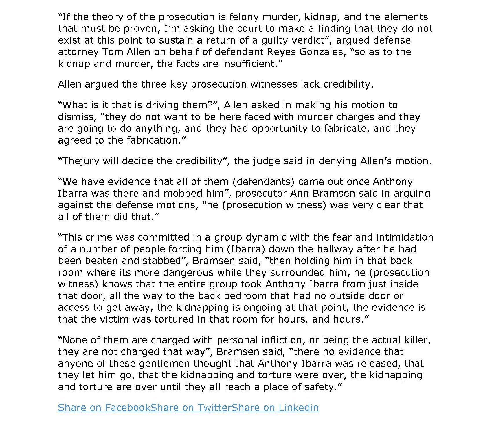 The district attorney's theory was that the decedent was a drug dealer, and that he had been scamming customers as well as not paying "taxes" to the Mexican Mafia. The district attorney believed that a co-defendant with the nickname (they said gang moniker) of Crazy Ray, had recruited a group to "check" (impose a punishment) on the decedent for both ripping off customers and for not paying a portion of his proceeds to the Mexican Mafia. The believed that the group then tortured the decedent to death, rented a U-Haul, put his body in the U-Haul and abandoned it. The incident occurred at a house that didn't belong to any of the people in the group with Crazy Ray. The house belonged to two people that testified as witnesses for the prosecution, Angel "Buddha" Escobar and his sister Marissa Escobar, who were put in the witness protection program. That means that the government paid to set the witnesses up with new lives in exchange for their snitch testimony. What the defense presented was that Crazy Ray and his group were at the house, but they had left and that it was in fact the district attorney's two witnesses that had killed the decedent, and that after the fact they called upon Crazy Ray to help with the aftermath. The defense was that he may have helped after the fact, but neither he nor anyone in his group did the killing. The defense that was presented was that various members of the group had come and gone from the house, but none were there when the murder occurred.